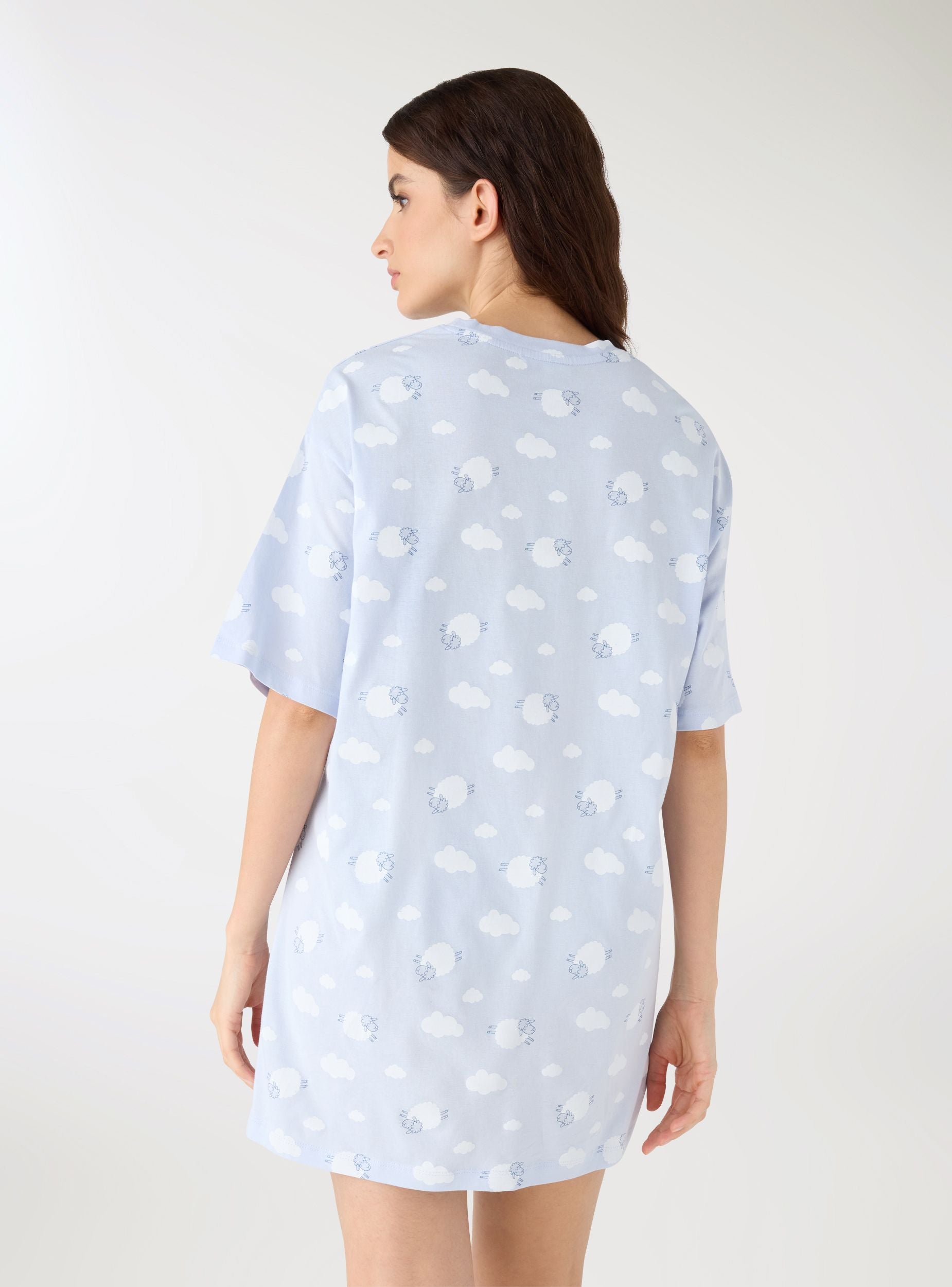 Maglietta da donna a maniche corte con vestibilità over e girocollo, interamente decorata da stampa di nuvole e pecore e scritta frontale. Perfetta per il tempo libero e i momenti di relax. Orlo dritto e spalle leggermente scese completano il design.Dettagli