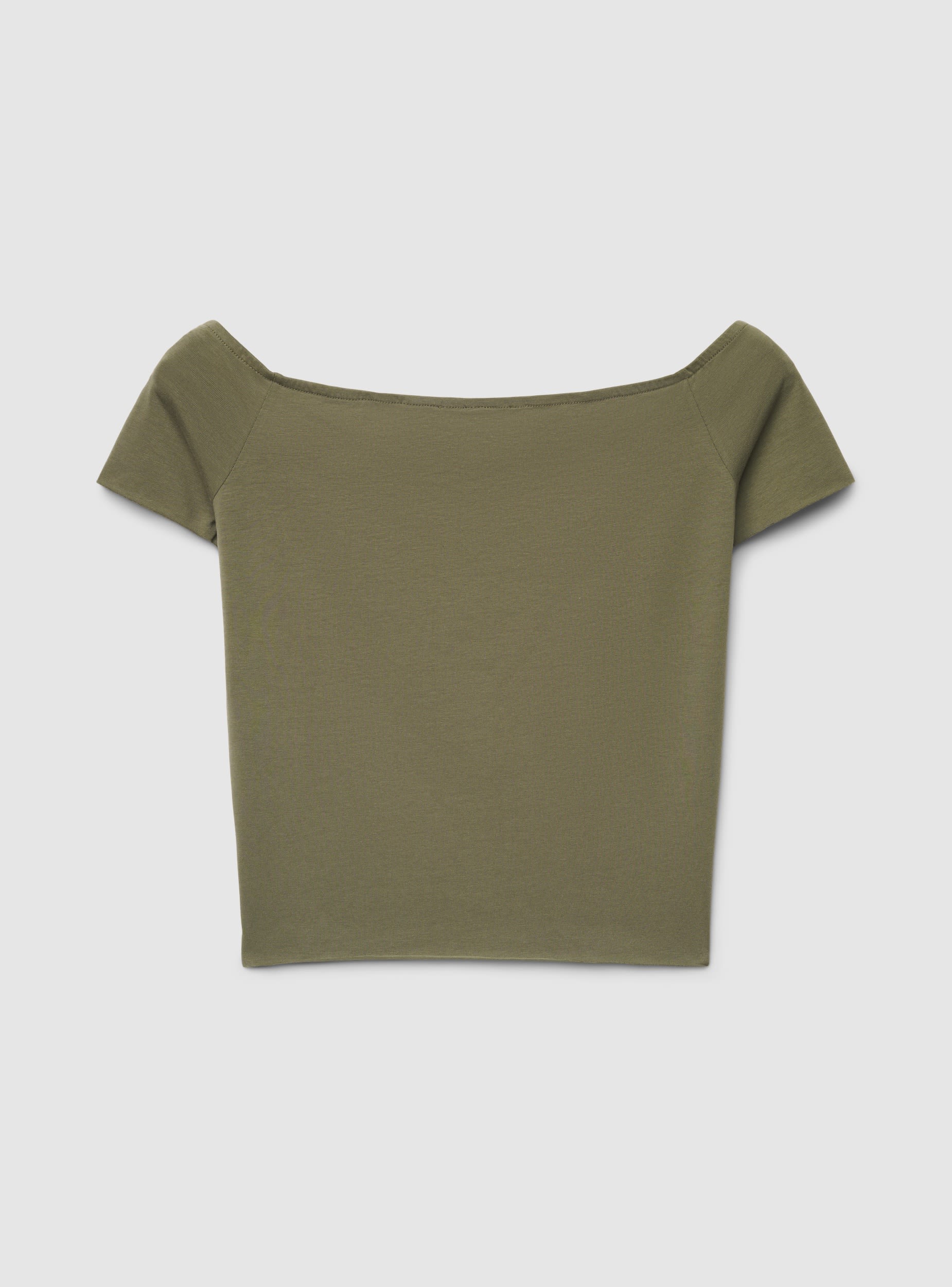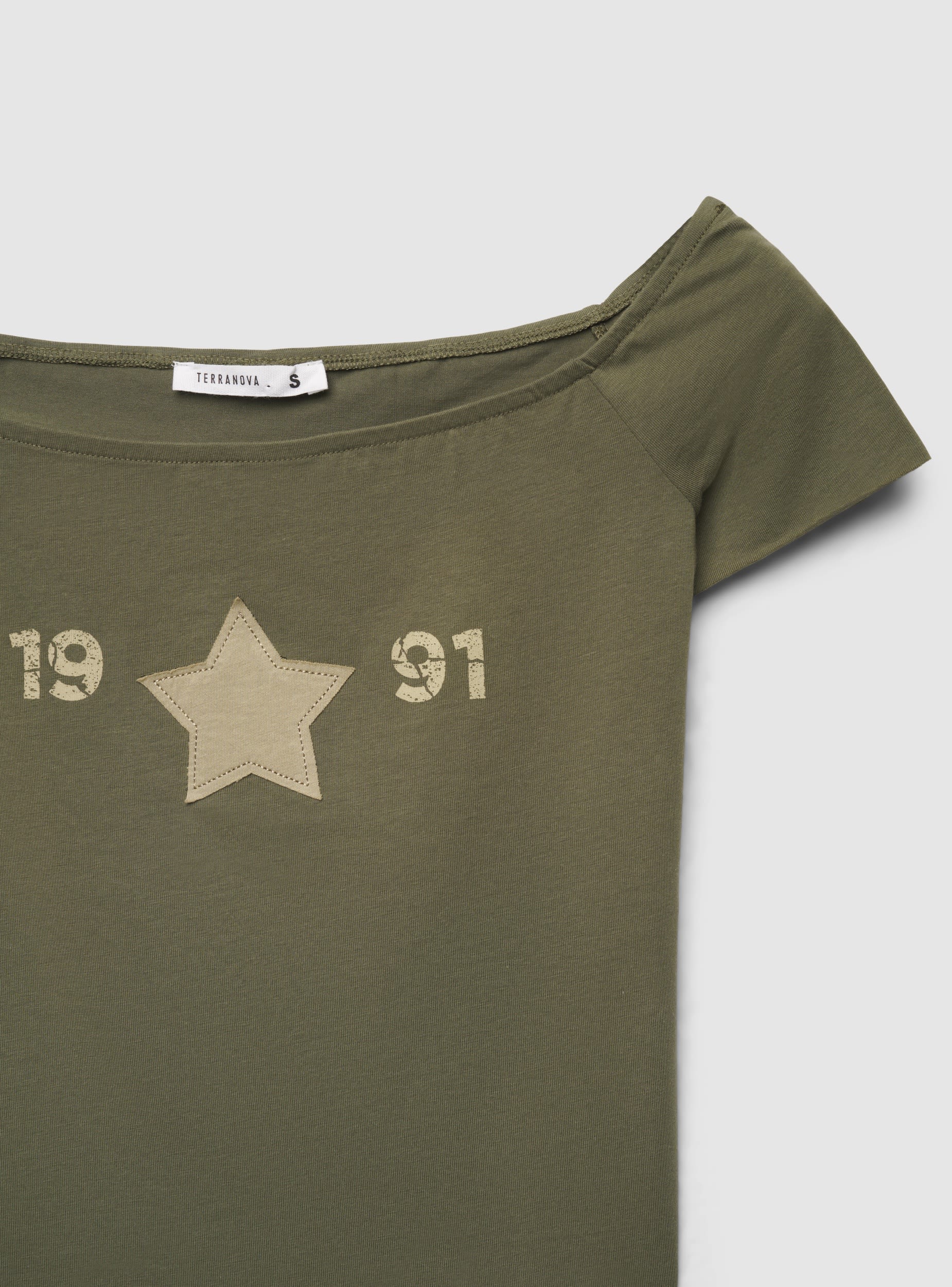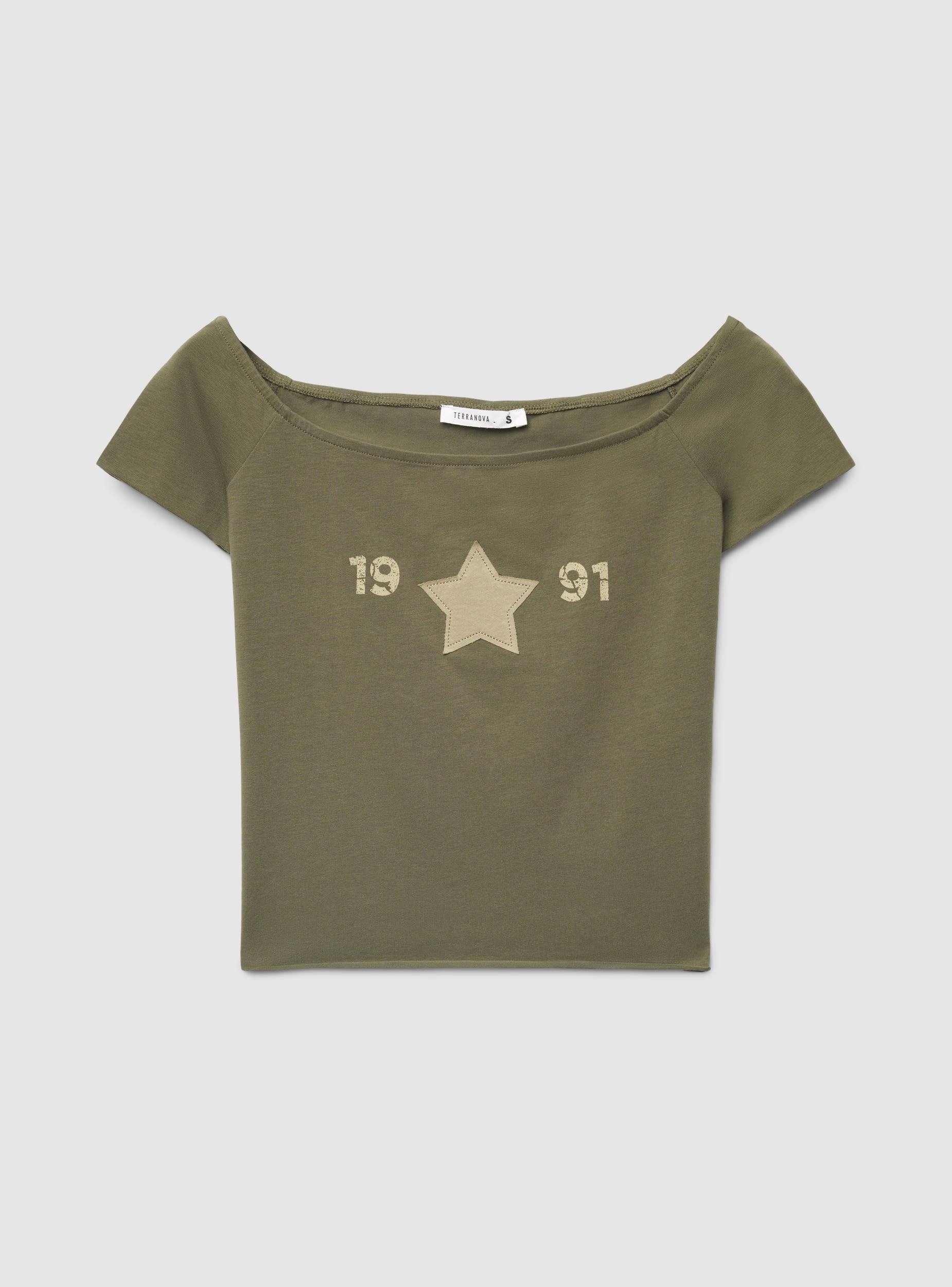 Maglietta da donna crop con scollo ampio a spalle scoperte e maniche corte. Il davanti è impreziosito da patch a stella e stampa con numeri in stile college, per un look urbano e grintoso. Linea leggermente elasticizzata che segue le forme e valorizza la figura. Perfetta con jeans a vita alta, gonne o pantaloni cargo, per uscite e tempo libero.Dettagli