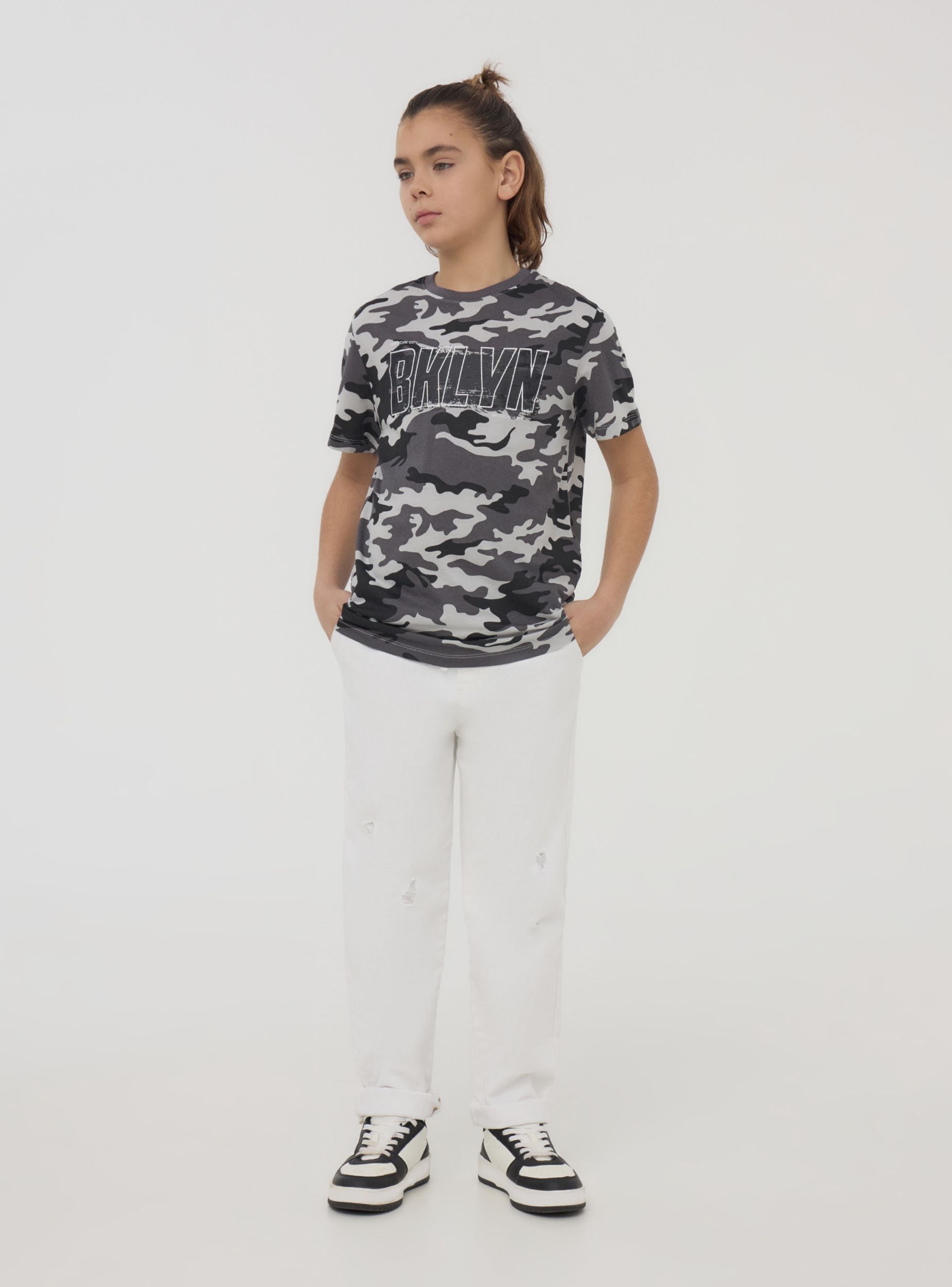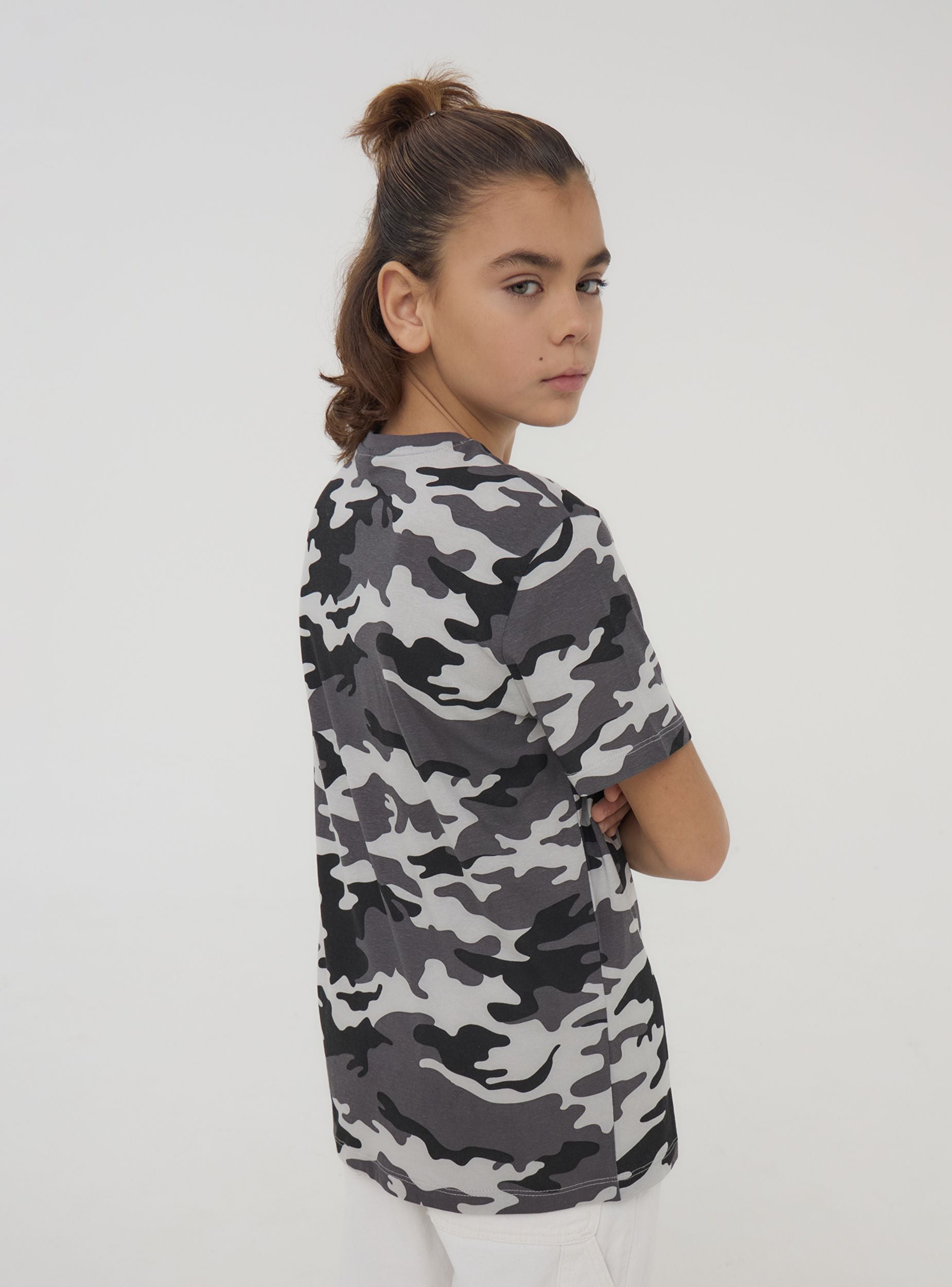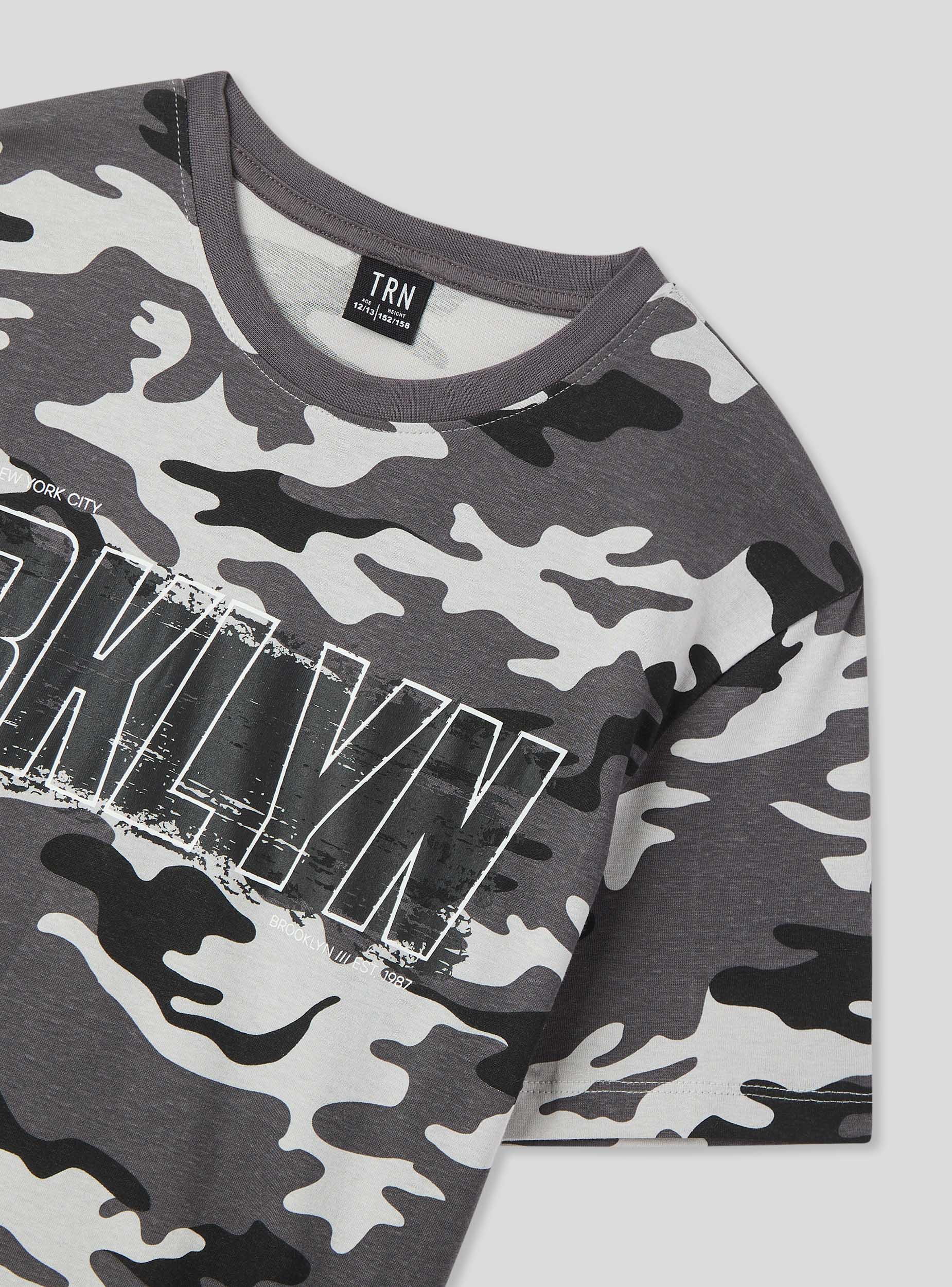 Maglietta da bambino dallo stile grintoso e moderno, caratterizzata da una stampa mimetica e una scritta di grande impatto. Le maniche corte e il girocollo garantiscono comfort e libertà di movimento. Perfetta per look casual e dinamici, si abbina facilmente a jeans, pantaloni cargo o bermuda. Ideale per la scuola, il tempo libero o le avventure all’aria aperta con gli amici.Dettagli