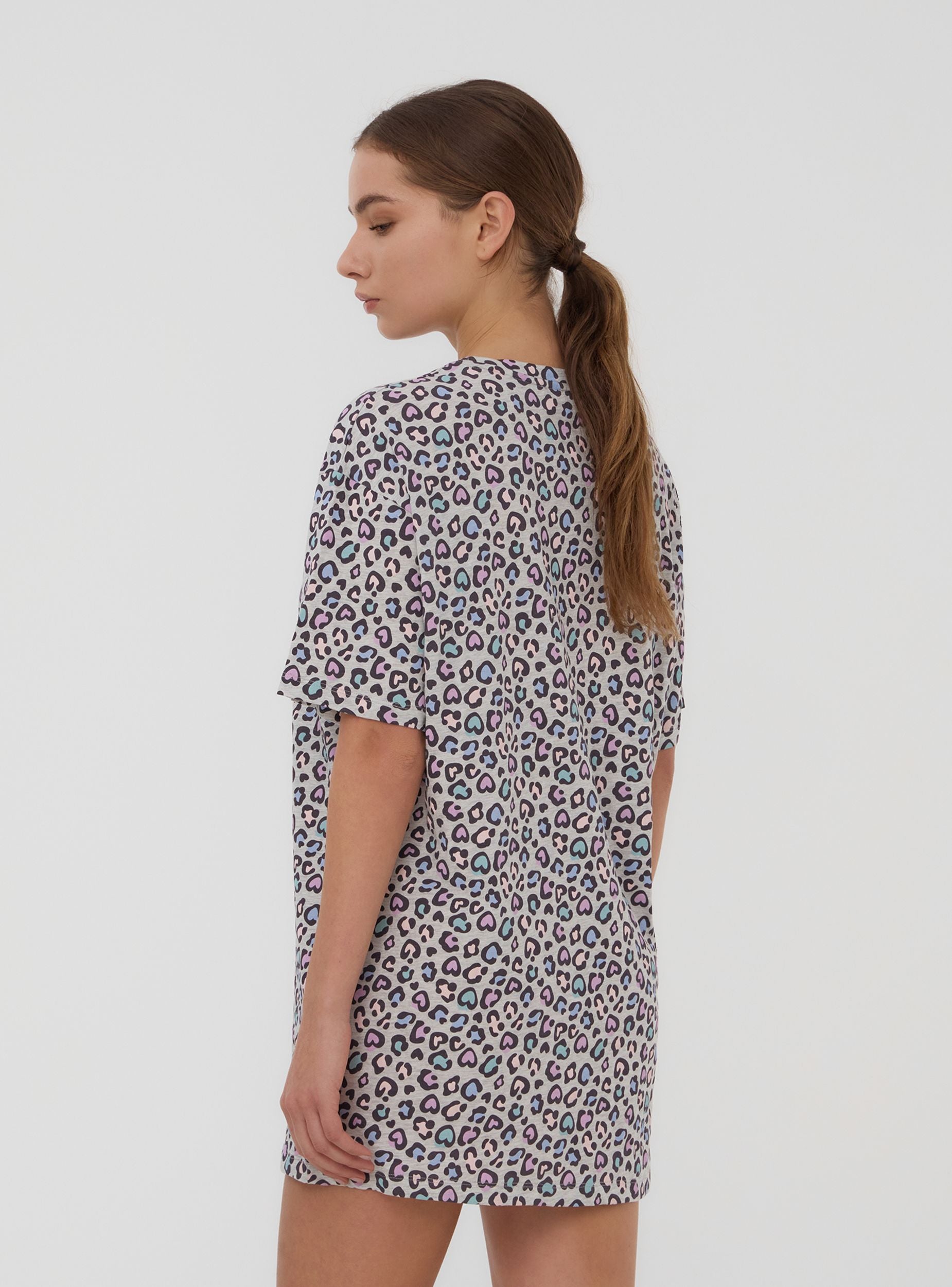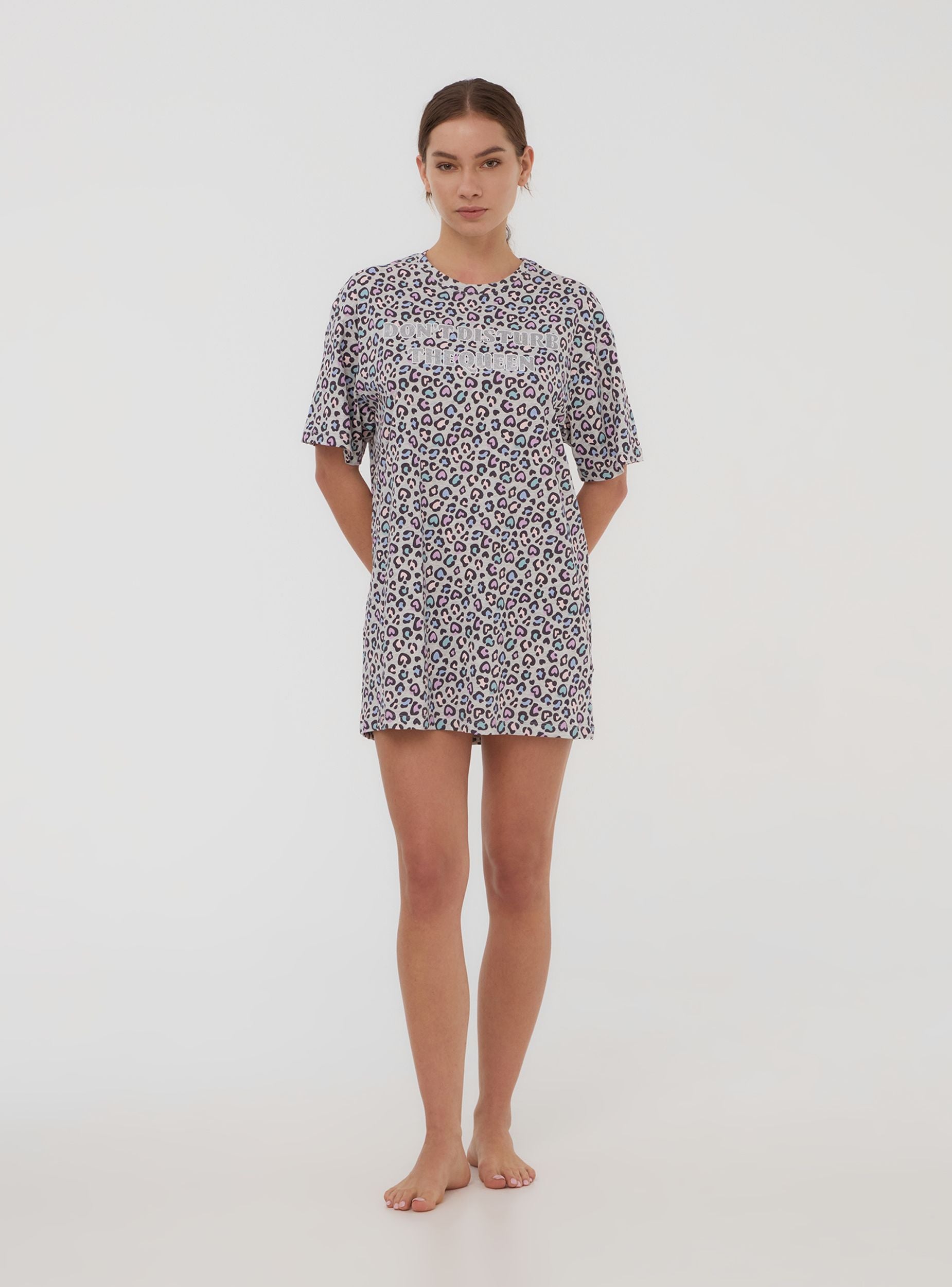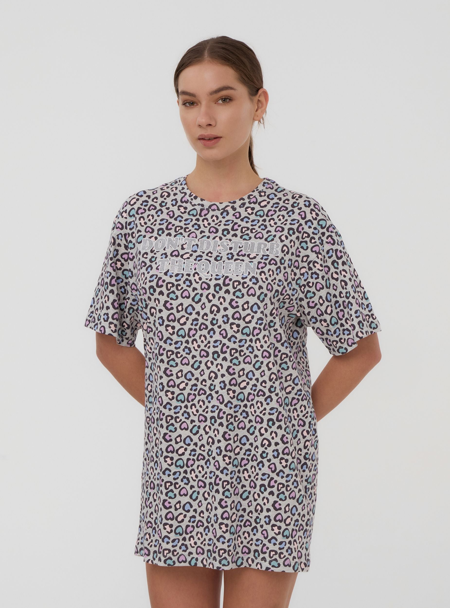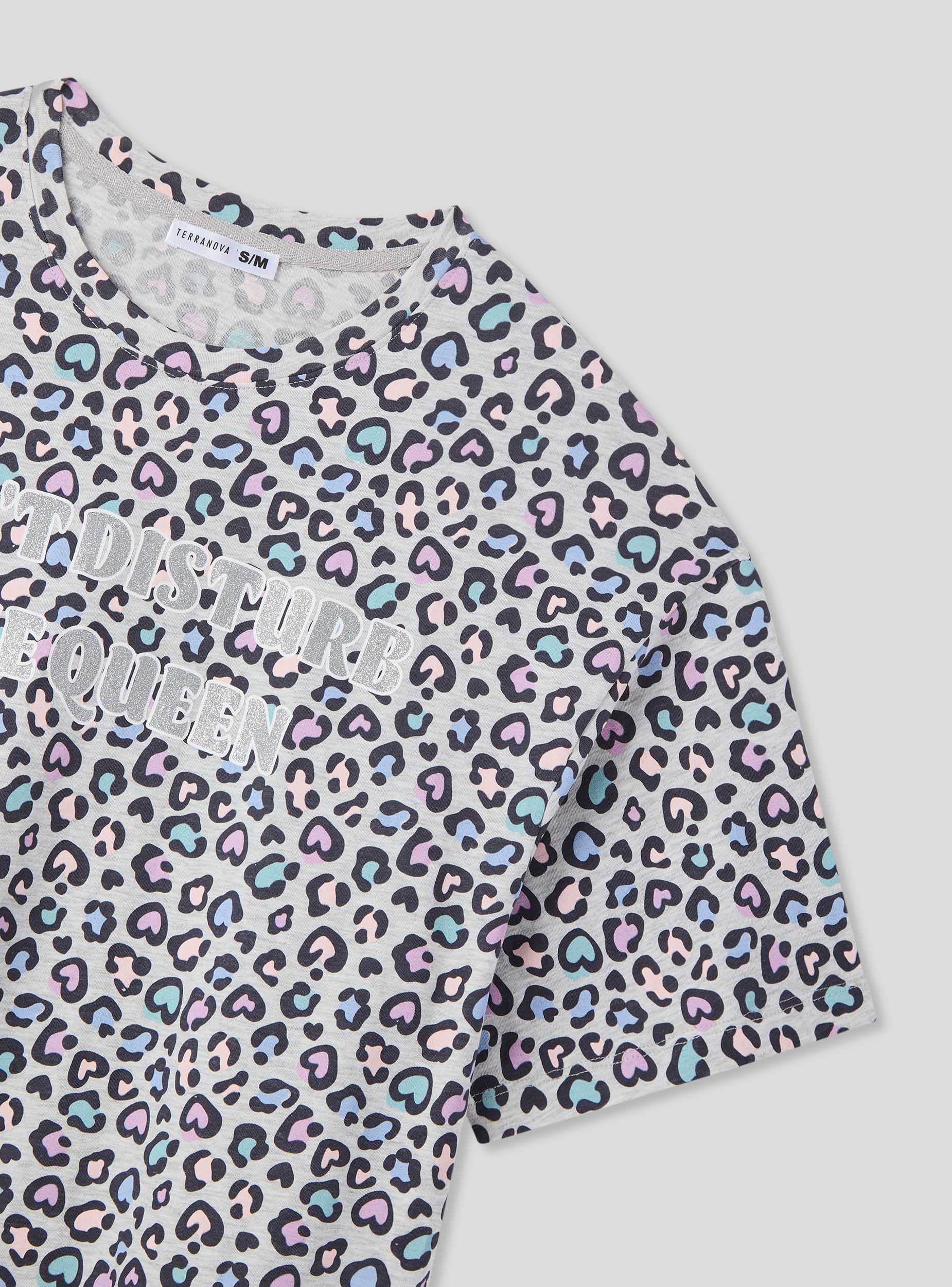 Maglietta del pigiama da donna perfetta per notti rilassanti, caratterizzata da una fantasia maculata arricchita da cuori romantici. Le maniche corte e il girocollo assicurano comodità, mentre la scritta decorata con glitter dona un tocco glamour. Ideale per un look confortevole e alla moda in casa.Dettagli