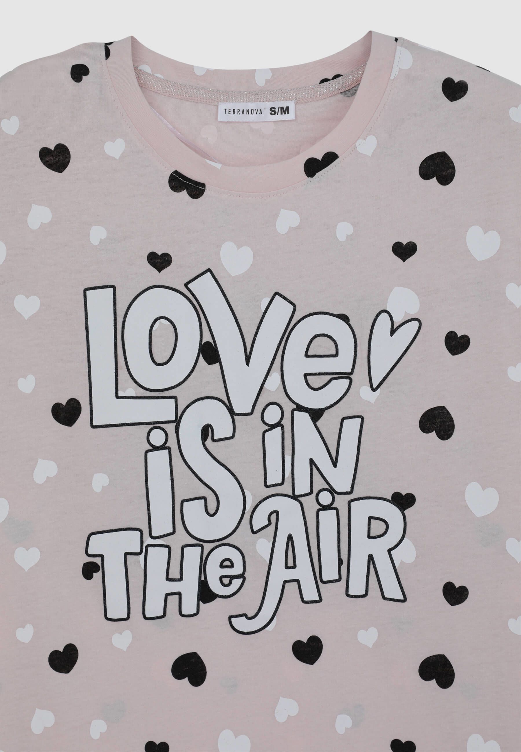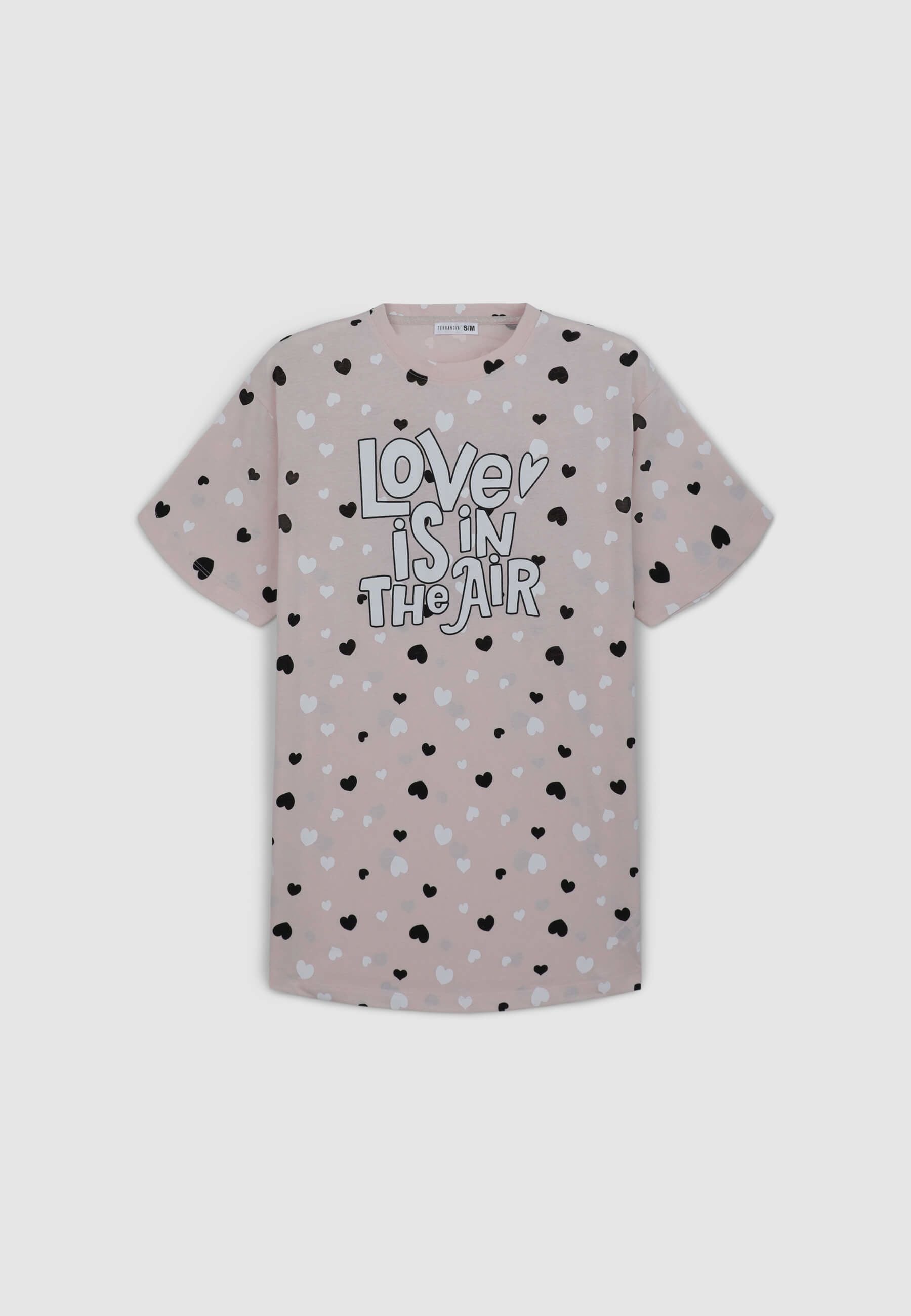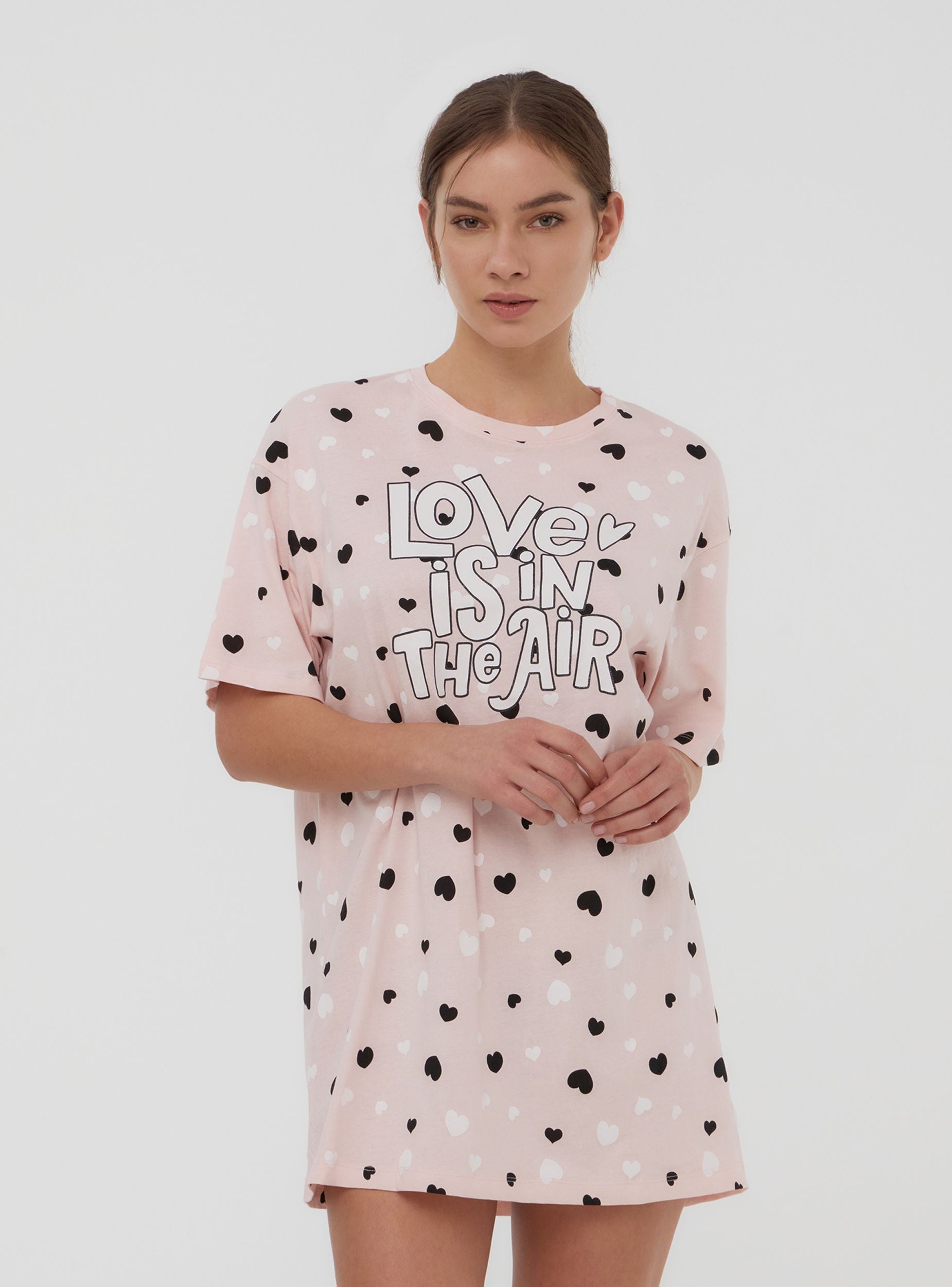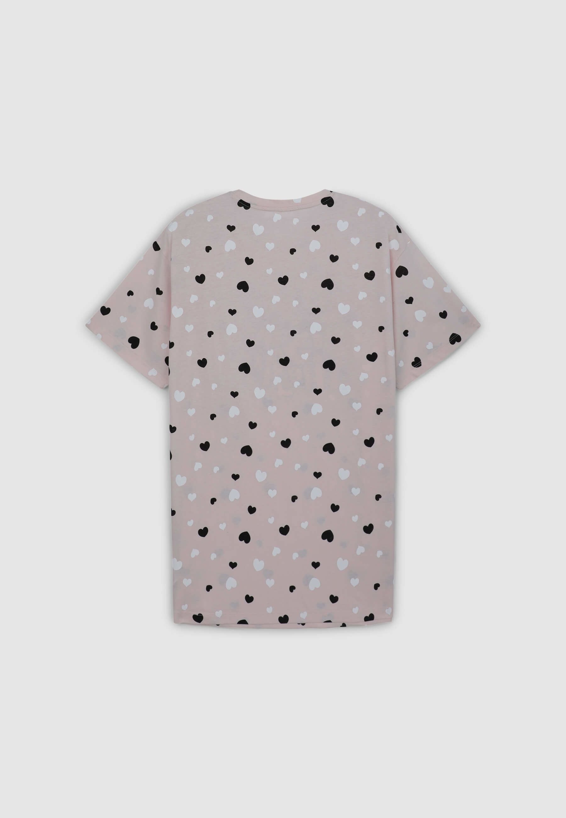 Maglietta lunga da donna perfetta come pigiama, con vestibilità over che assicura comfort e libertà di movimento. Il design con maniche corte e girocollo offre una sensazione di morbidezza ideale per il relax. La stampa con cuori e scritta aggiunge un tocco romantico e giocoso. Ideale da sola o da abbinare a leggings o shorts da notte, è perfetta per serate di puro benessere e dolci momenti di riposo.Dettagli