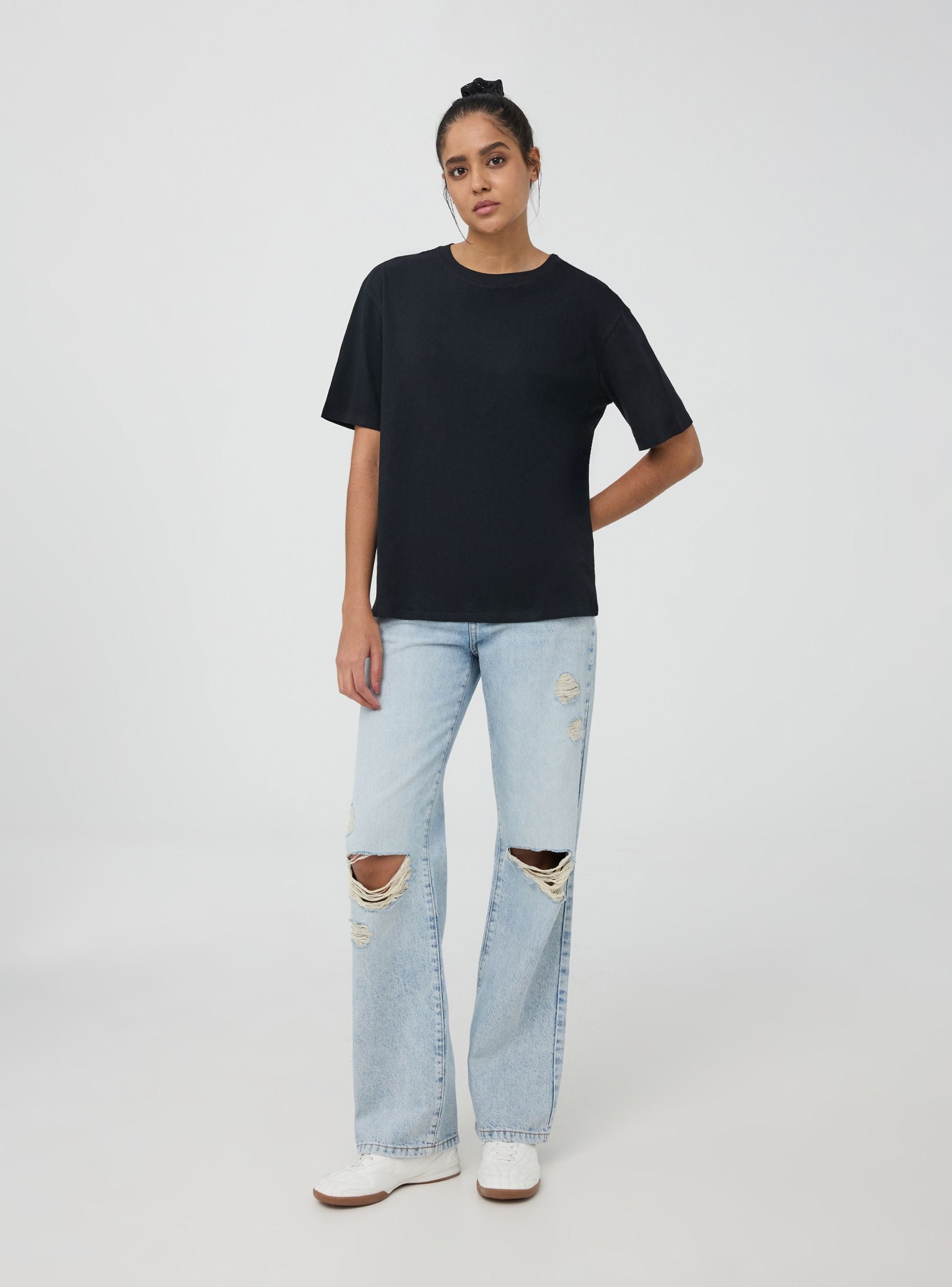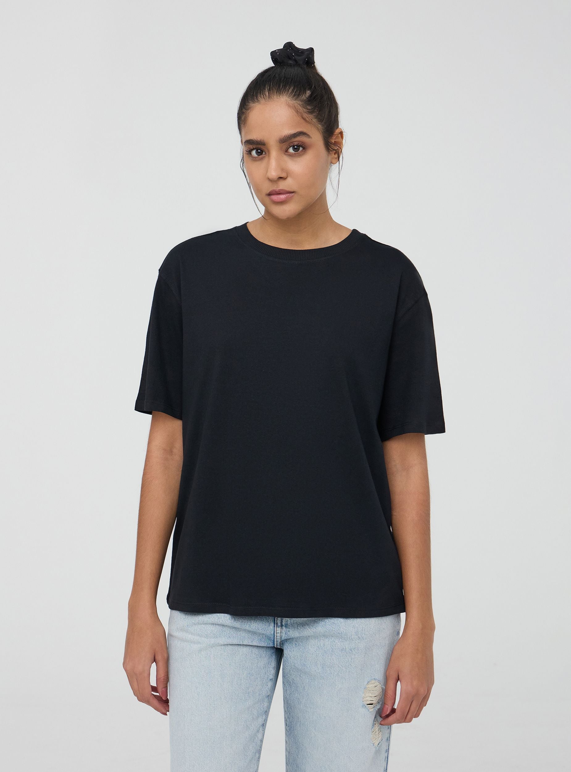 Maglietta da donna con taglio oversize, caratterizzata da un design semplice e ampio. Le maniche sono corte e larghe, e lo scollo rotondo contribuisce a un look casual e rilassato. La parte anteriore e posteriore del capo sono lisce e prive di decorazioni, il che la rende versatile e facile da abbinare per diverse occasioni. Perfetta per un look quotidiano e confortevole.Dettagli