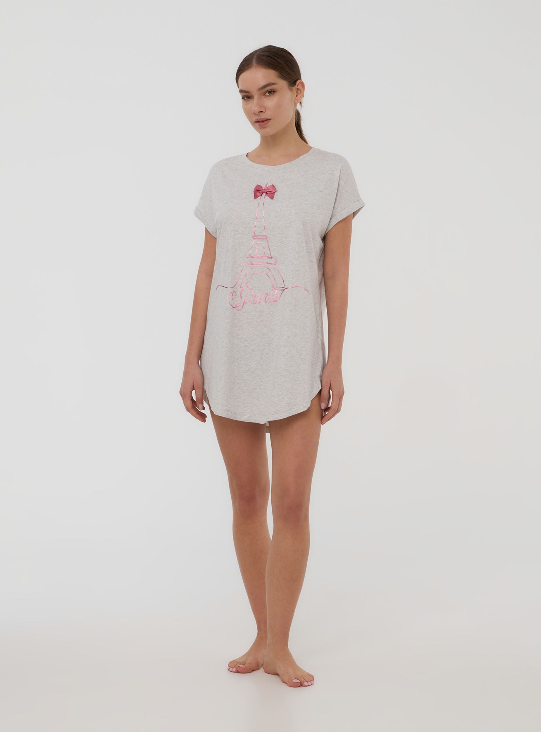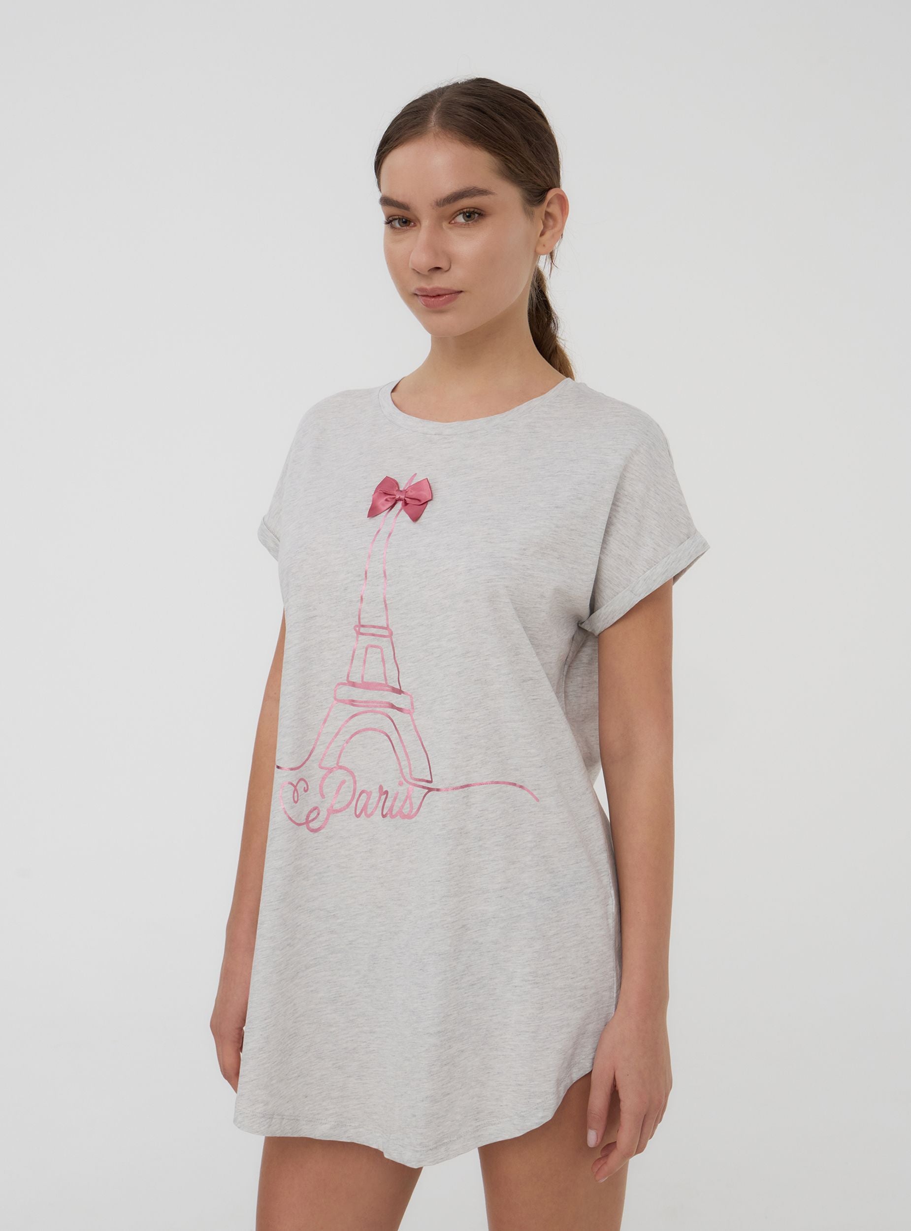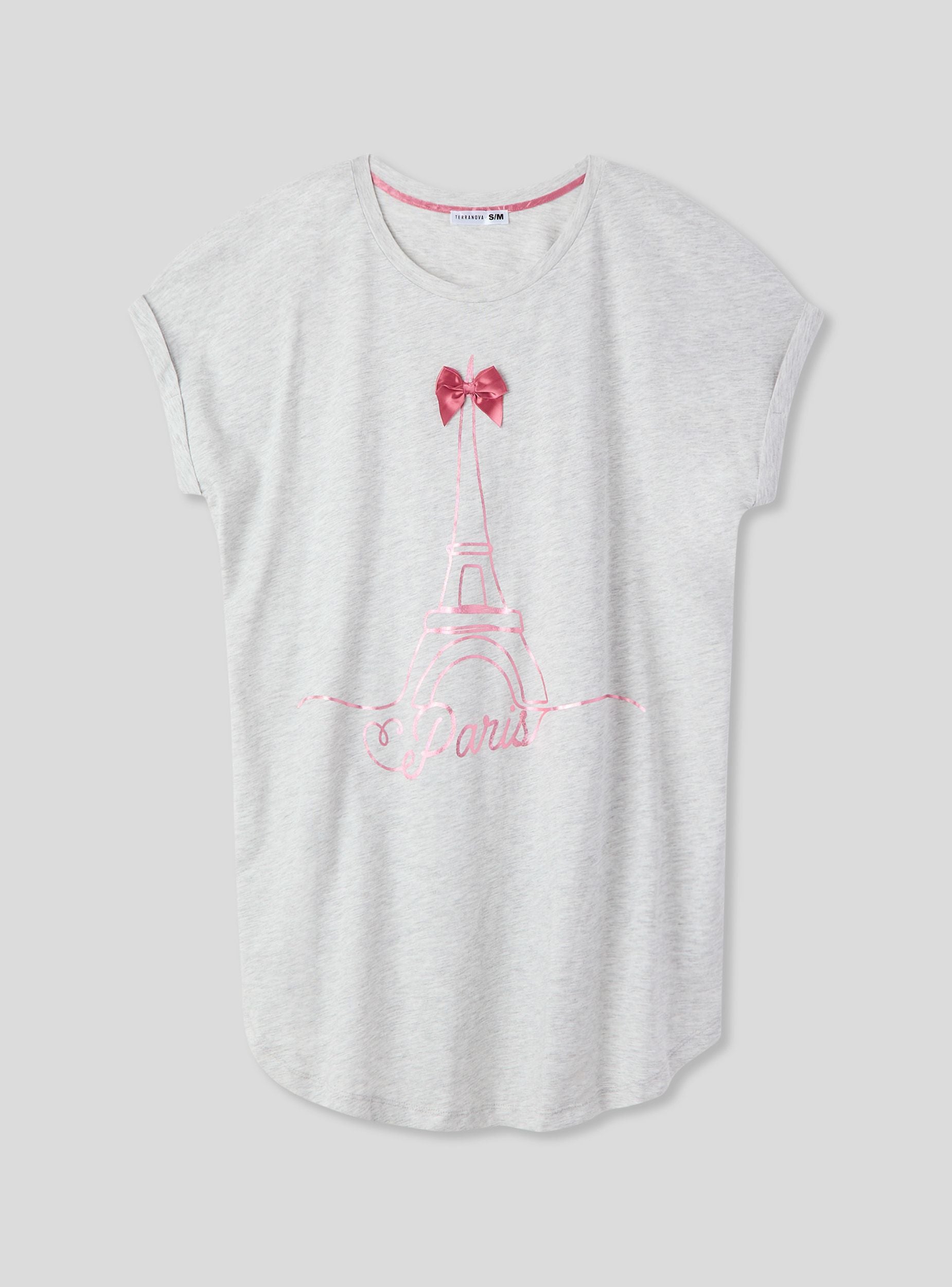Maglietta del pigiama da donna dal design romantico e confortevole, con vestibilità ampia e orlo stondato per un tocco raffinato. Le maniche corte e il girocollo assicurano comodità durante la notte, mentre la stampa dedicata a Parigi aggiunge un dettaglio sognante. Perfetta da abbinare a pantaloni o shorts da pigiama, è ideale per serate rilassanti e dolci momenti di riposo.Dettagli