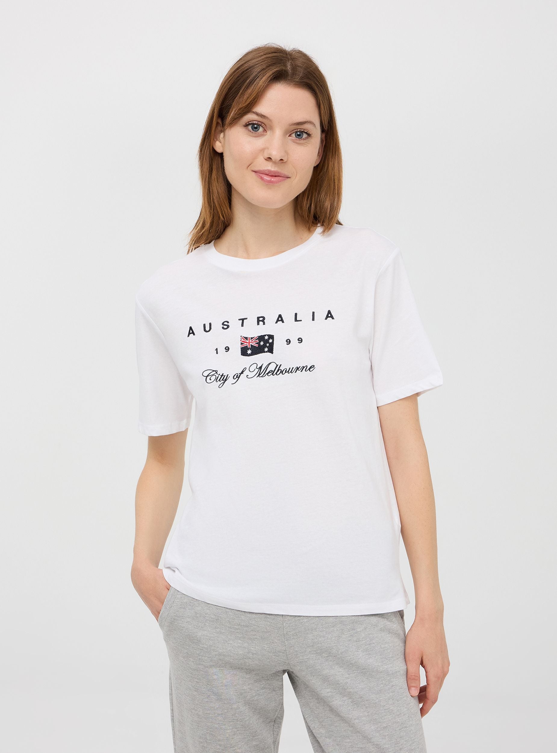Maglietta da donna in jersey di cotone con ricamo college. Modello girocollo con maniche corte. Vestibilità ampia.Dettagli