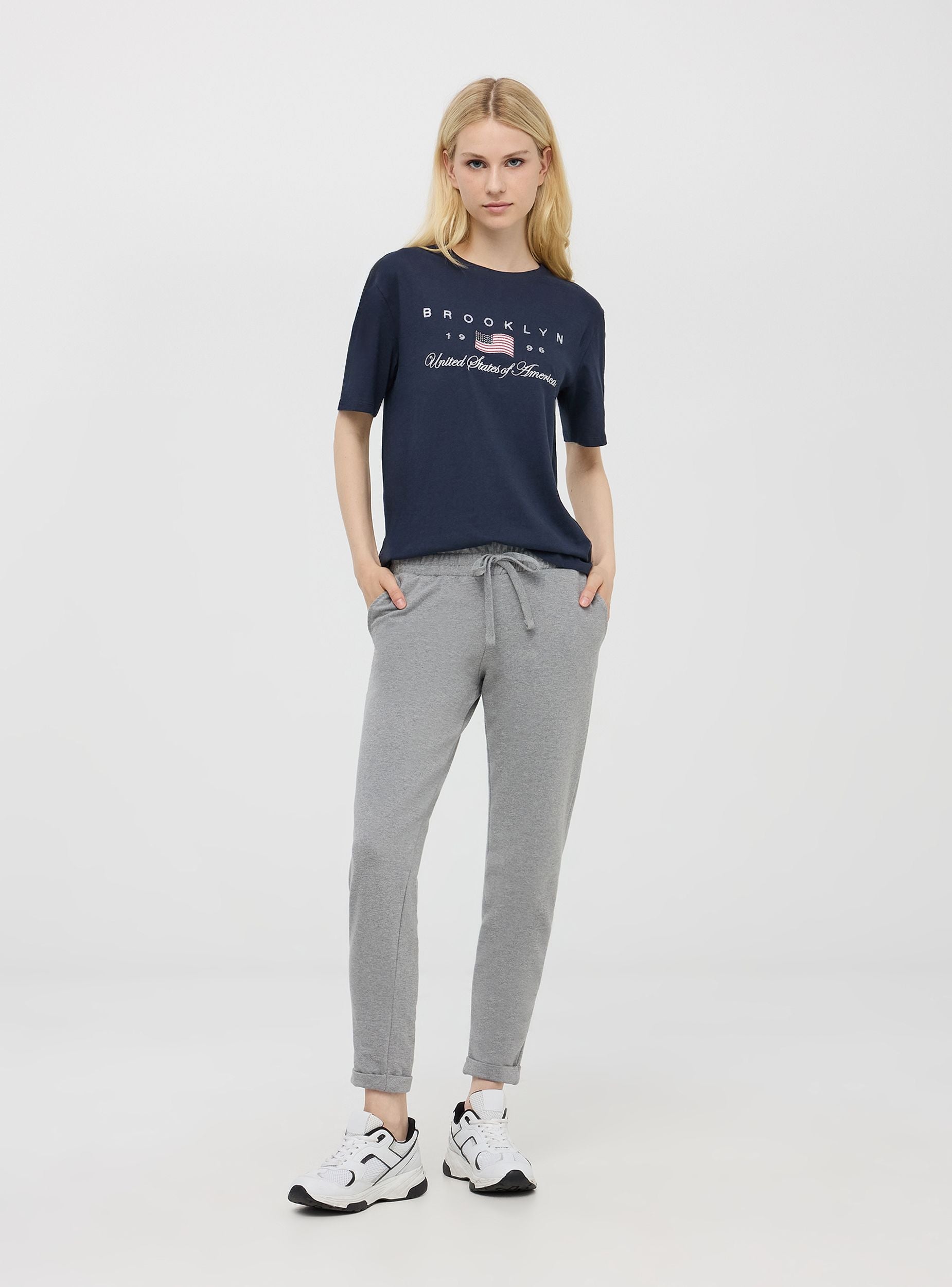 Maglietta da donna in jersey di cotone con ricamo college. Modello girocollo con maniche corte. Vestibilità ampia.Dettagli