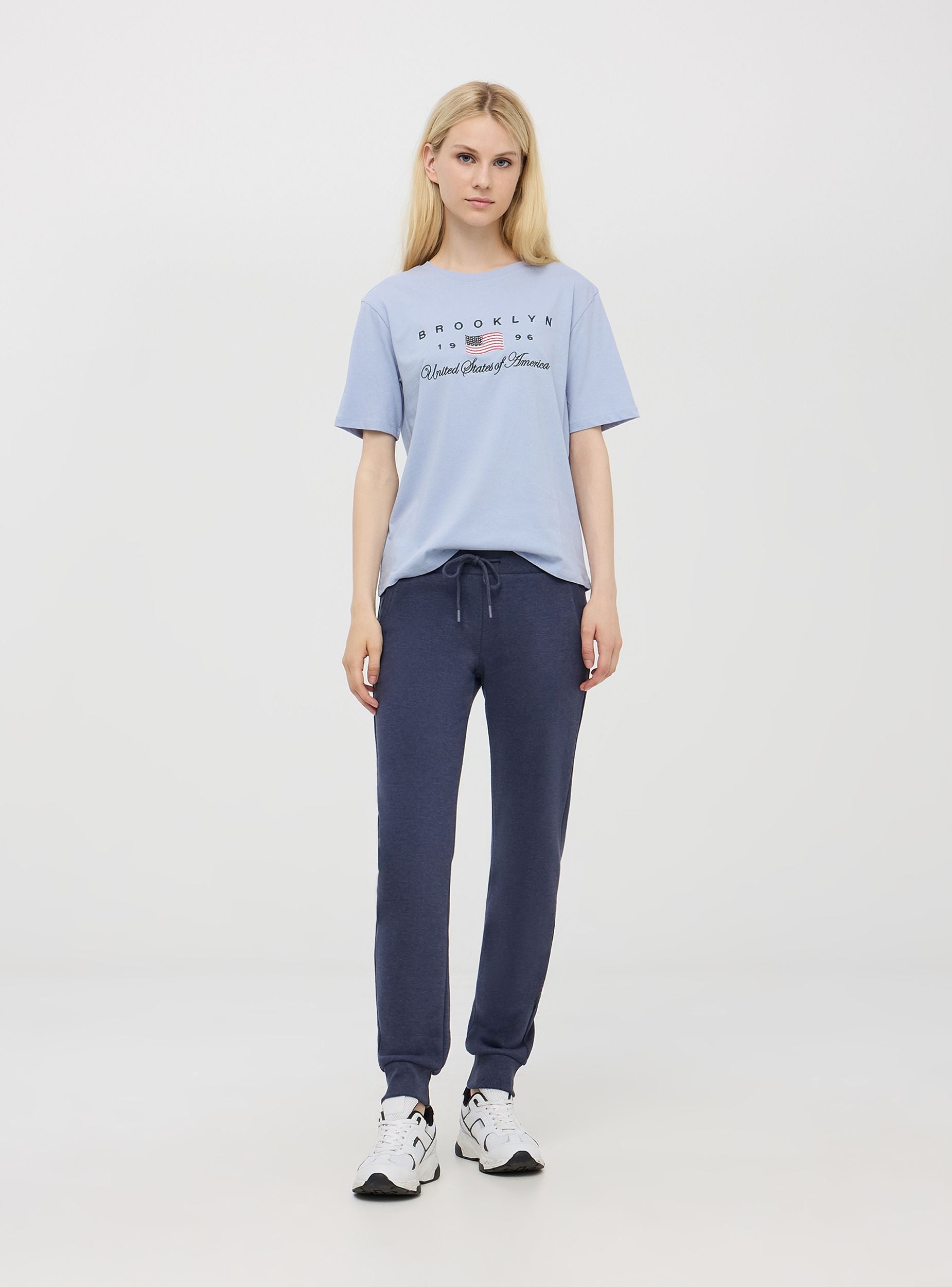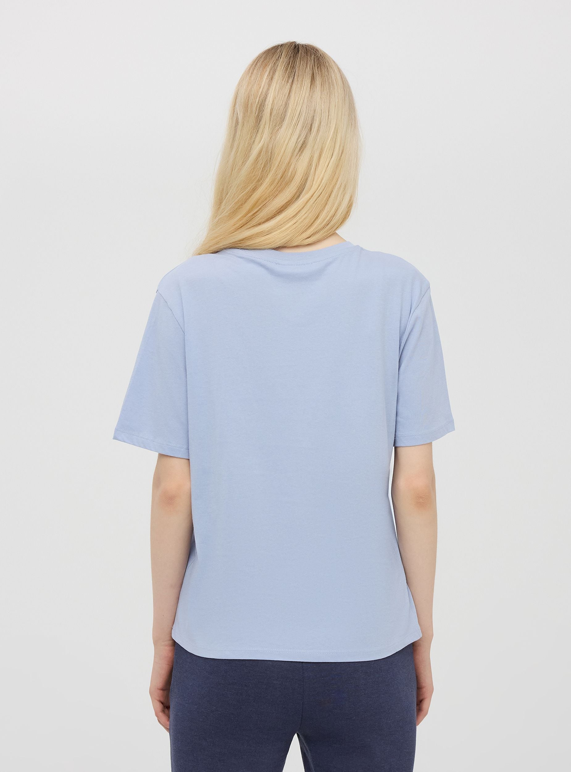 Maglietta da donna in jersey di cotone con ricamo college. Modello girocollo con maniche corte. Vestibilità ampia.Dettagli