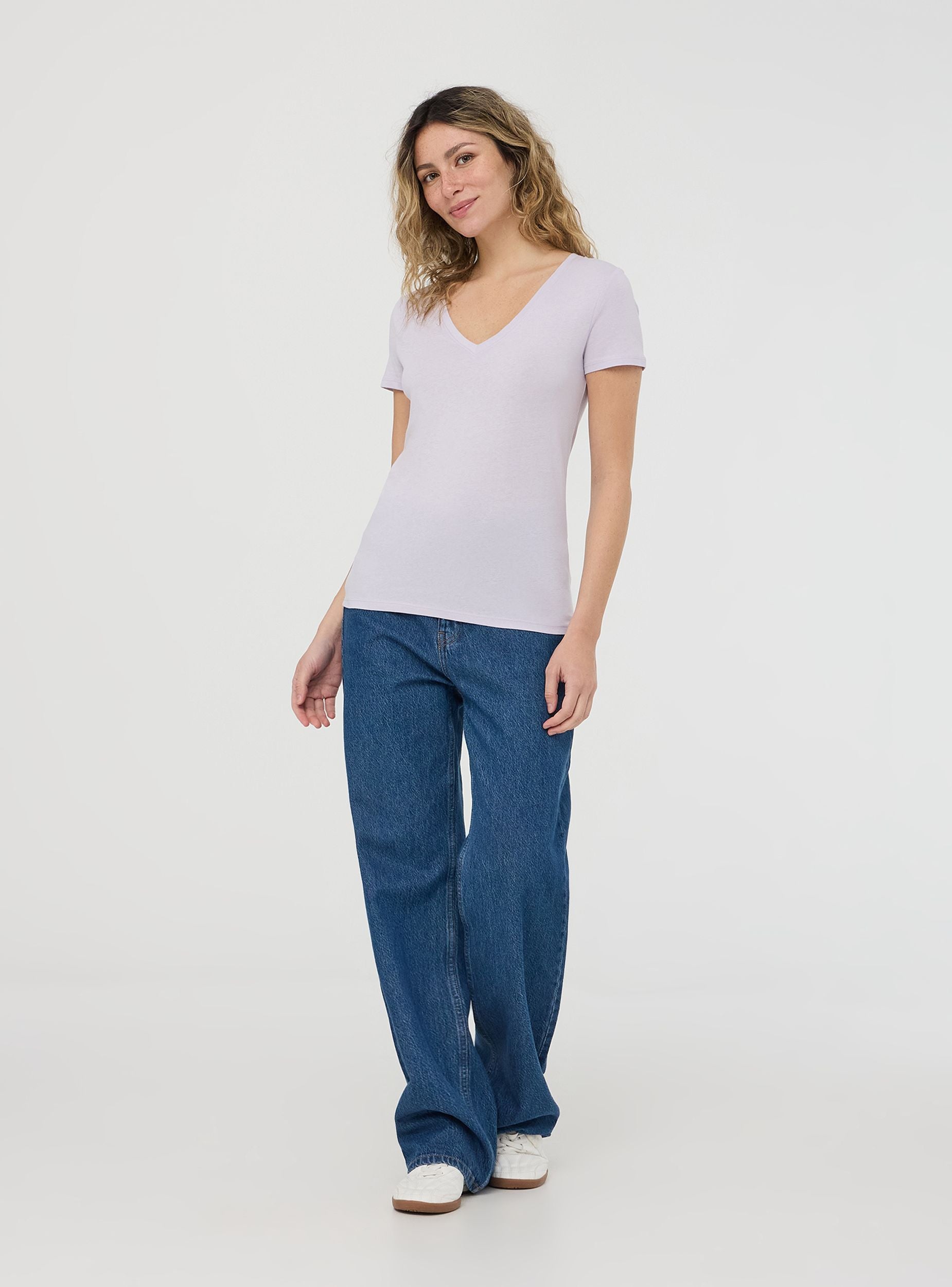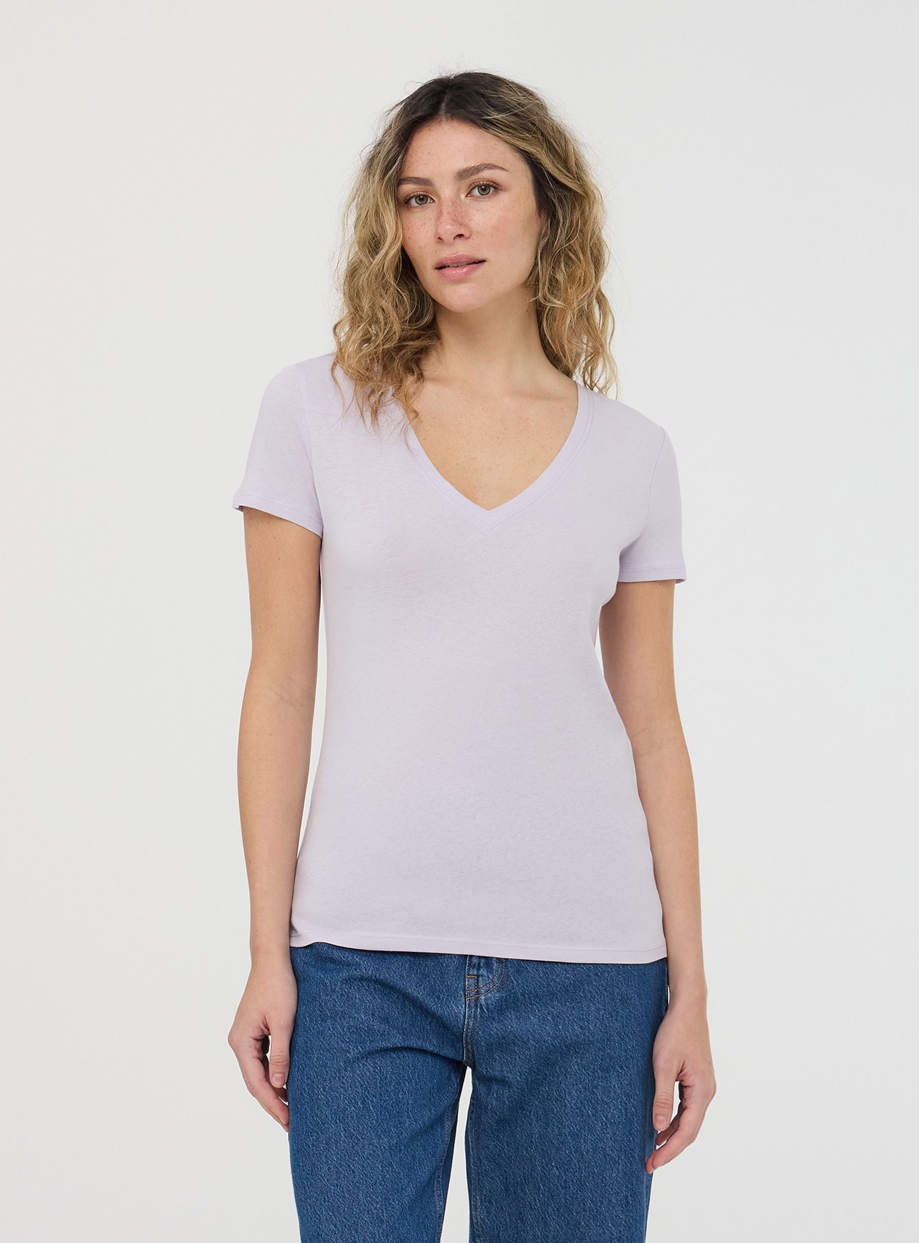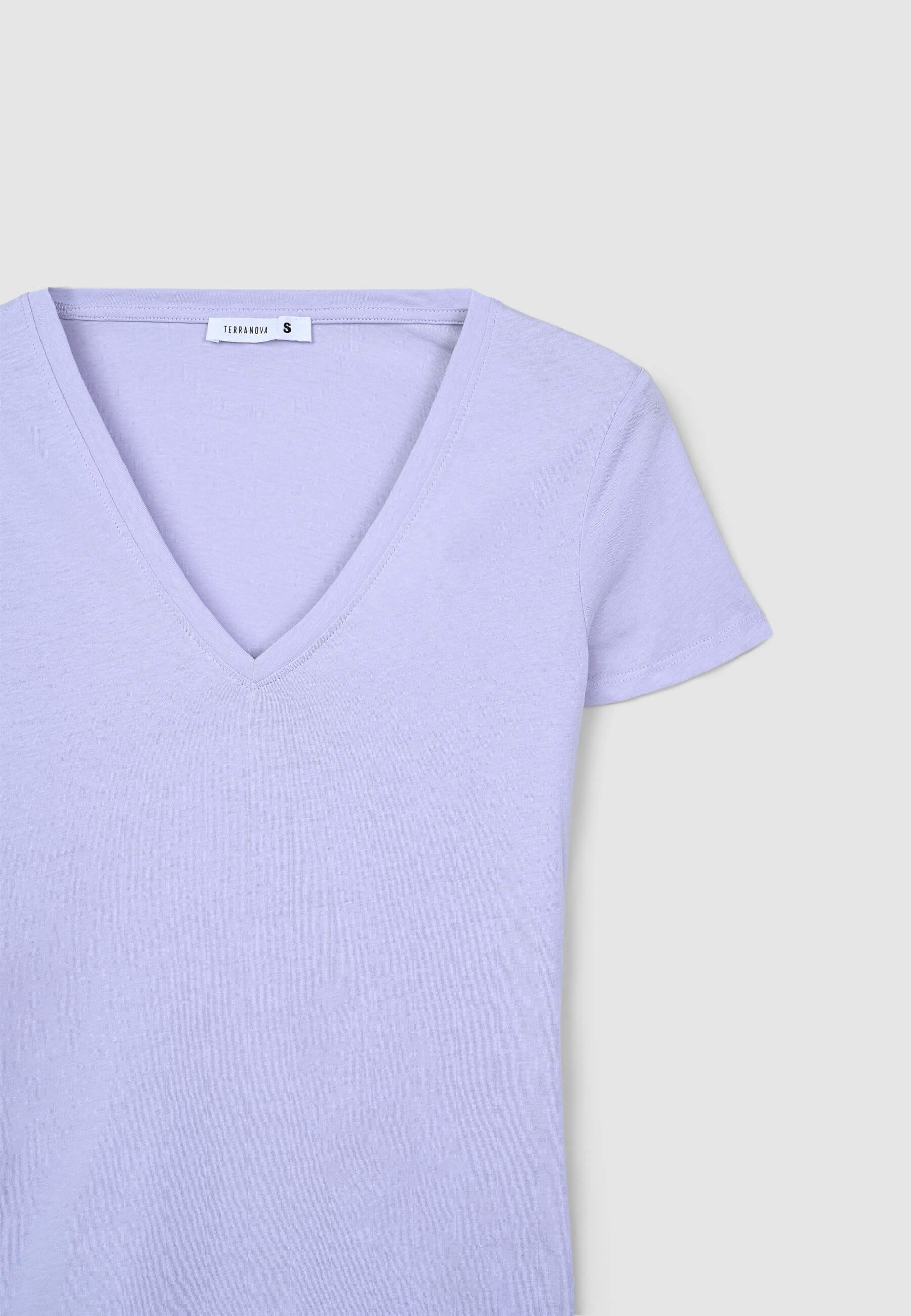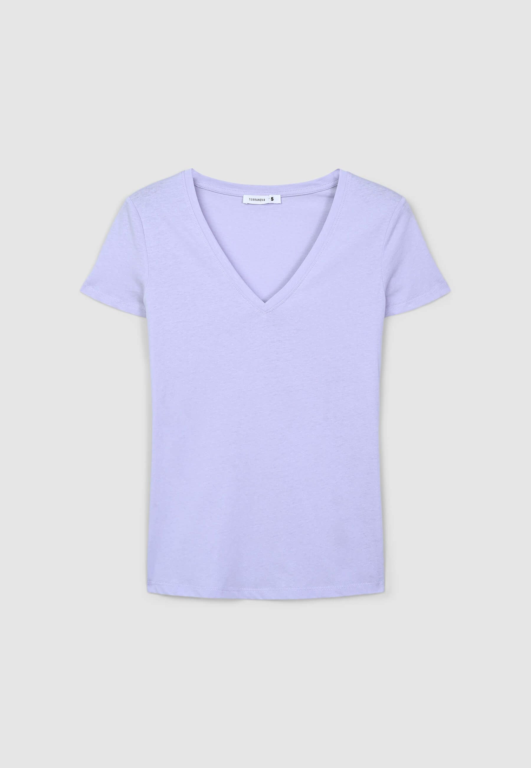 Maglietta da donna a tinta unita con scollo a V. Design semplice e versatile, perfetto per diverse occasioni, dal look casual a più formale. Lo scollo valorizza la figura, rendendo questo capo ideale per l'estate o per essere indossato sotto una giacca.Dettagli