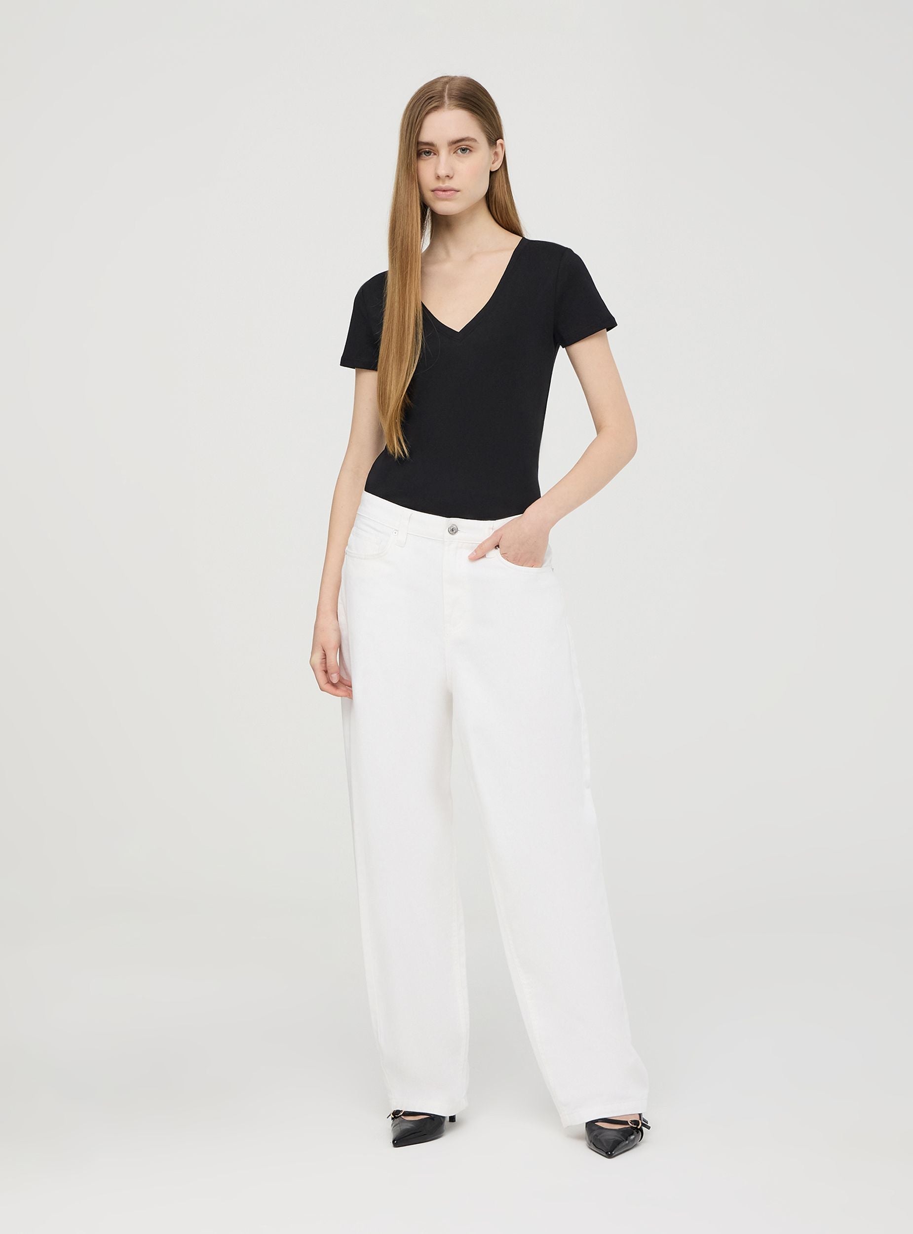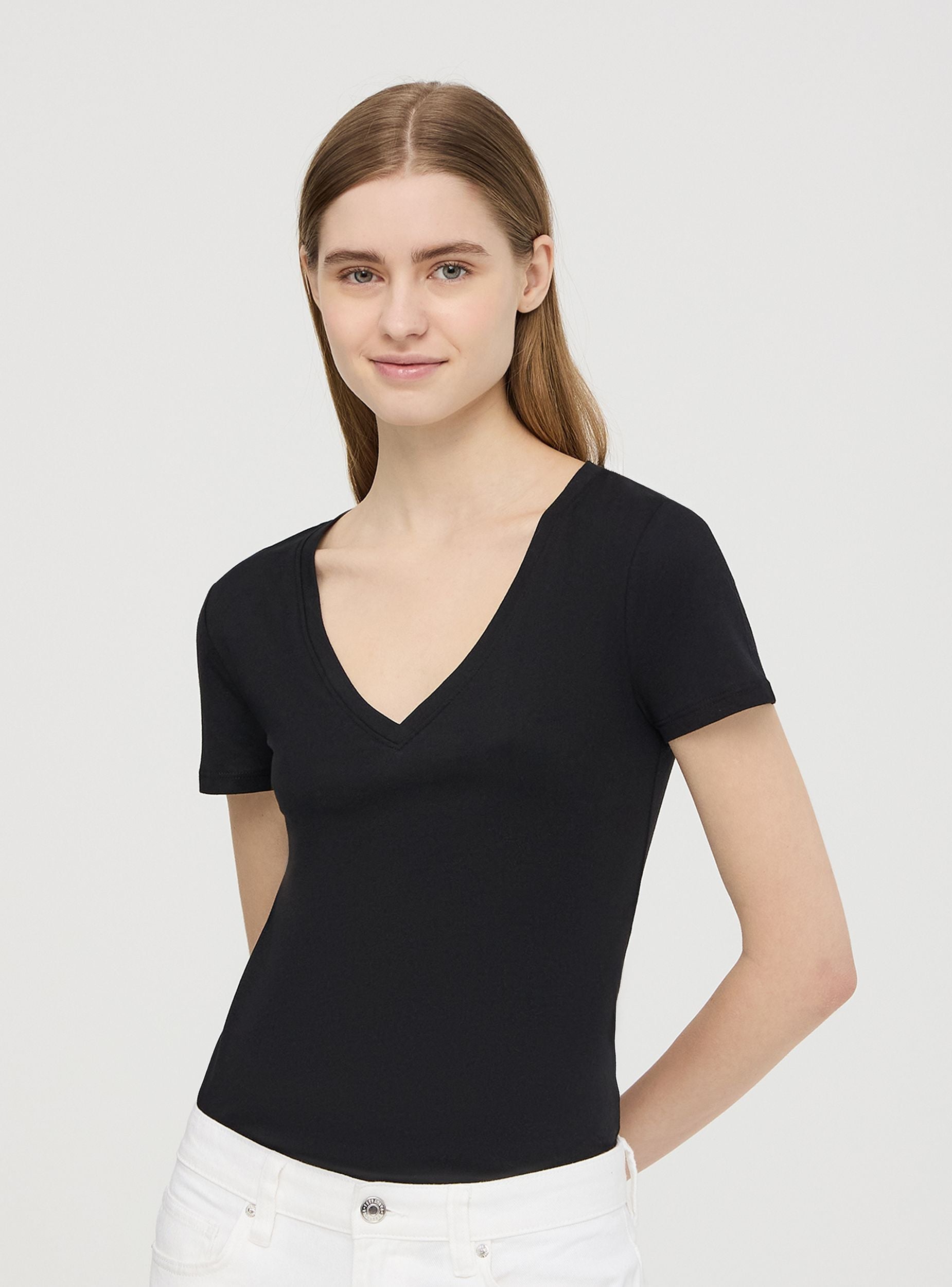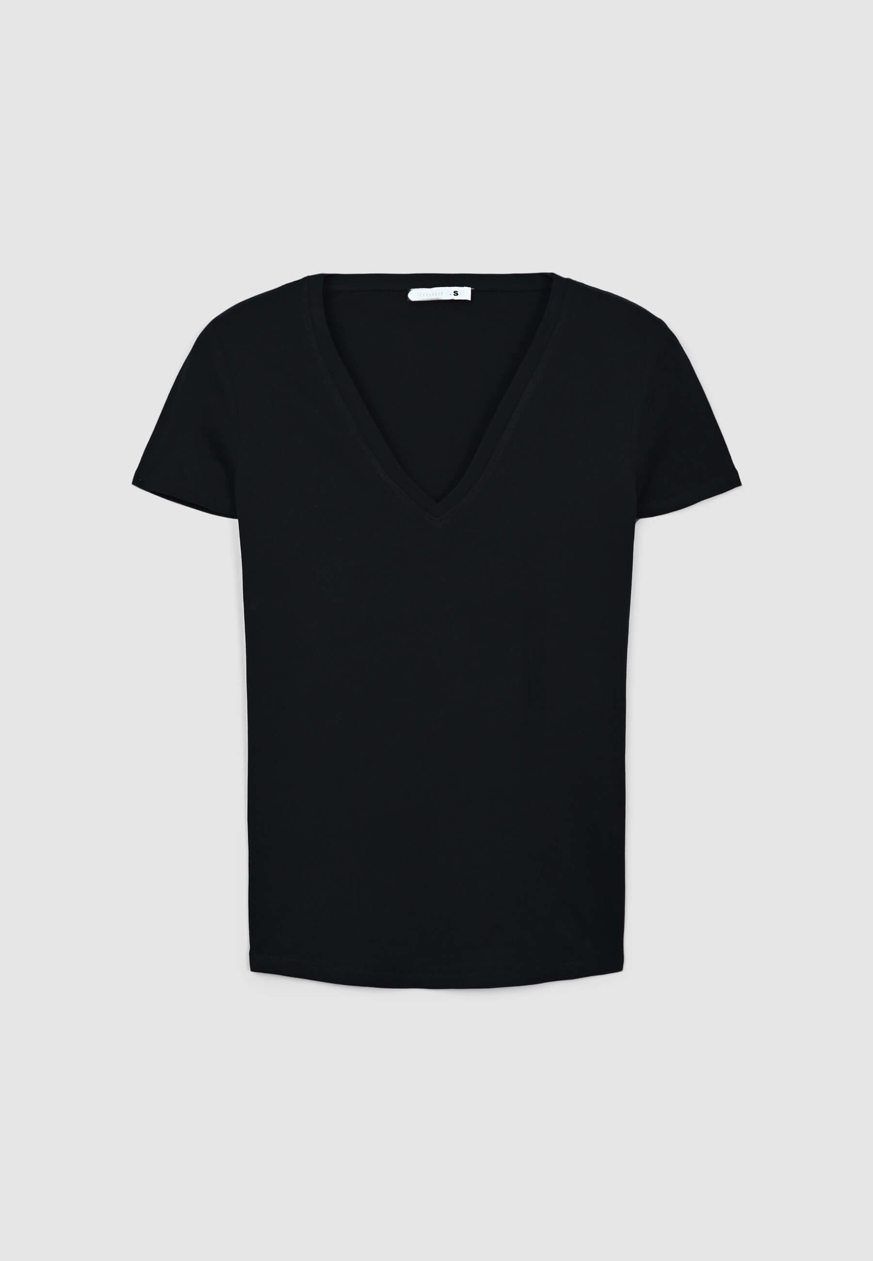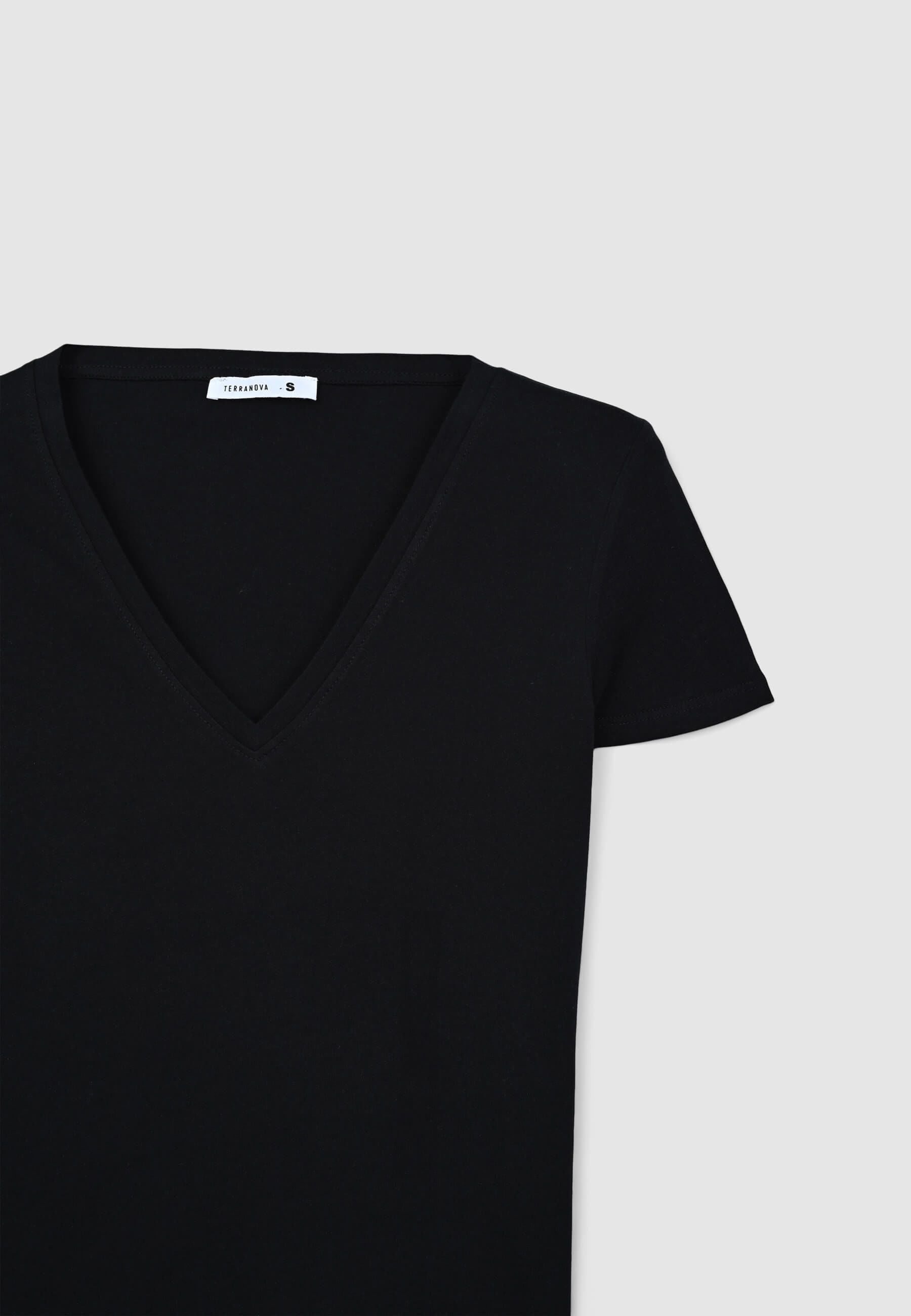 Maglietta da donna a tinta unita con scollo a V. Design semplice e versatile, perfetto per diverse occasioni, dal look casual a più formale. Lo scollo valorizza la figura, rendendo questo capo ideale per l'estate o per essere indossato sotto una giacca.Dettagli