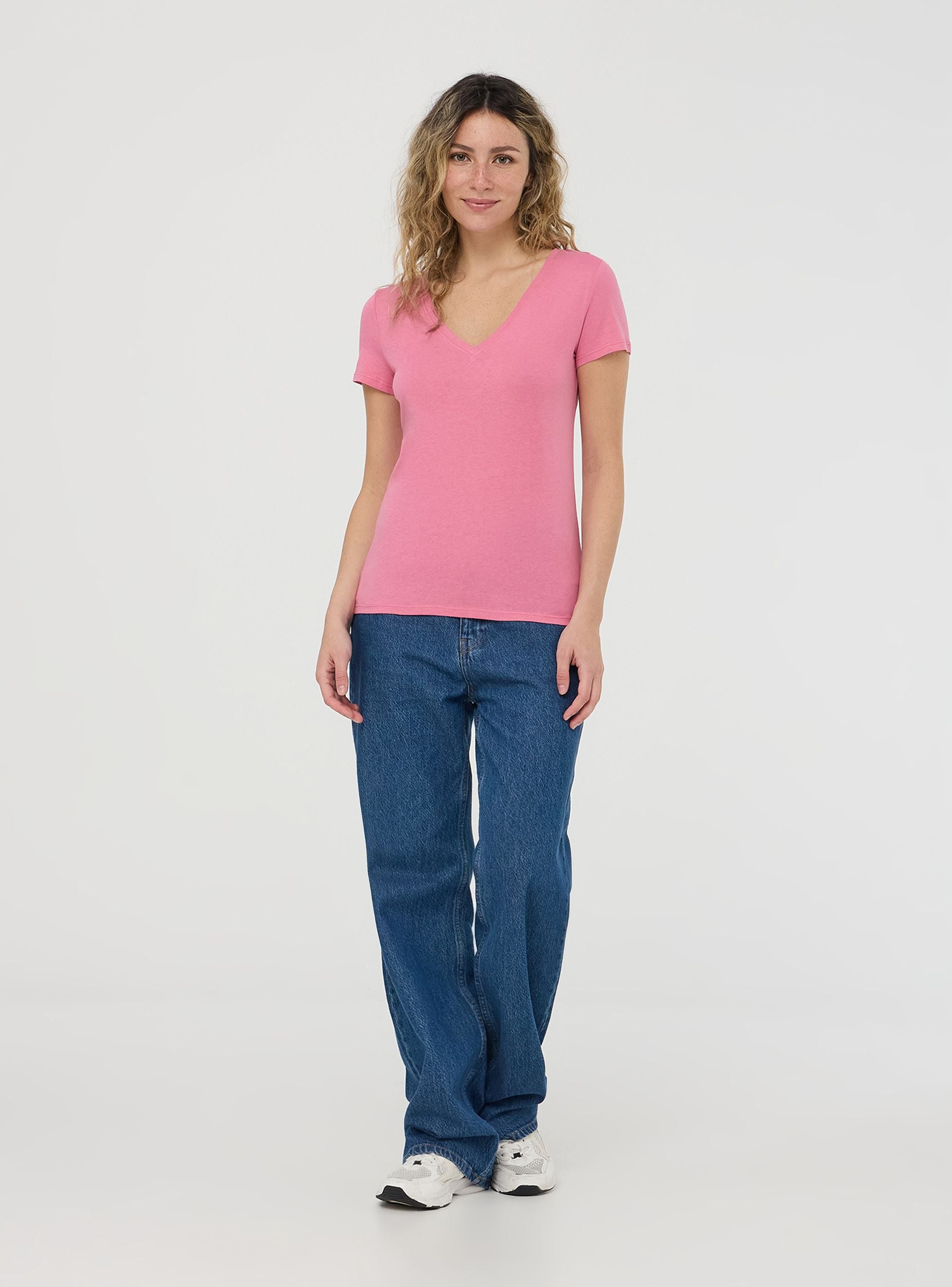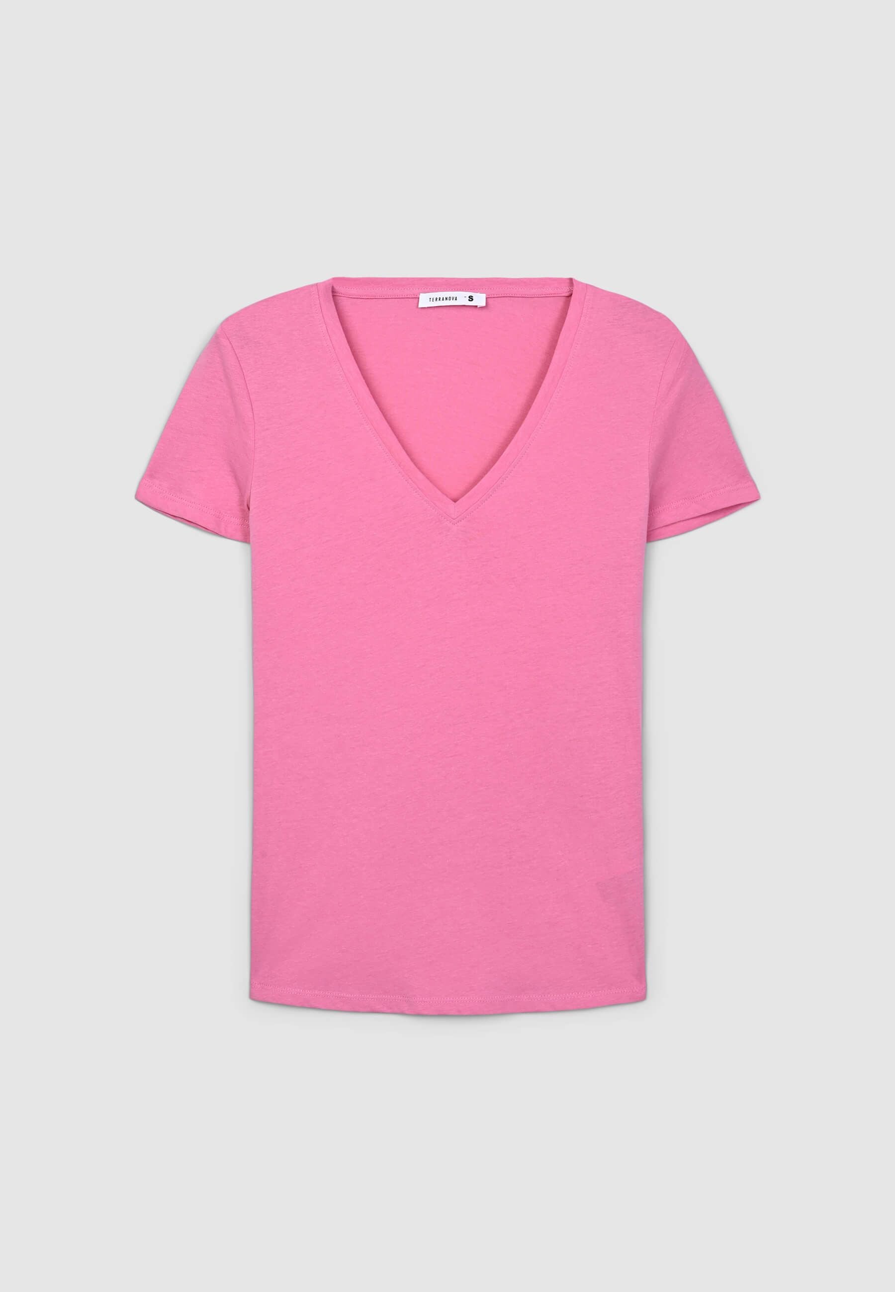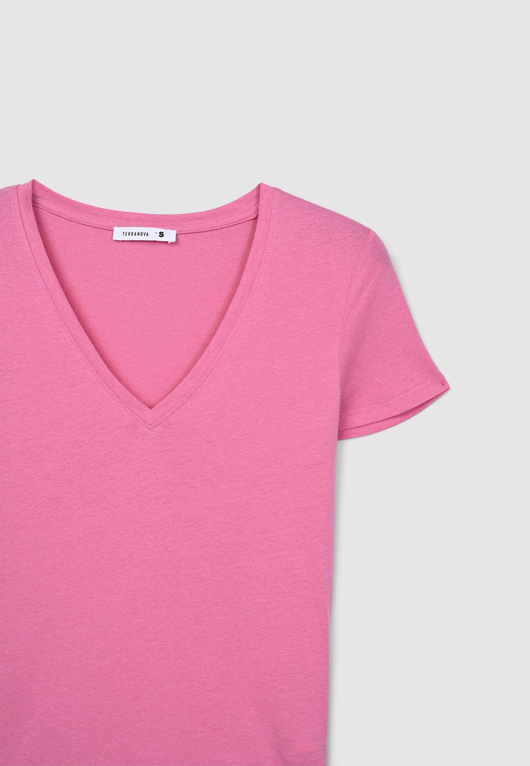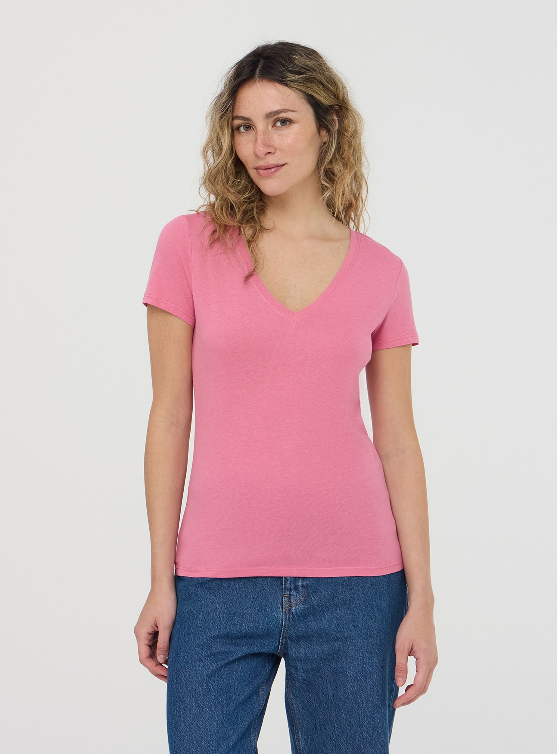 Maglietta da donna a tinta unita con scollo a V. Design semplice e versatile, perfetto per diverse occasioni, dal look casual a più formale. Lo scollo valorizza la figura, rendendo questo capo ideale per l'estate o per essere indossato sotto una giacca.Dettagli