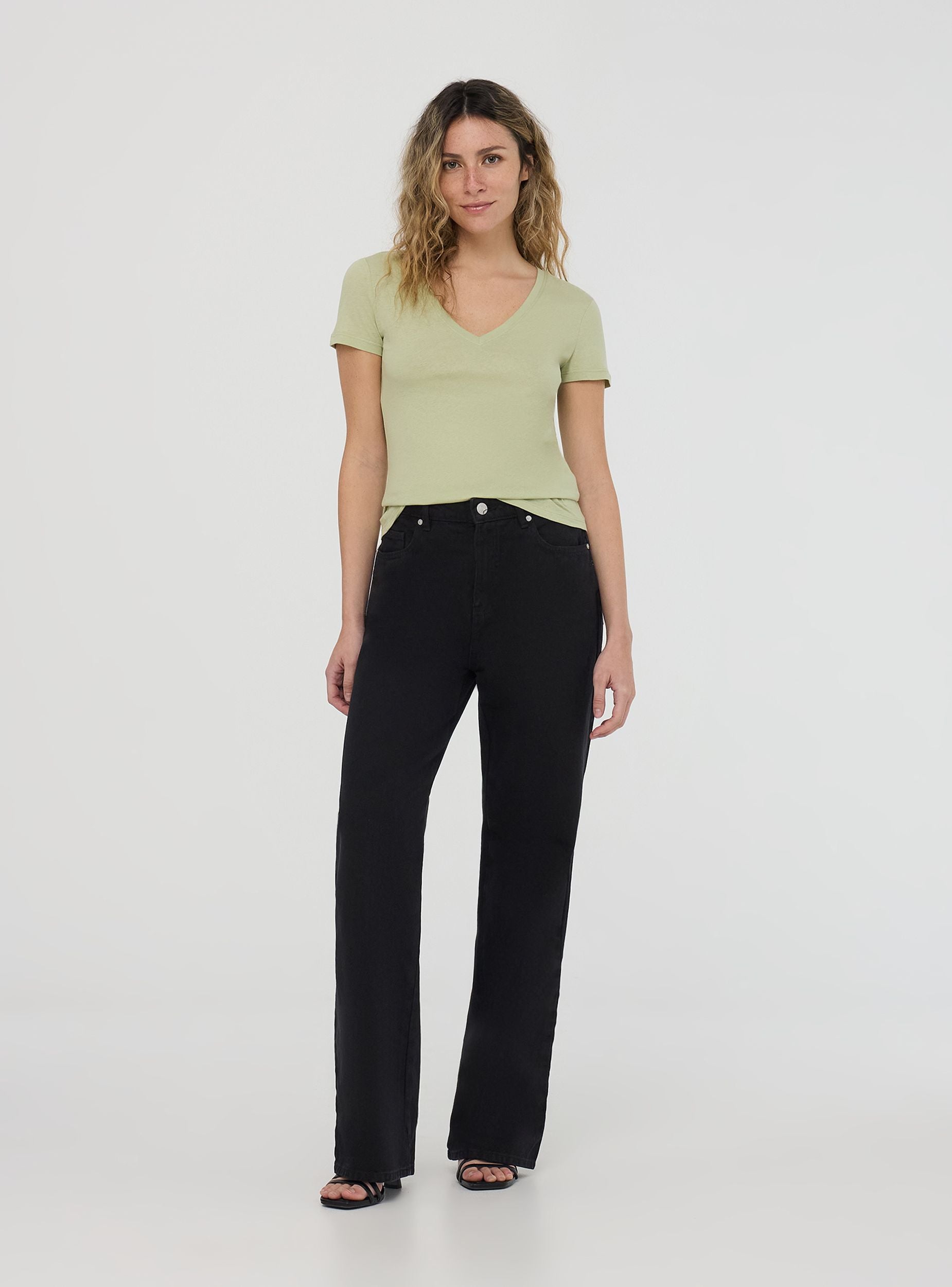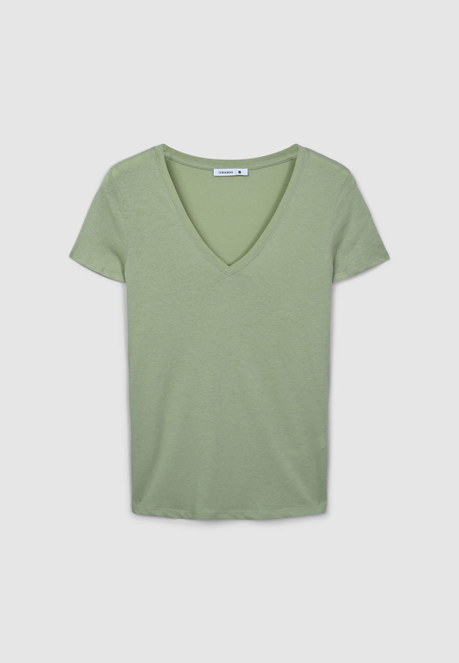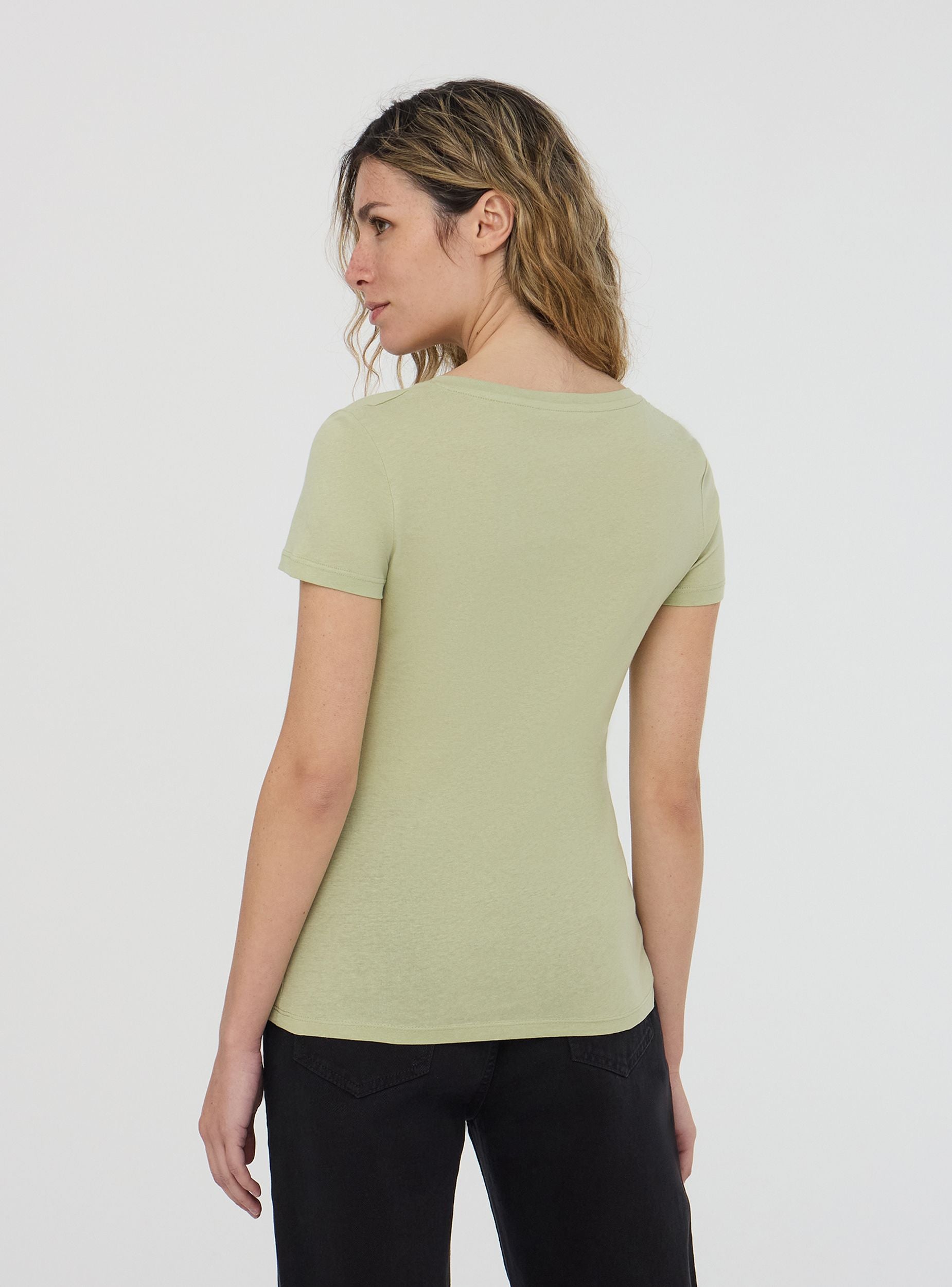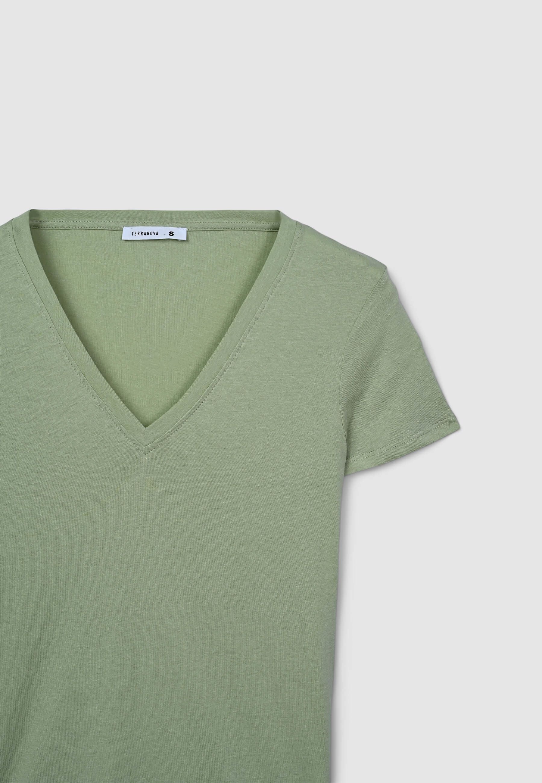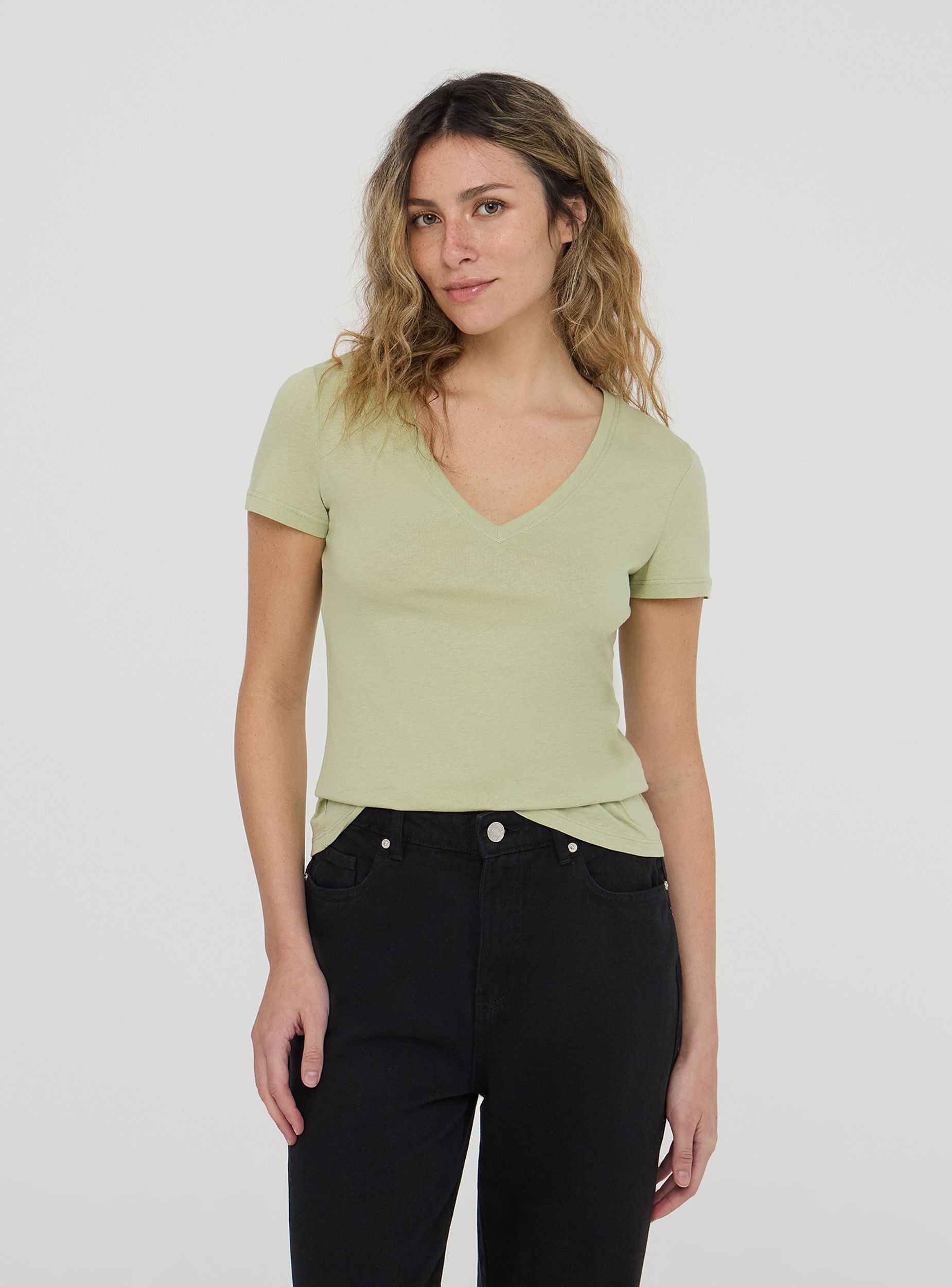 Maglietta da donna a tinta unita con scollo a V. Design semplice e versatile, perfetto per diverse occasioni, dal look casual a più formale. Lo scollo valorizza la figura, rendendo questo capo ideale per l'estate o per essere indossato sotto una giacca.Dettagli