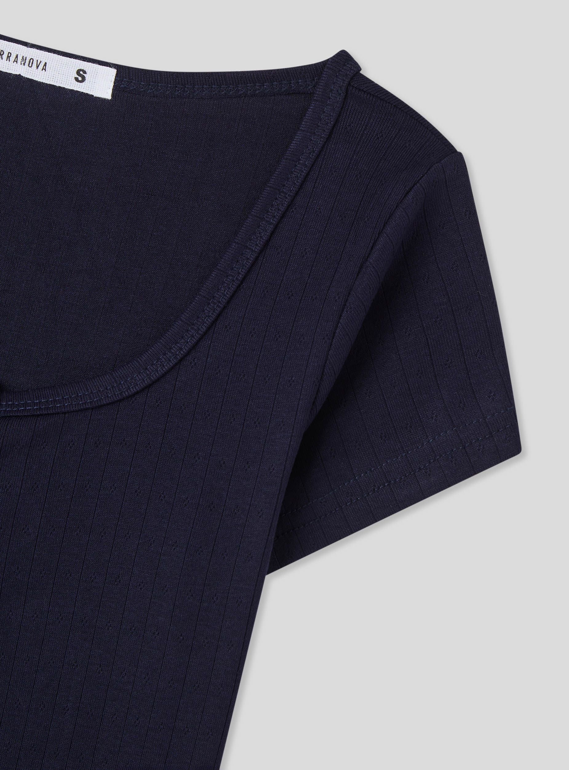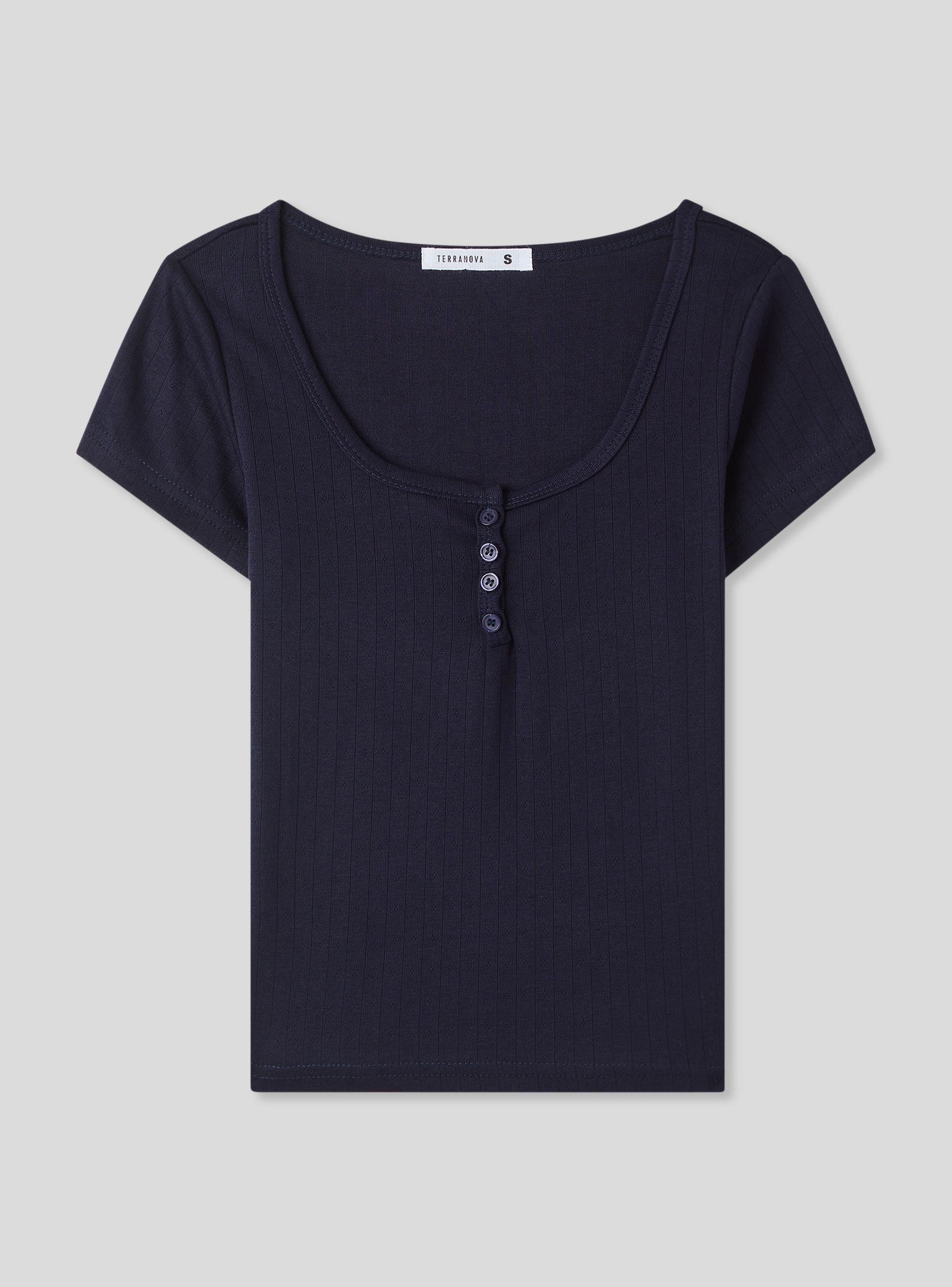 Maglietta da donna con design crop e maniche corte, ideale per un look casual e moderno. Presenta una scollatura rotonda e una fila di bottoni decorativi sul davanti, aggiungendo un tocco di stile. Perfetta da abbinare a jeans o pantaloni a vita alta per un outfit versatile e alla moda. La vestibilità aderente valorizza la silhouette, rendendola adatta a diverse occasioni informali.Dettagli