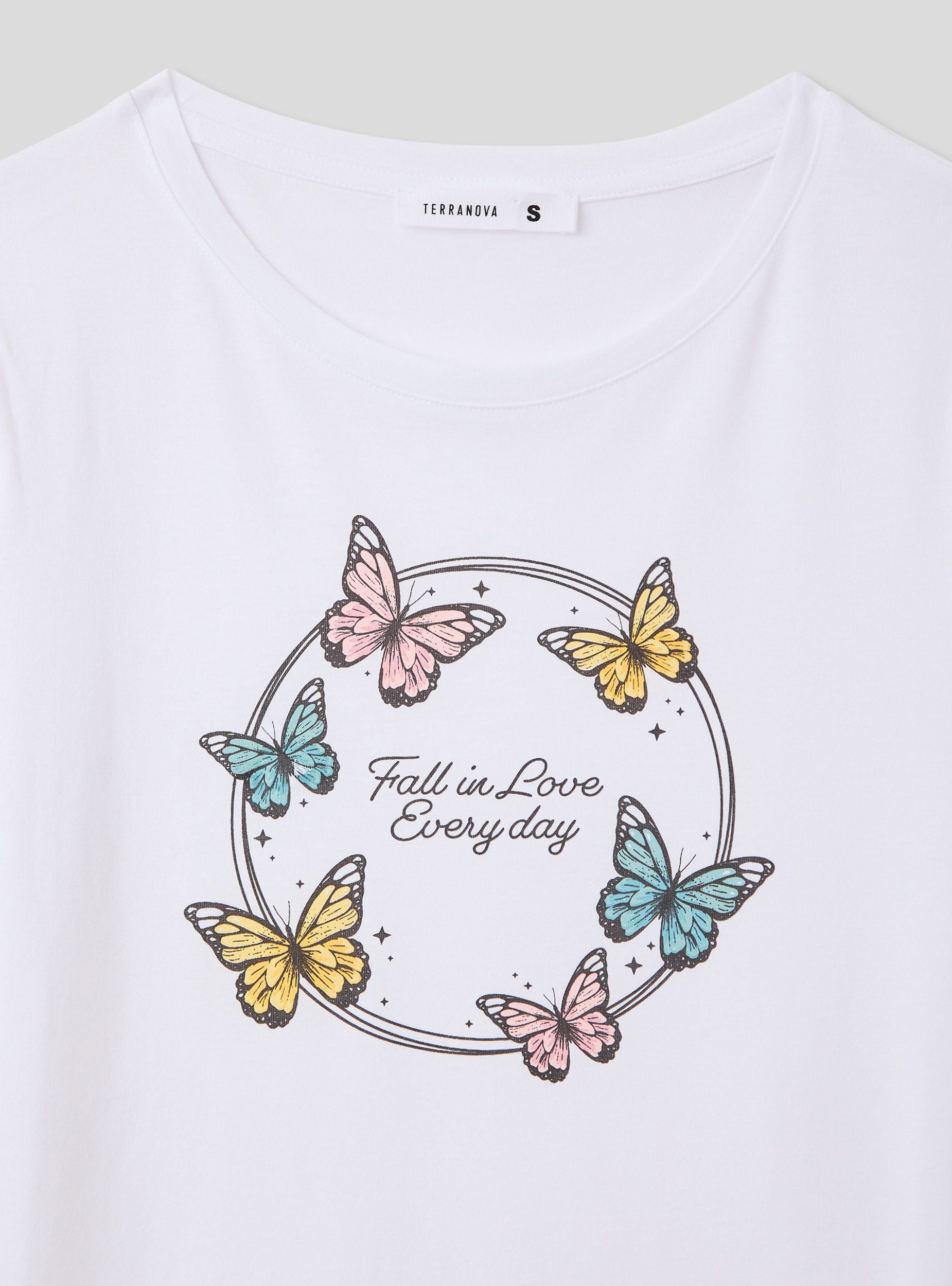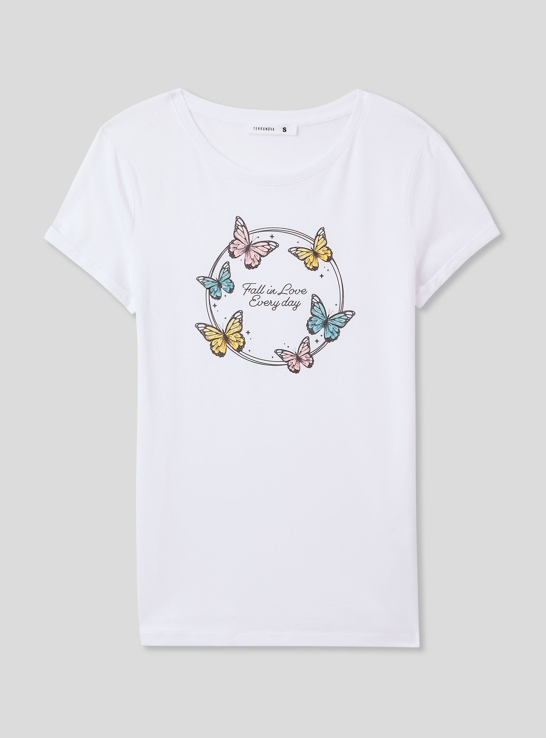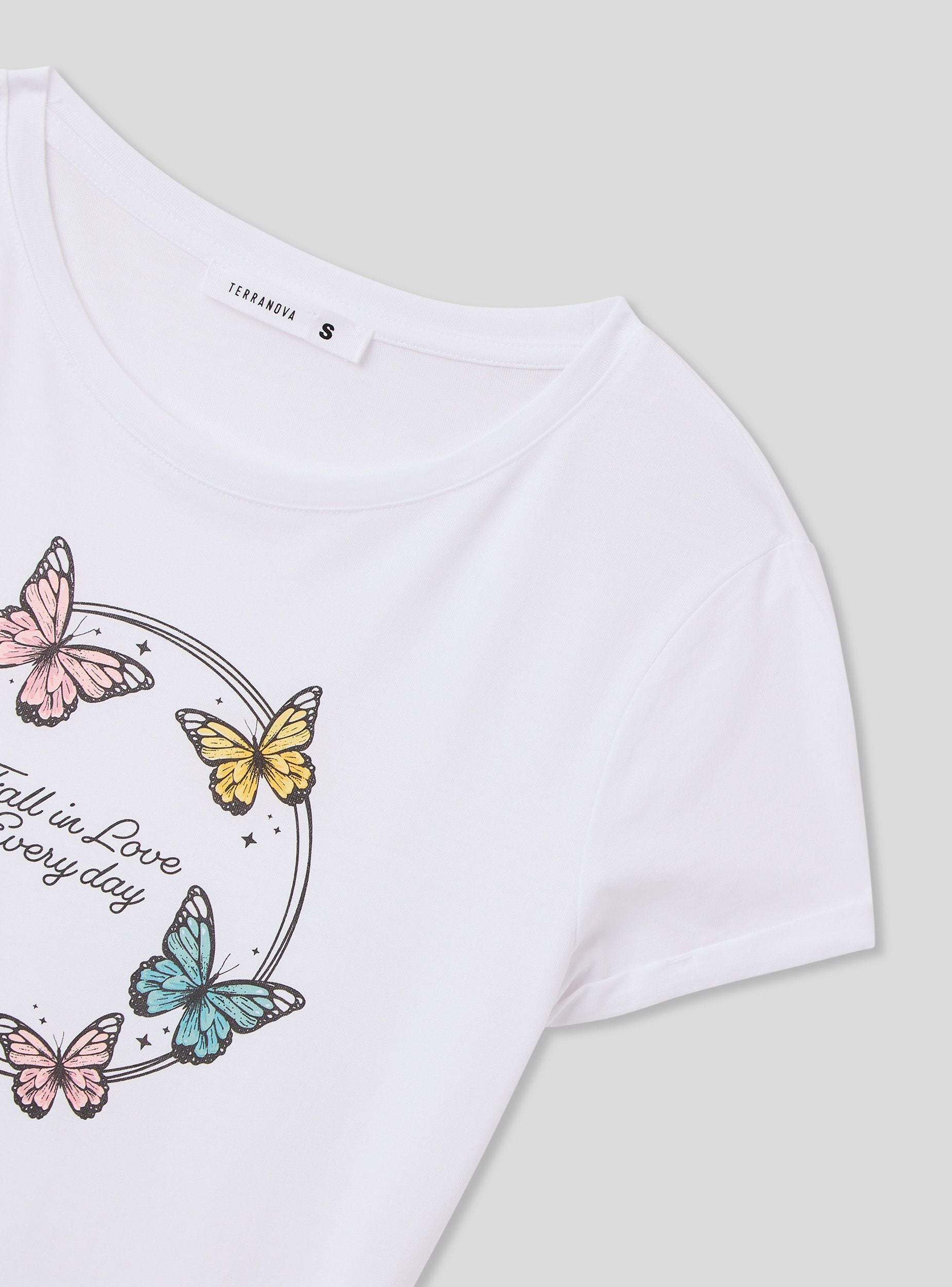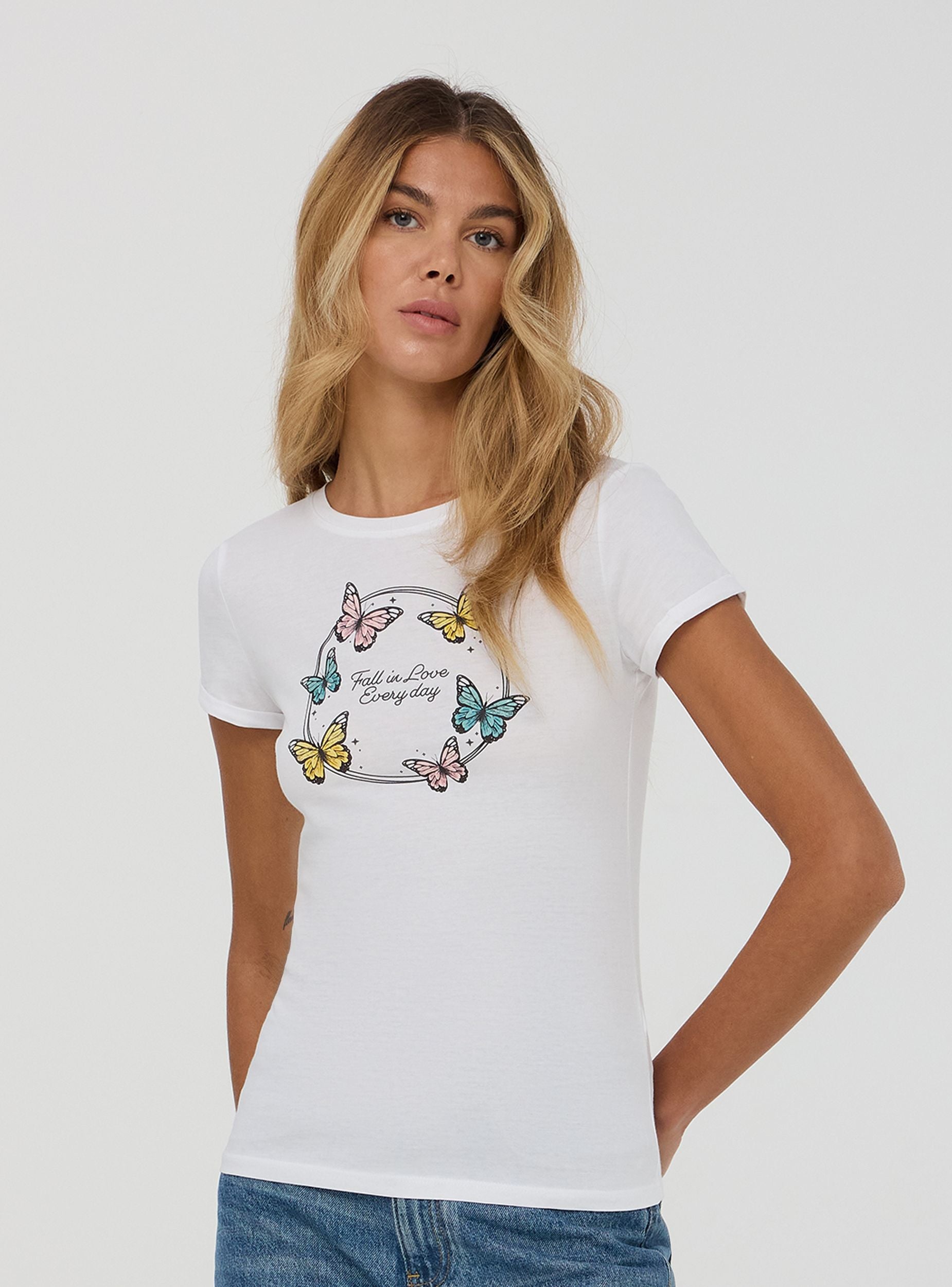 Maglietta da donna slim fit caratterizzata da un girocollo e maniche corte che offrono un look pratico e versatile, ideale per l'uso quotidiano. Dotata di una stampa frontale di un insieme di farfalle che sembrano volare in cerchio, creando un'immagine vivace e dinamica, con una scritta al centro. Ogni farfalla è disegnata con cura, e i colori delicati rendono il motivo accattivante. La composizione grafica evoca un senso di leggerezza e libertà, trasformando il capo in un pezzo perfetto per chi ama esprimere un tocco di femminilità e spensieratezza.Dettagli