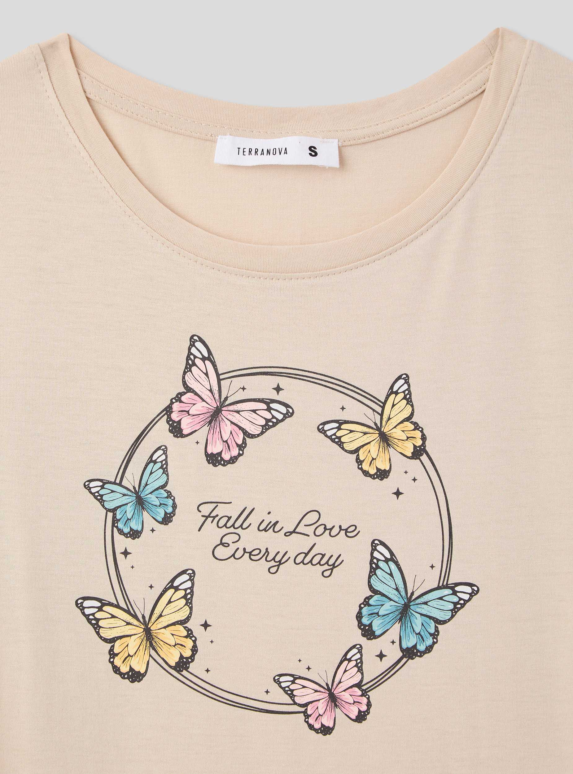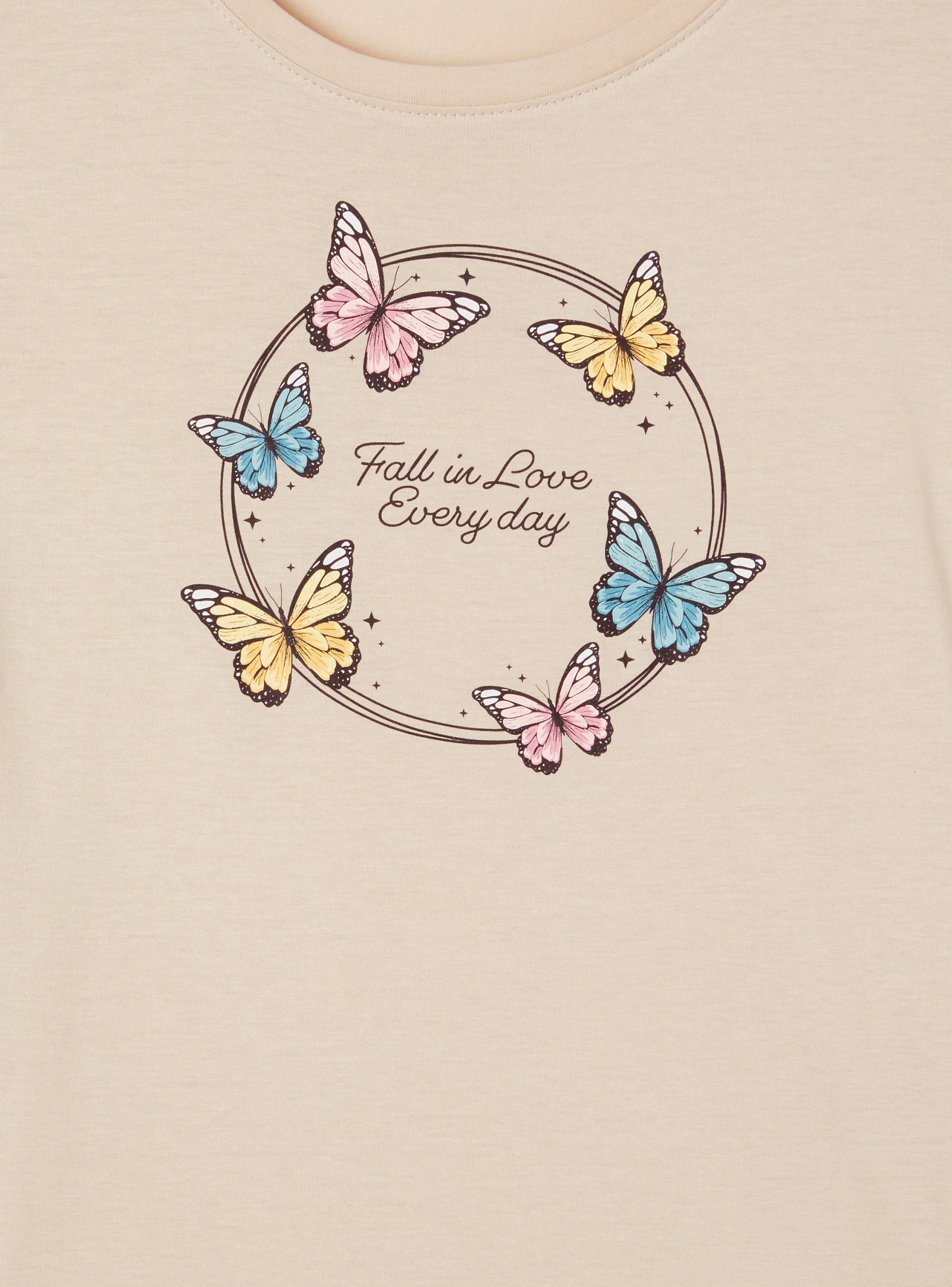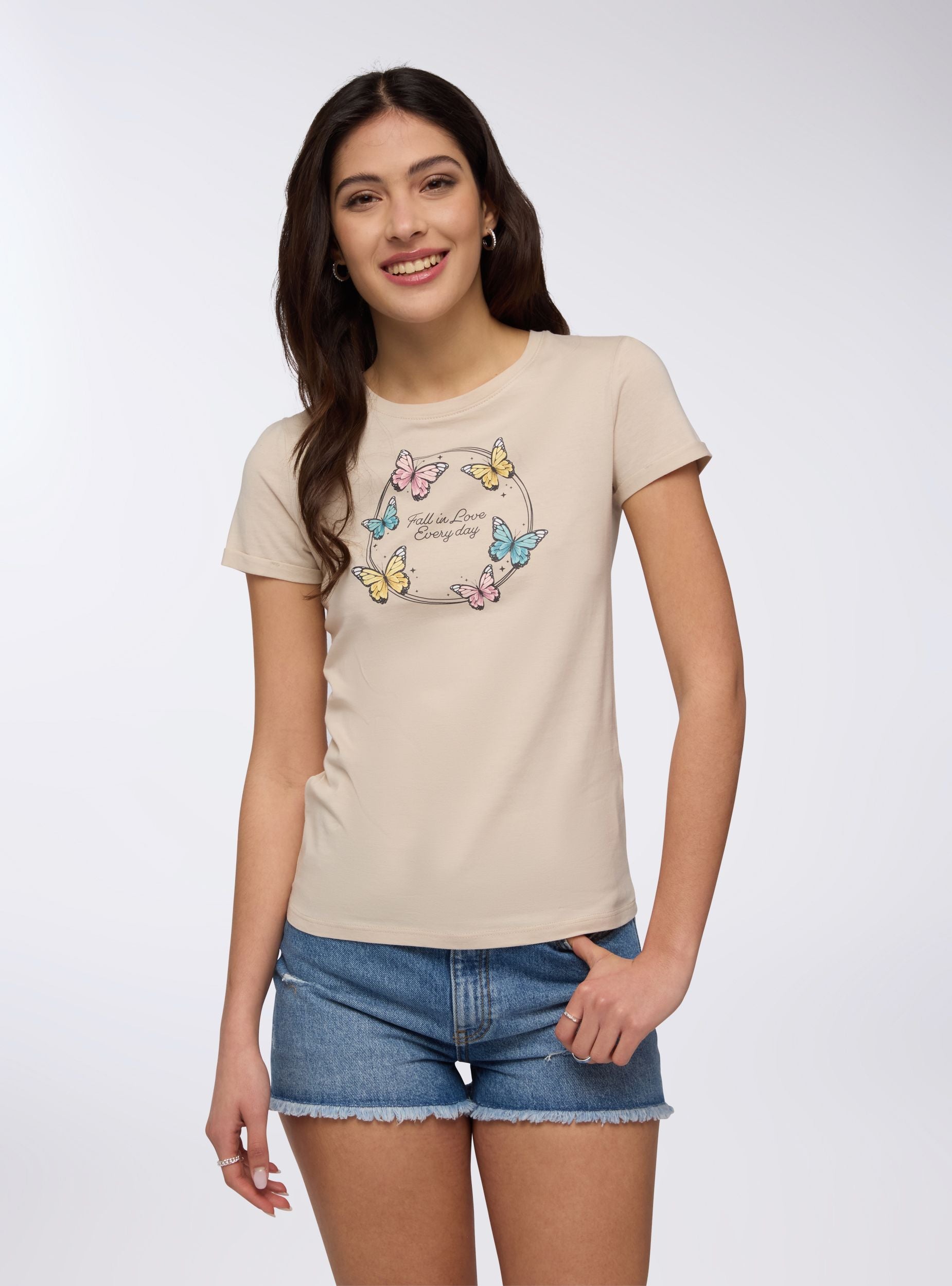 Maglietta da donna slim fit caratterizzata da un girocollo e maniche corte che offrono un look pratico e versatile, ideale per l'uso quotidiano. Dotata di una stampa frontale di un insieme di farfalle che sembrano volare in cerchio, creando un'immagine vivace e dinamica, con una scritta al centro. Ogni farfalla è disegnata con cura, e i colori delicati rendono il motivo accattivante. La composizione grafica evoca un senso di leggerezza e libertà, trasformando il capo in un pezzo perfetto per chi ama esprimere un tocco di femminilità e spensieratezza.Dettagli