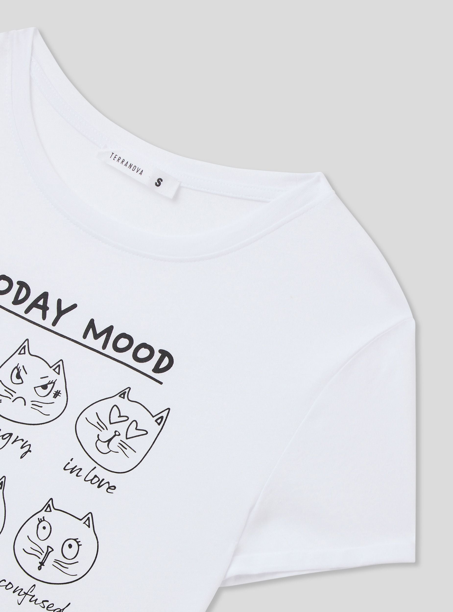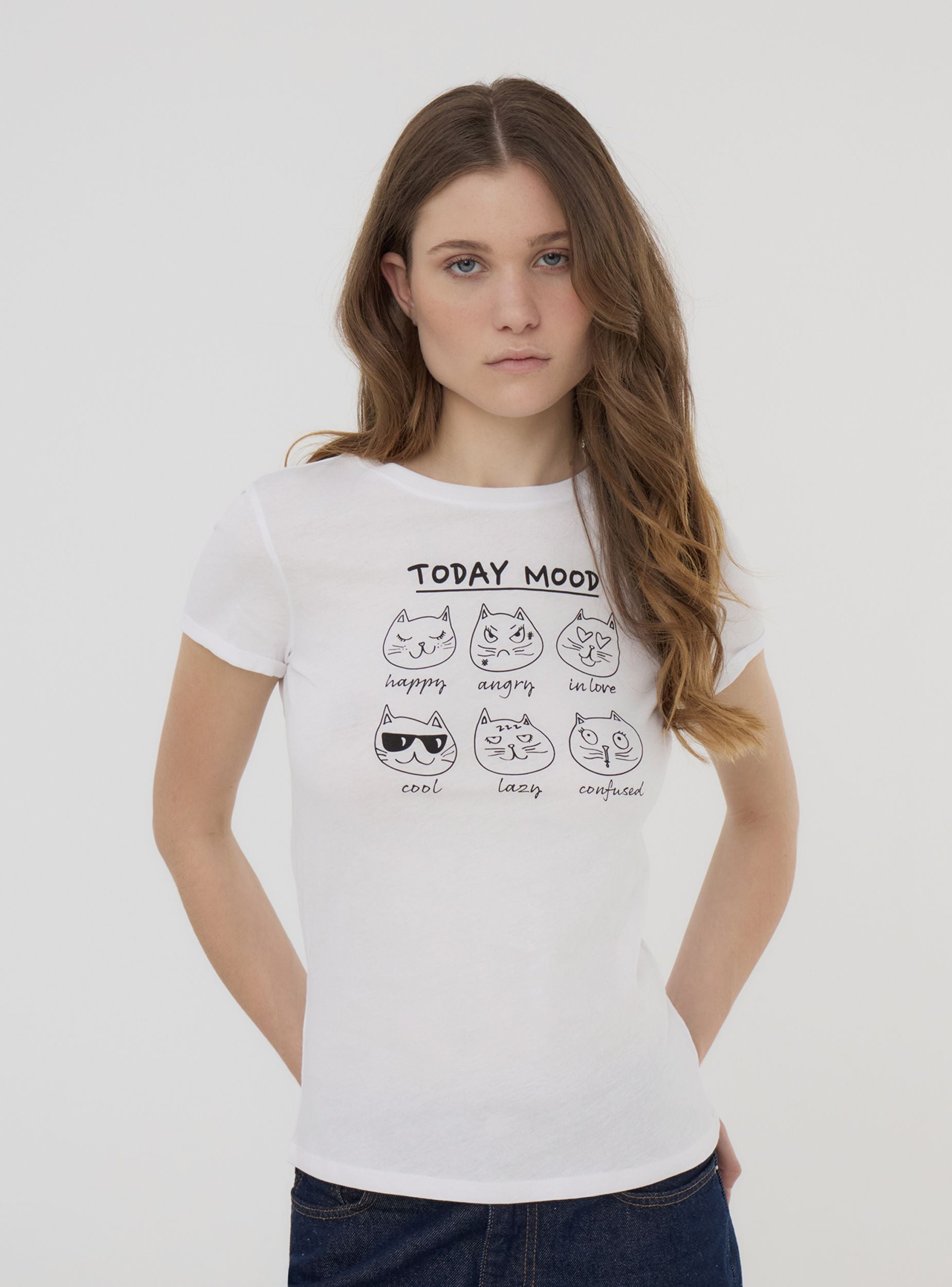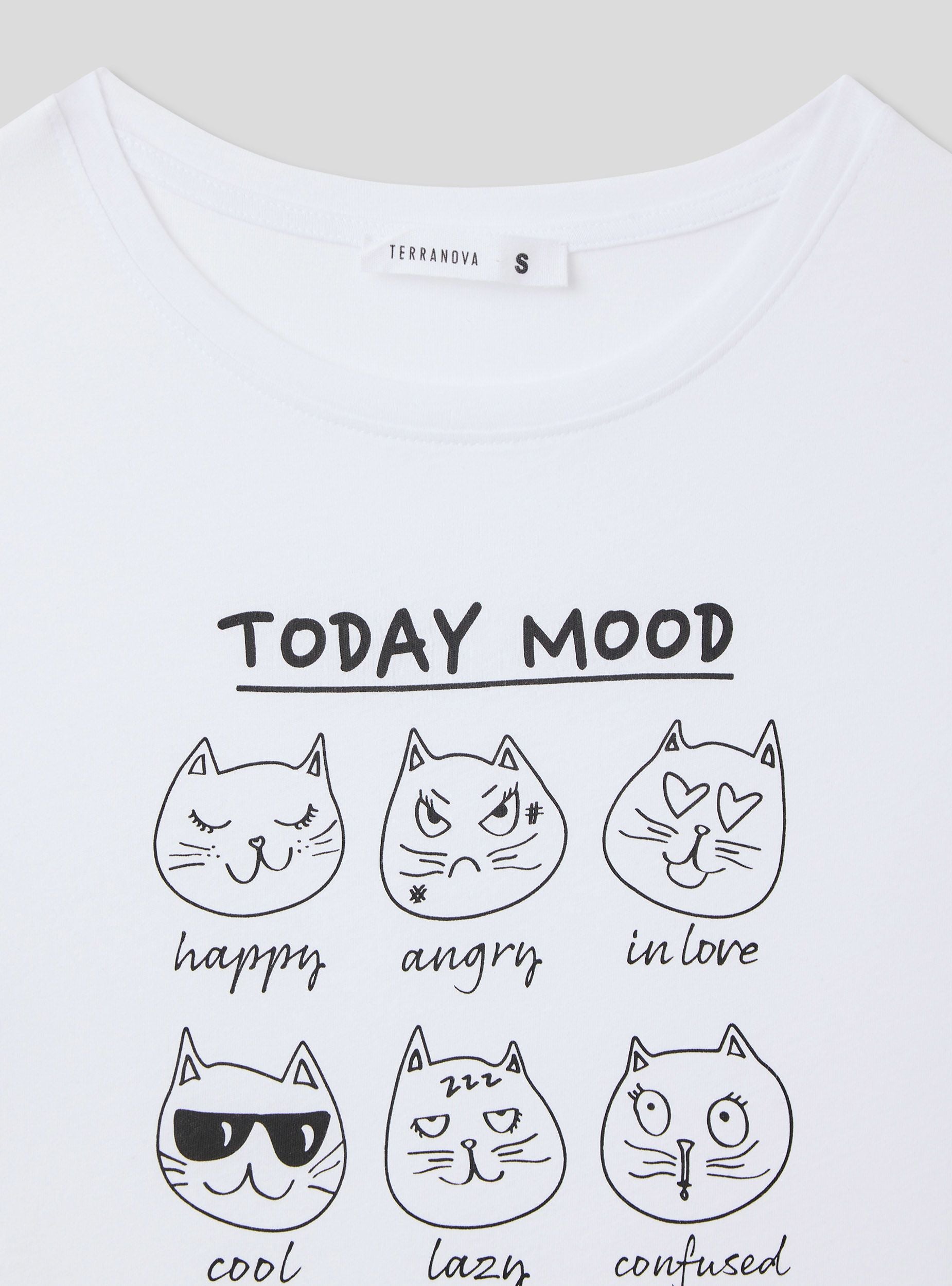 Maglietta da donna con stampa divertente a tema "Today Mood", ideale per aggiungere un tocco ironico e casual al tuo outfit quotidiano. Il design presenta simpatici gattini che esprimono diversi stati d'animo, perfetta per momenti di relax o outfit casual. Completa di maniche corte, girocollo e tinta unita, unisce stile e comfort per ogni occasione.Dettagli