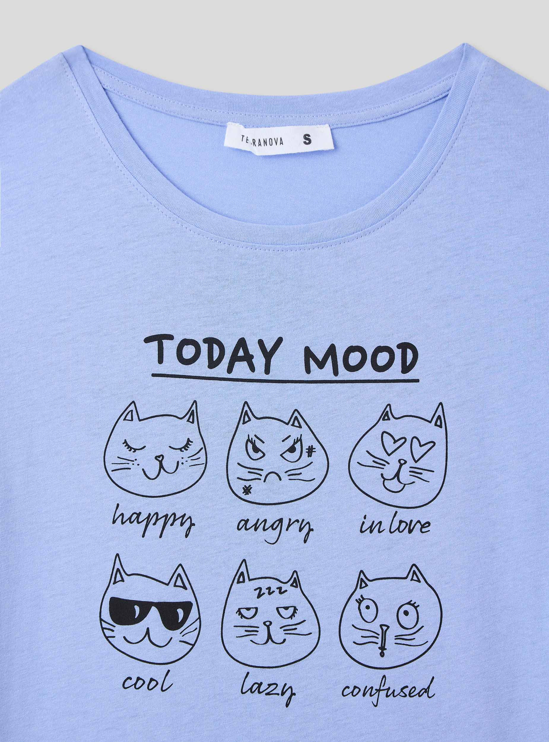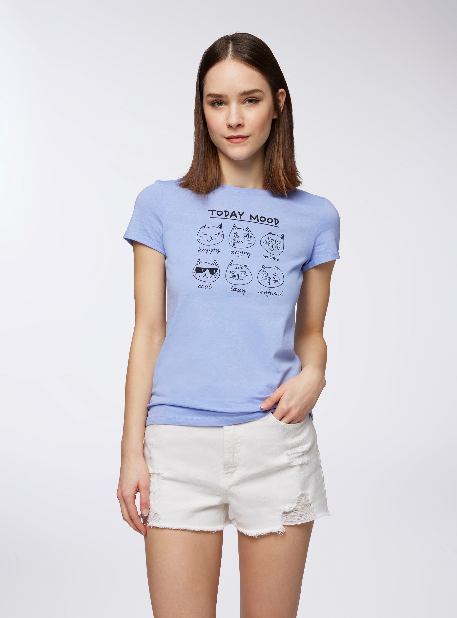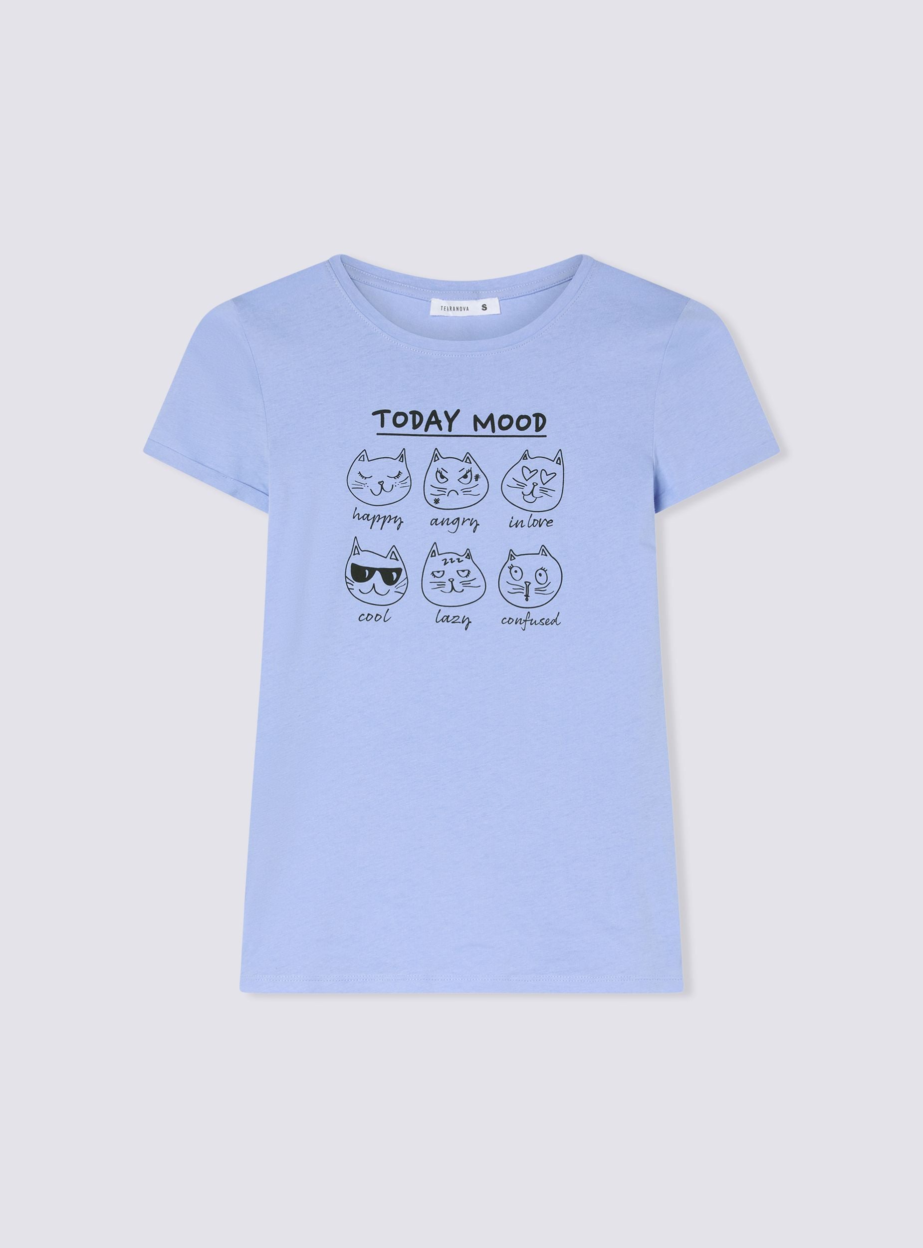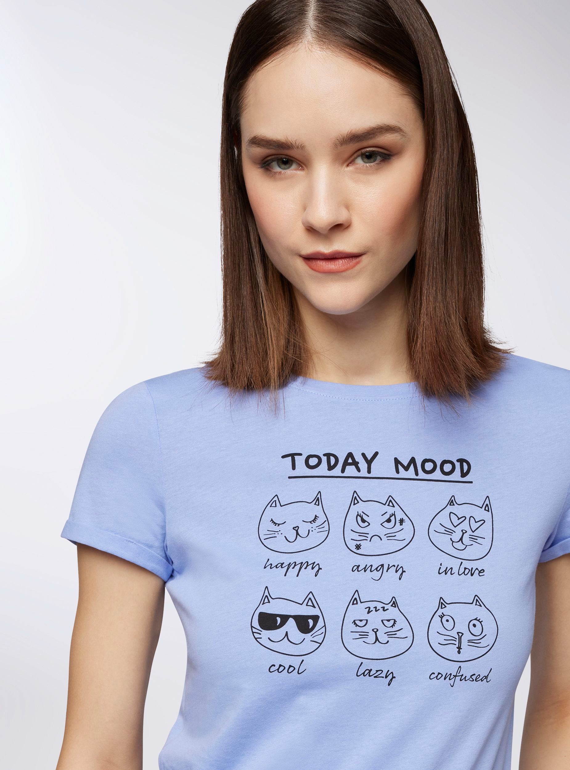 Maglietta da donna con stampa divertente a tema "Today Mood", ideale per aggiungere un tocco ironico e casual al tuo outfit quotidiano. Il design presenta simpatici gattini che esprimono diversi stati d'animo, perfetta per momenti di relax o outfit casual. Completa di maniche corte, girocollo e tinta unita, unisce stile e comfort per ogni occasione.Dettagli