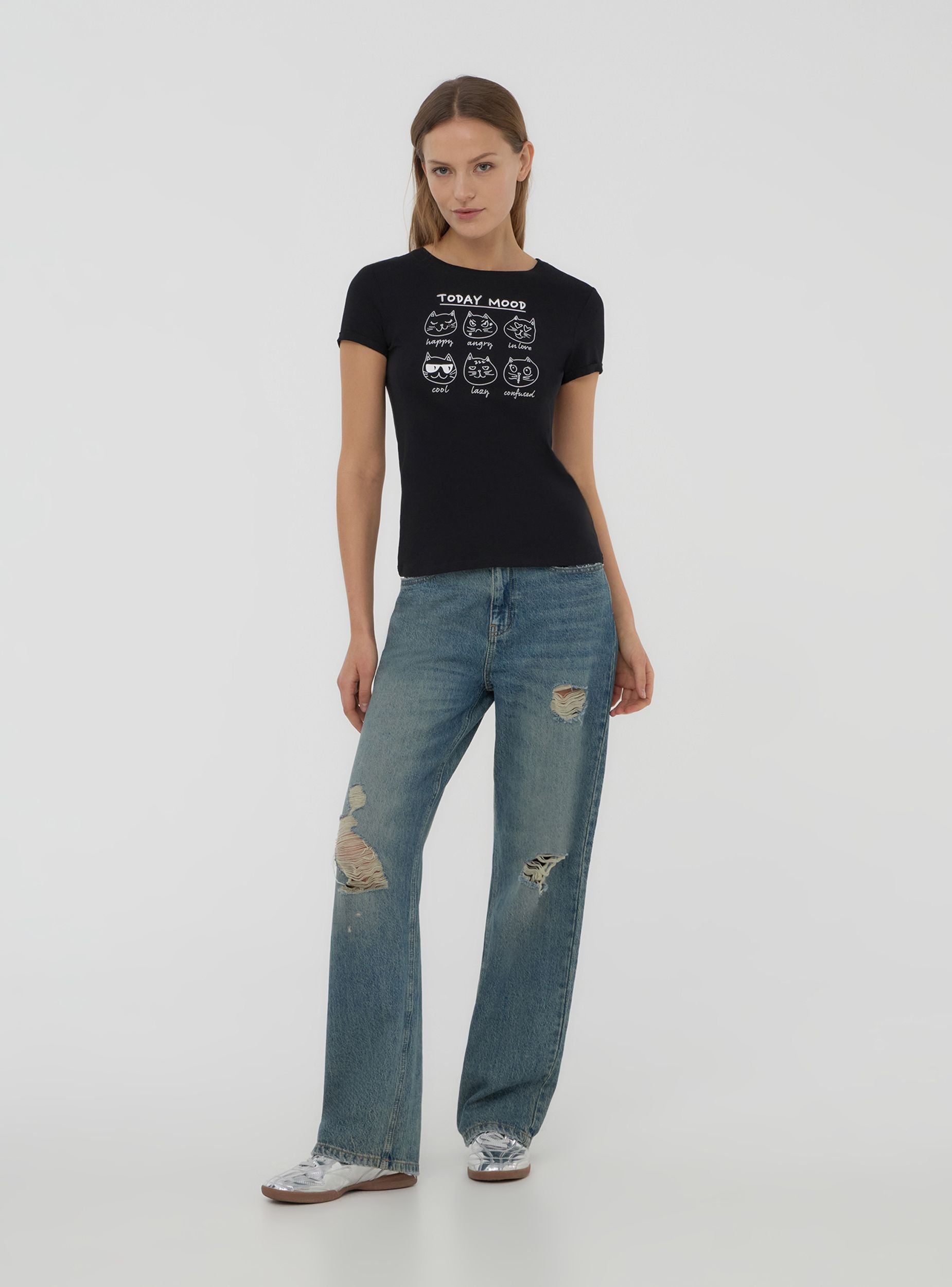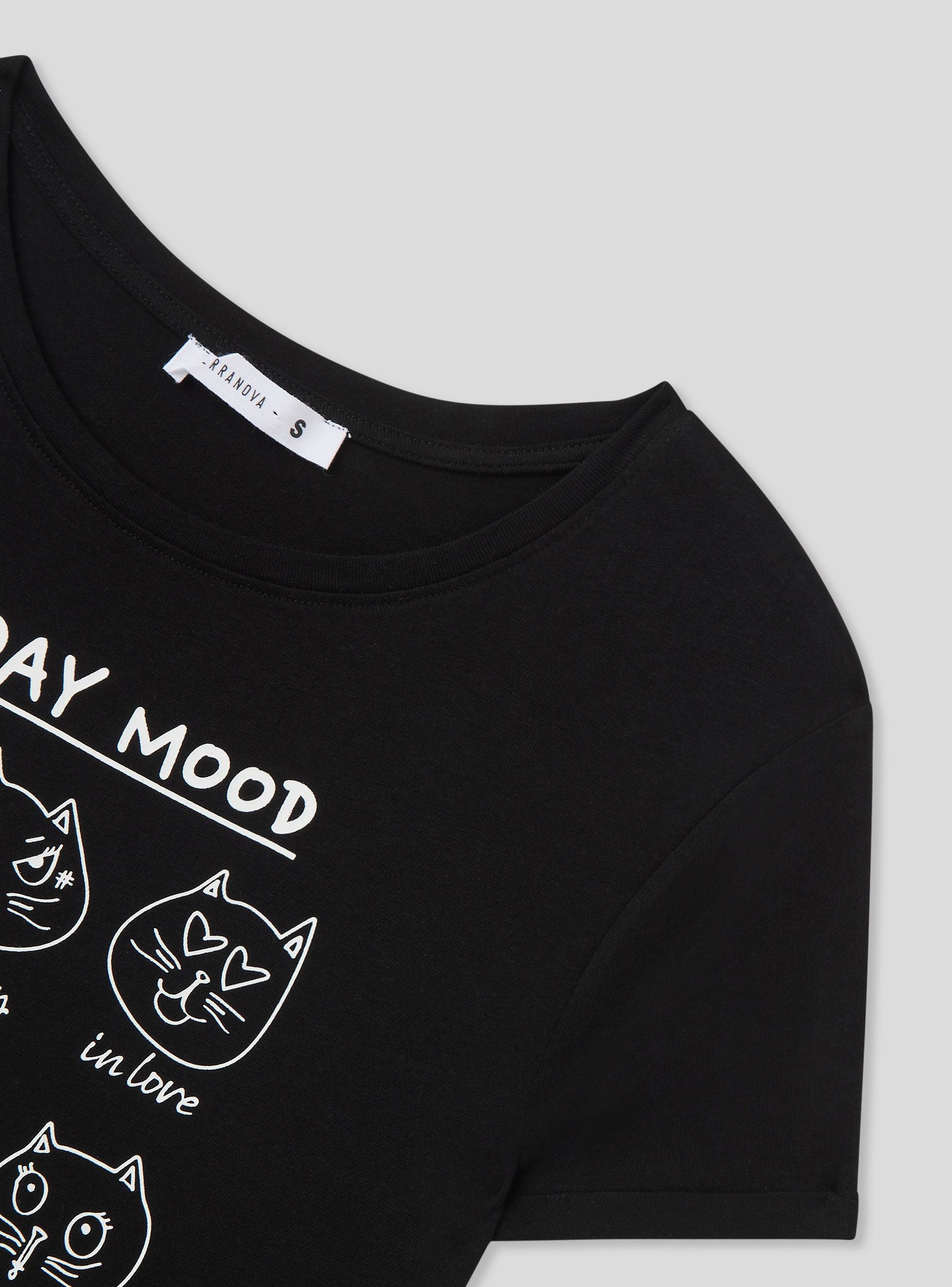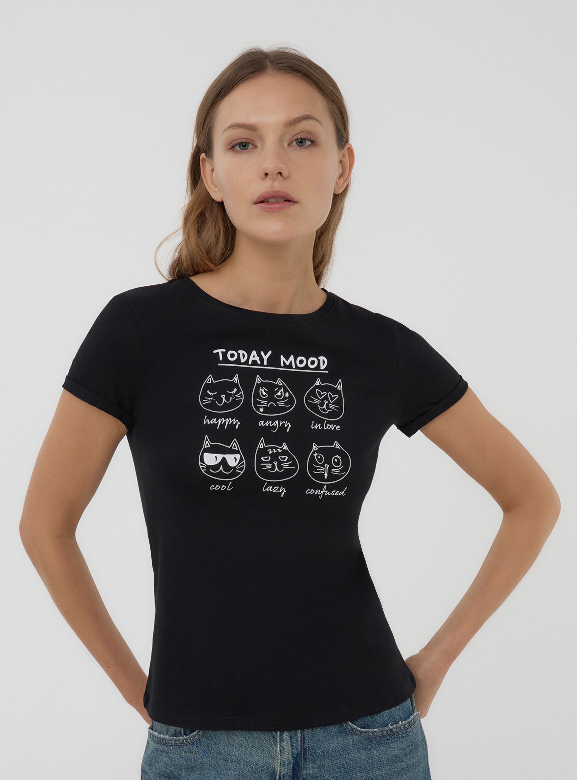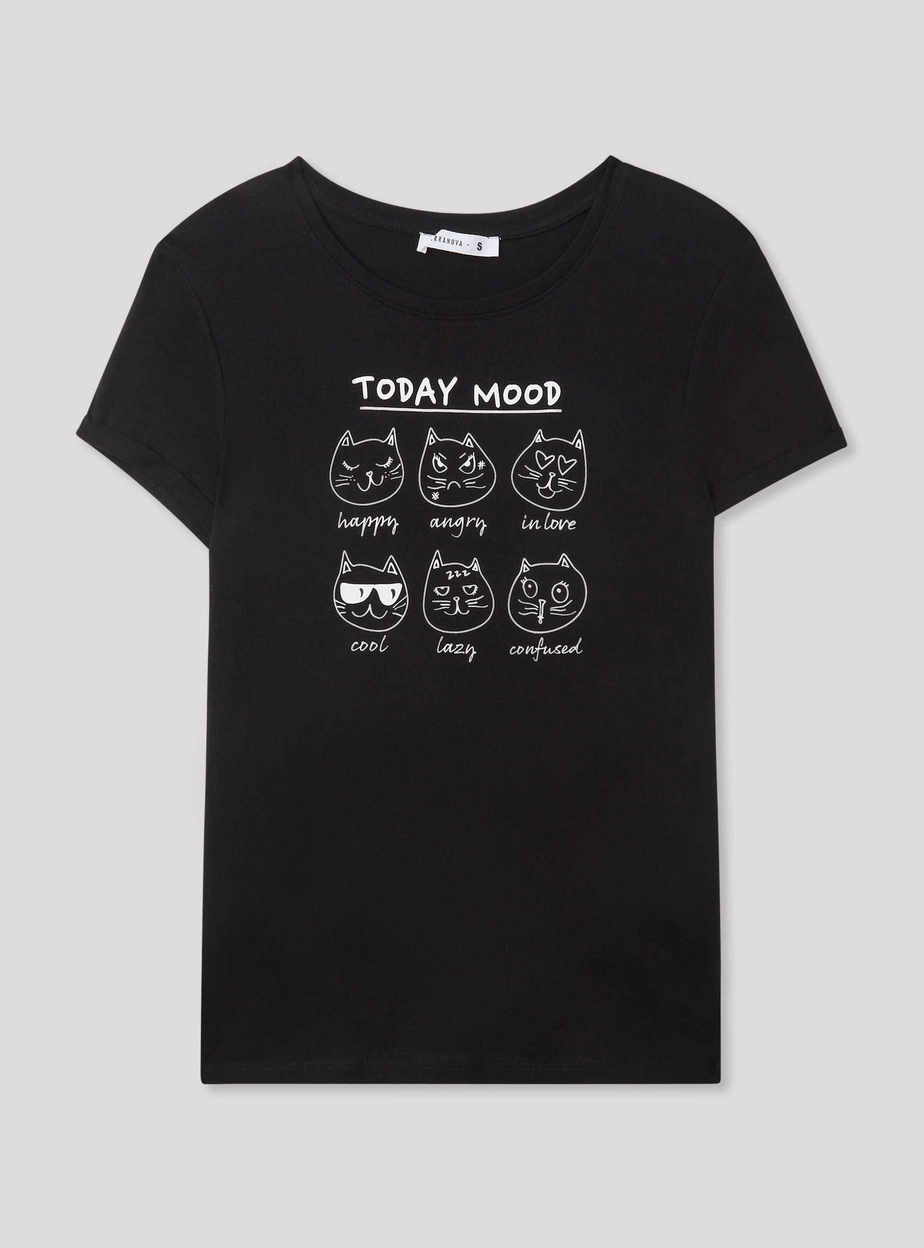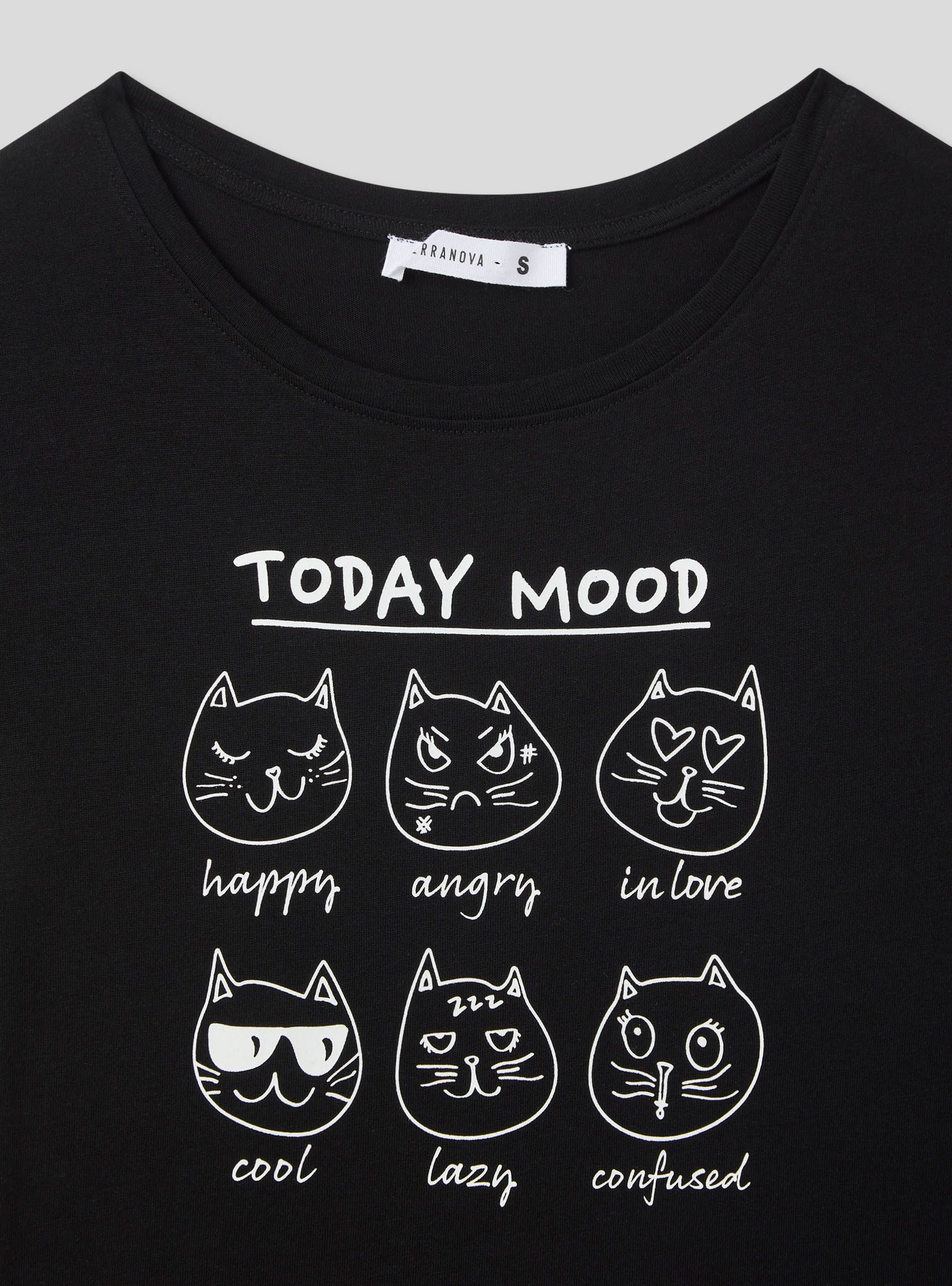 Maglietta da donna con stampa divertente a tema "Today Mood", ideale per aggiungere un tocco ironico e casual al tuo outfit quotidiano. Il design presenta simpatici gattini che esprimono diversi stati d'animo, perfetta per momenti di relax o outfit casual. Completa di maniche corte, girocollo e tinta unita, unisce stile e comfort per ogni occasione.Dettagli