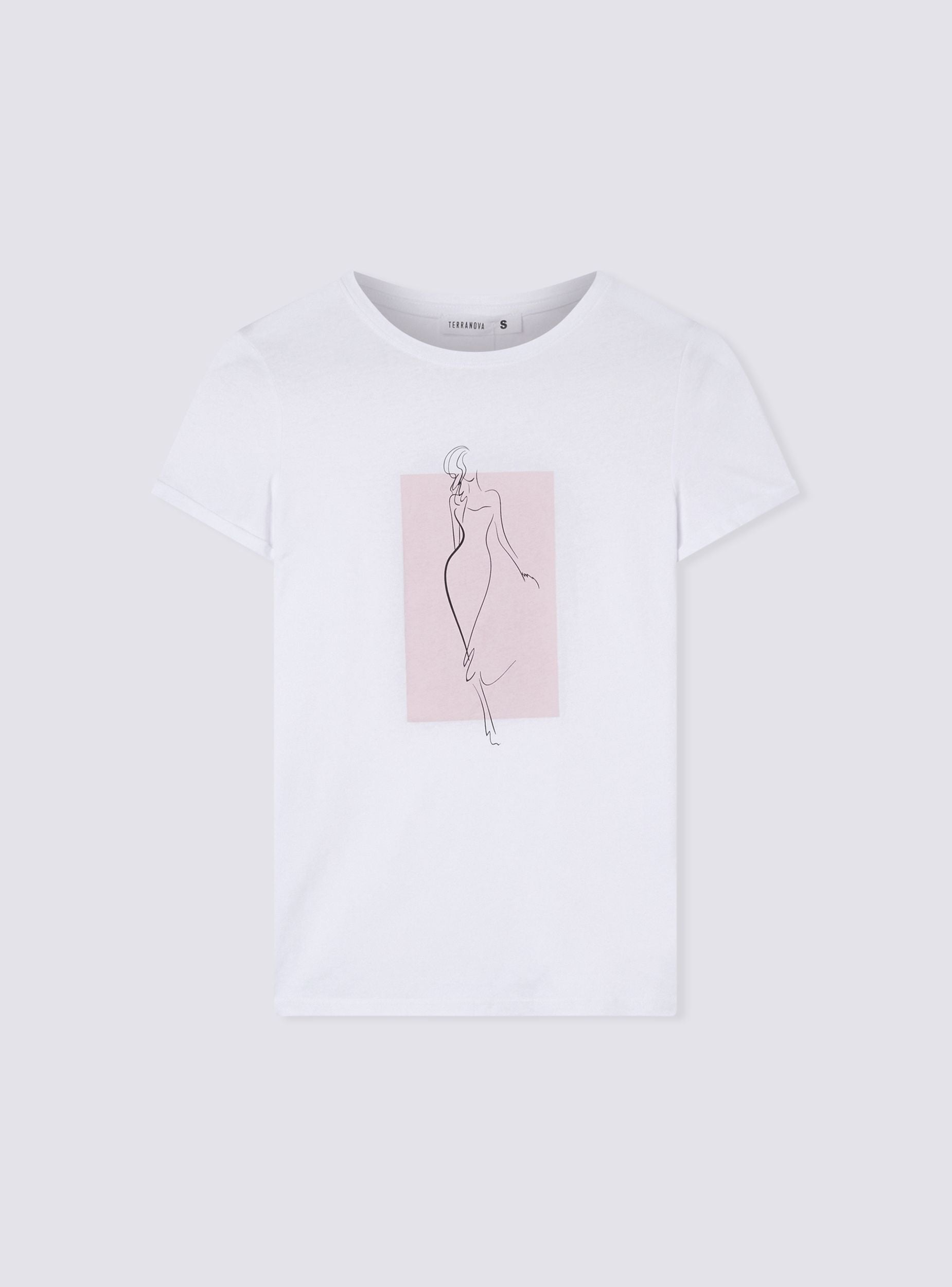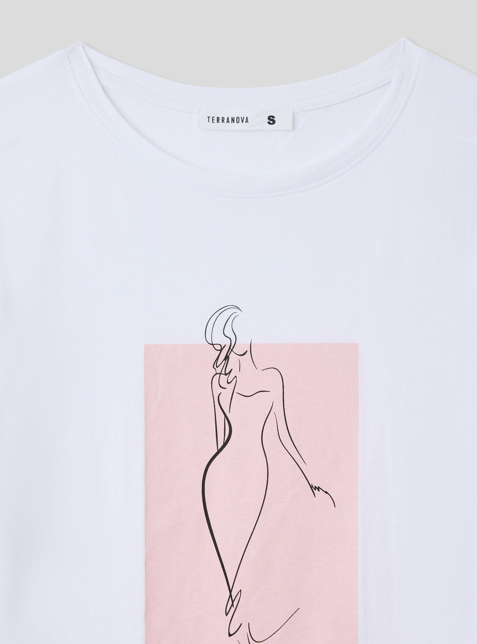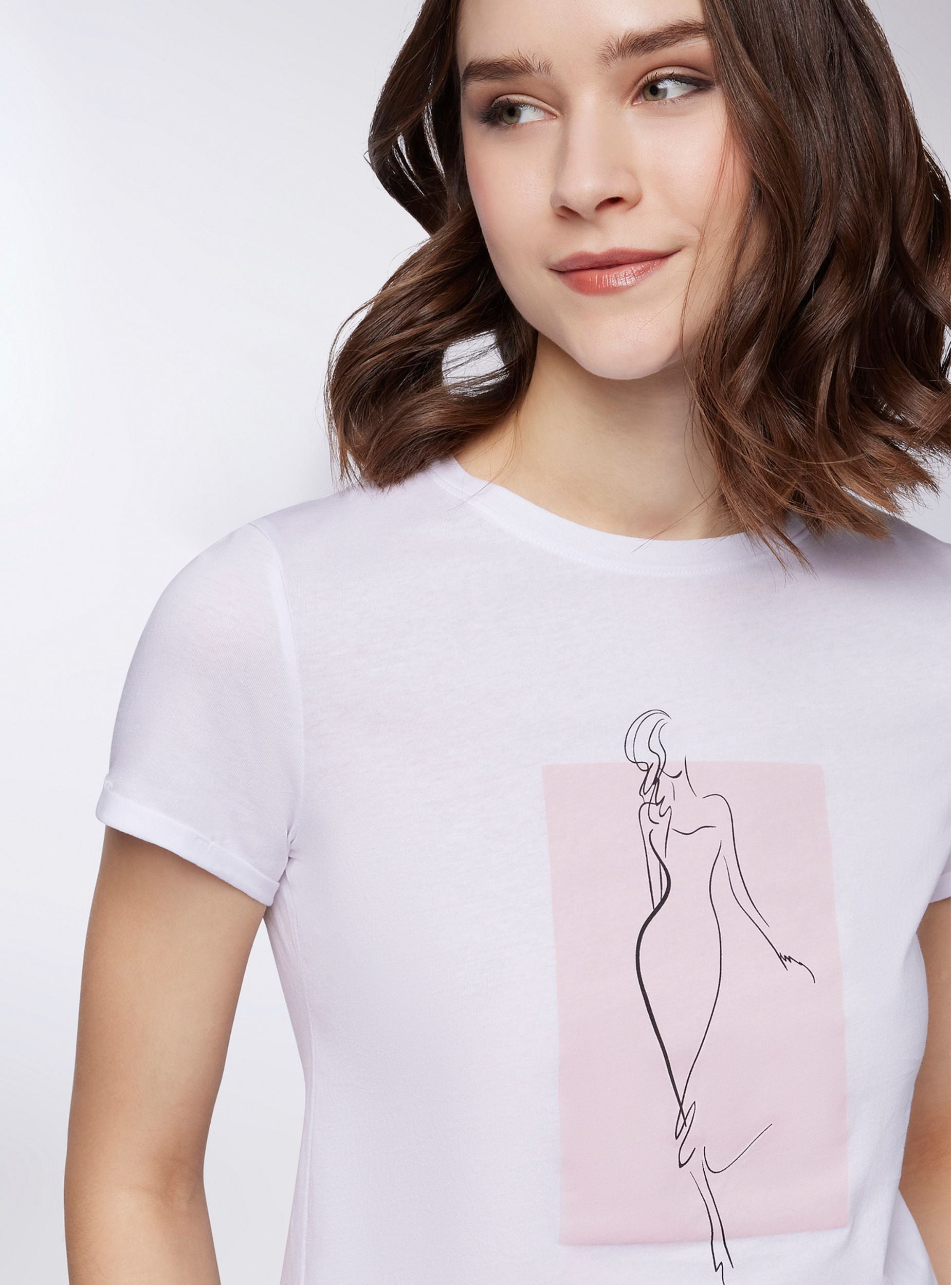 Maglietta da donna con vestibilità slim fit, caratterizzata da una stampa di donna stilizzata al centro del capo che conferisce un tocco raffinato e artistico. Il design presenta un girocollo che si adatta perfettamente alla silhouette femminile, e maniche corte con risvolto che donano un aspetto casual e curato. Questa maglietta è perfetta per creare outfit versatili, da abbinare sia con pantaloni che con gonne, per uno stile che unisce comfort e femminilità.Dettagli