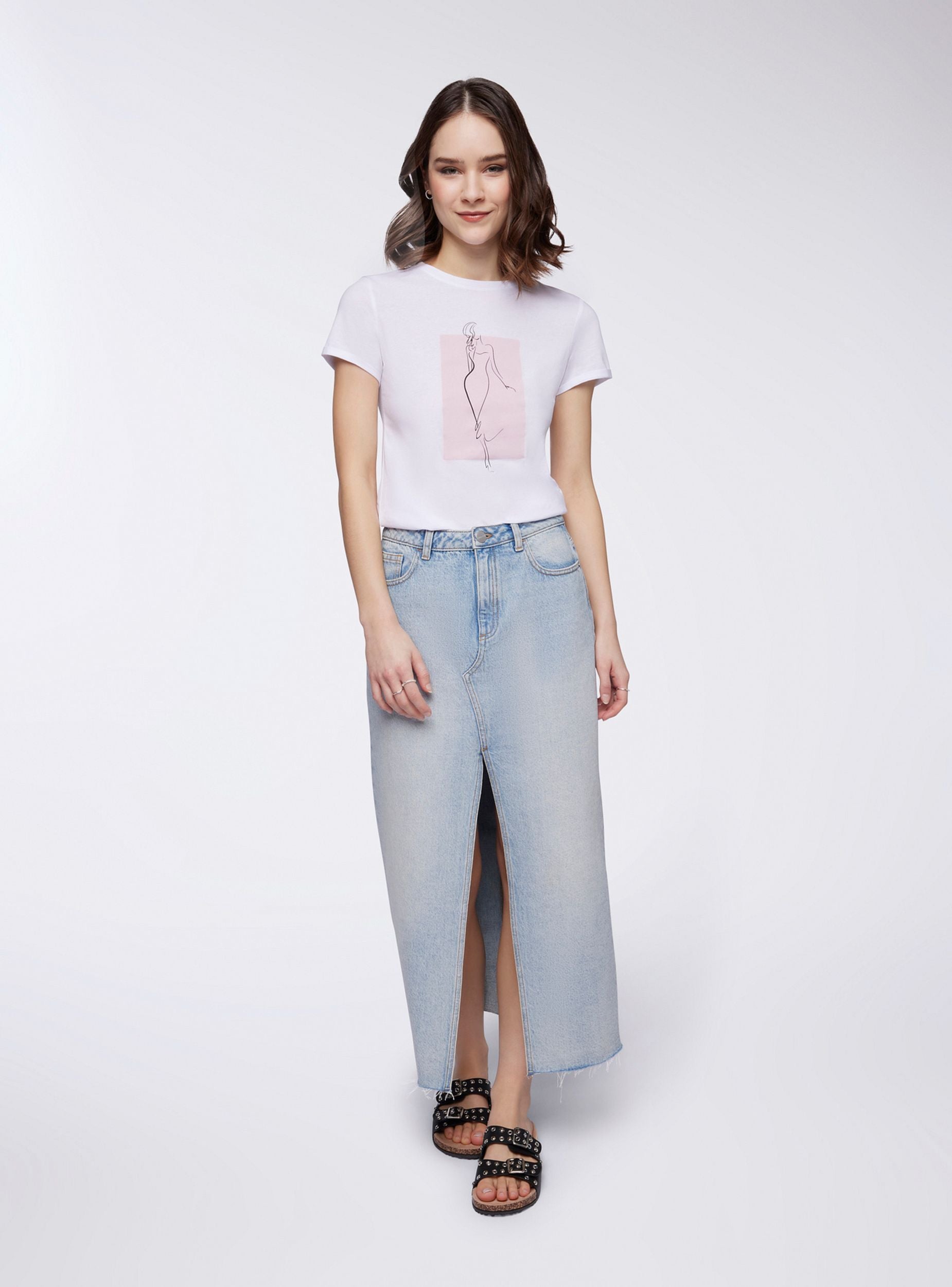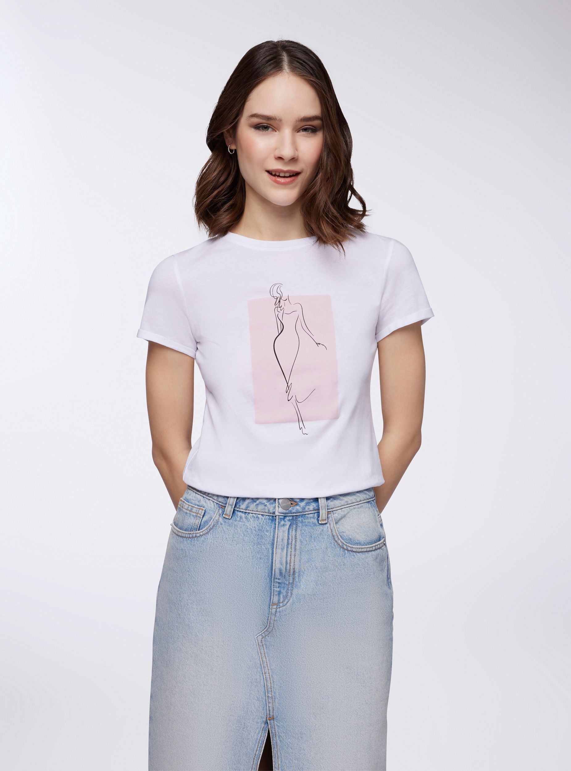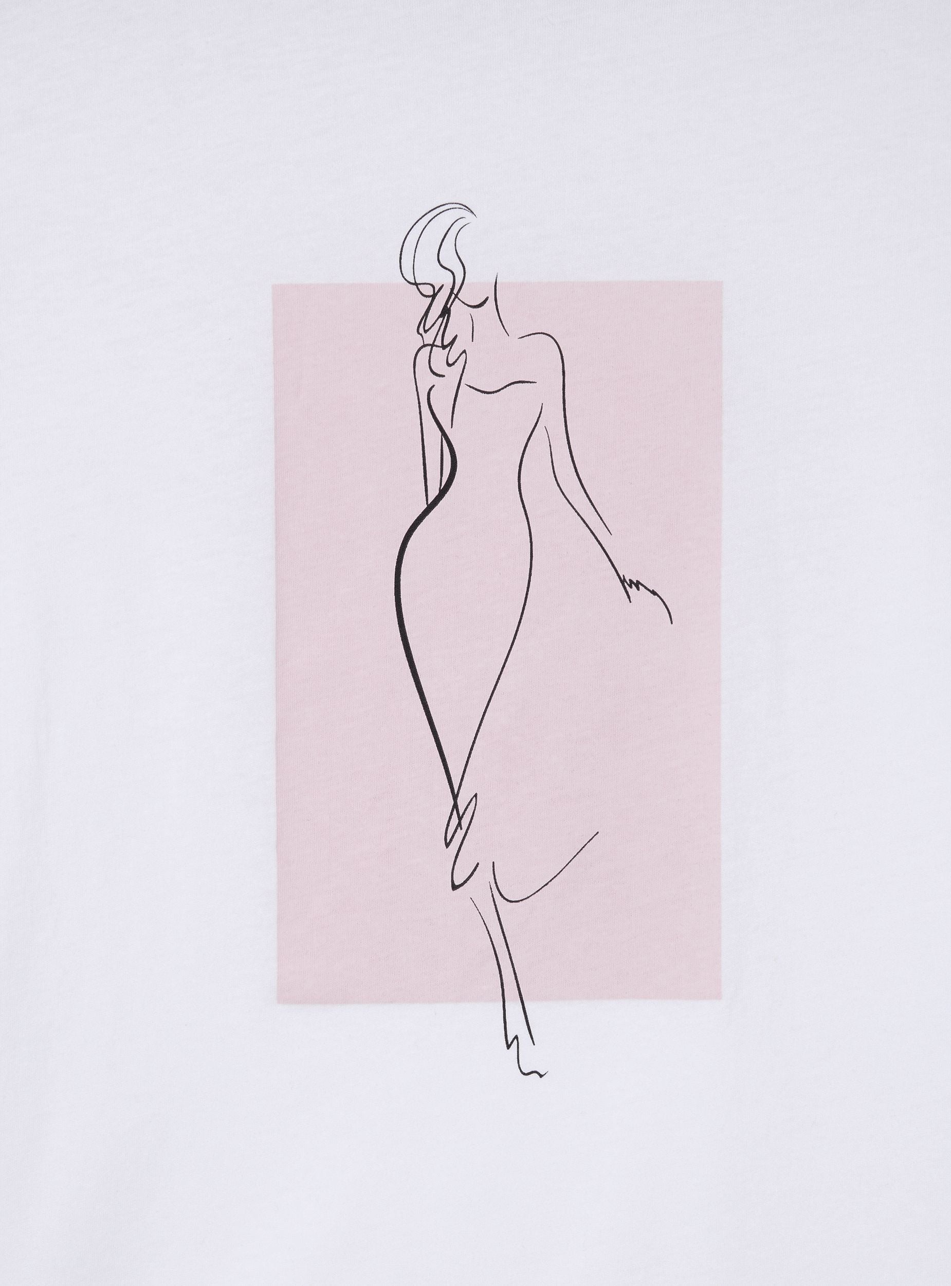 Maglietta da donna con vestibilità slim fit, caratterizzata da una stampa di donna stilizzata al centro del capo che conferisce un tocco raffinato e artistico. Il design presenta un girocollo che si adatta perfettamente alla silhouette femminile, e maniche corte con risvolto che donano un aspetto casual e curato. Questa maglietta è perfetta per creare outfit versatili, da abbinare sia con pantaloni che con gonne, per uno stile che unisce comfort e femminilità.Dettagli