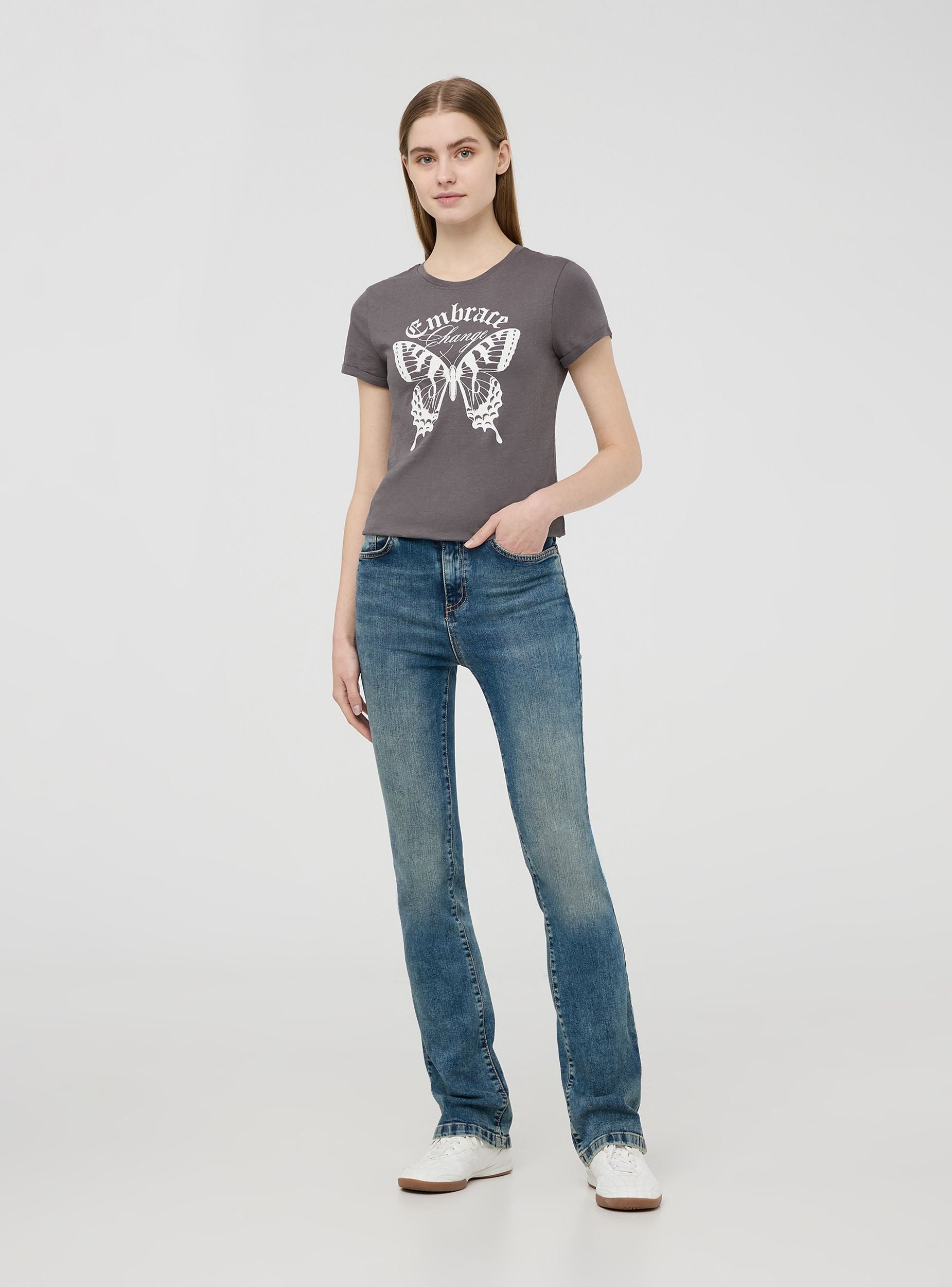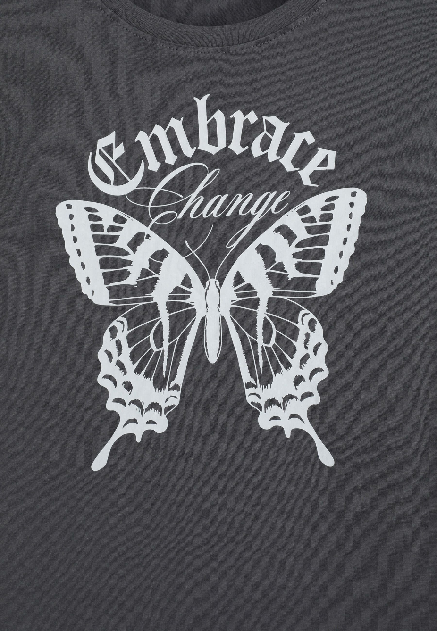 Maglietta da donna con vestibilità slim fit, decorata da una stampa frontale raffigurante una farfalla con la scritta "Embrace Change", che dona un tocco distintivo al capo. Il girocollo e le maniche corte con risvolto completano il design, rendendola perfetta per un look casual ma curato. Ideale da abbinare a pantaloni o gonne per un outfit disinvolto, ma con un messaggio di cambiamento e trasformazione.Dettagli