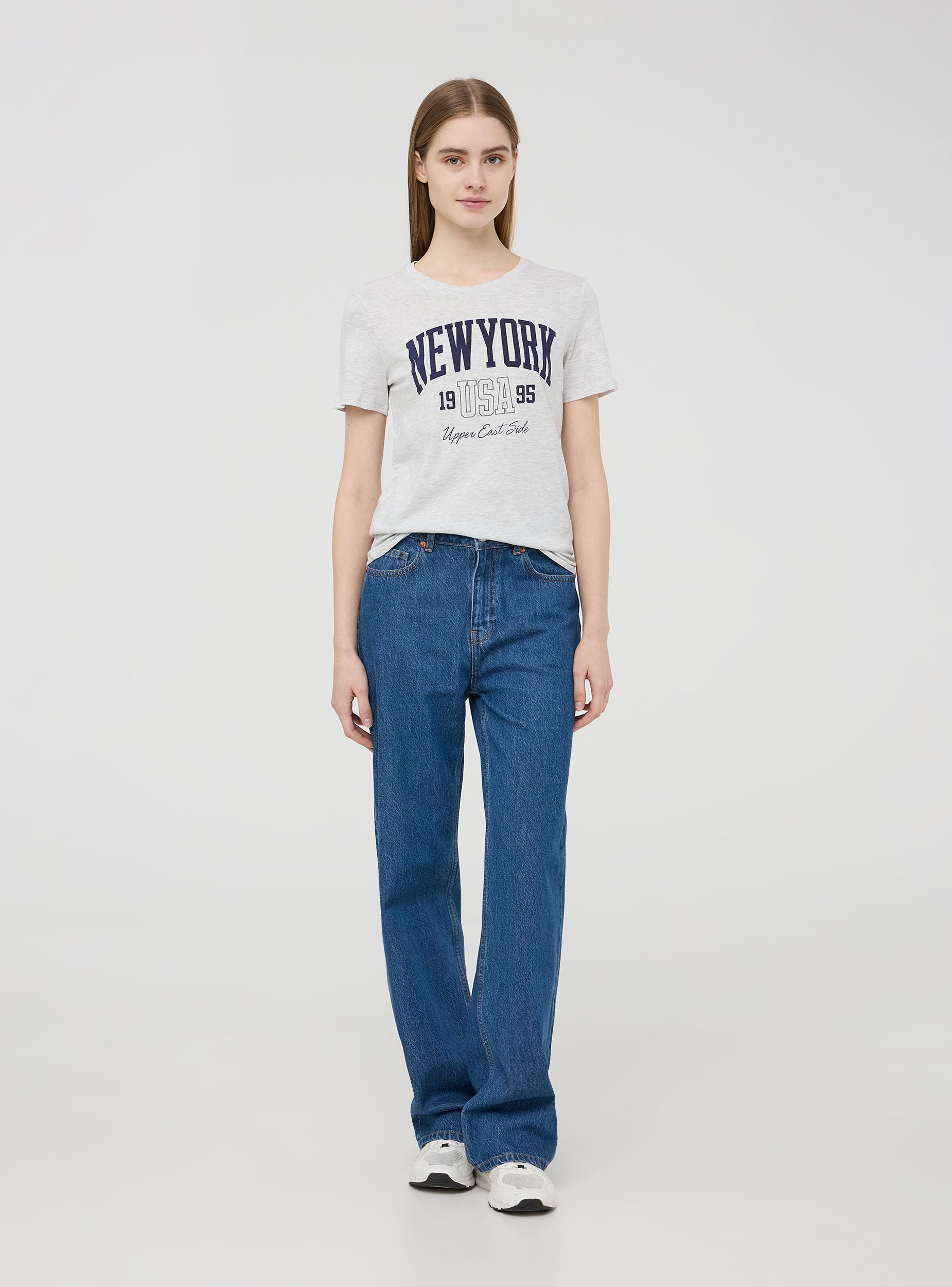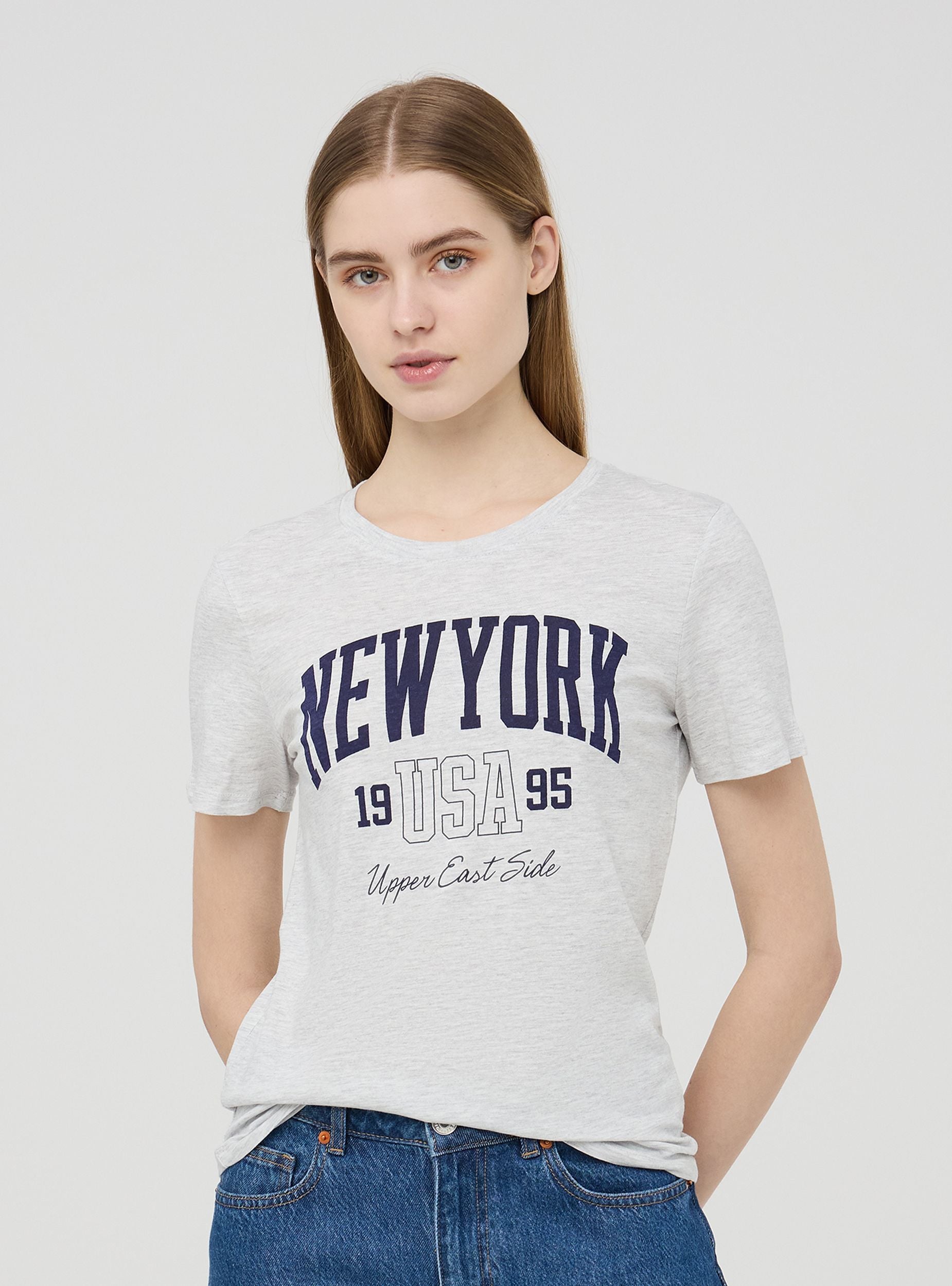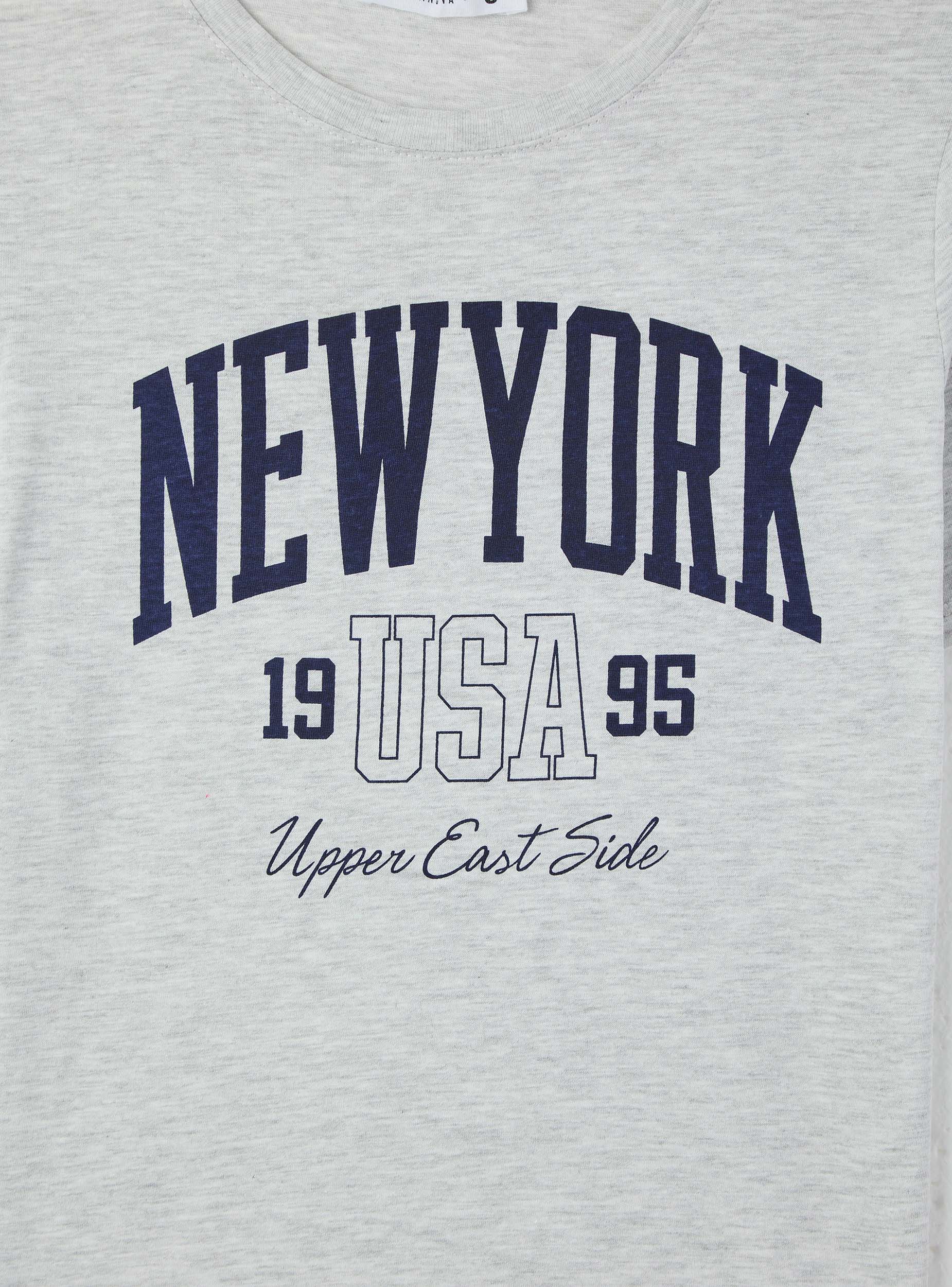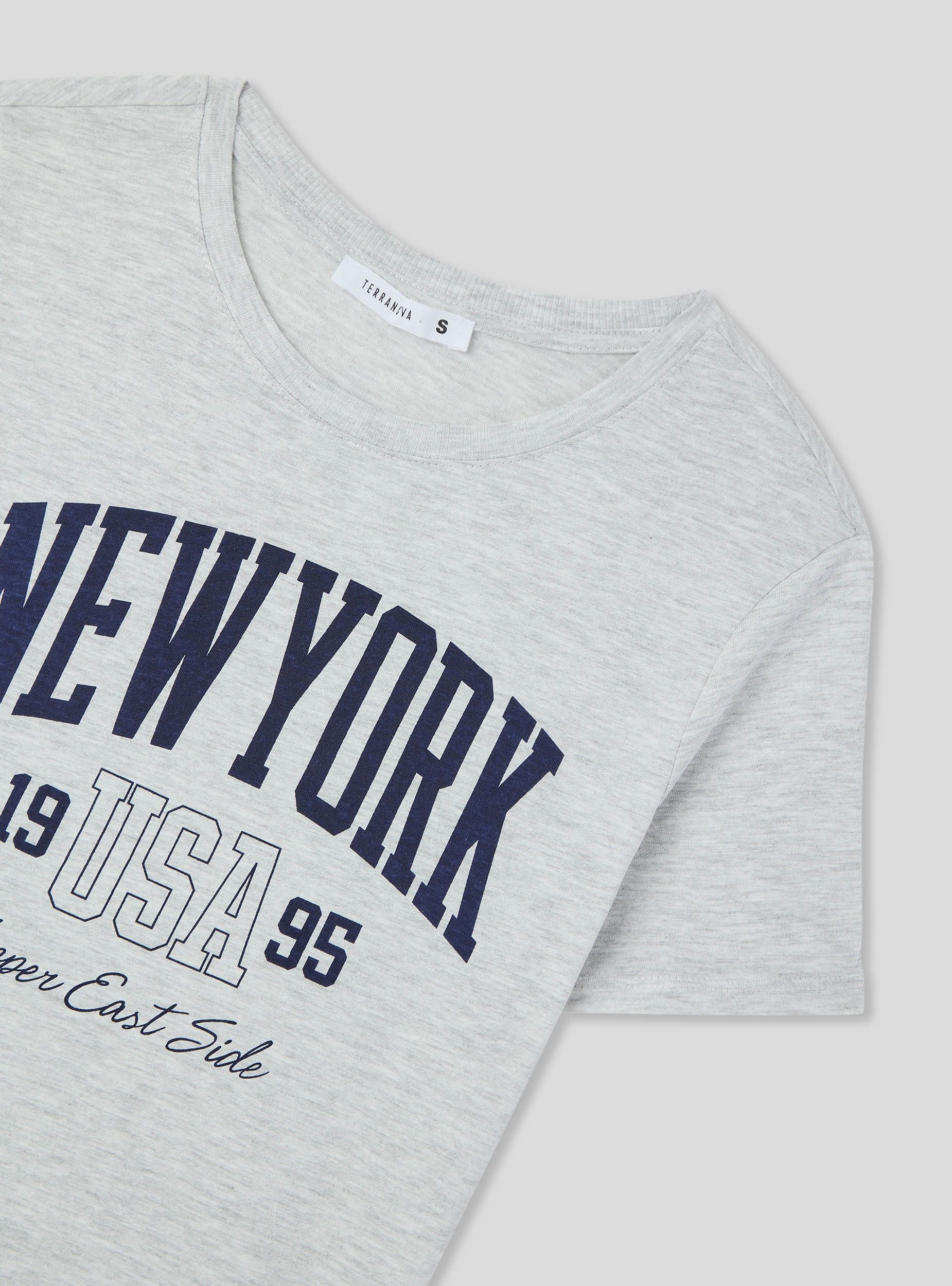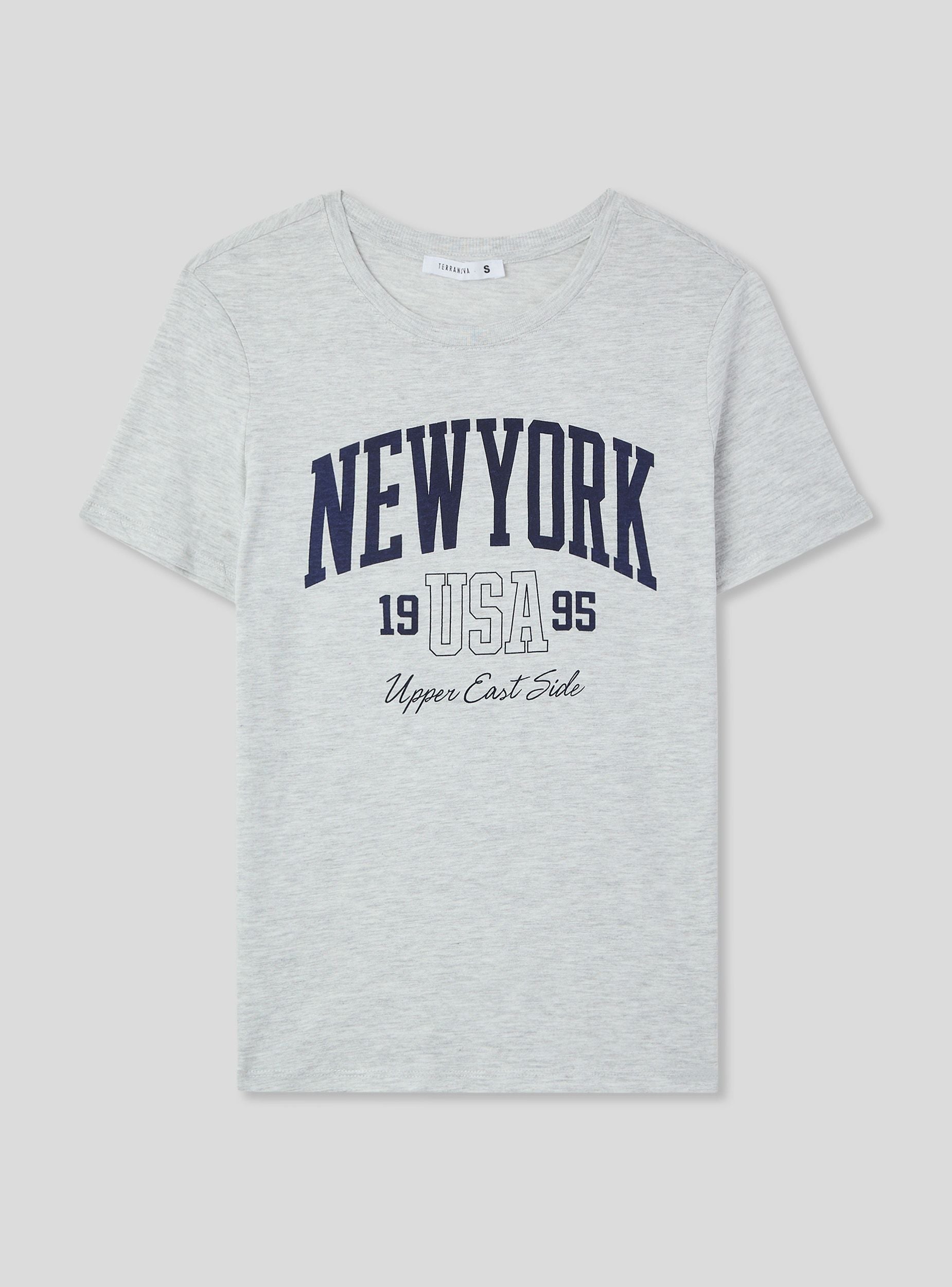 Maglietta da donna con design casual e sportivo, caratterizzata da un girocollo e maniche corte che offrono comodità e freschezza. Il capo presenta una stampa college con la scritta "New York" e altri dettagli grafici ispirati allo stile universitario, rendendola perfetta per un look urban e giovanile. Ideale per il tempo libero, è un capo versatile che può essere abbinato facilmente a diversi outfit per un look dinamico e moderno.Dettagli