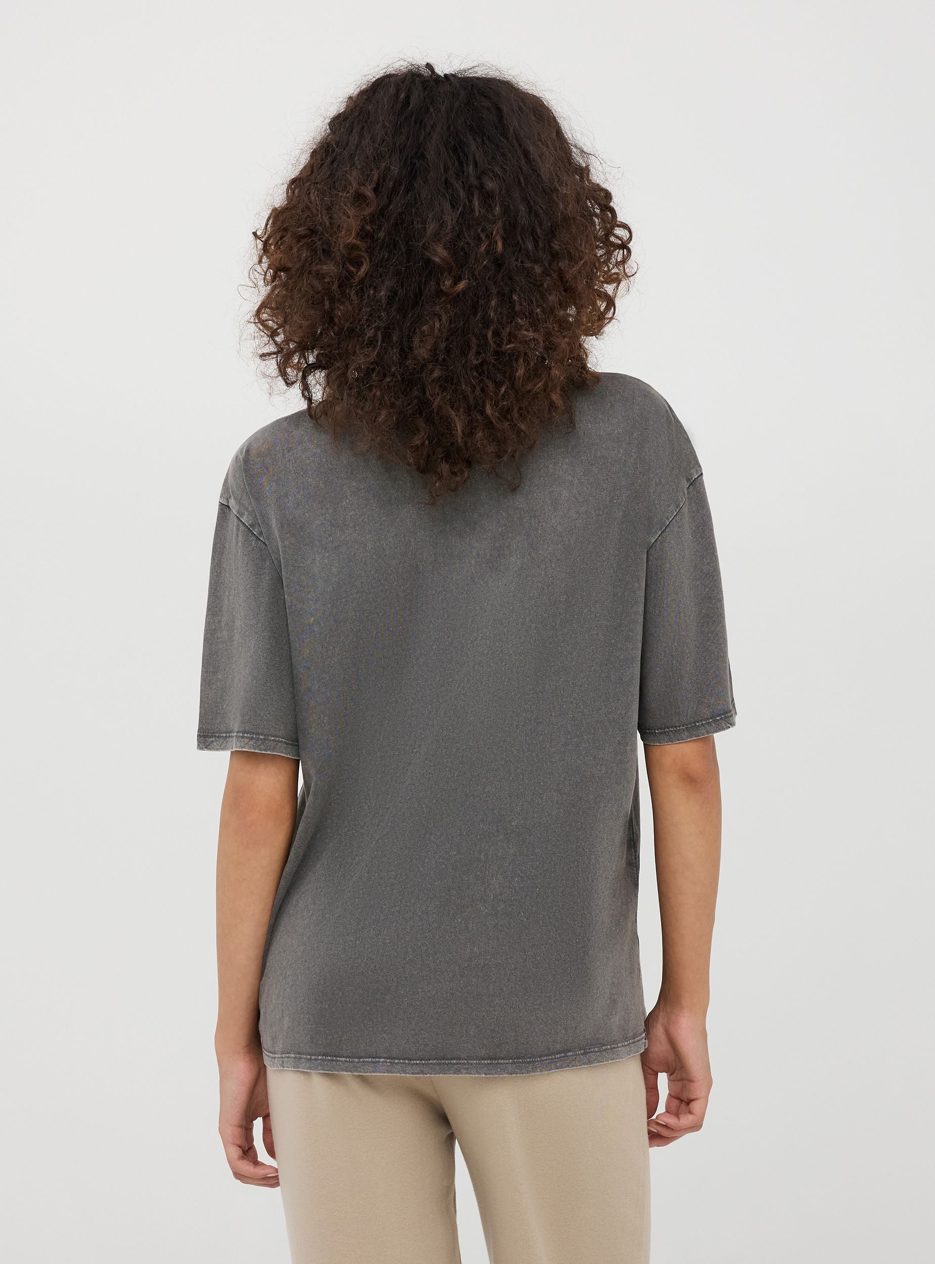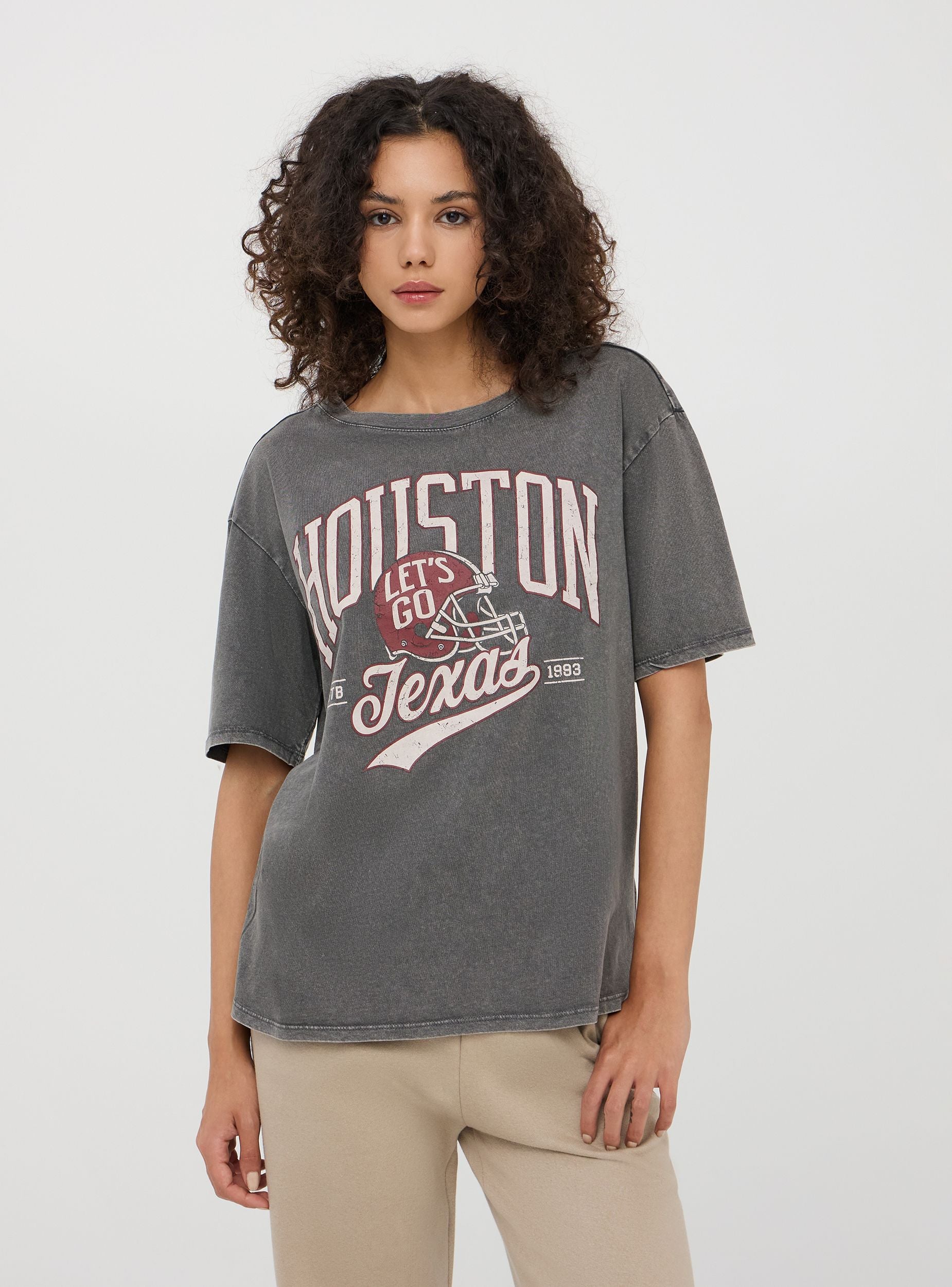 Maglietta da donna con stampa college frontale. Modello girocollo con maniche corte. Vestibilità ampia.Dettagli