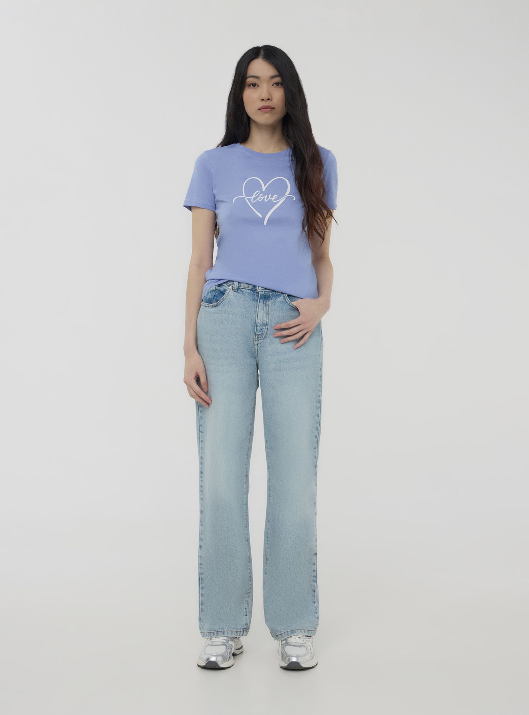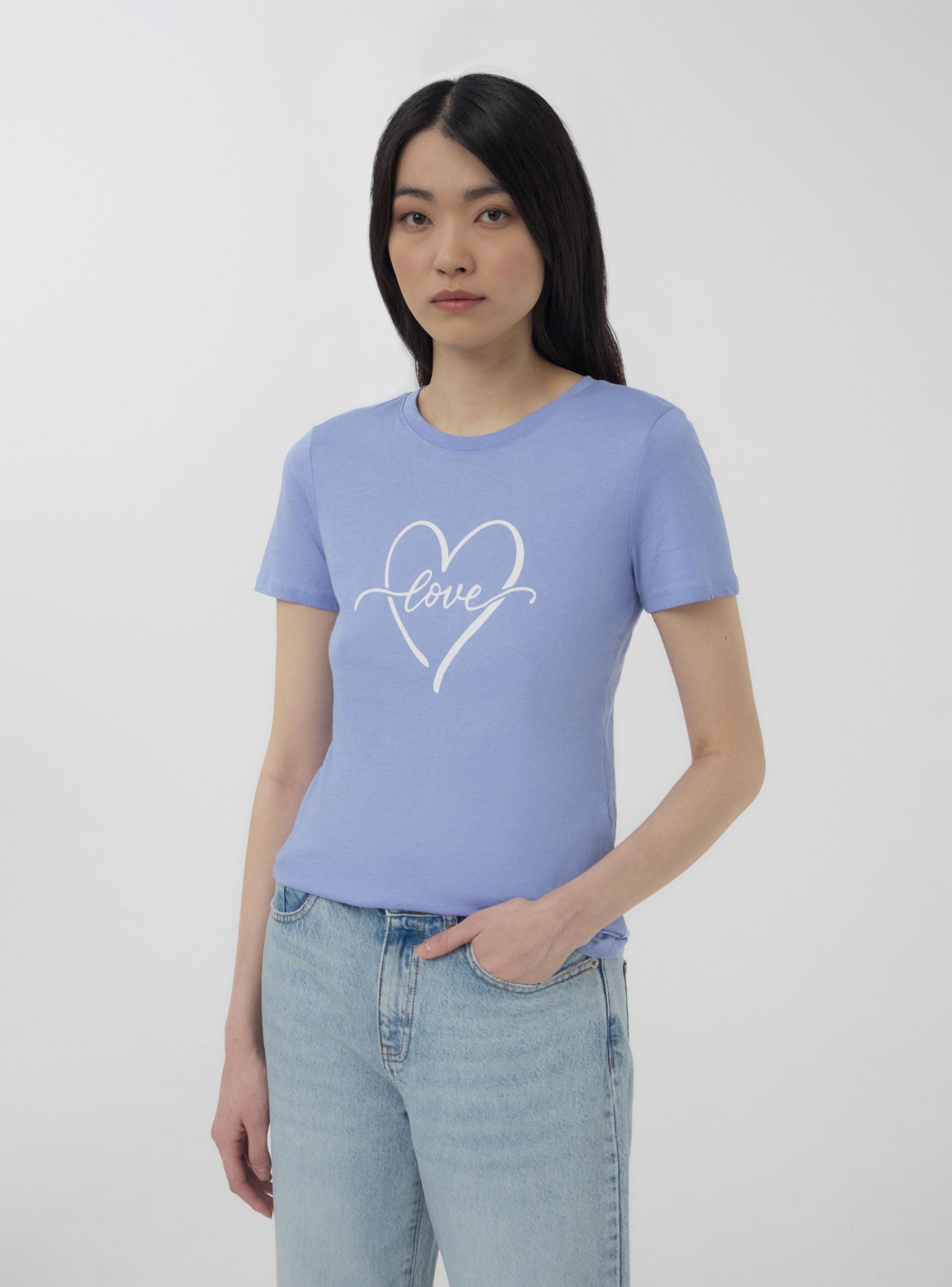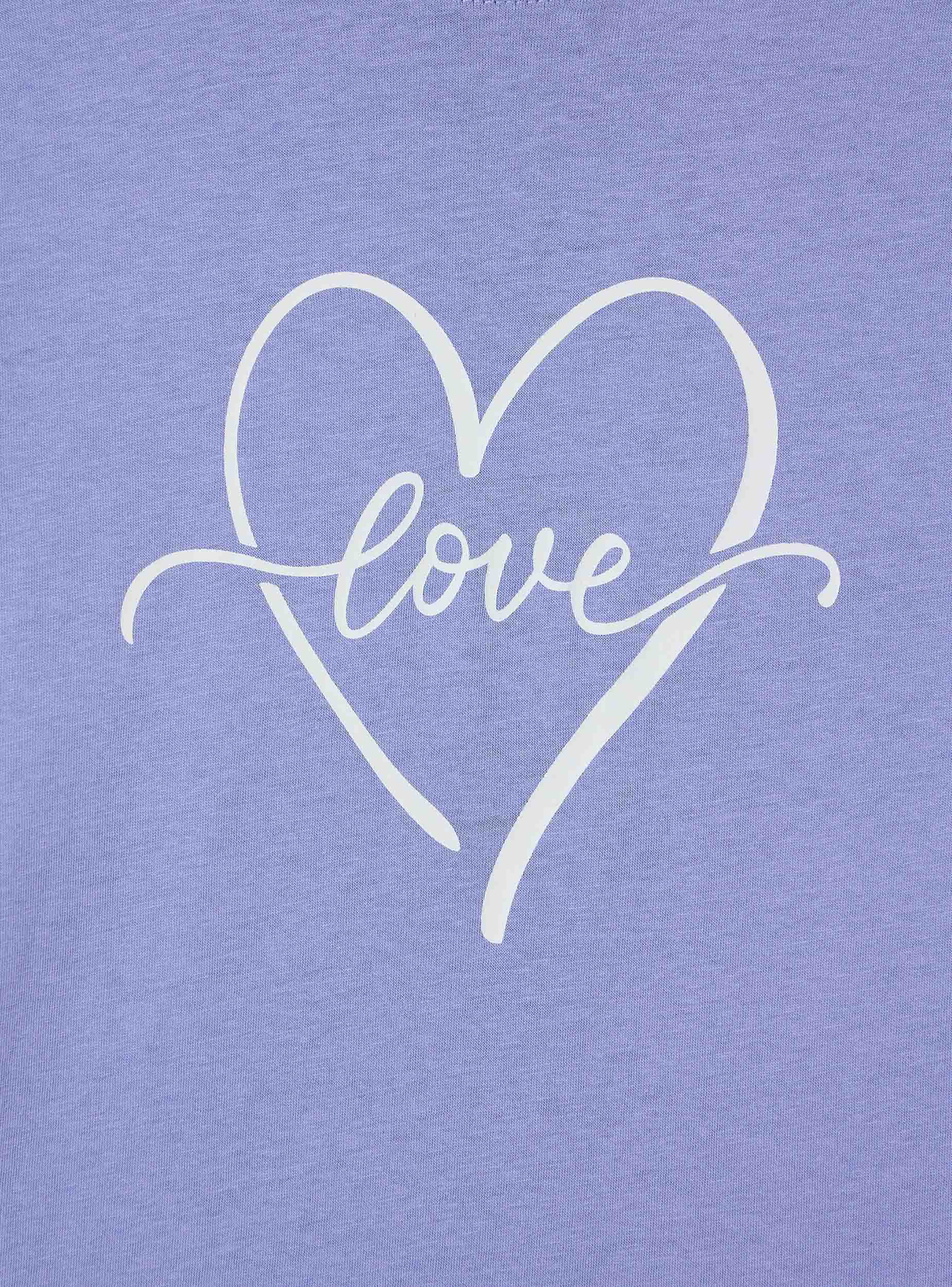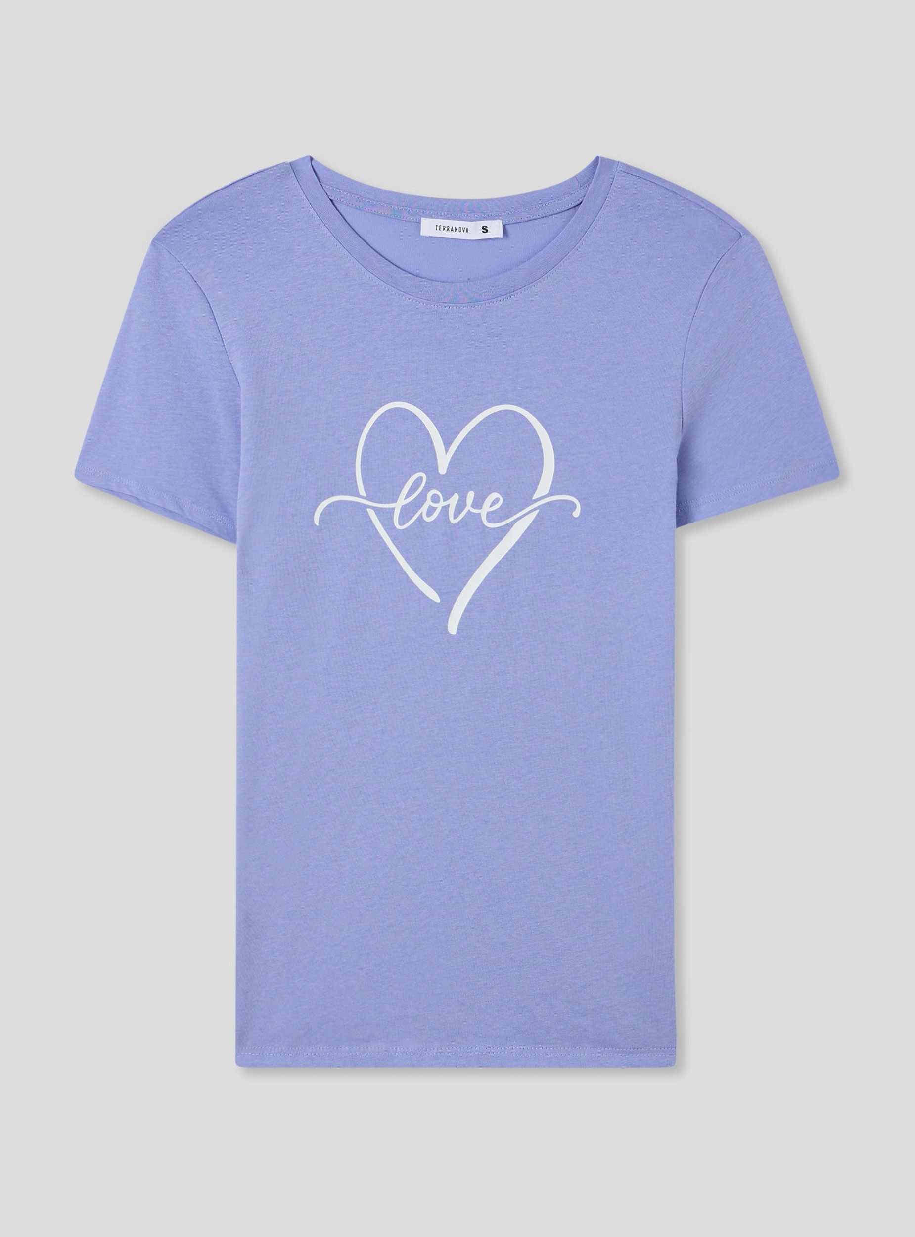 Maglietta da donna con girocollo e maniche corte, impreziosita da una delicata stampa di un cuore stilizzato al centro con la scritta "love" che attraversa il design. Questo capo aggiunge un tocco romantico e casual al look, perfetto per essere abbinato a jeans o gonne per un outfit semplice ma d'effetto.Dettagli