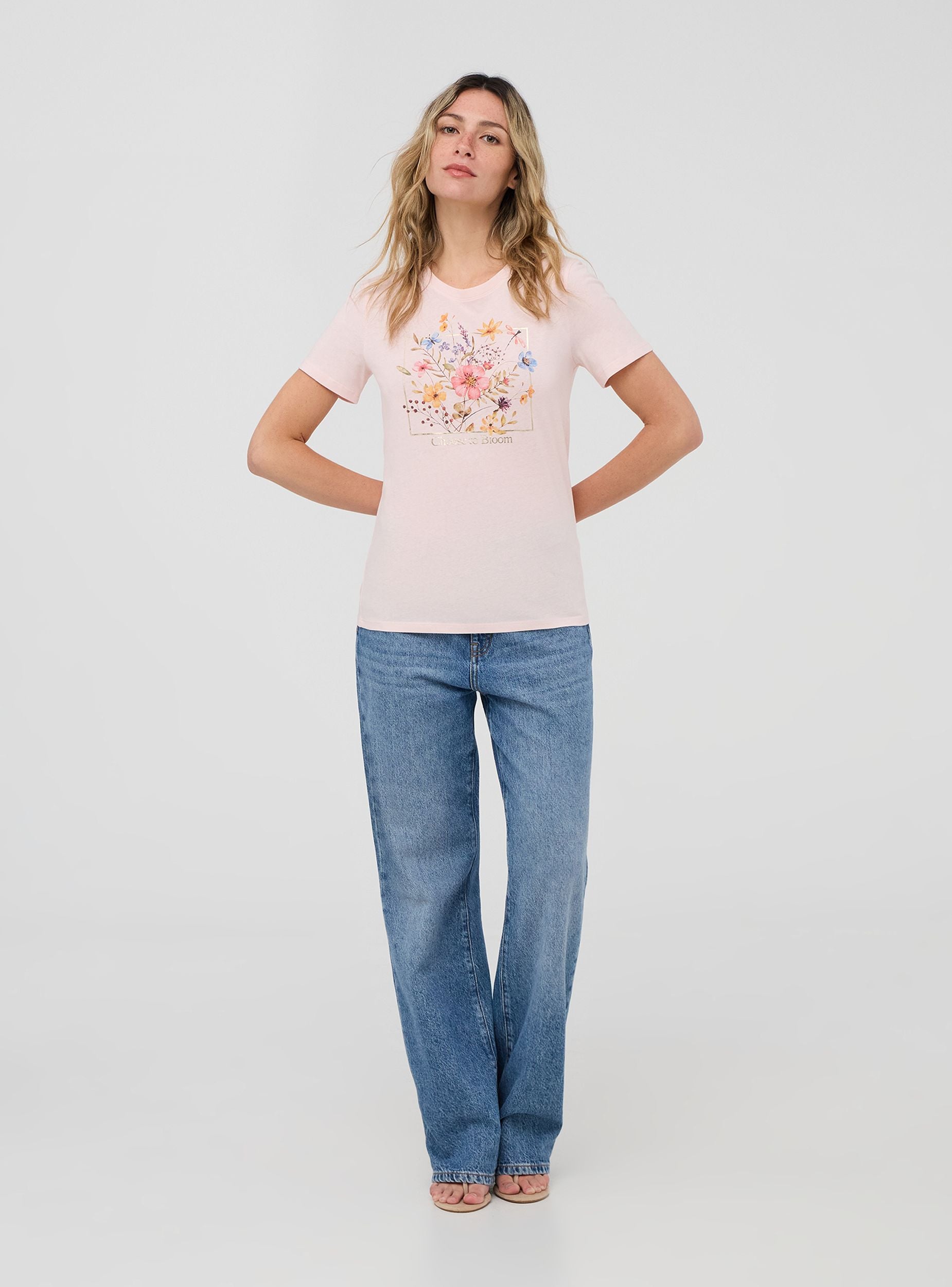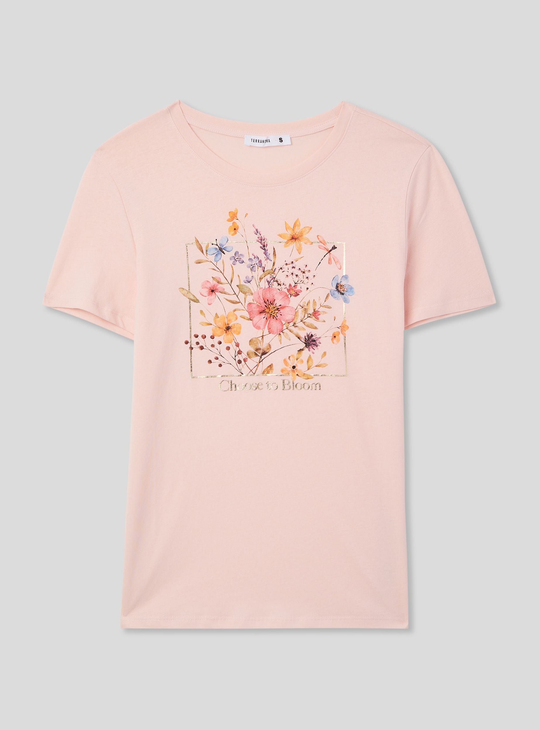 Maglietta da donna con girocollo e maniche corte, caratterizzata da una vivace stampa floreale centrale. Il design presenta un riquadro laminato che incornicia i fiori e la scritta "Choose to Bloom" posizionata sotto il motivo. Un capo dallo stile fresco e casual, perfetto per dare un tocco di allegria a un look quotidiano.Dettagli