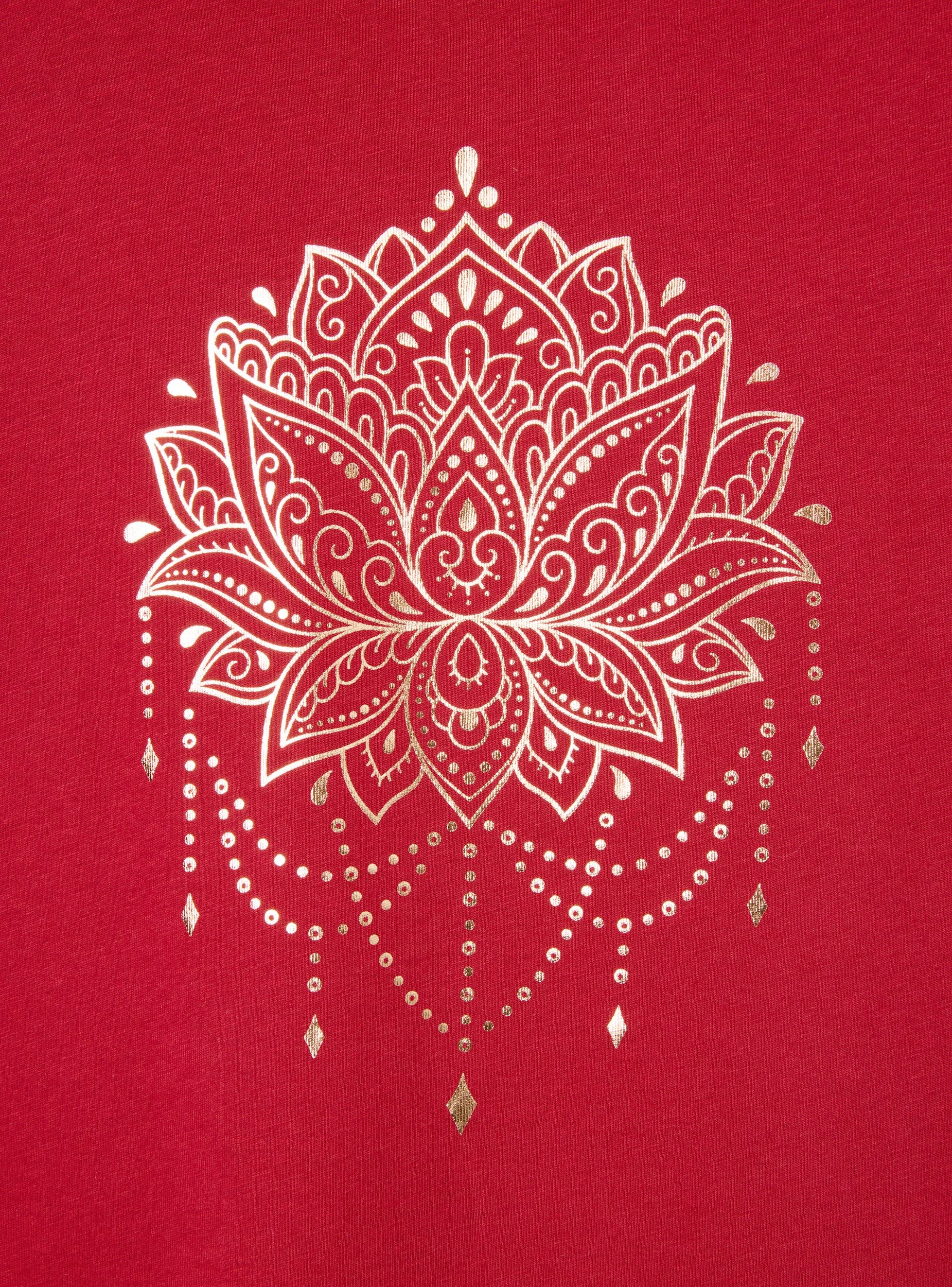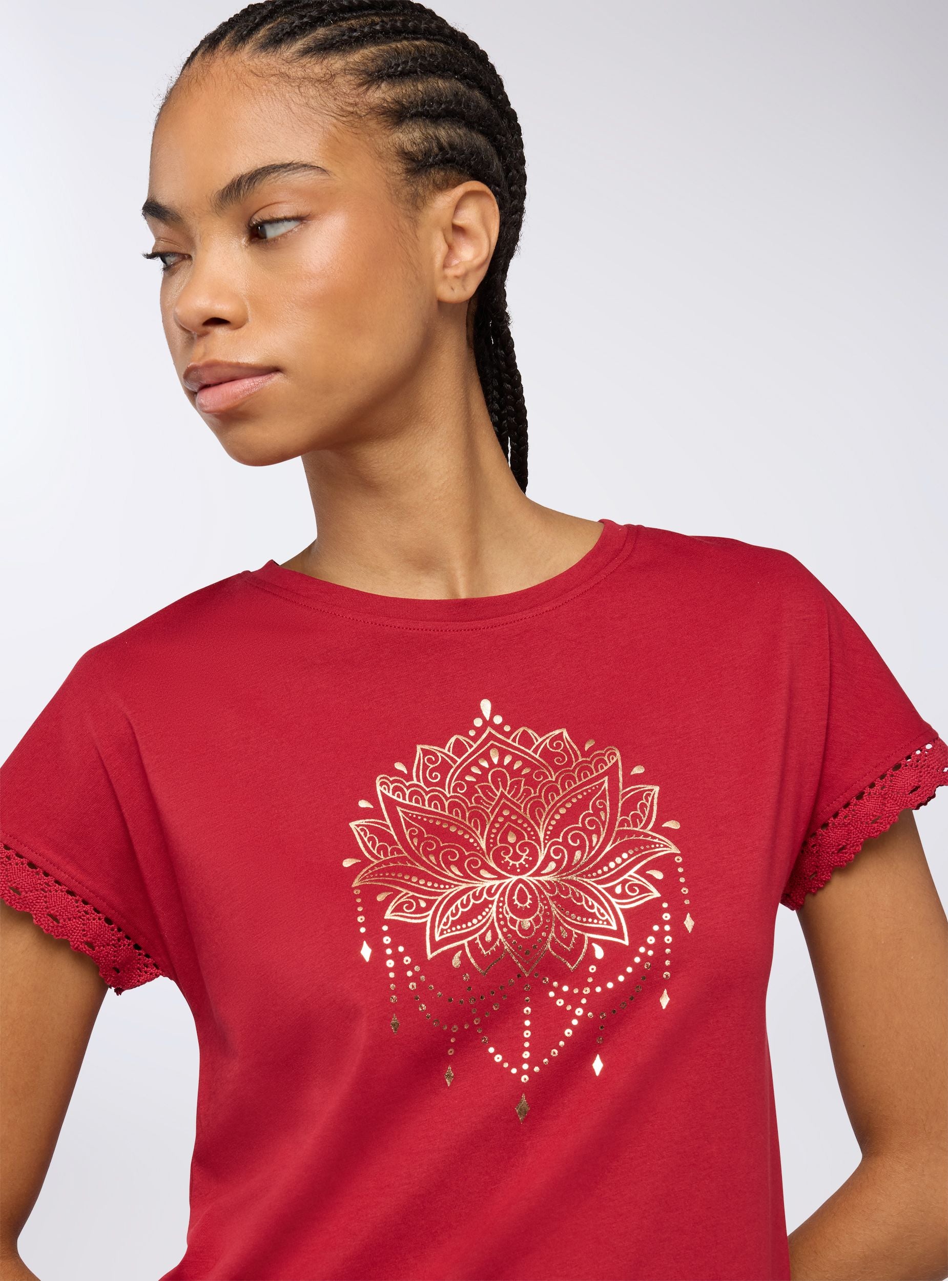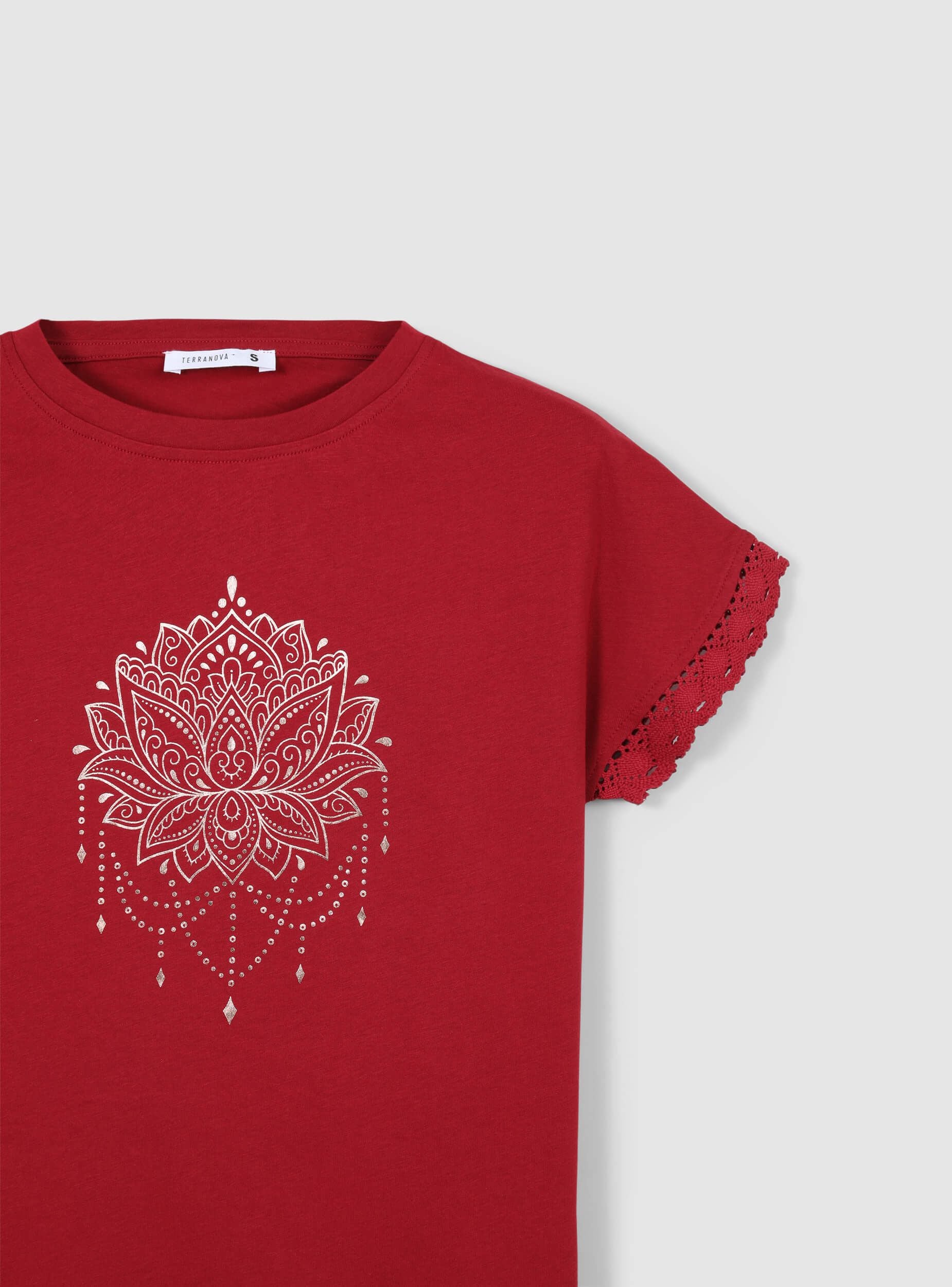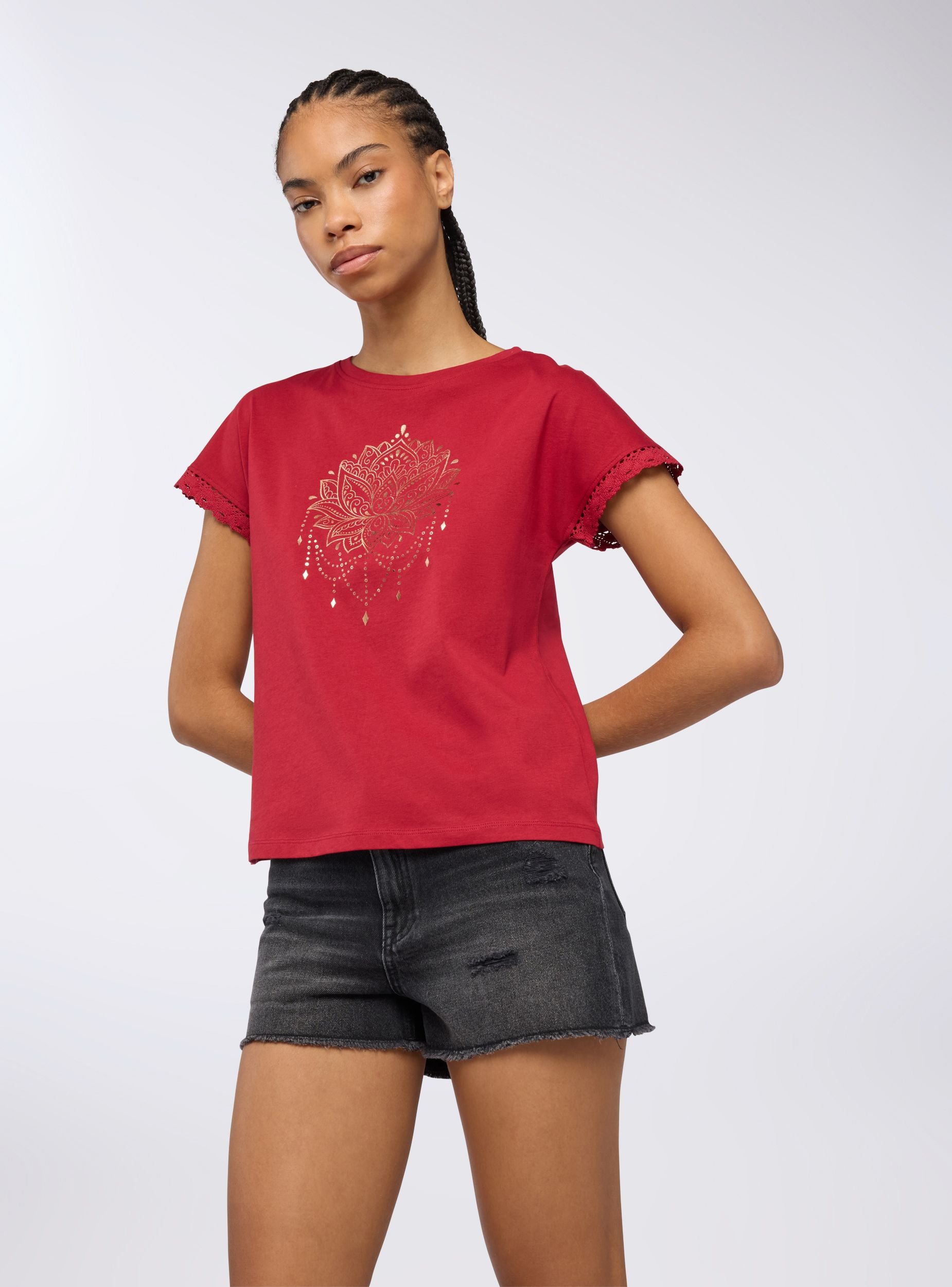 Maglietta da donna con girocollo e maniche corte, arricchita da un raffinato inserto in pizzo sulle maniche che dona un tocco di femminilità al capo. La stampa mandala sul davanti aggiunge un elemento decorativo rendendo questa maglietta perfetta per chi cerca un look casual ma ricercato. Ideale per outfit estivi, abbina comfort e stile con dettagli unici.Dettagli