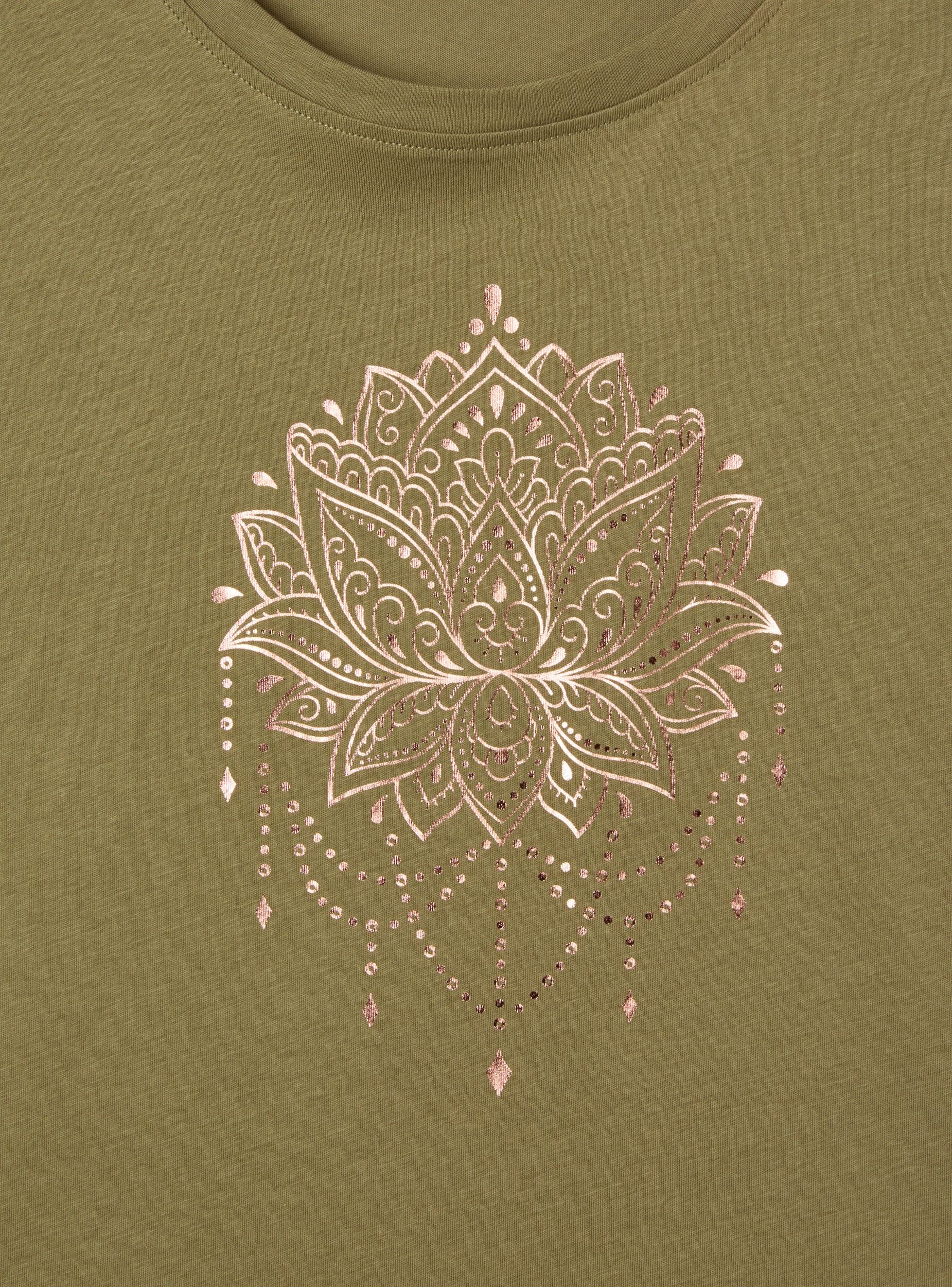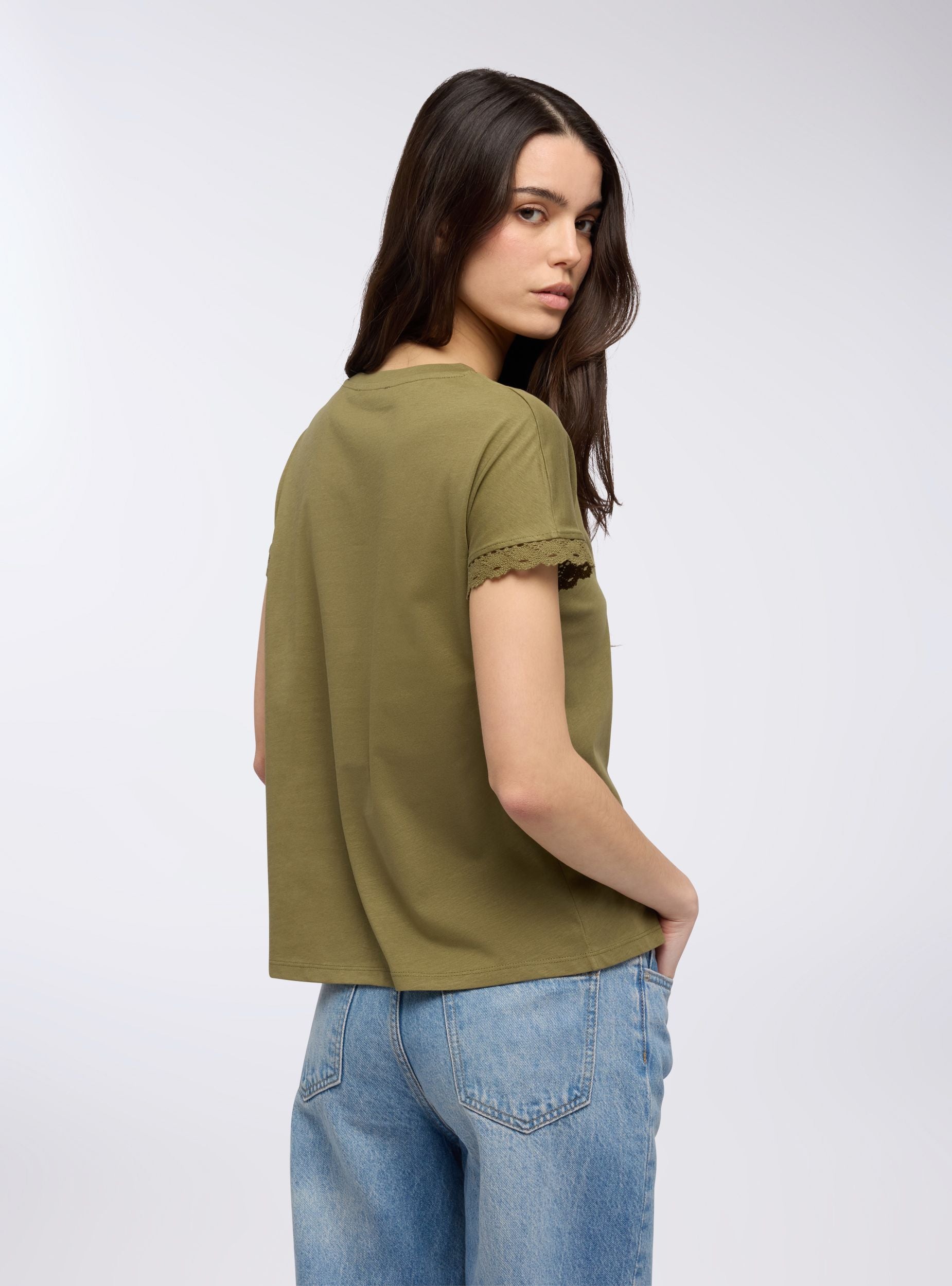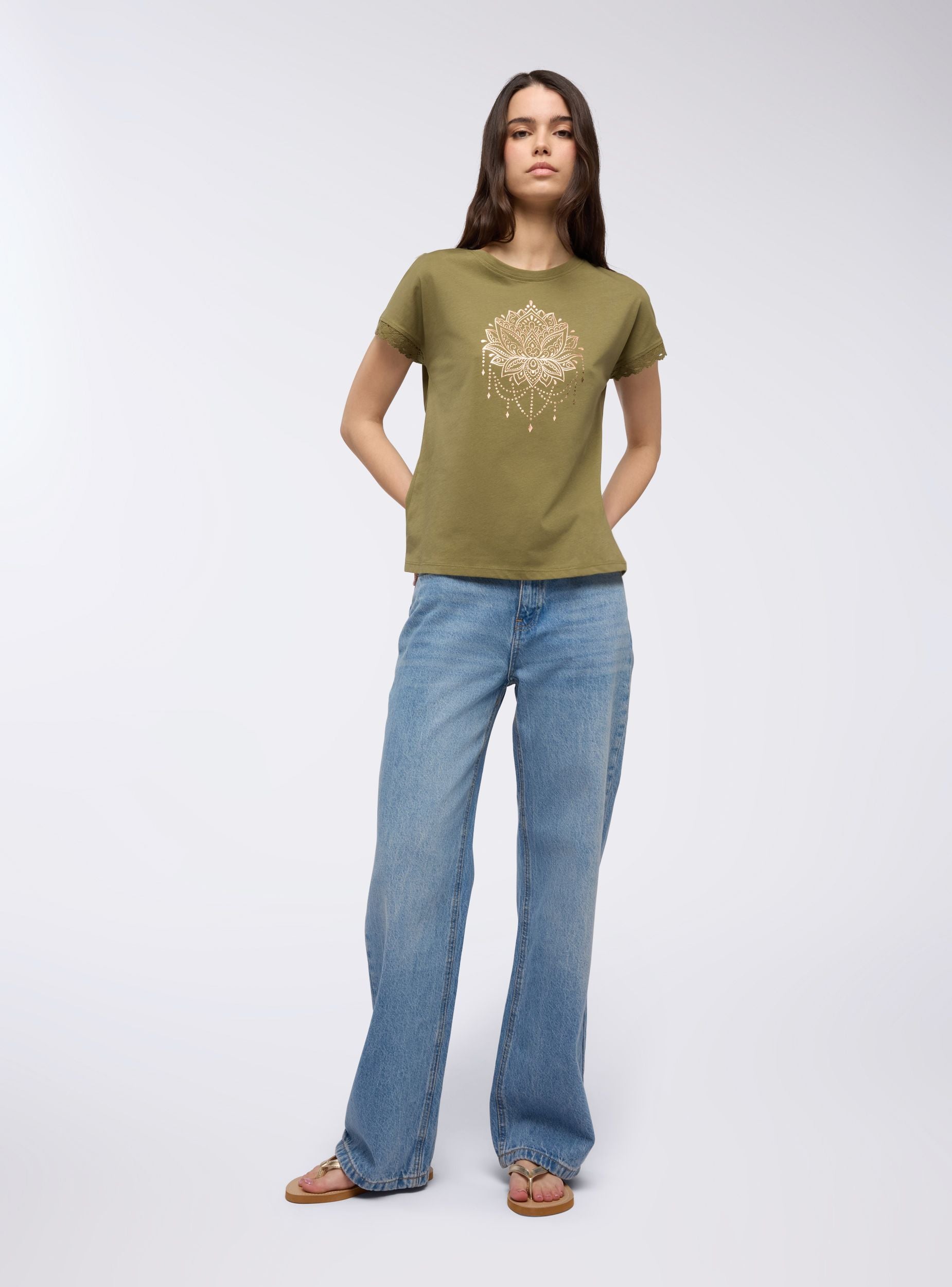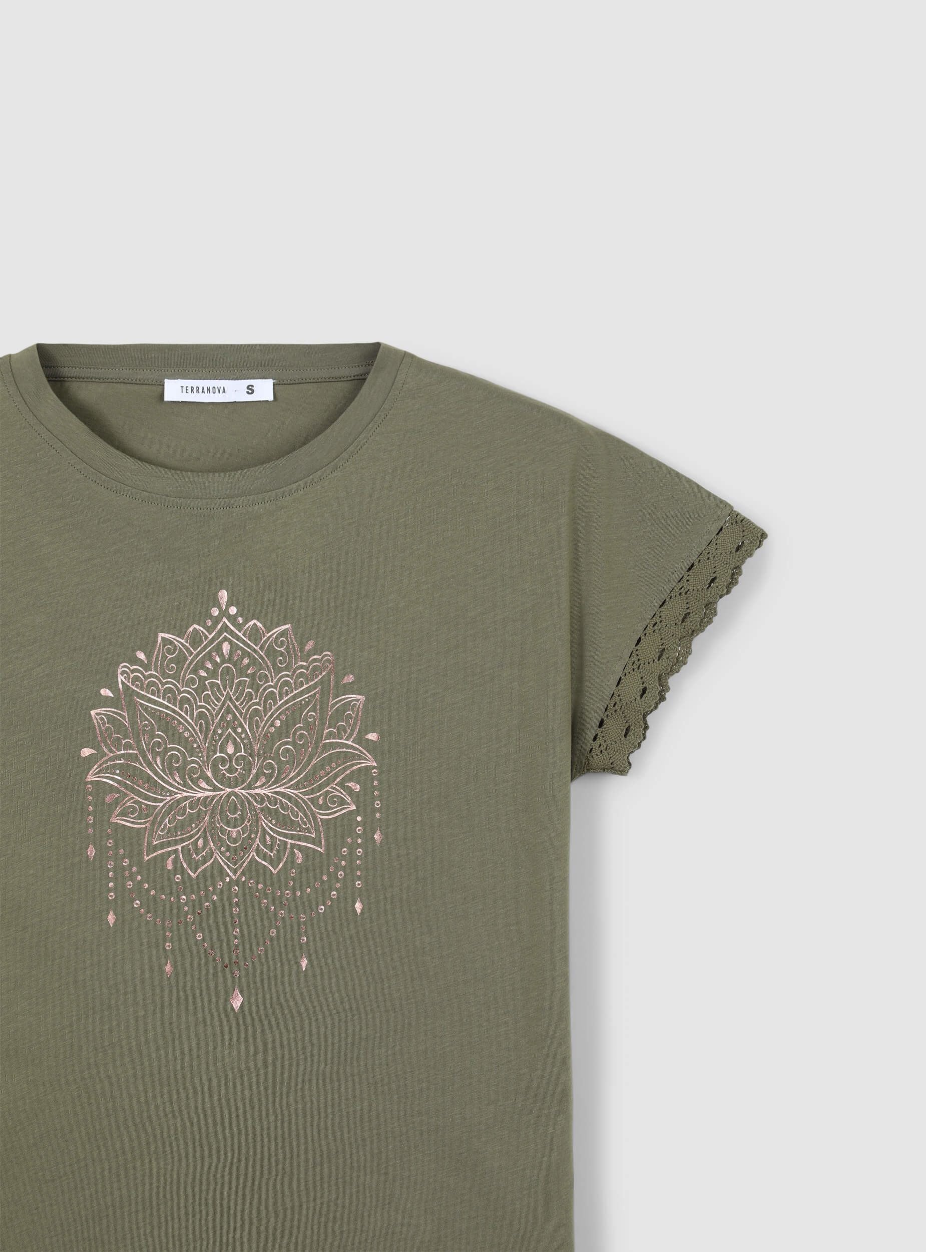 Maglietta da donna con girocollo e maniche corte, arricchita da un raffinato inserto in pizzo sulle maniche che dona un tocco di femminilità al capo. La stampa mandala sul davanti aggiunge un elemento decorativo rendendo questa maglietta perfetta per chi cerca un look casual ma ricercato. Ideale per outfit estivi, abbina comfort e stile con dettagli unici.Dettagli