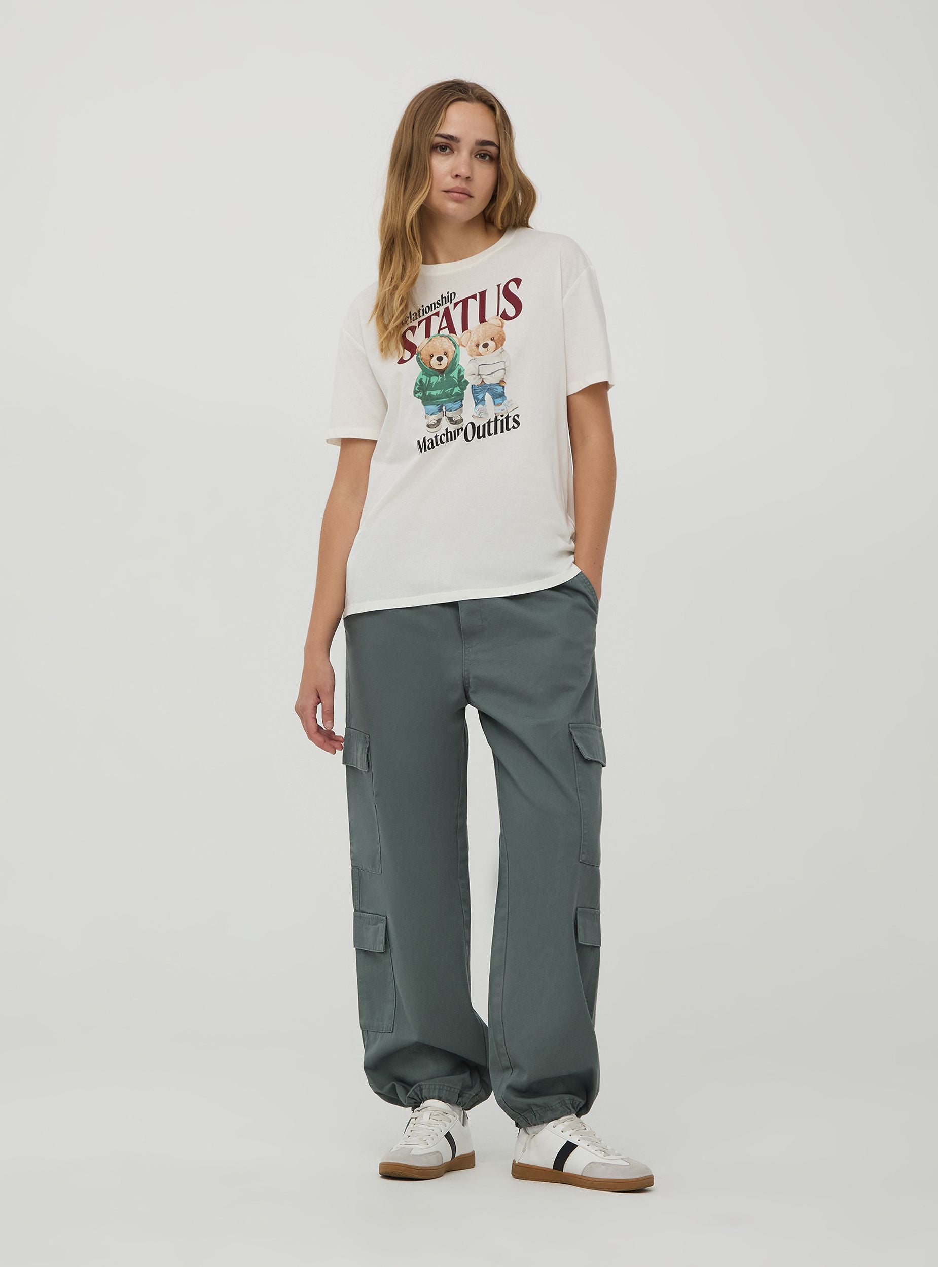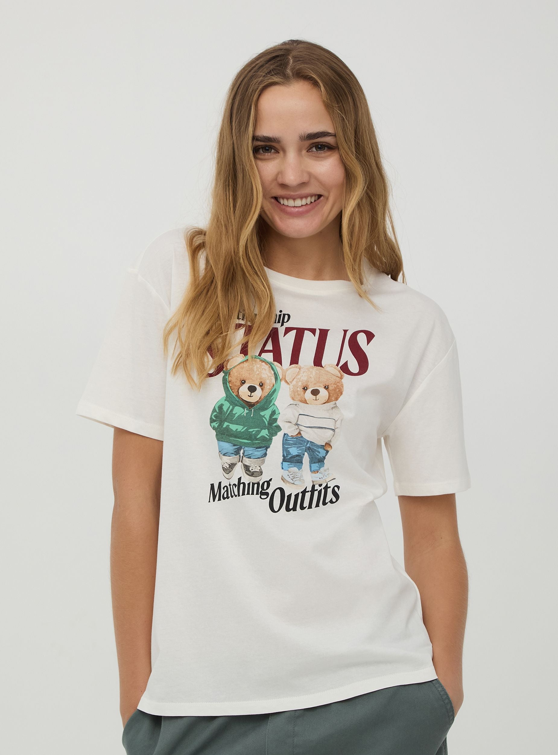 Maglietta da donna in jersey di cotone. Stampa con scritte e orsetti frontale. Modello girocollo con maniche corte. Capo casual perfetto da abbinare ai tuoi look di tutti i giorni. Vestibilità ampia.Dettagli