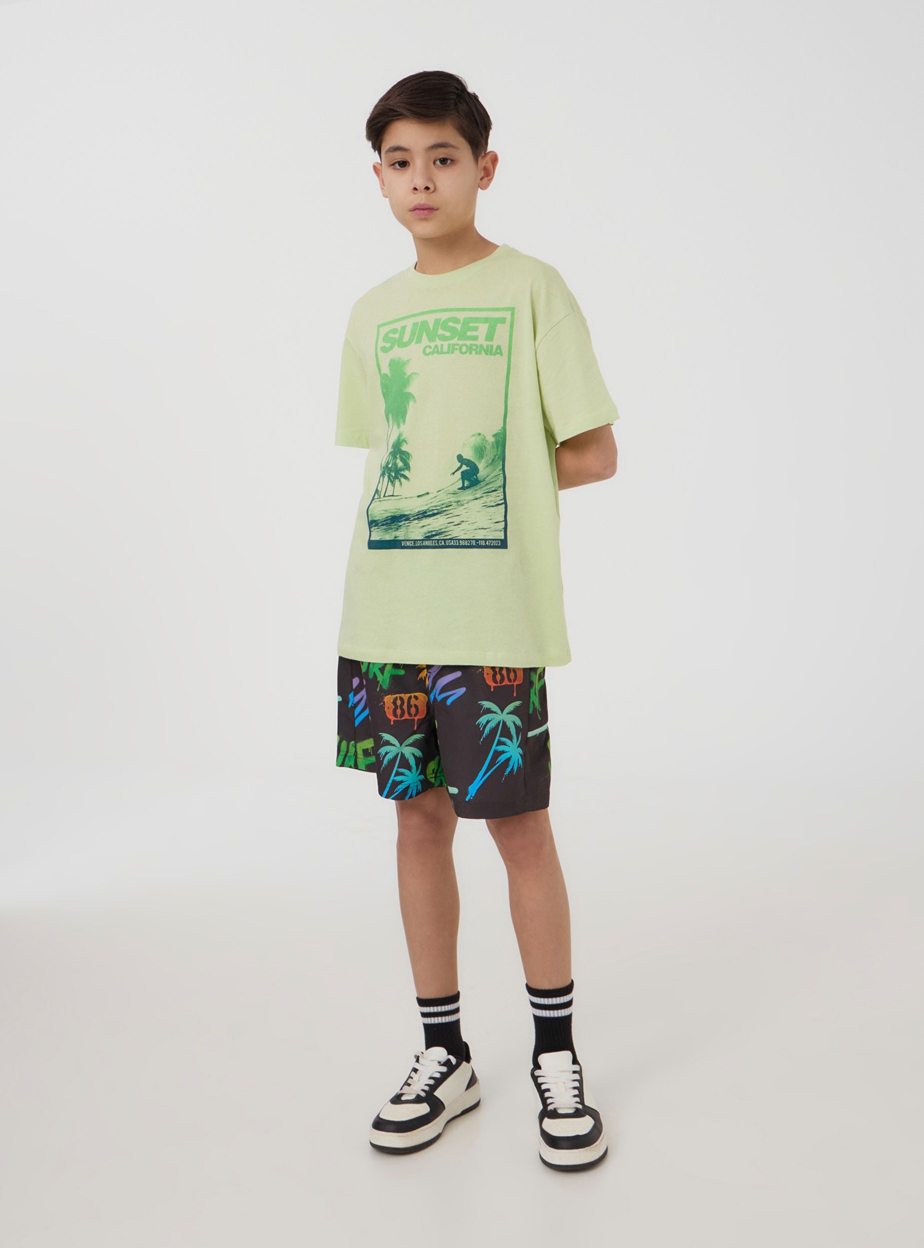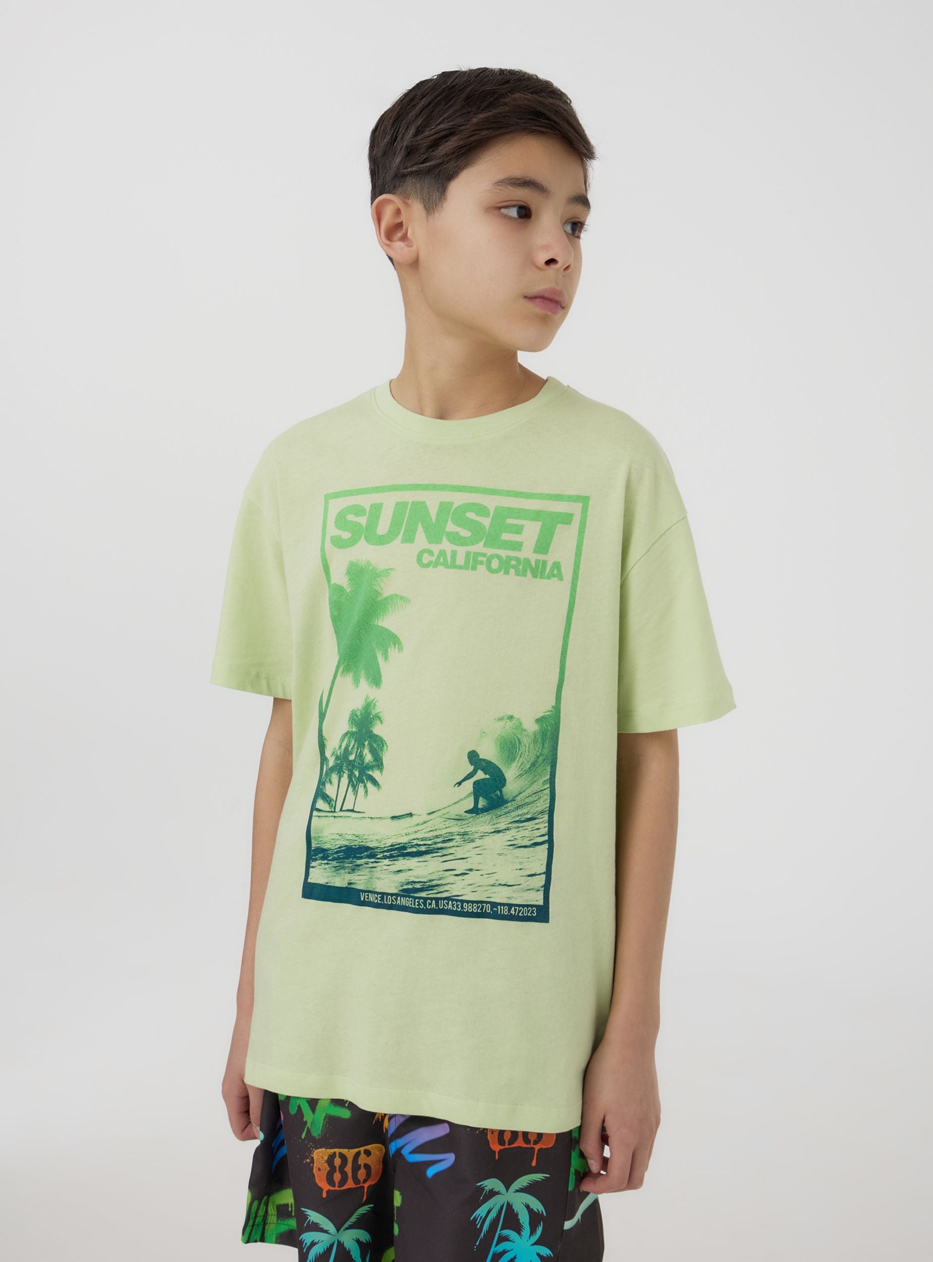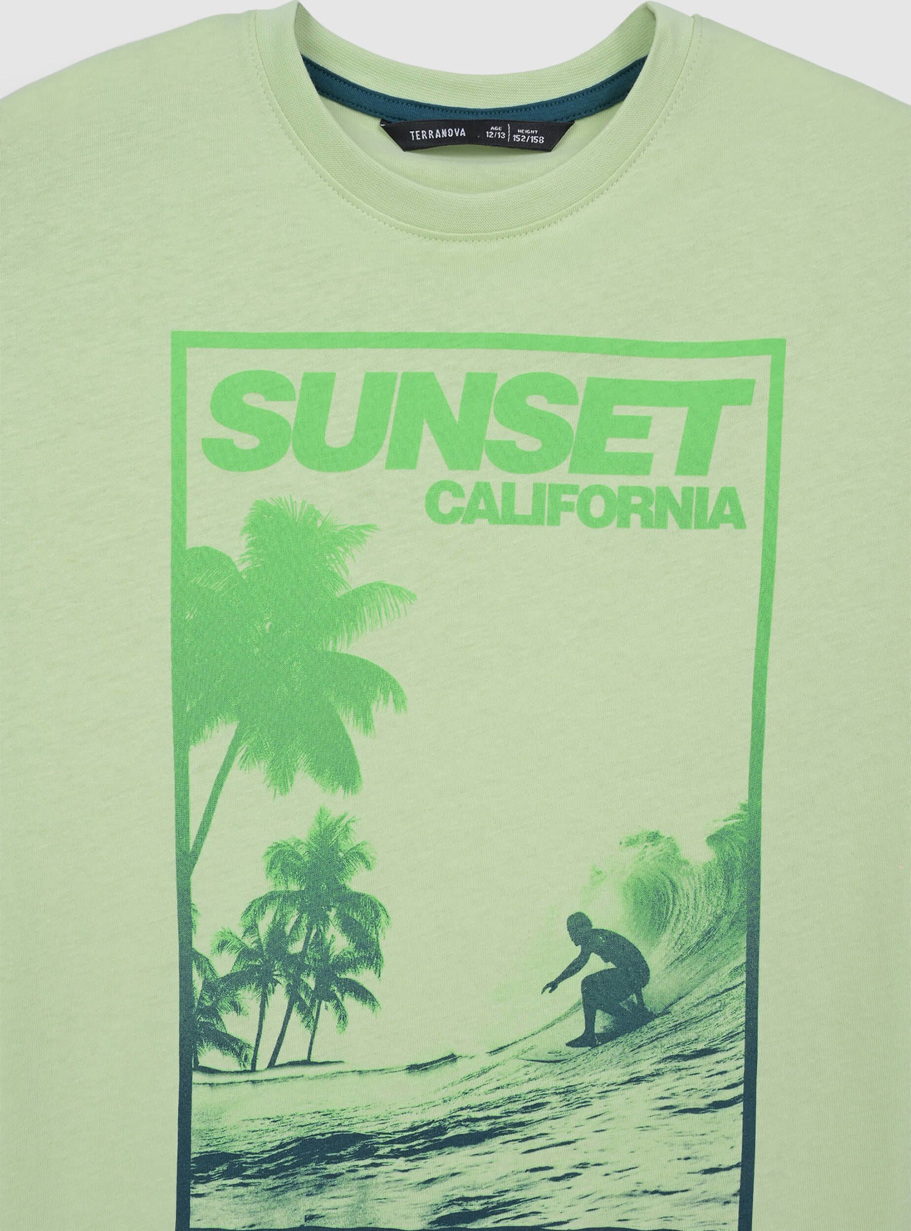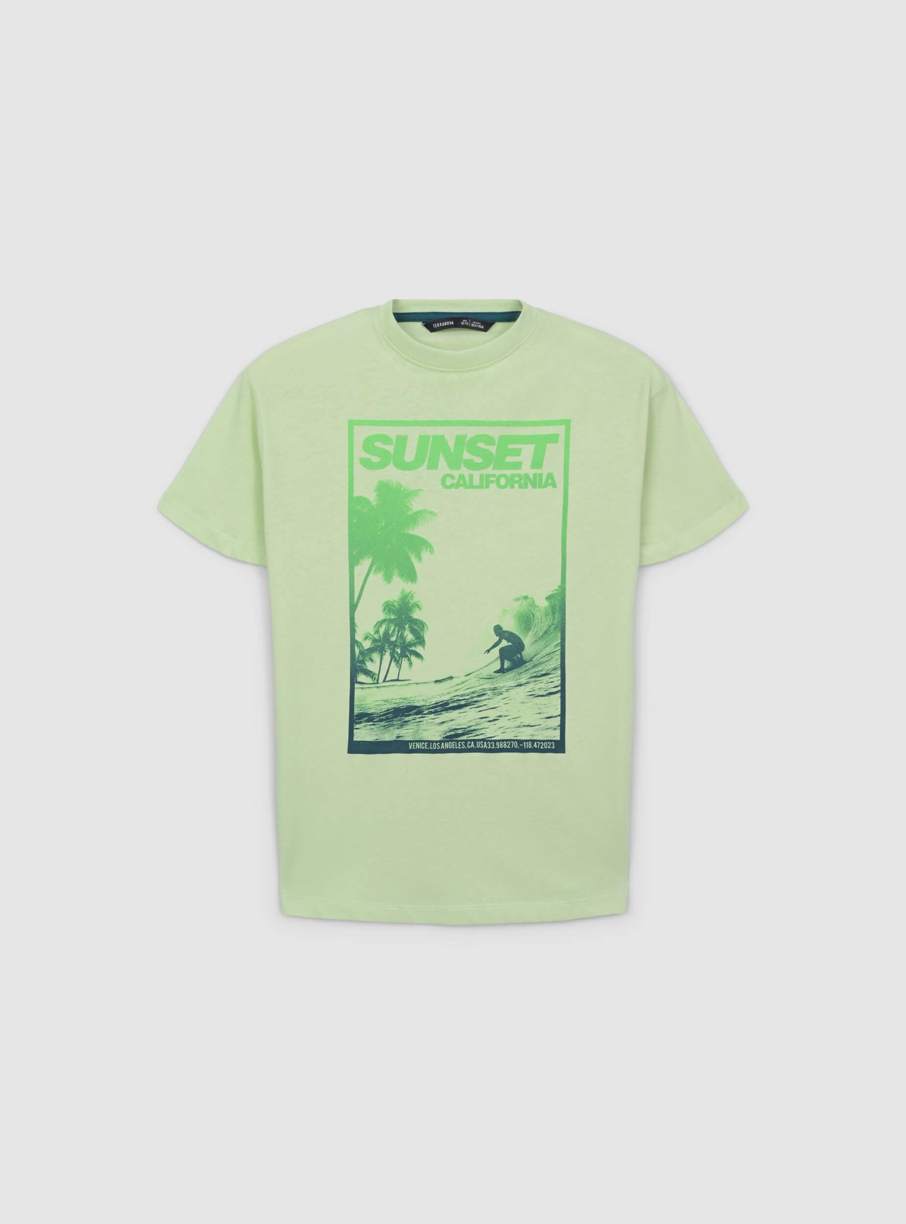 Maglietta da bambino a maniche corte con girocollo, perfetta per chi ama lo stile casual e sportivo. La stampa con motivo surf e la scritta "Sunset California" richiamano le atmosfere estive e il fascino delle onde, ideale per il tempo libero o una giornata all'aria aperta. Si abbina perfettamente a jeans o bermuda per un look rilassato e alla moda, aggiungendo un tocco di dinamismo e avventura all’outfit.Dettagli