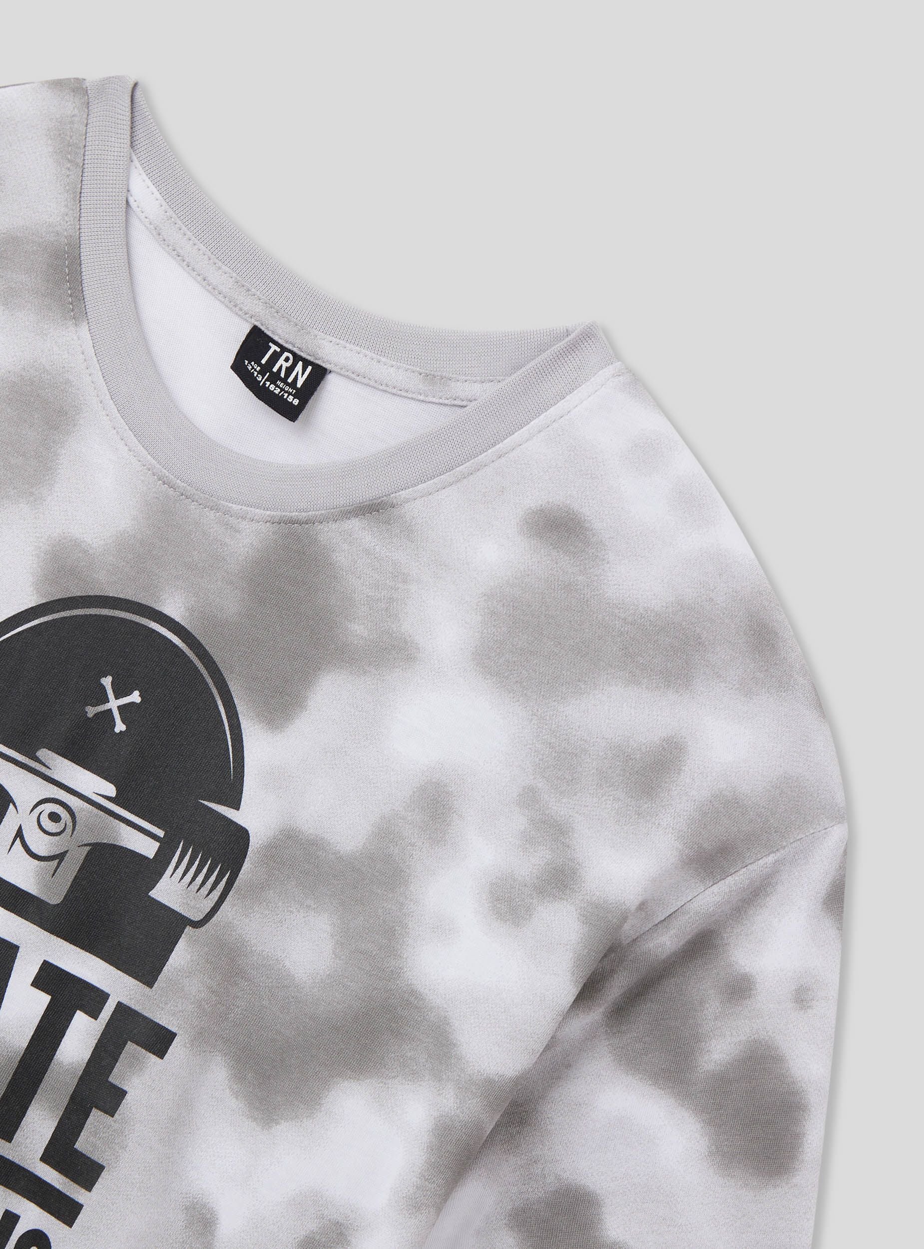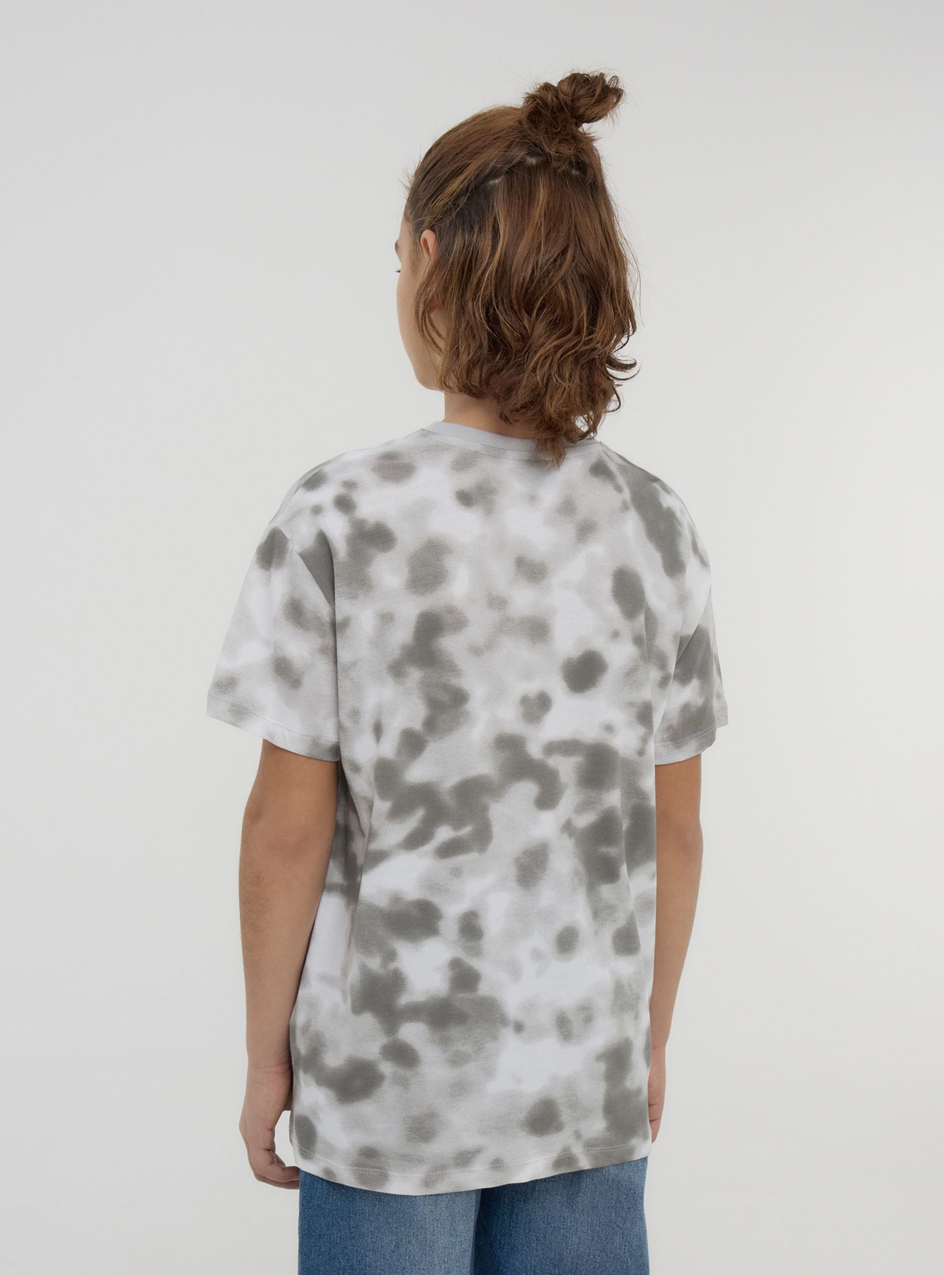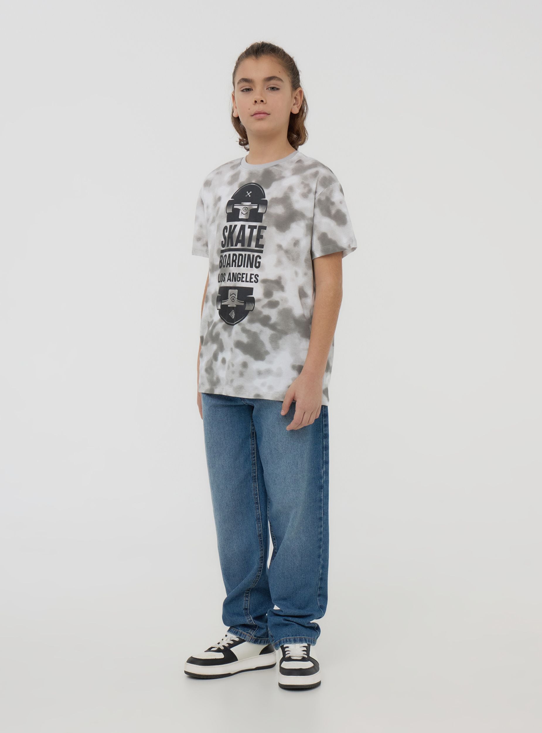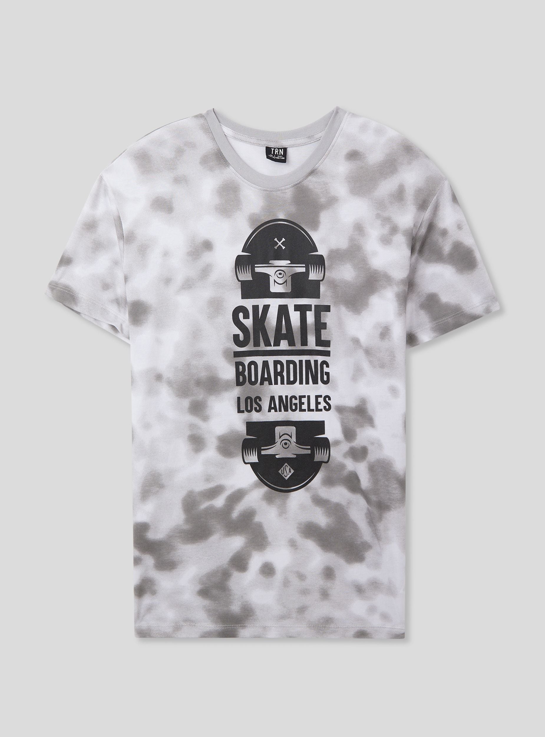 Maglietta da bambino perfetta per un look casual e dinamico, ideale per il tempo libero e le attività all'aperto. Con maniche corte e girocollo, presenta una vivace fantasia tie-dye e una stampa skate con scritte accattivanti. Un capo versatile e di tendenza per i giovani appassionati di stile urbano.Dettagli