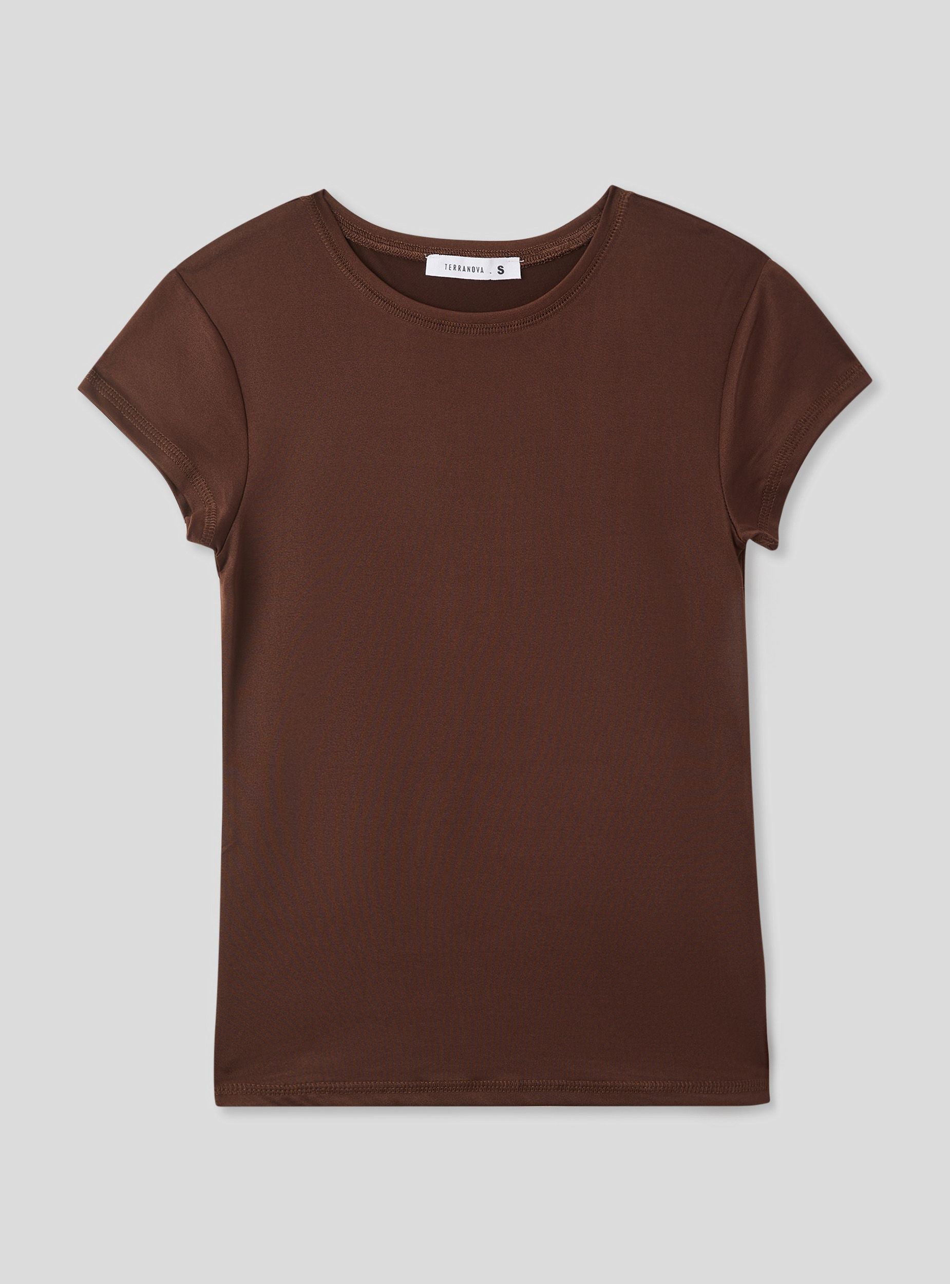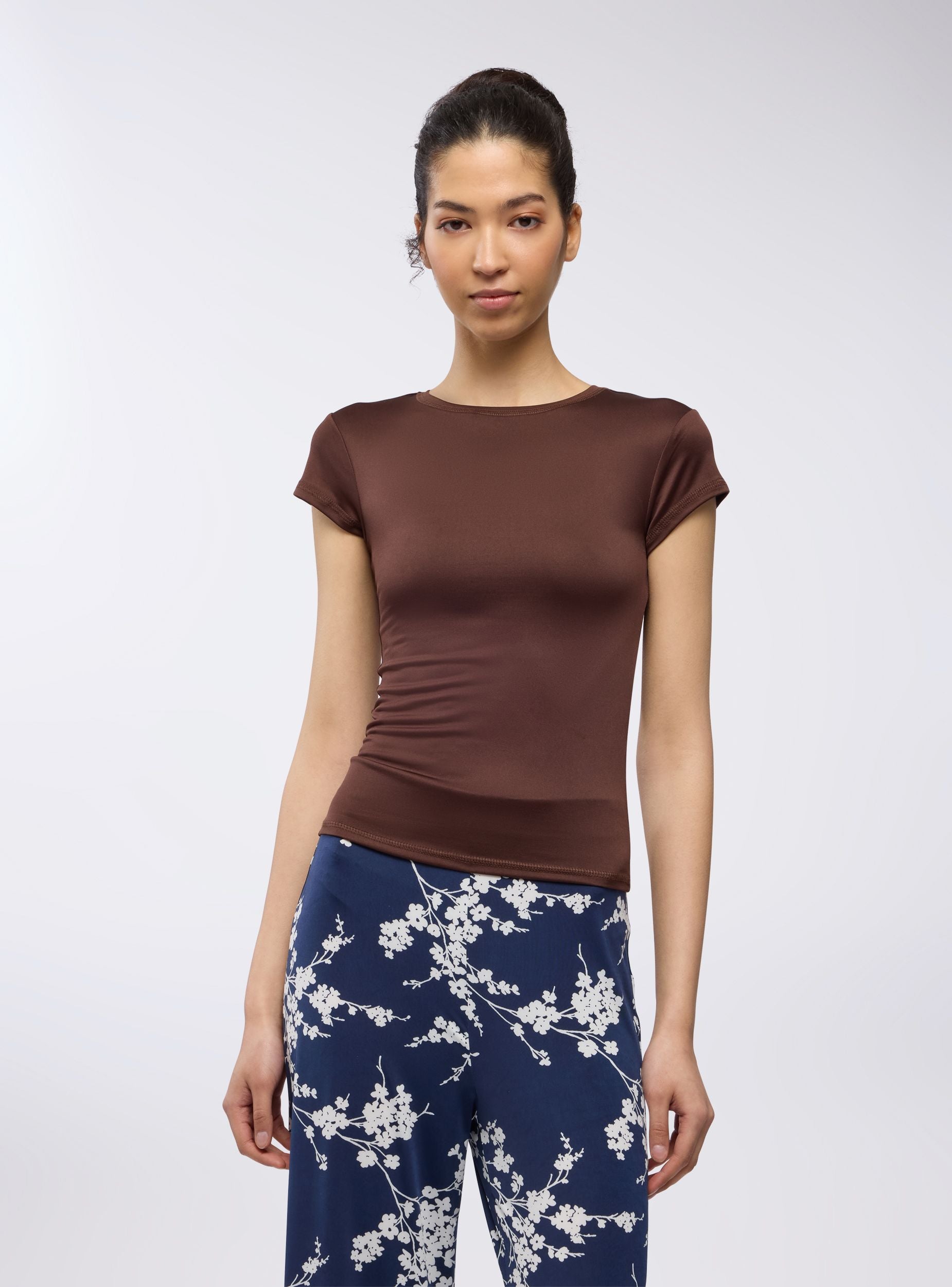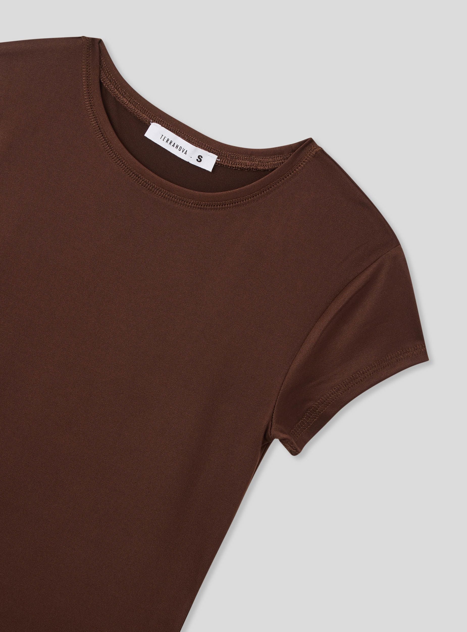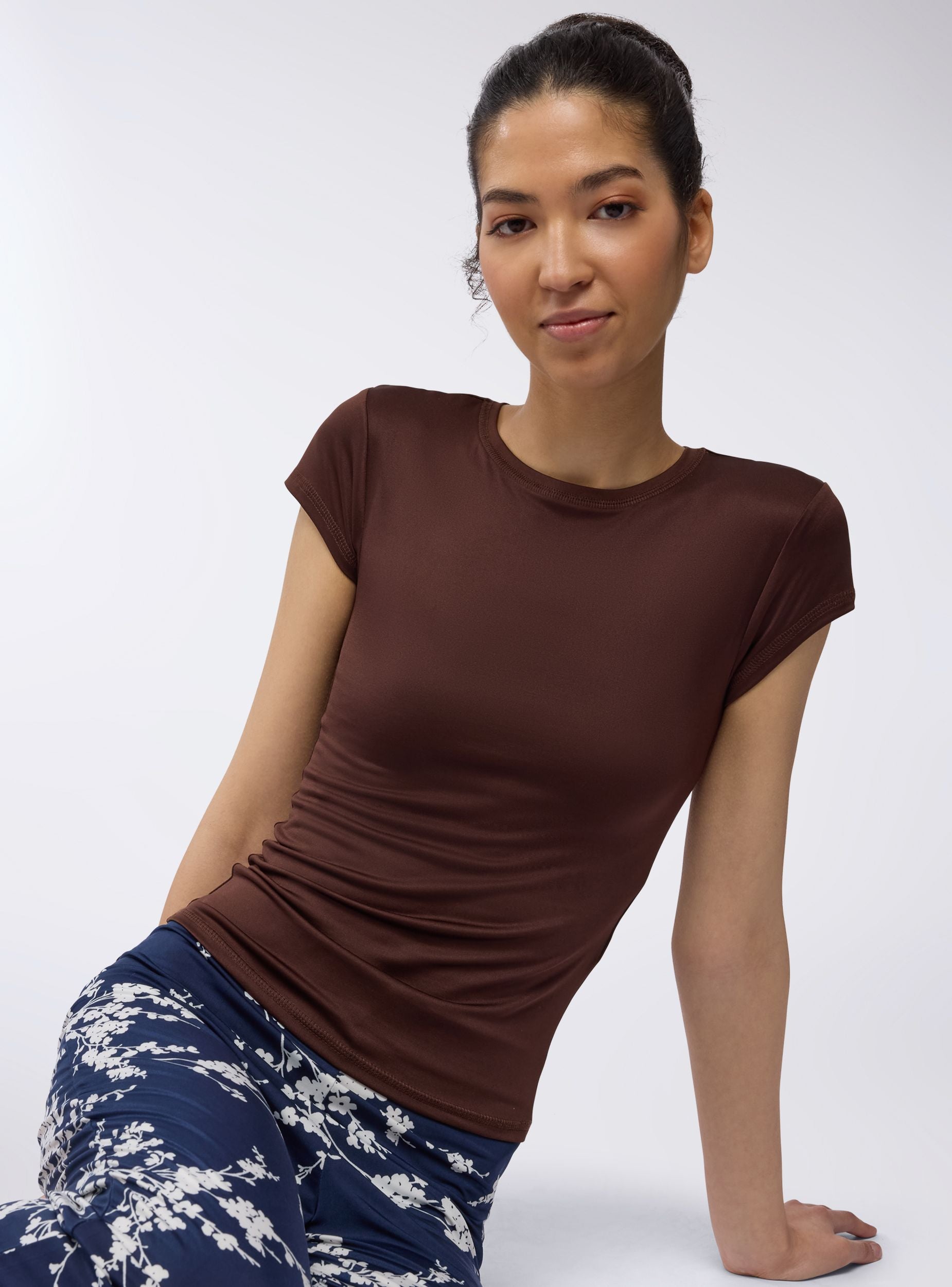 Maglietta da donna a tinta unita con taglio dritto, maniche corte e girocollo. La lunghezza è regolare, offrendo una vestibilità comoda e versatile, ideale per un look casual o sportivo. La maglietta è priva di decorazioni, il che la rende perfetta per essere abbinata a diversi tipi di outfit.Dettagli