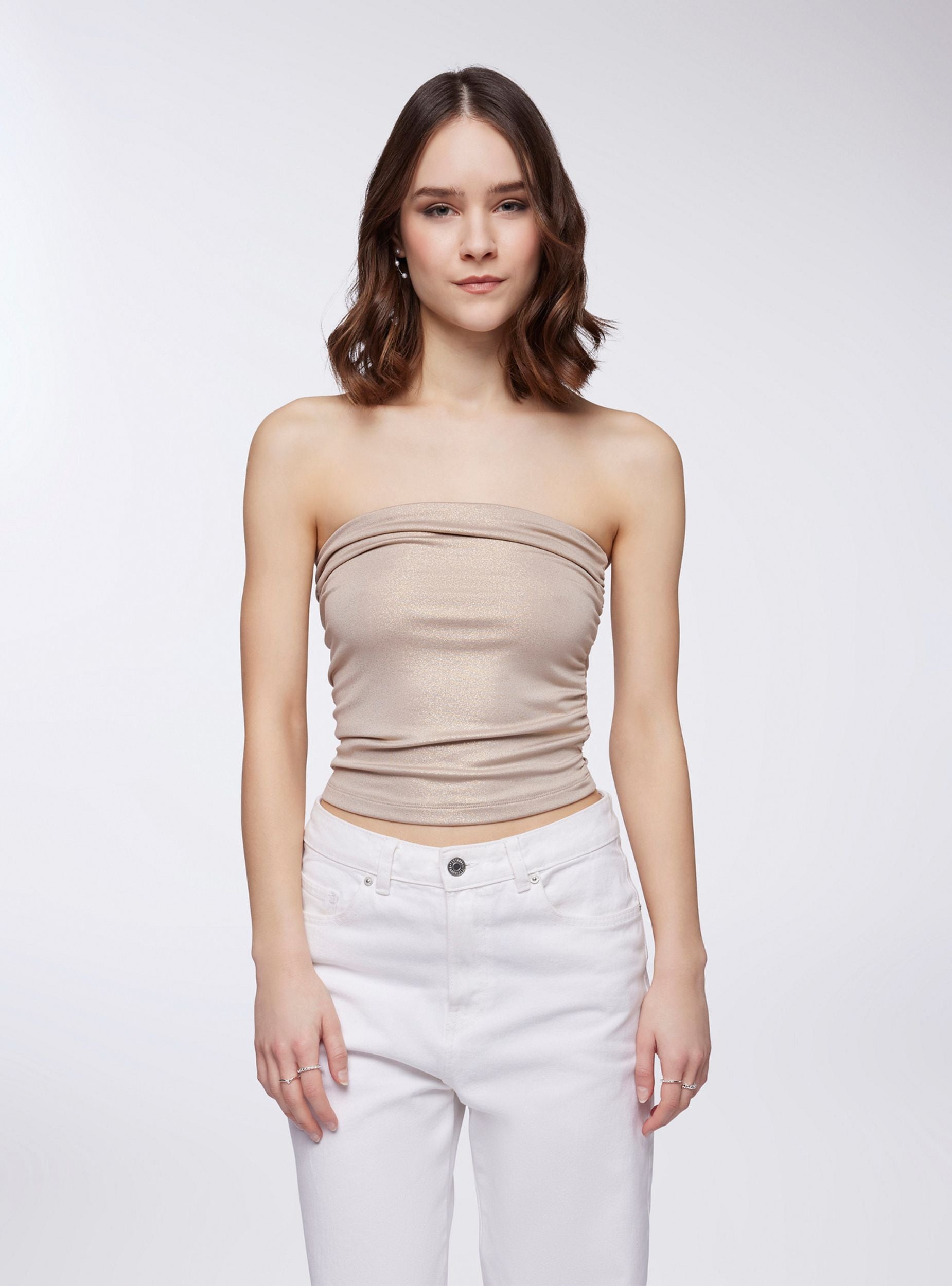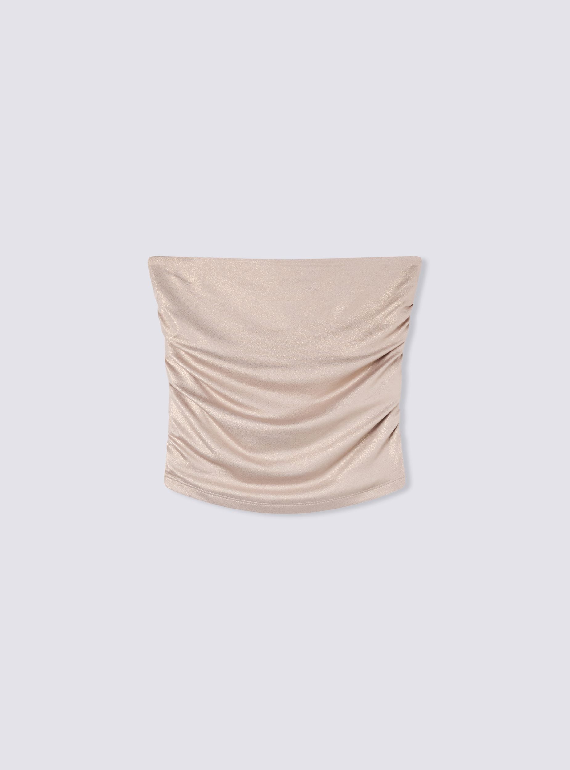 Top da donna a fascia, ideale per un look estivo o serate speciali. Caratterizzato da un design aderente e tessuto elasticizzato, valorizza la silhouette offrendo comfort e stile. Le leggere arricciature sui lati donano movimento al capo, mentre l'effetto brillante aggiunge un tocco di eleganza e femminilità. Perfetta da abbinare a jeans o gonne per un outfit versatile e alla moda.Dettagli