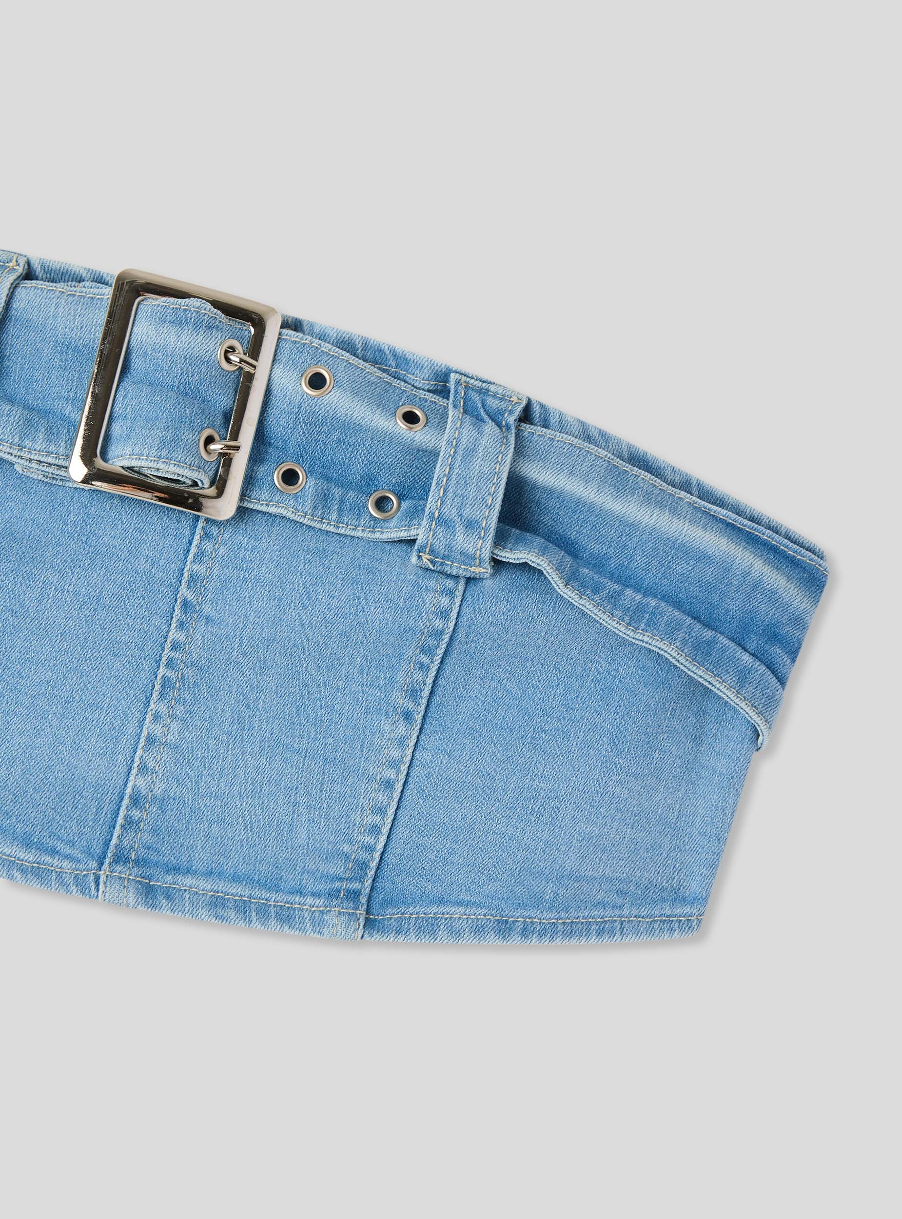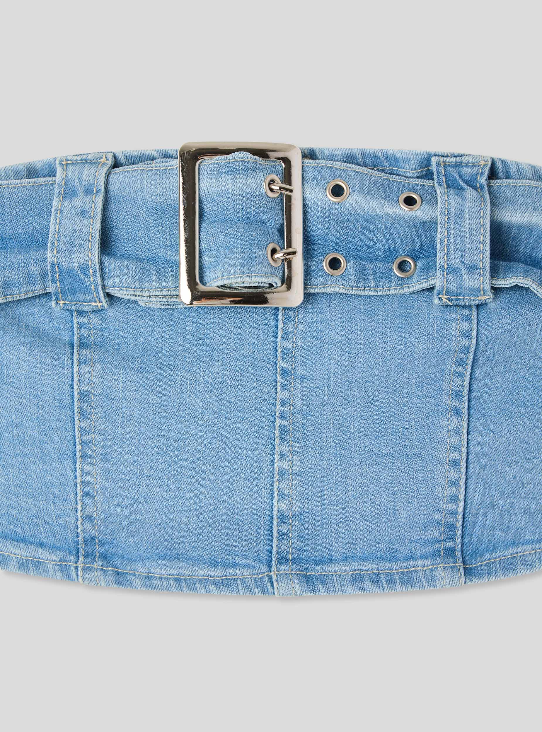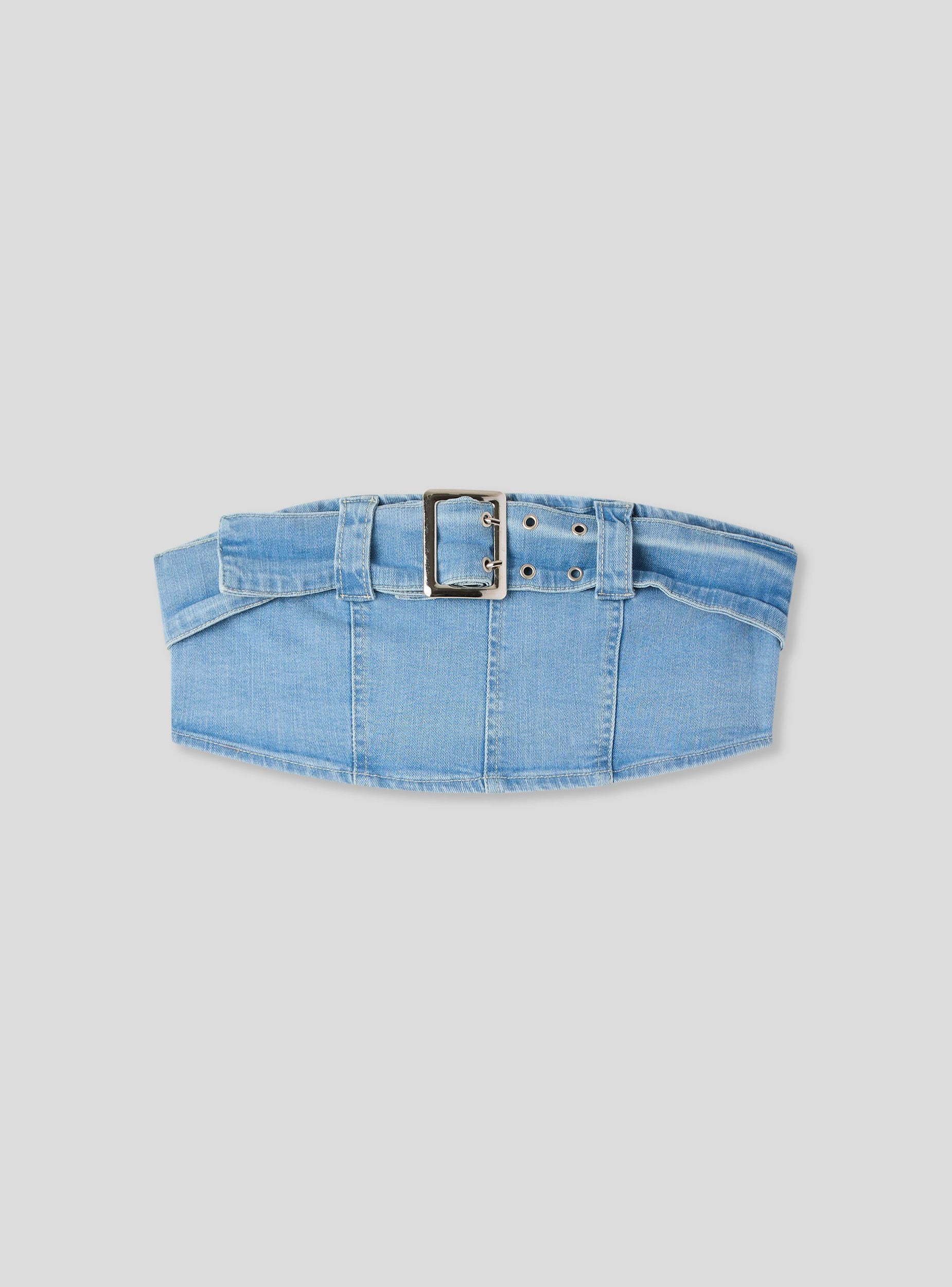 Top crop da donna in denim con design moderno e distintivo. Questo capo presenta una cintura integrata in denim con fibbia, ideale per aggiungere un tocco di stile ai tuoi outfit. Perfetto per occasioni casual o per creare look trendy e alla moda. La vestibilità crop garantisce comfort e versatilità, mentre il design unico lo rende un elemento immancabile nel guardaroba.Dettagli