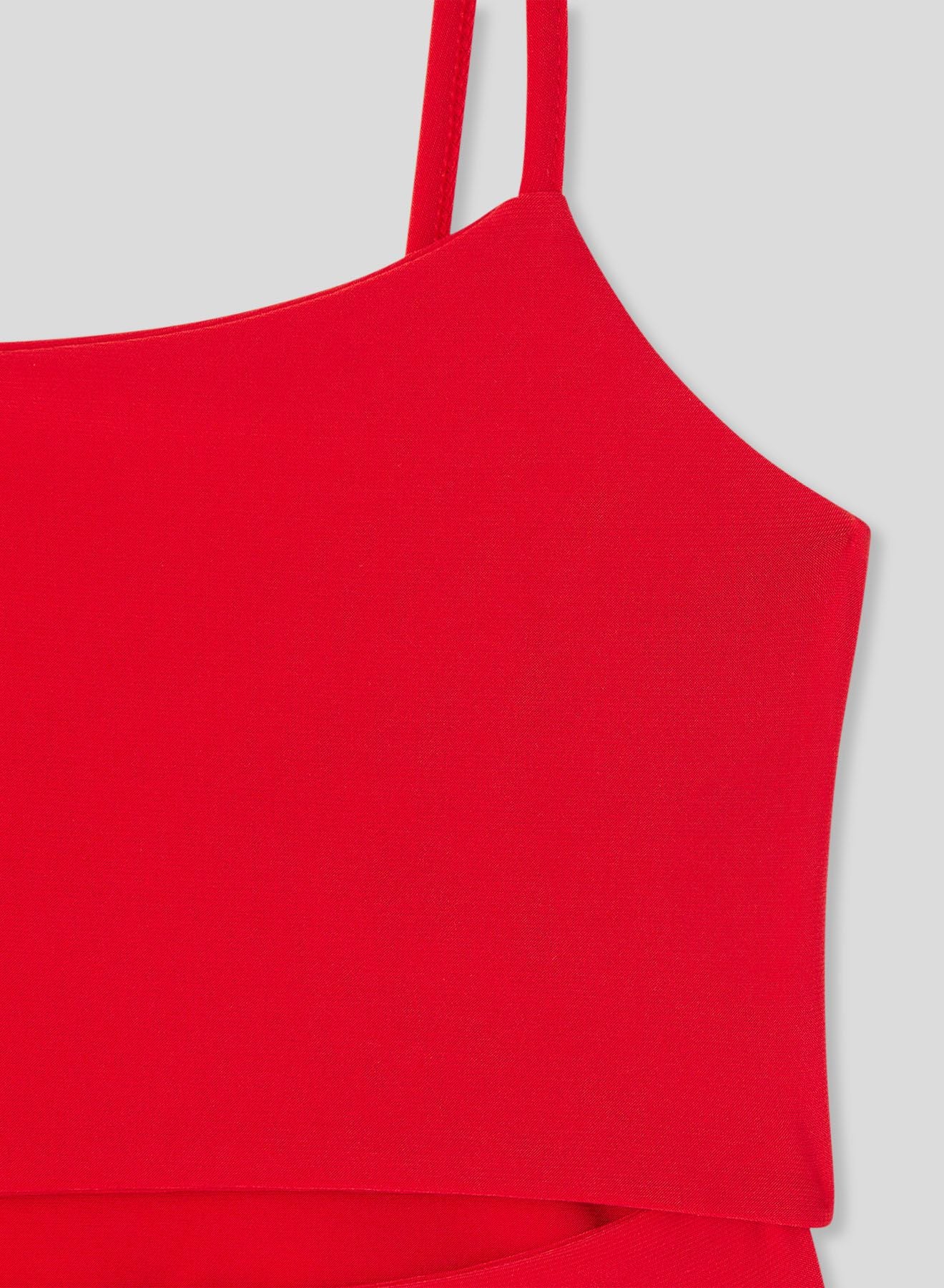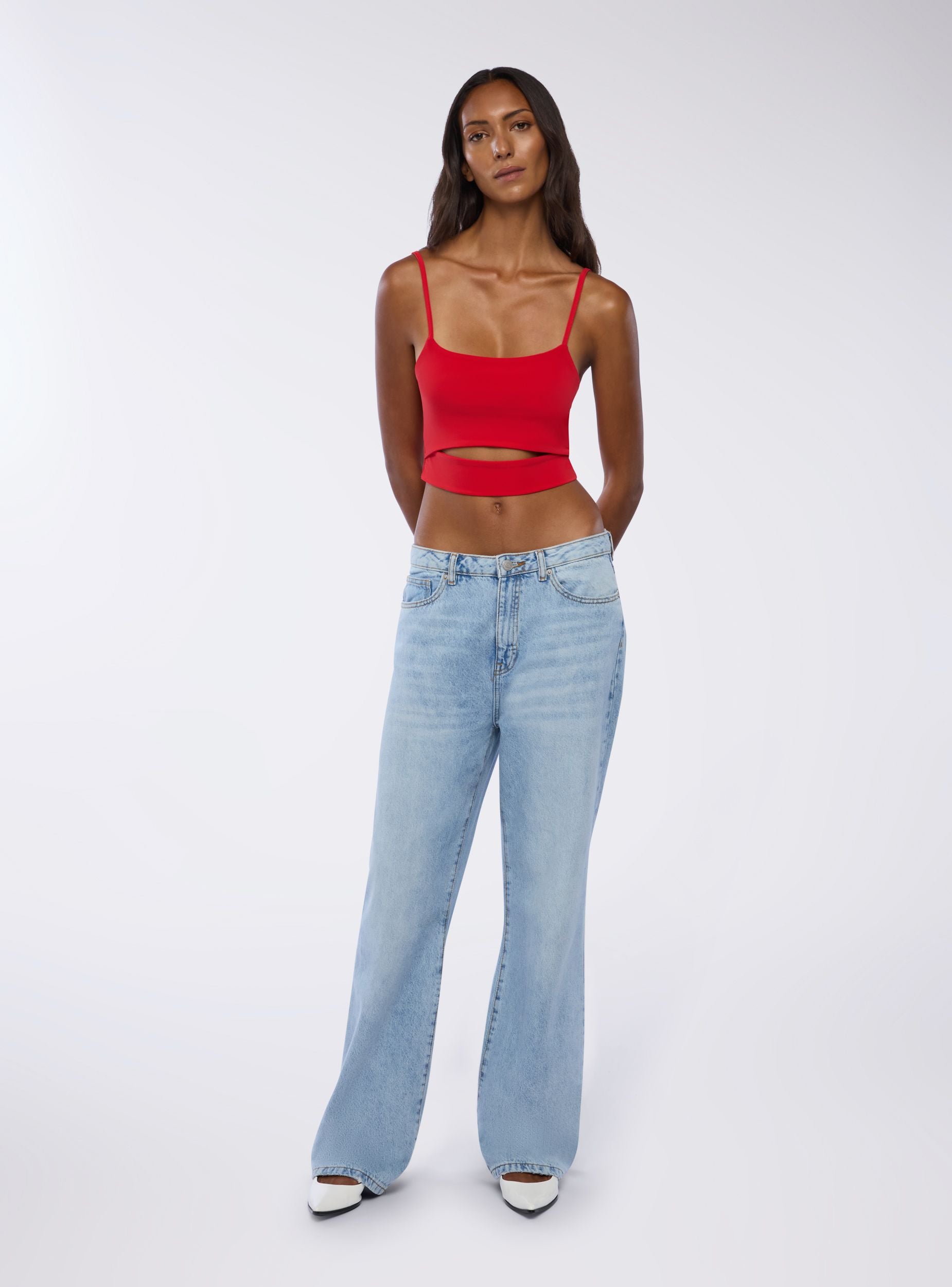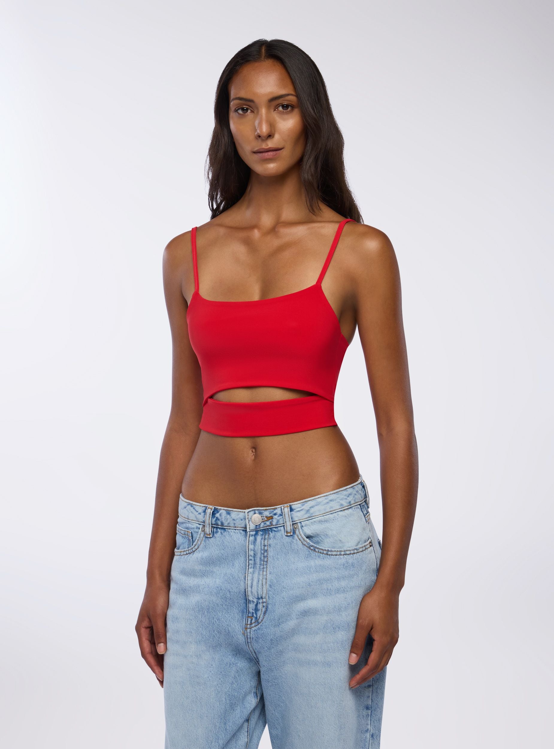 Top da donna con design moderno e dettagli cut-out. Ideale per outfit casual e trendy, si abbina perfettamente a jeans o pantaloni a vita alta. Le spalline sottili aggiungono un tocco di eleganza, mentre il taglio crop valorizza la silhouette. Perfetto per serate estive o occasioni informali.Dettagli