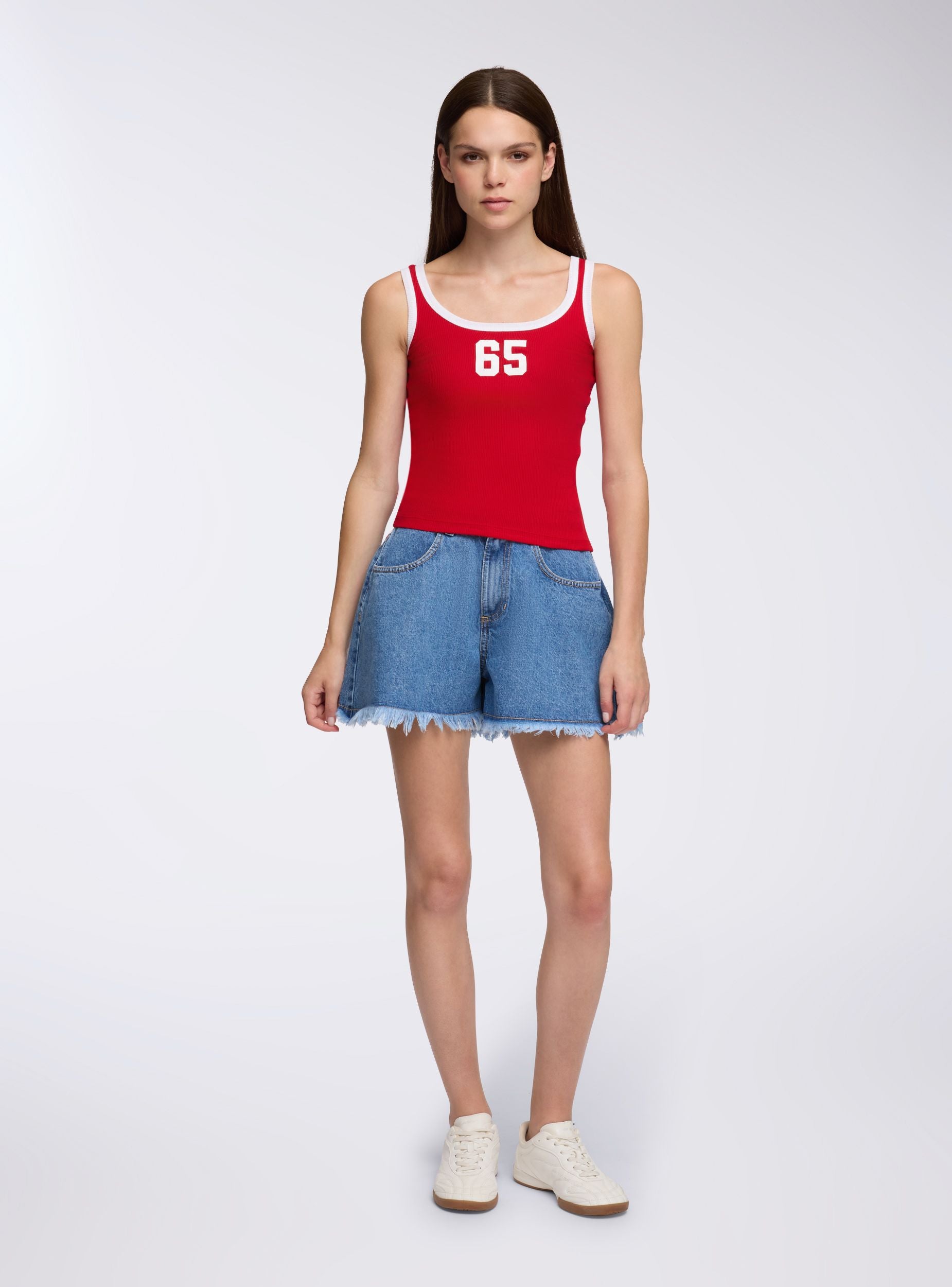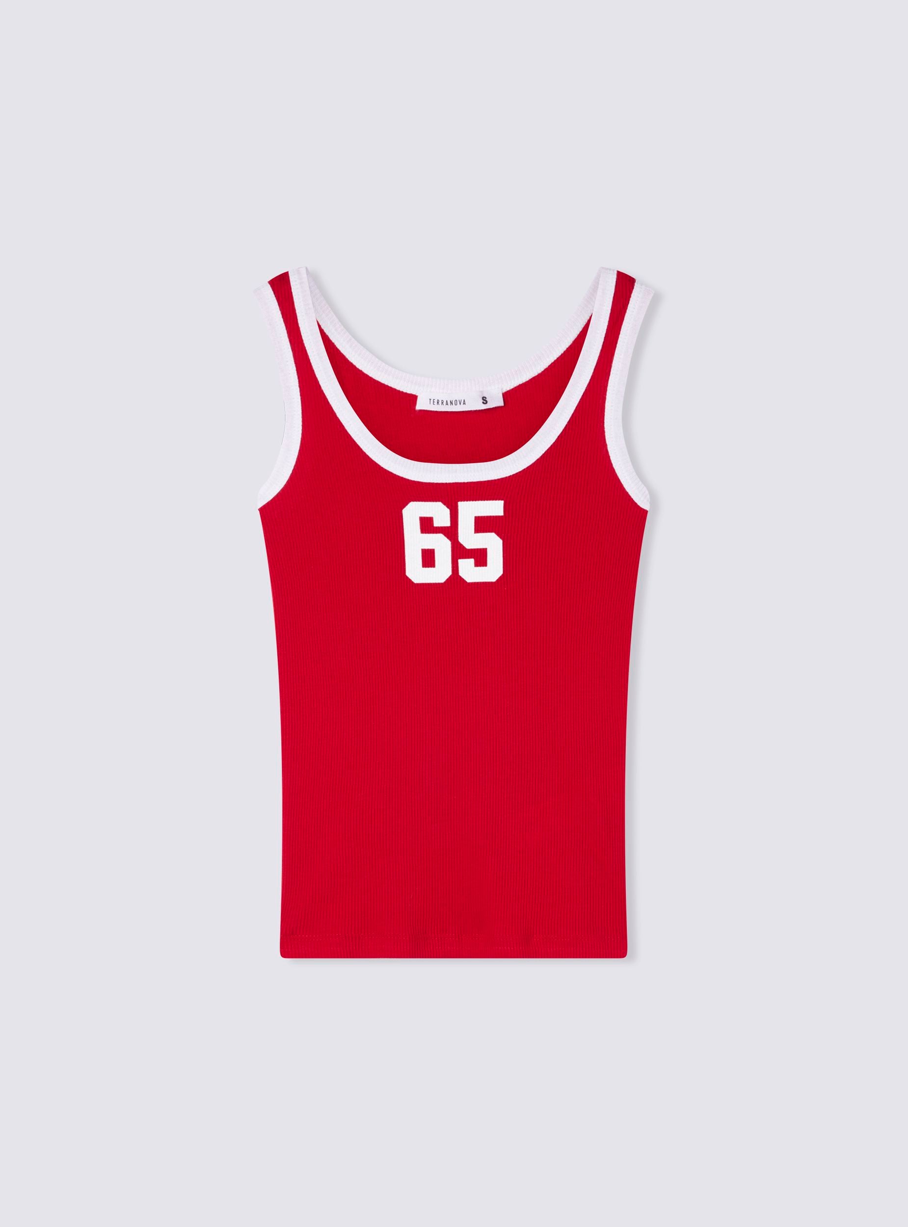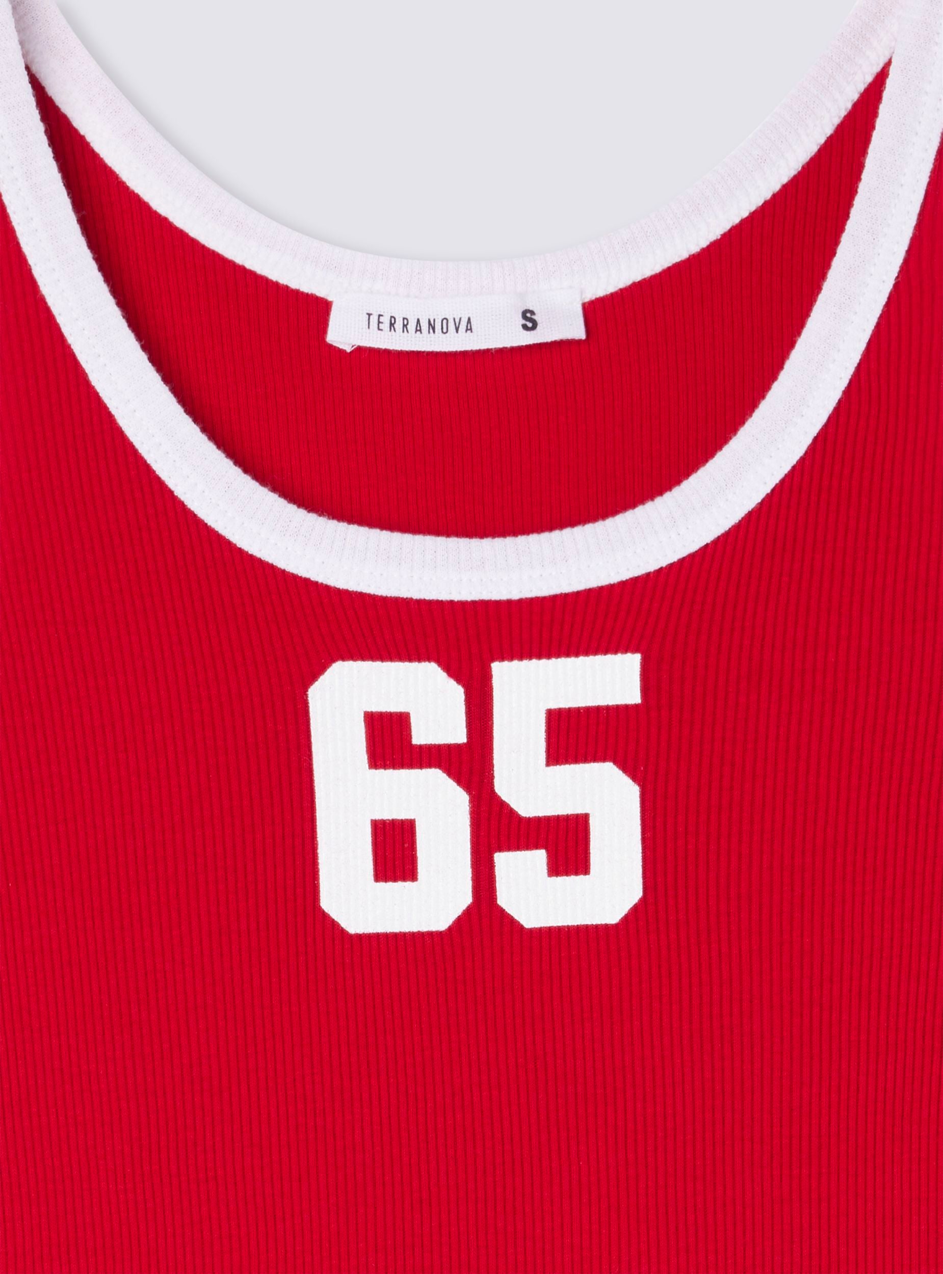 Canotta da donna con design sportivo e casual. Il tessuto a costine presenta una stampa con numero al centro e profili a contrasto, ideale per un look dinamico e informale. Perfetta da abbinare a jeans o pantaloncini per un outfit estivo. Le spalline larghe e lo scollo rotondo garantiscono comfort e libertà di movimento. Un capo versatile per il tempo libero e le giornate calde.Dettagli