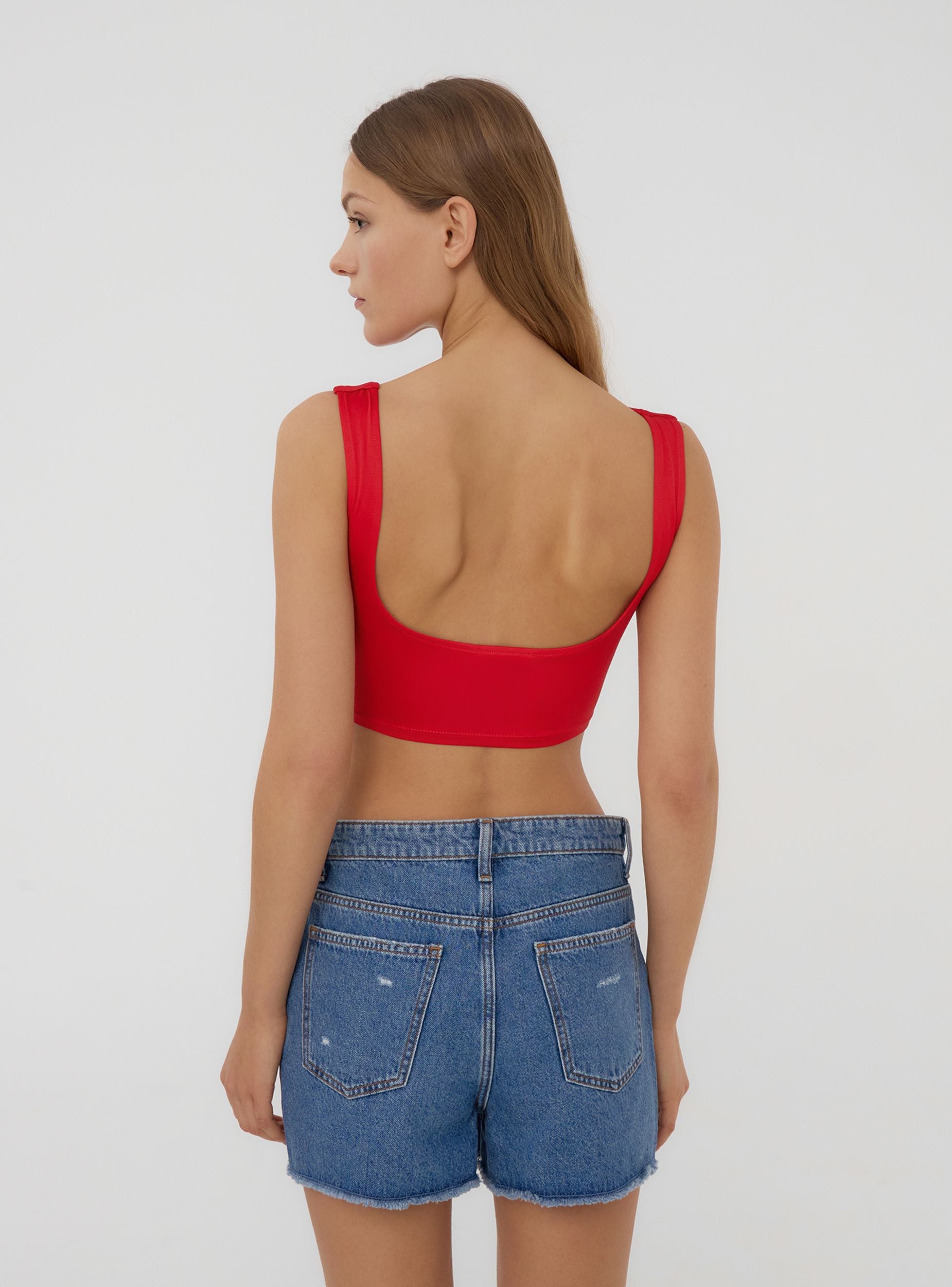 Top crop da donna. Il design presenta un'elegante tinta unita e il tessuto elasticizzato garantisce comfort. Il retro è caratterizzato da un ampio scollo che lascia la schiena scoperta, conferendo al capo un tocco sofisticato e moderno. Perfetto per completare look casual o abbinato a capi più ricercati per creare contrasti di stile.Dettagli