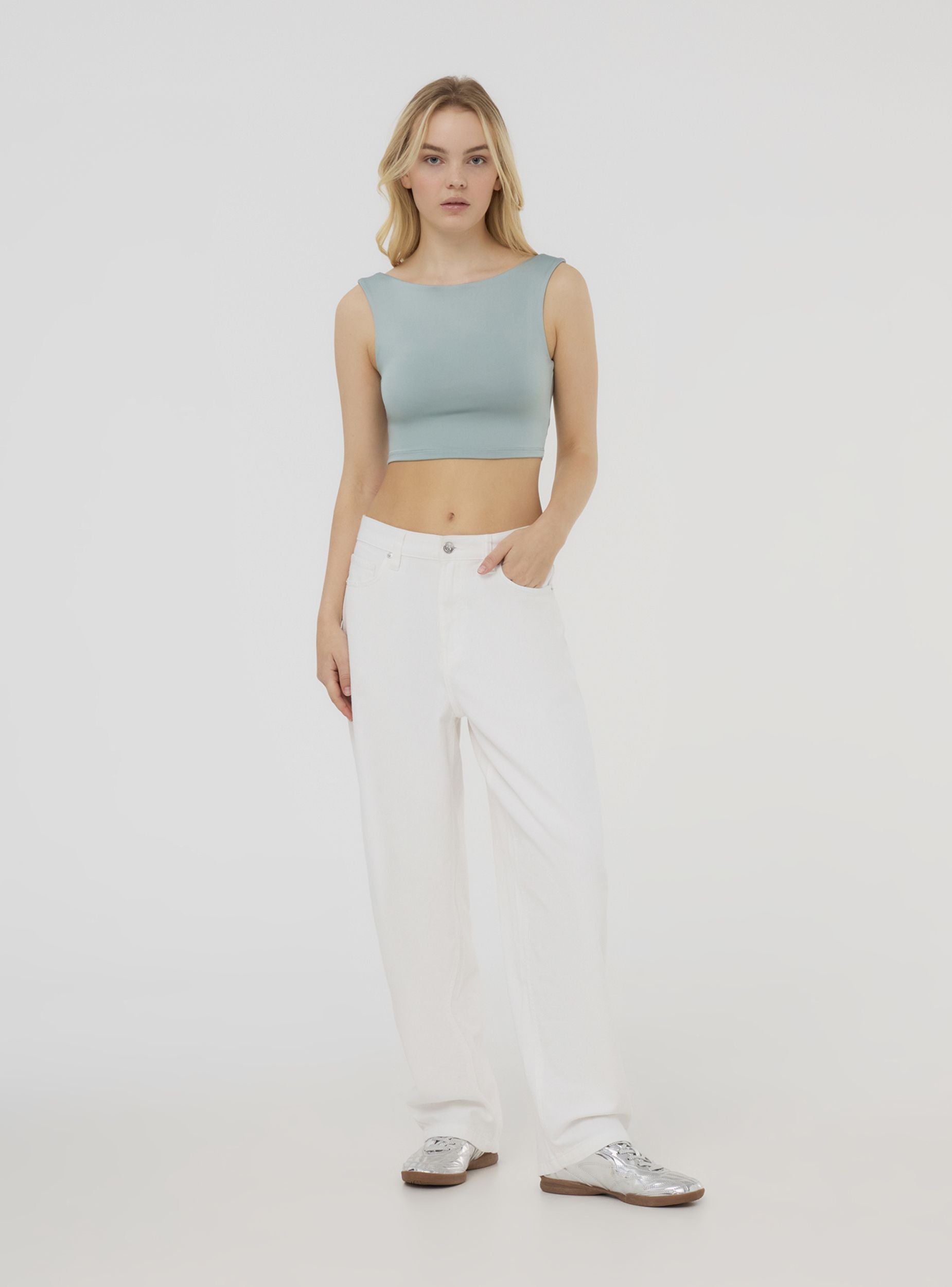 Top crop da donna. Il design presenta un'elegante tinta unita e il tessuto elasticizzato garantisce comfort. Il retro è caratterizzato da un ampio scollo che lascia la schiena scoperta, conferendo al capo un tocco sofisticato e moderno. Perfetto per completare look casual o abbinato a capi più ricercati per creare contrasti di stile.Dettagli