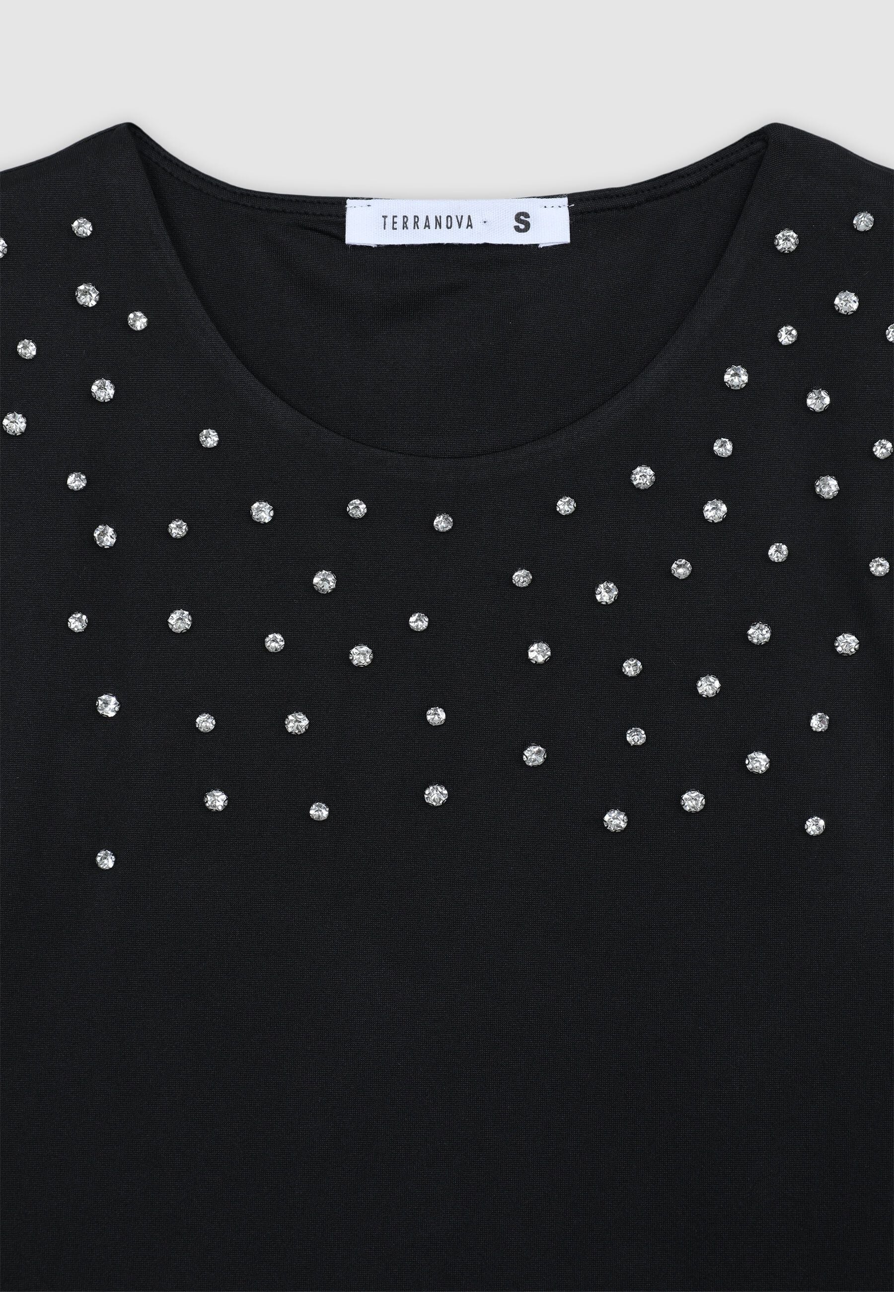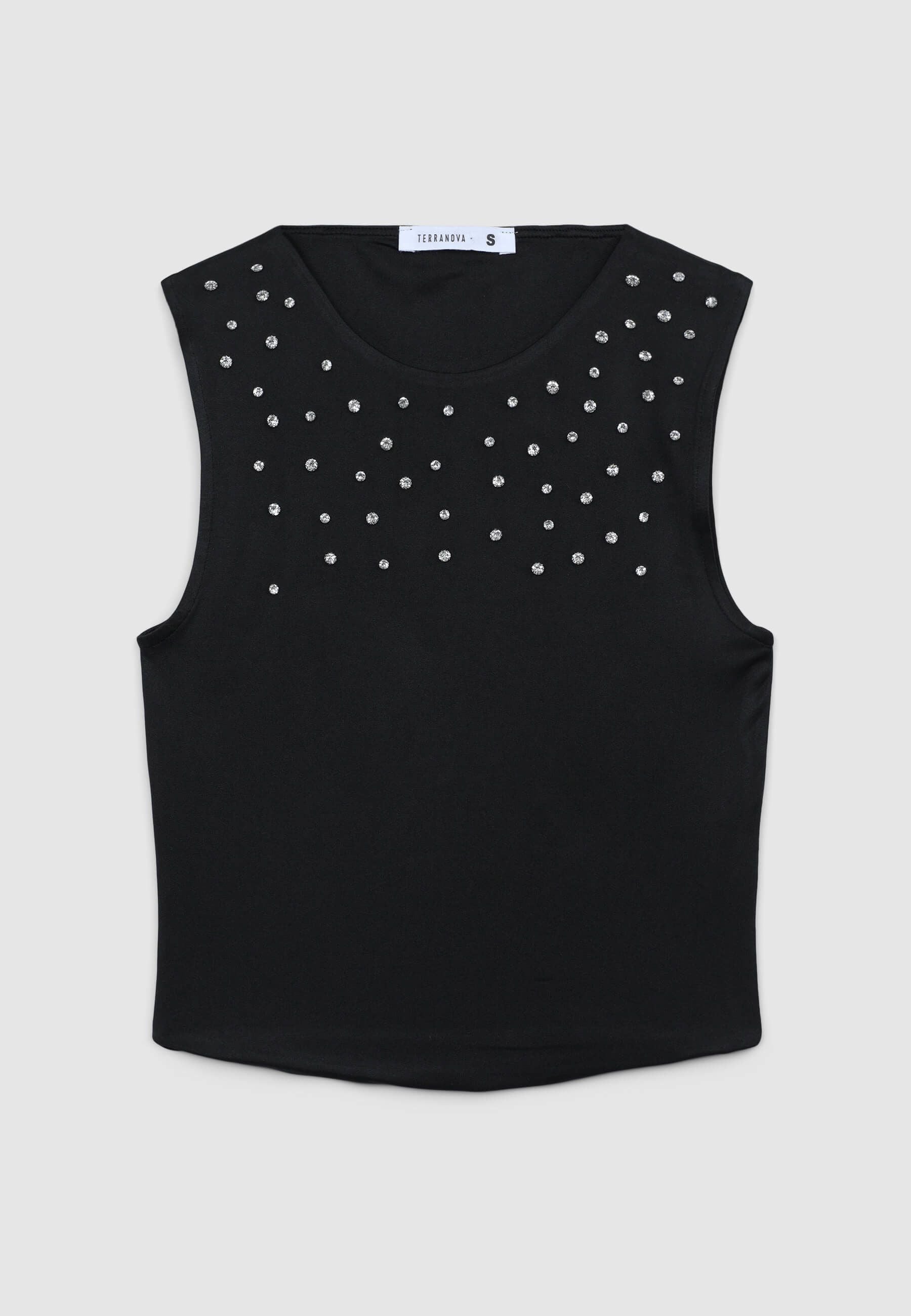 Top da donna crop con scollo americano, impreziosito da strass applicati che donano un tocco luminoso e raffinato. Il design tinta unita lo rende versatile, perfetto da abbinare a pantaloni a vita alta o gonne per un look elegante e contemporaneo. Ideale per serate speciali, aperitivi o eventi, aggiunge brillantezza all'outfit mantenendo un fascino moderno e sofisticato.Dettagli