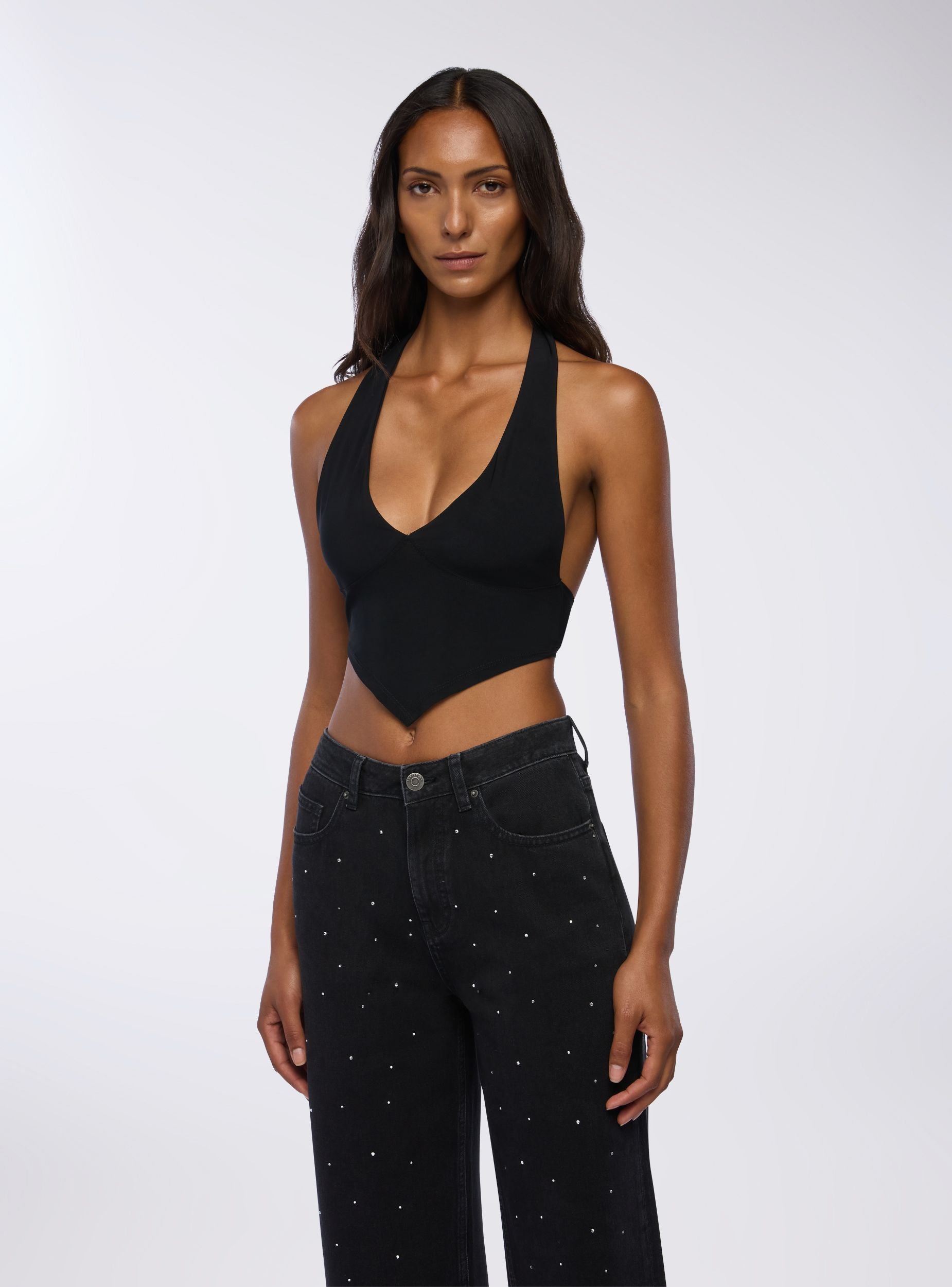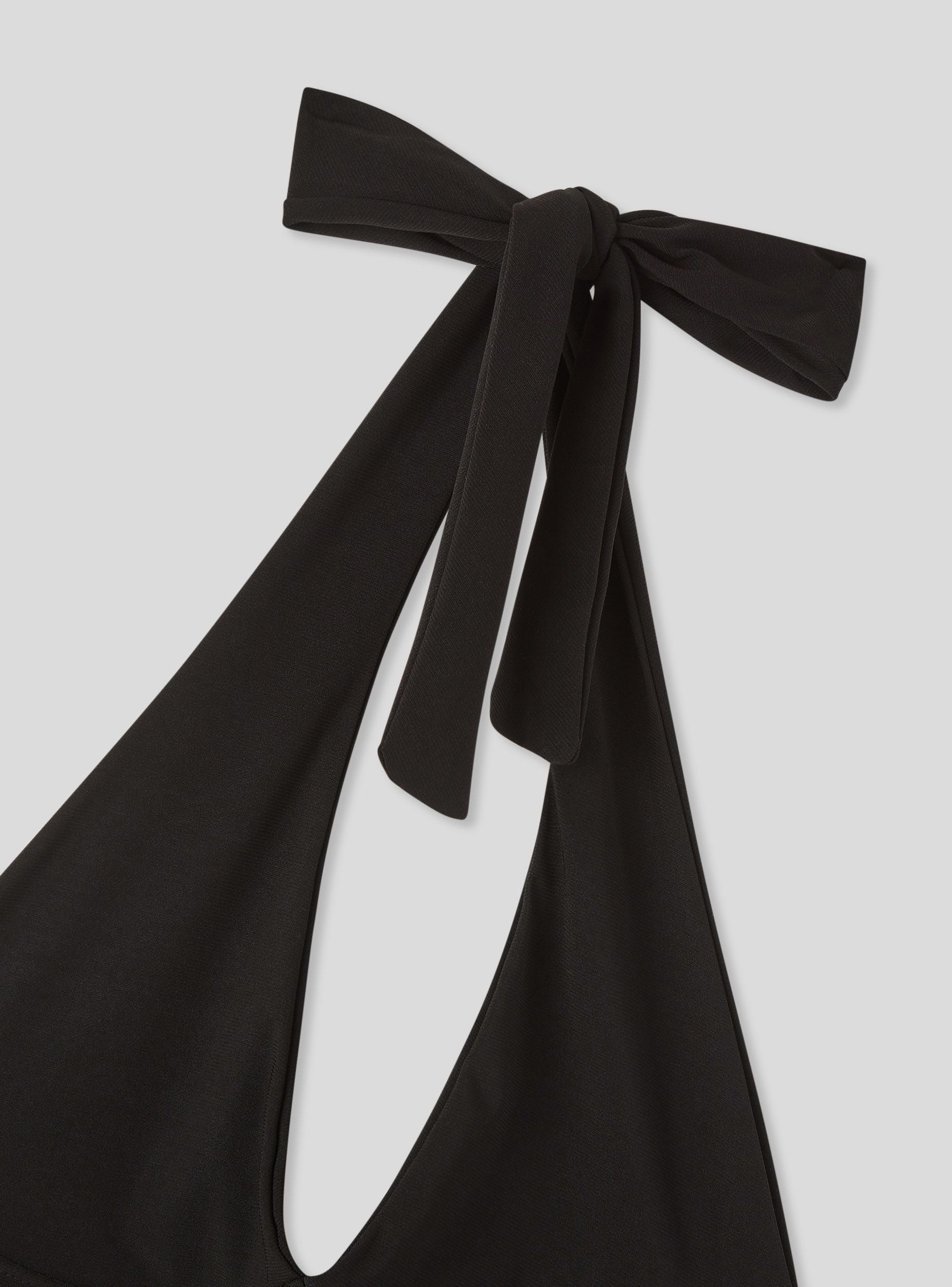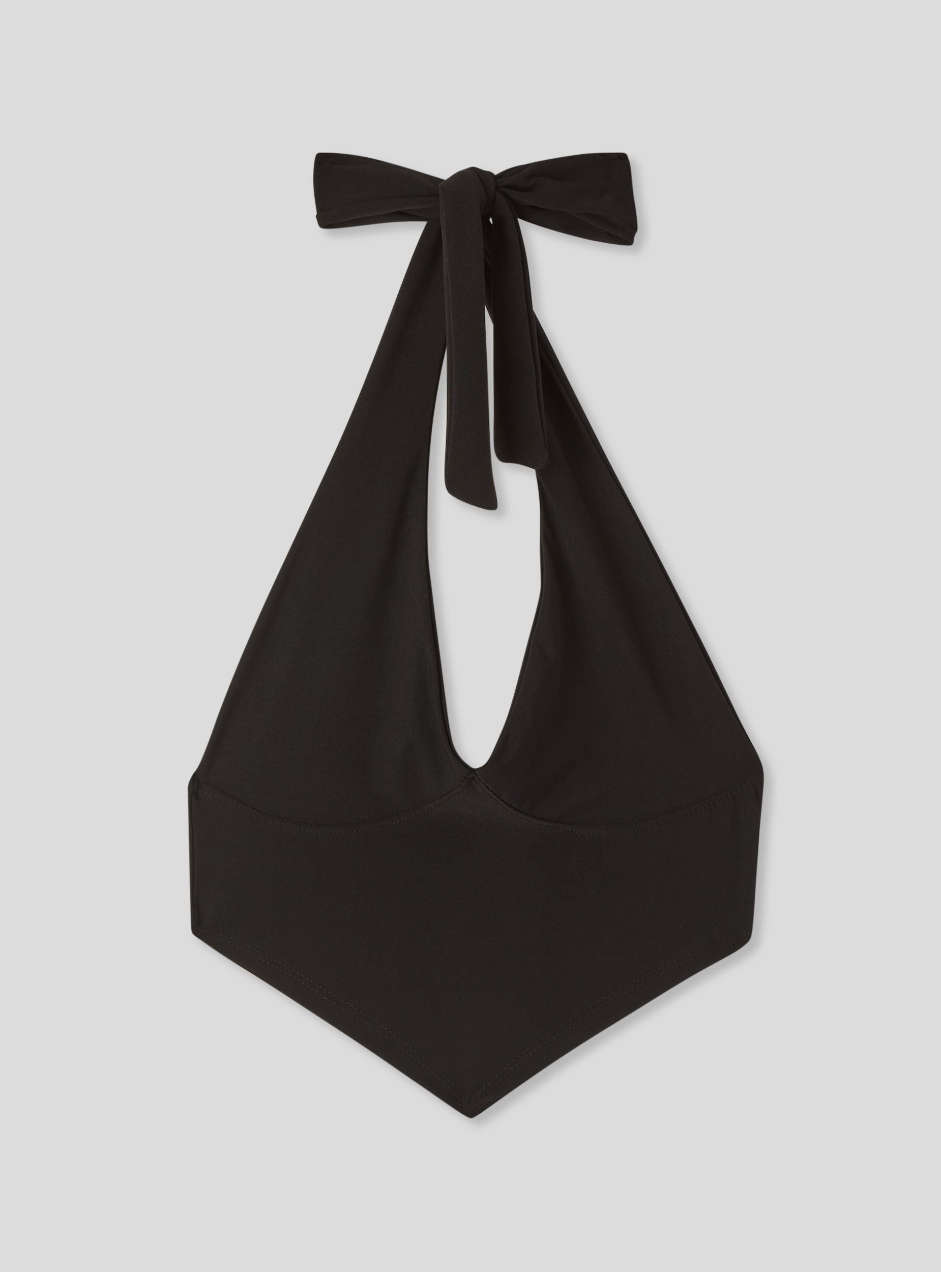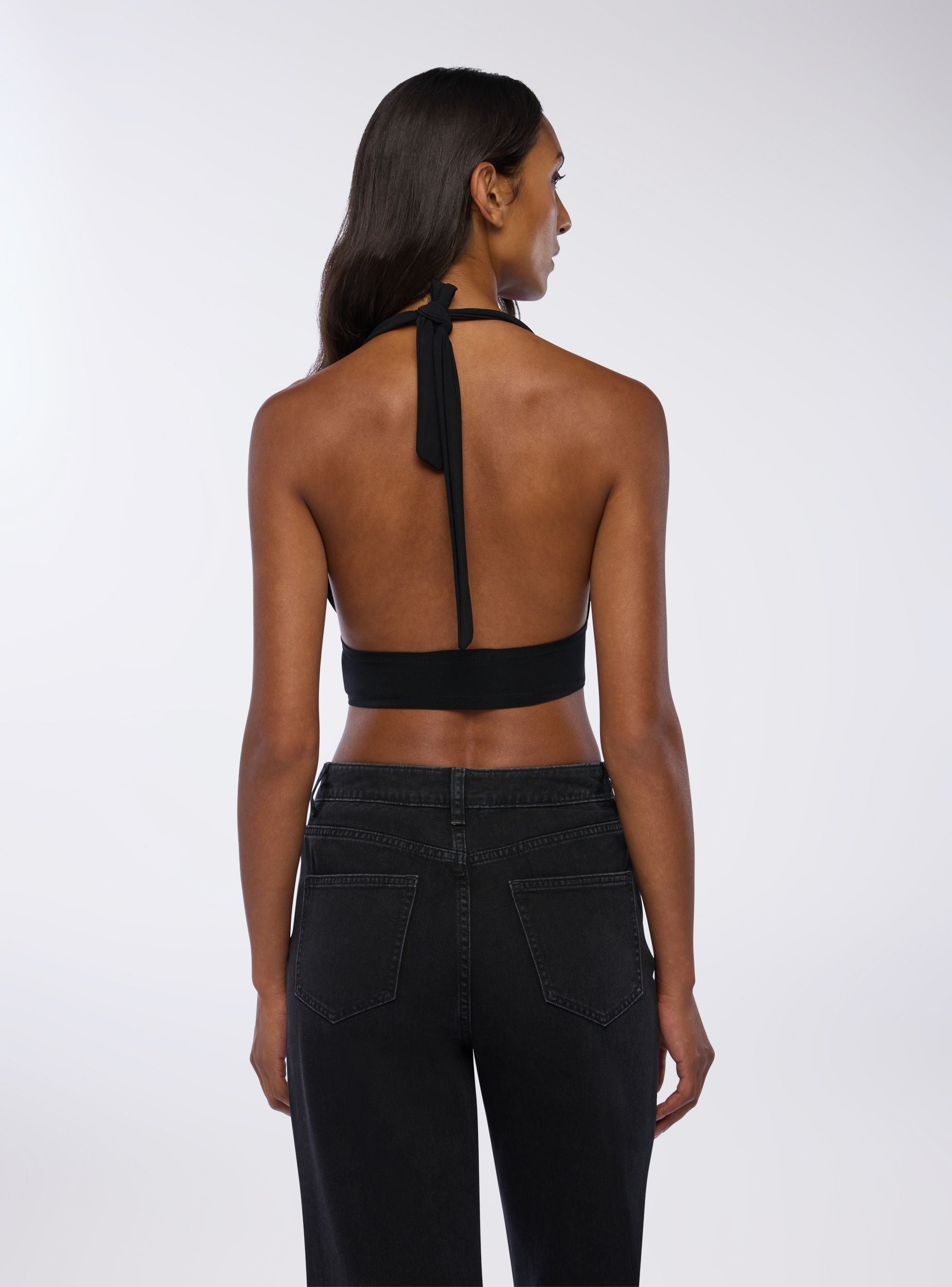 Top da donna con design halterneck, caratterizzato da un nodo regolabile sul retro per una vestibilità personalizzata. Ideale per look estivi e casual, si abbina perfettamente a pantaloni o gonne a vita alta. La sua linea semplice e pulita lo rende versatile per diverse occasioni, dal tempo libero alle giornate in spiaggia.Dettagli