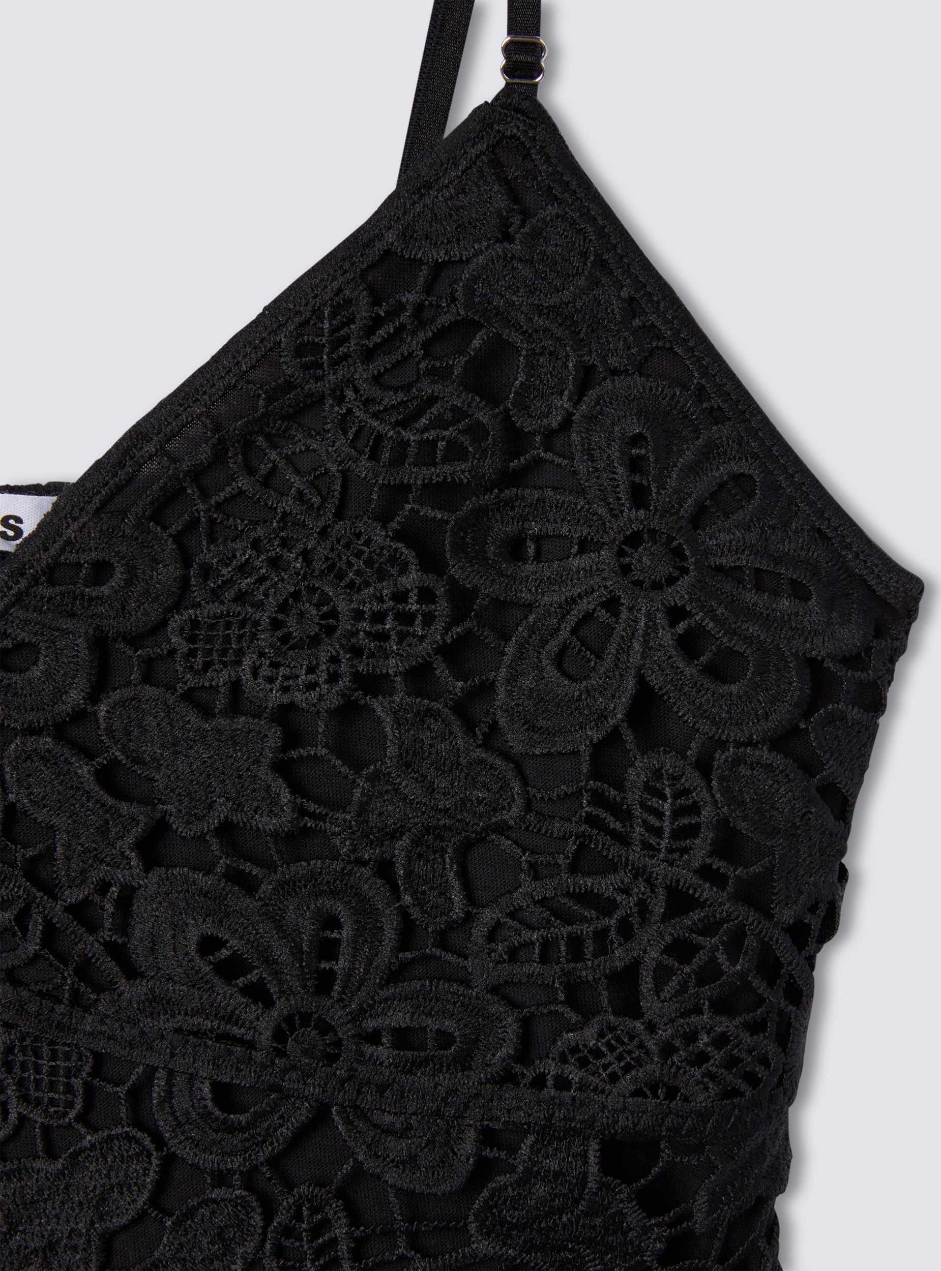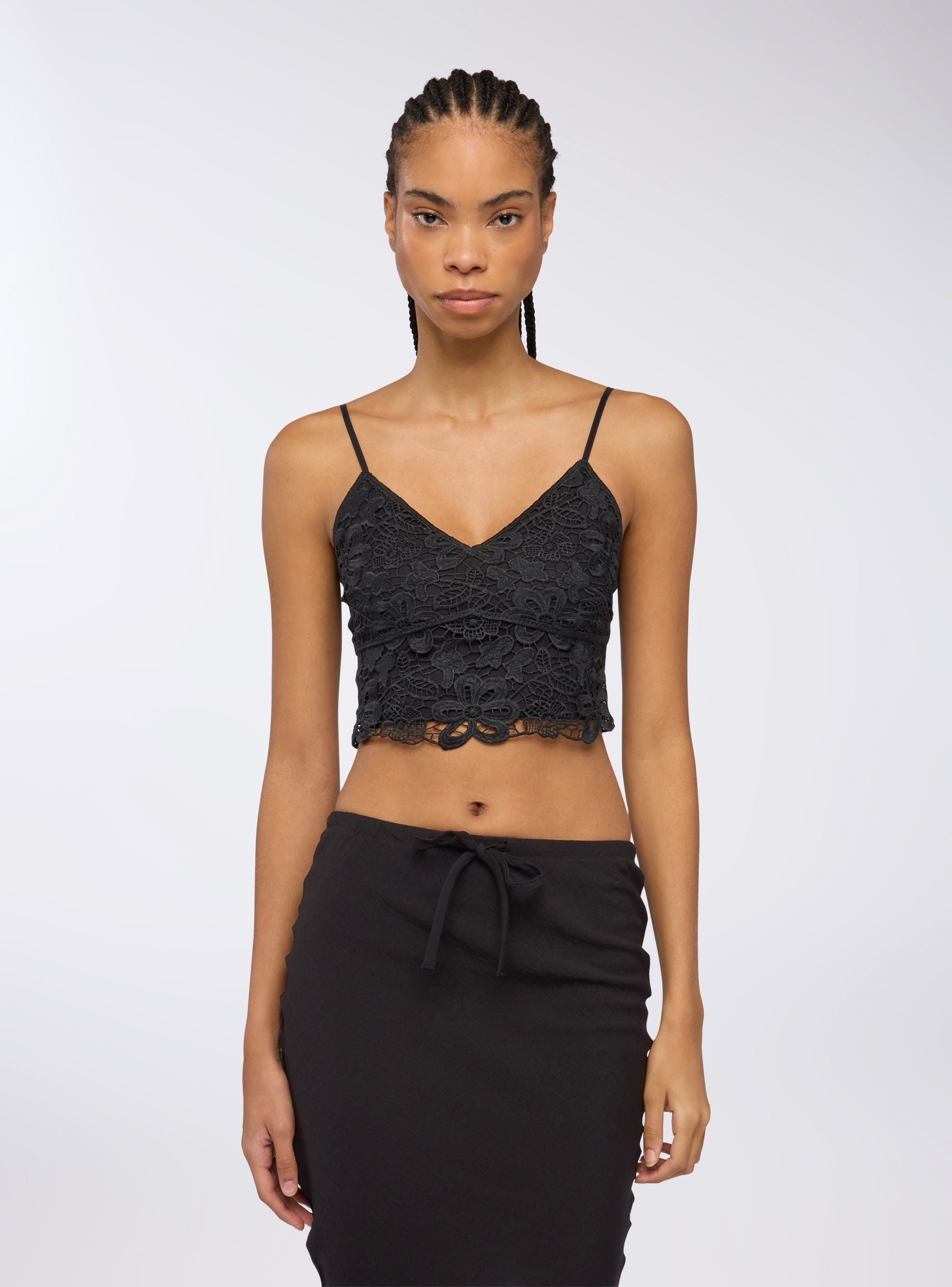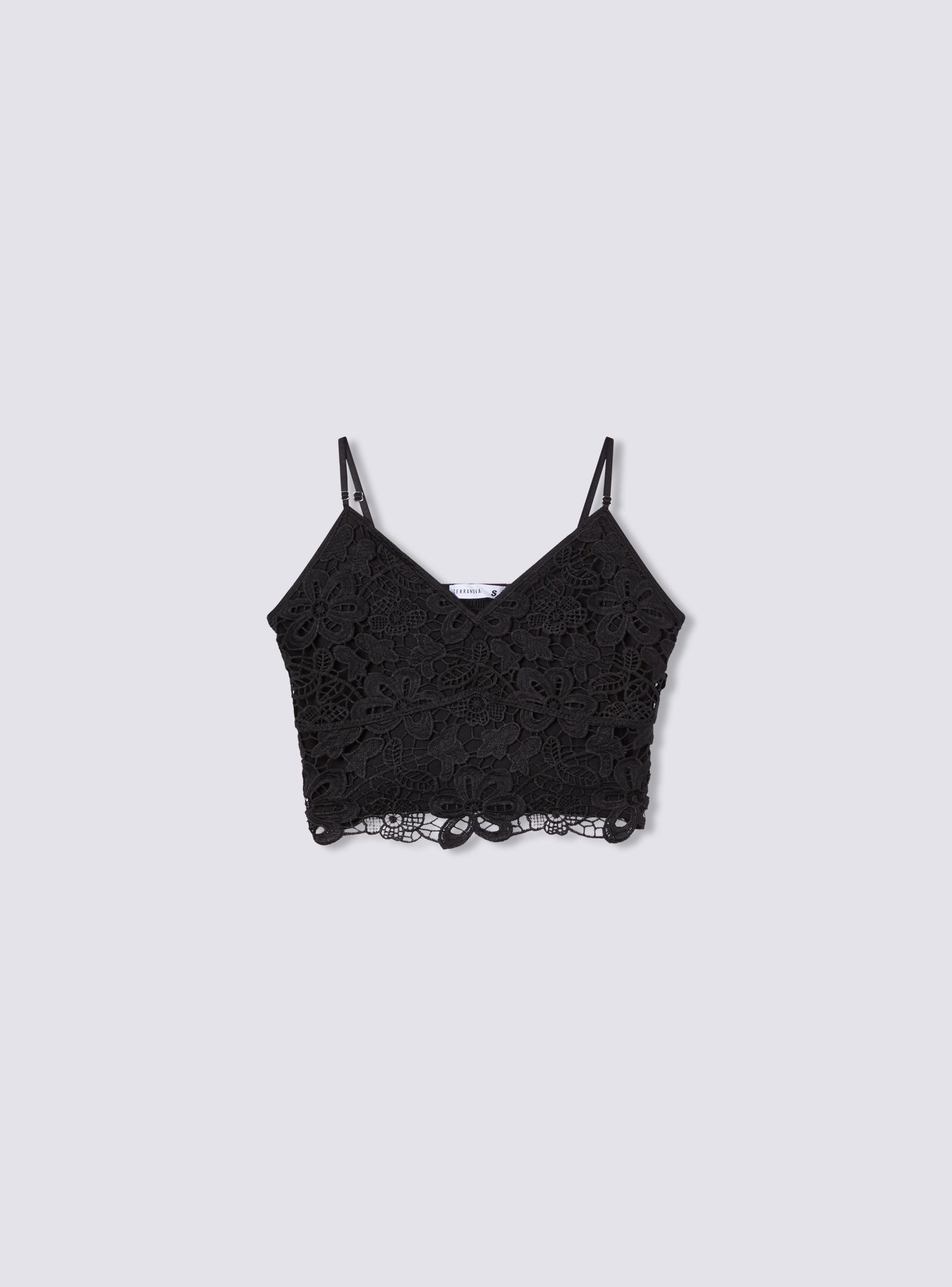 Top crop da donna dallo stile romantico, caratterizzato da un raffinato pizzo effetto macramè che aggiunge un tocco elegante. Lo scollo a V valorizza la silhouette, mentre le spalline regolabili assicurano una vestibilità perfetta. Il punto smock sul retro garantisce comfort e adattabilità. Perfetto da abbinare a gonne o jeans a vita alta per un look estivo e femminile, ideale per occasioni speciali o serate all’aperto.Dettagli