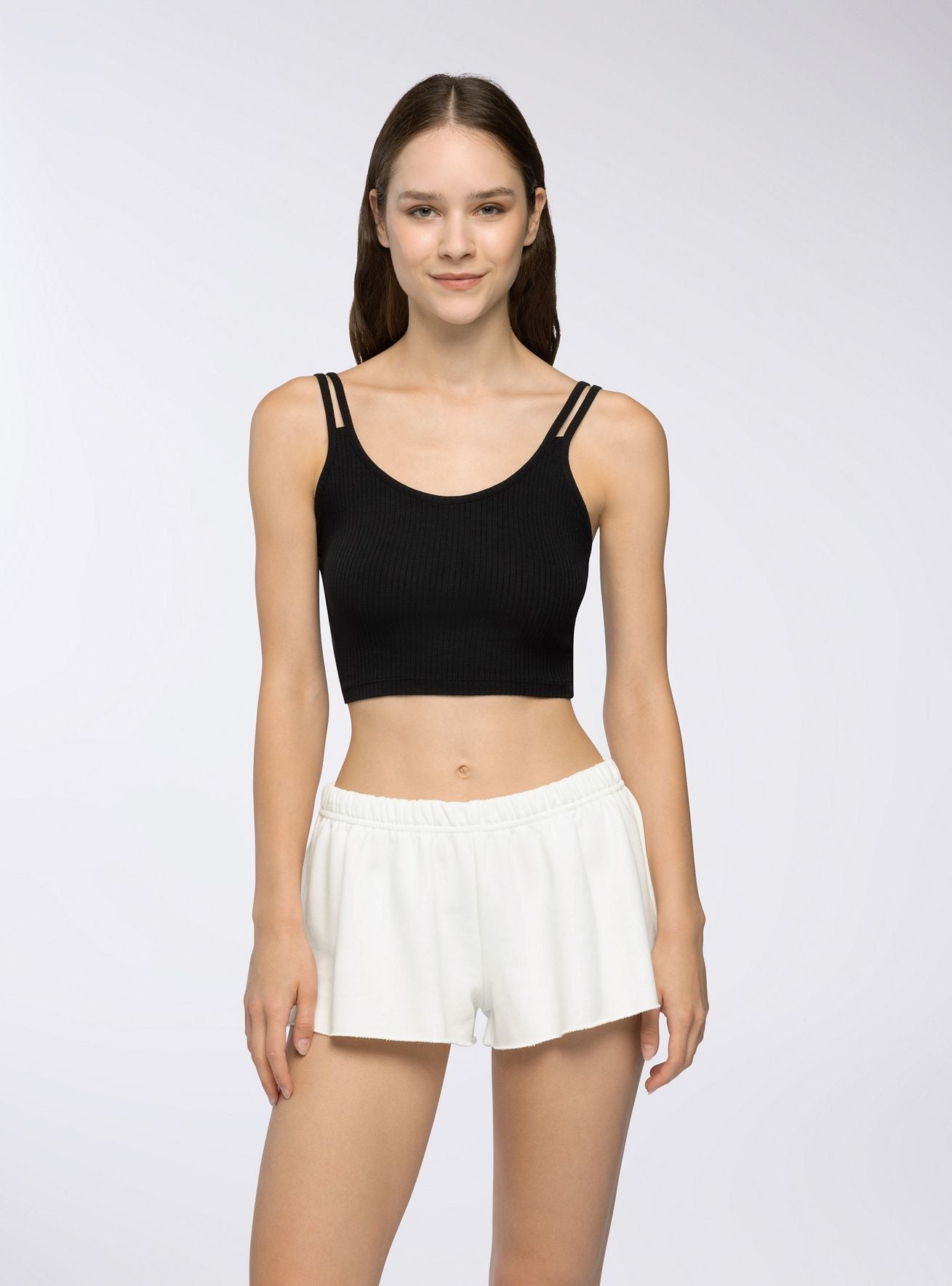 Top da donna con design crop e incrocio sul retro. Ideale per un look moderno e alla moda, perfetto da abbinare a jeans o pantaloni a vita alta per un outfit casual o elegante. Le doppie spalline sottili aggiungono un tocco di femminilità, mentre il taglio aderente valorizza la silhouette. Un capo versatile per diverse occasioni, dal tempo libero alle serate con amici.Dettagli
