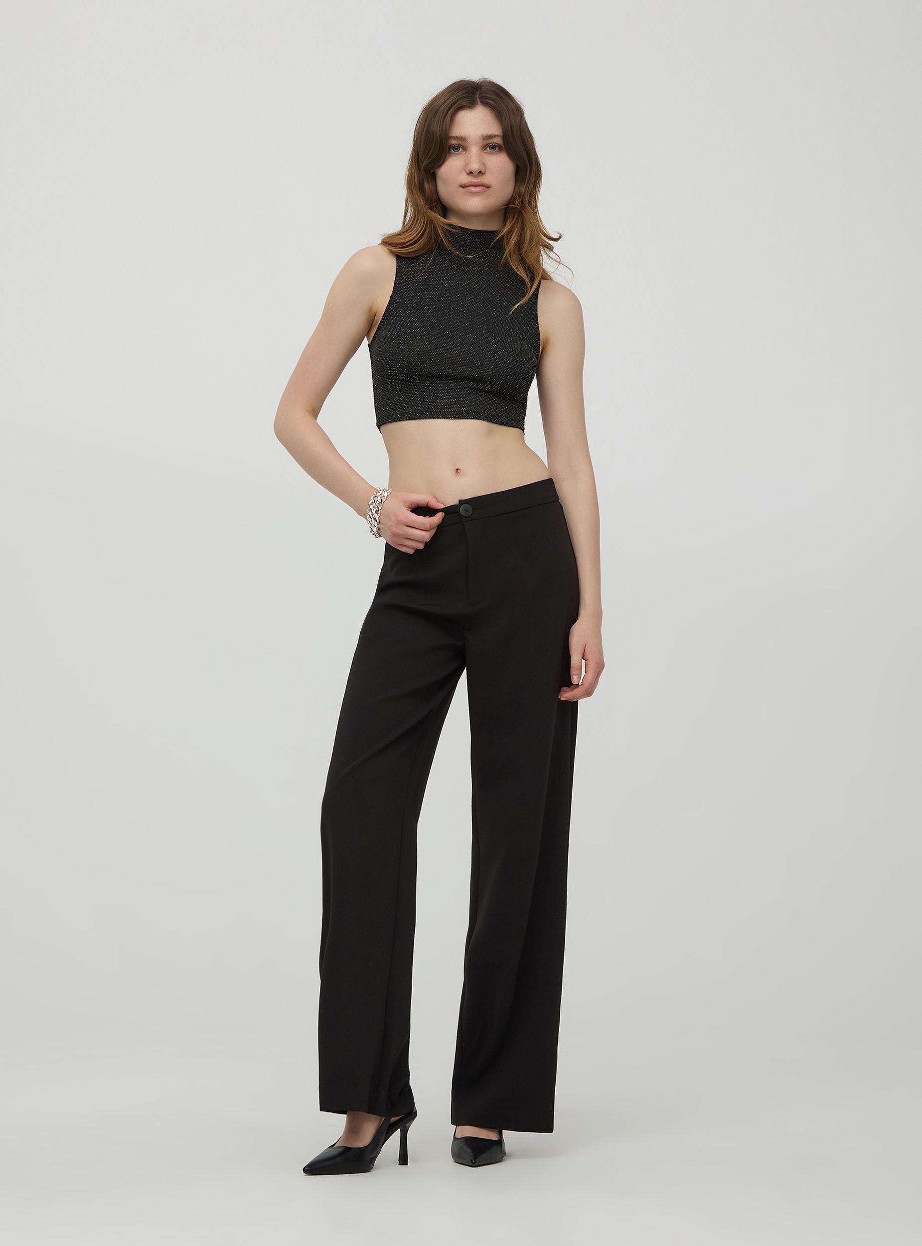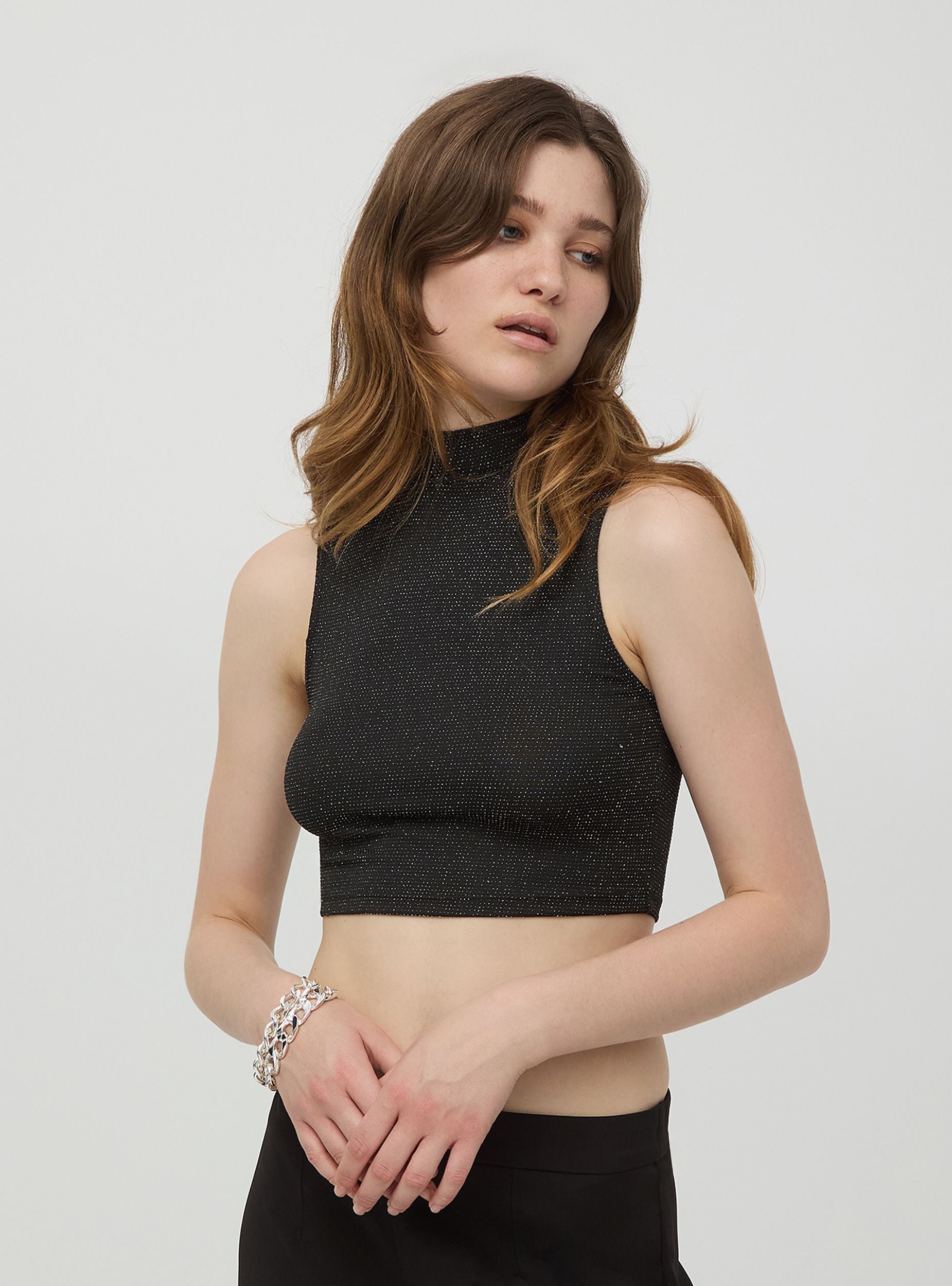 Top crop luccicante da donna senza maniche con collo alto. La lunghezza crop conferisce un aspetto trendy e moderno al look. Il tessuto luccicante aggiunge un tocco di lucentezza e glamour, rendendolo perfetto per occasioni speciali o serate fuori. Il design aderente mette in risalto la silhouette. Questo topèideale da abbinare a pantaloni a vita alta o gonne per un look chic e sofisticato.Dettagli