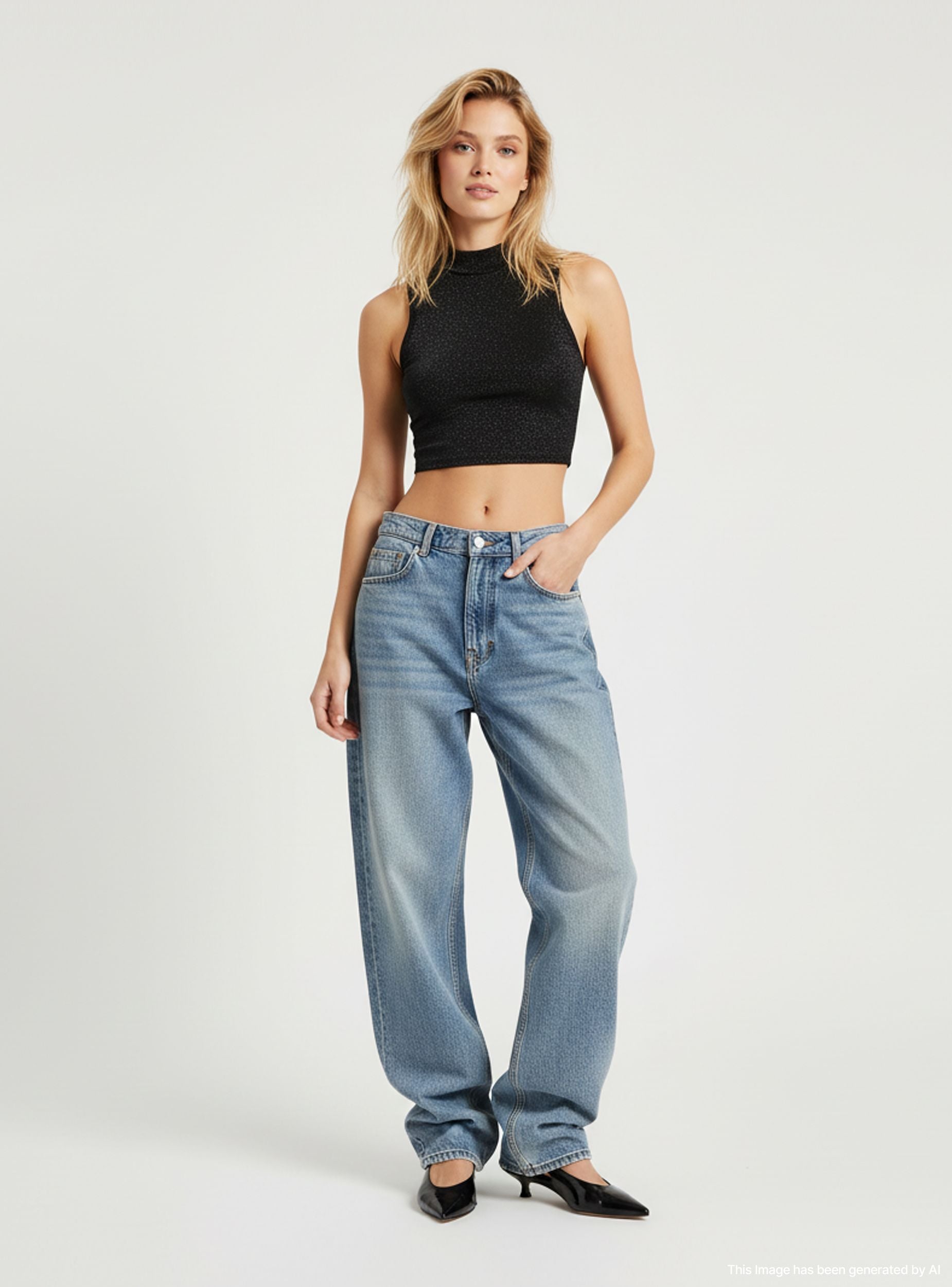 Canotta da donna con collo alto e senza maniche, caratterizzata da una vestibilità crop che esalta la silhouette. Il design minimalista e l'effetto luccicante la rendono ideale per outfit moderni e sofisticati. Perfetta per essere abbinata a pantaloni a vita alta o gonne, si adatta a diverse occasioni, dal casual al formale, offrendo versatilità e stile.Dettagli