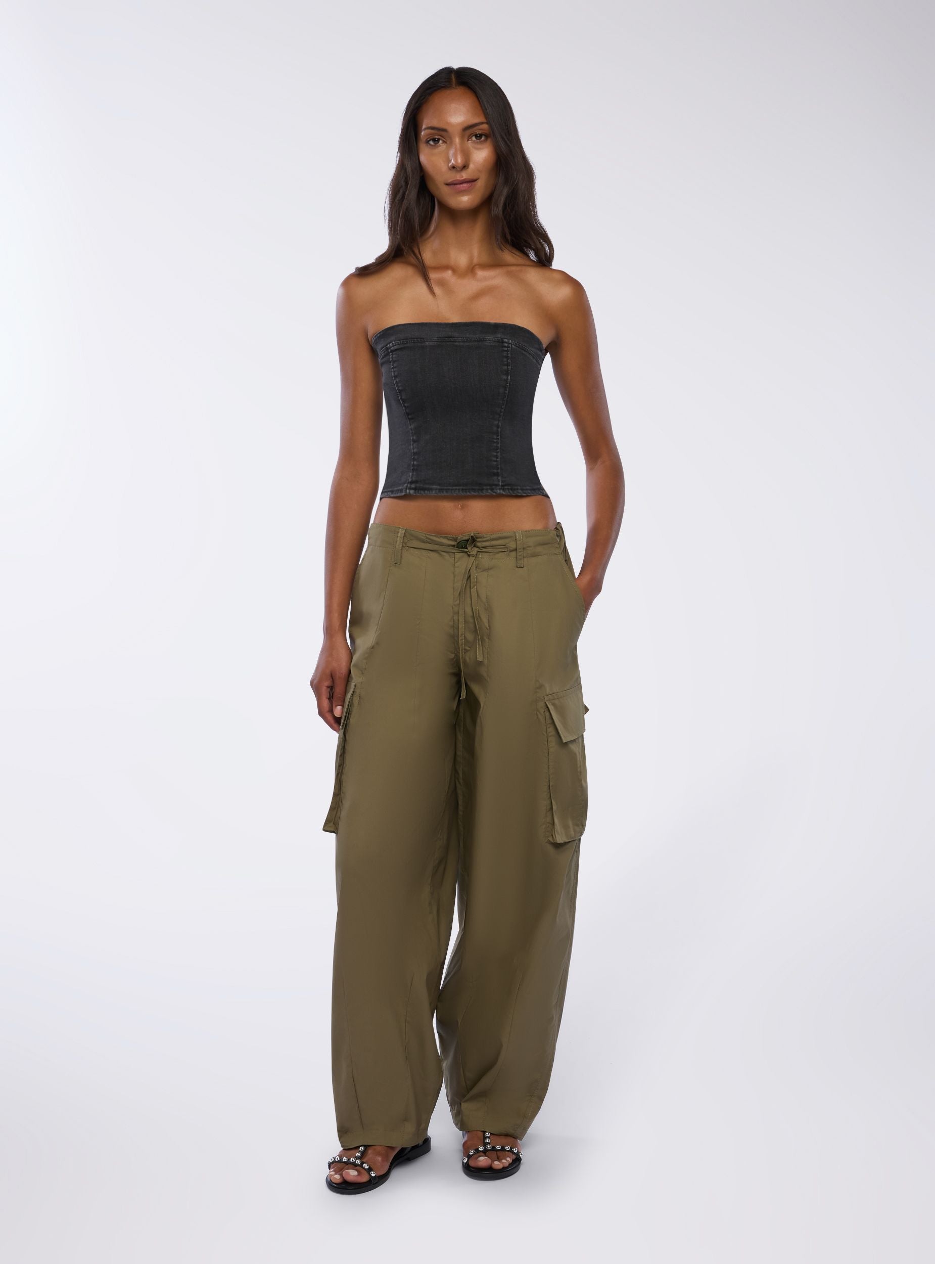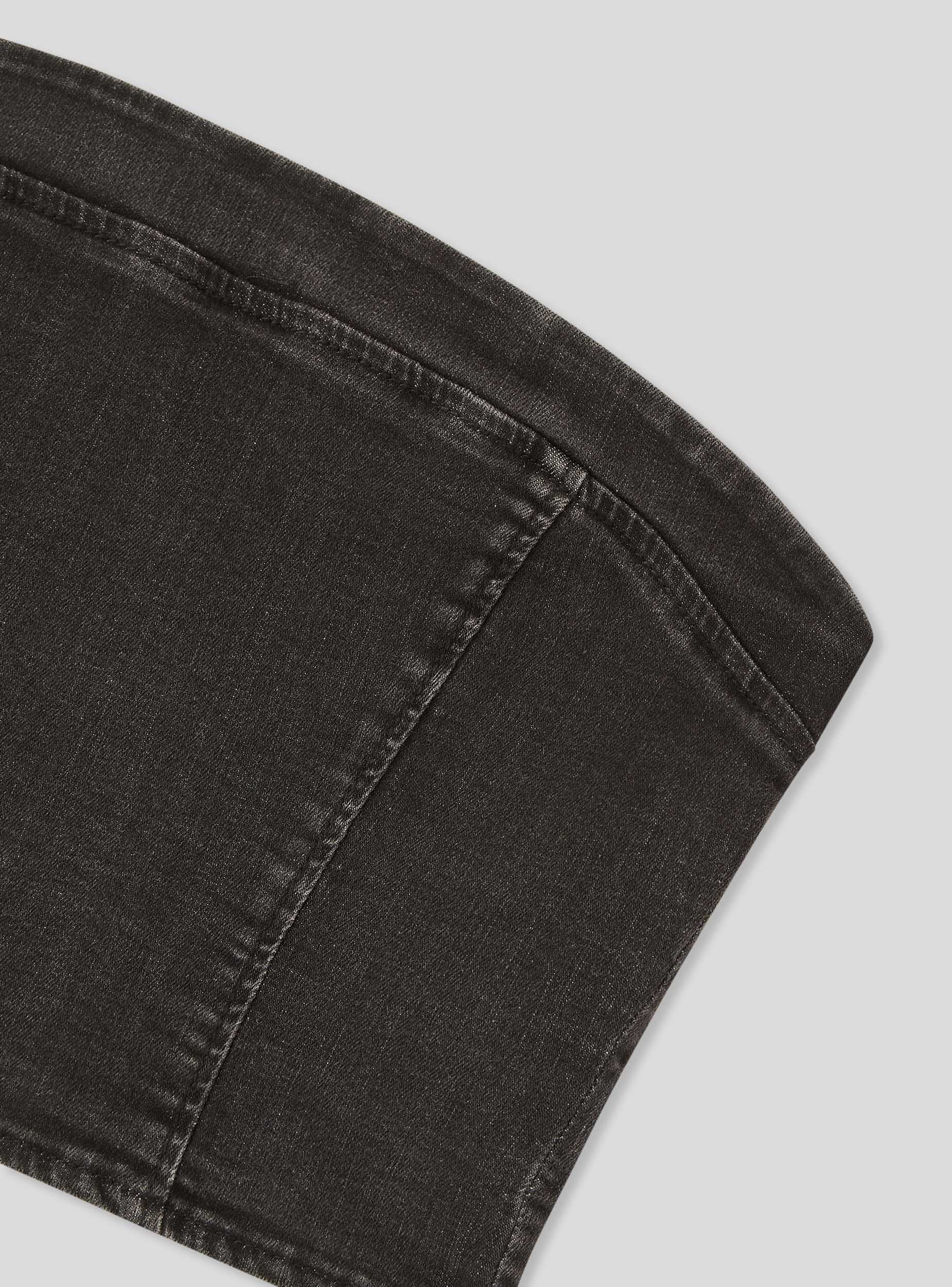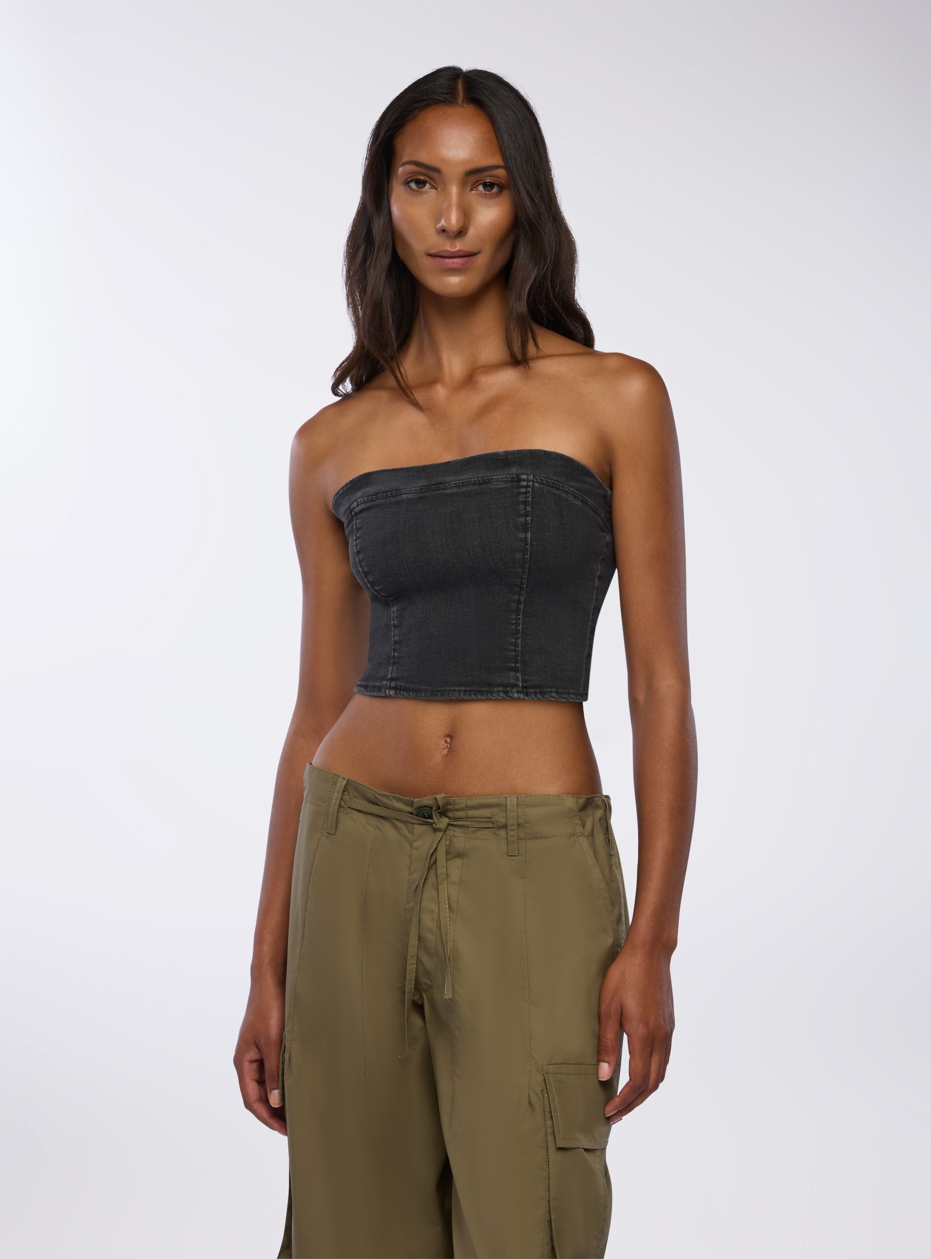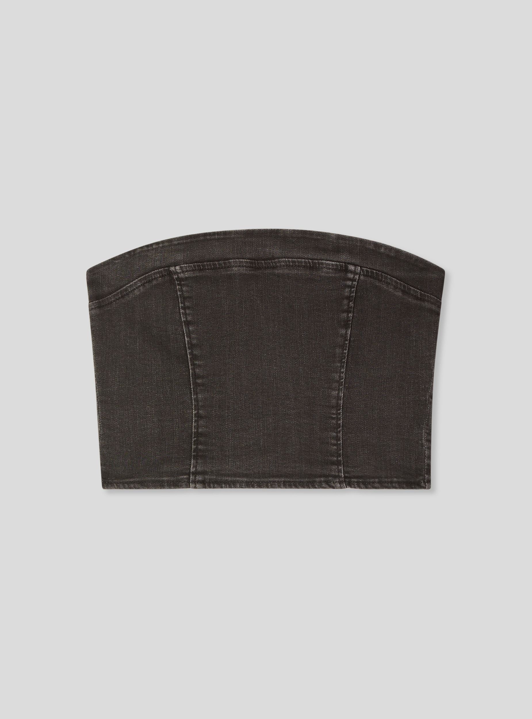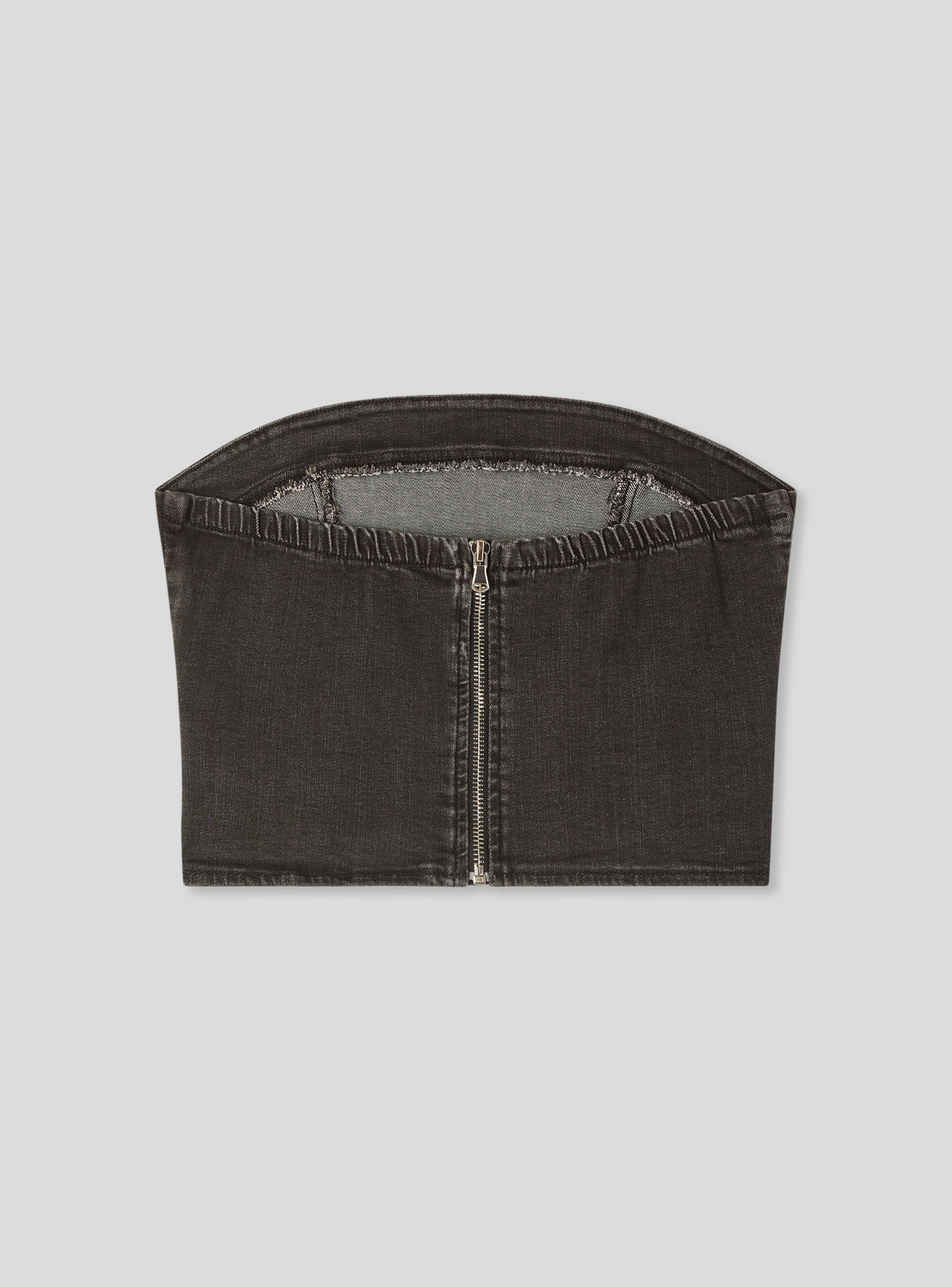 Top da donna in denim con design a fascia, ideale per un look moderno e alla moda. Presenta una chiusura con zip sul retro per una vestibilità pratica e sicura. Perfetto per essere abbinato a pantaloni a vita alta o gonne per un outfit casual o elegante. La sua linea aderente valorizza la silhouette, rendendolo un capo versatile per diverse occasioni.Dettagli