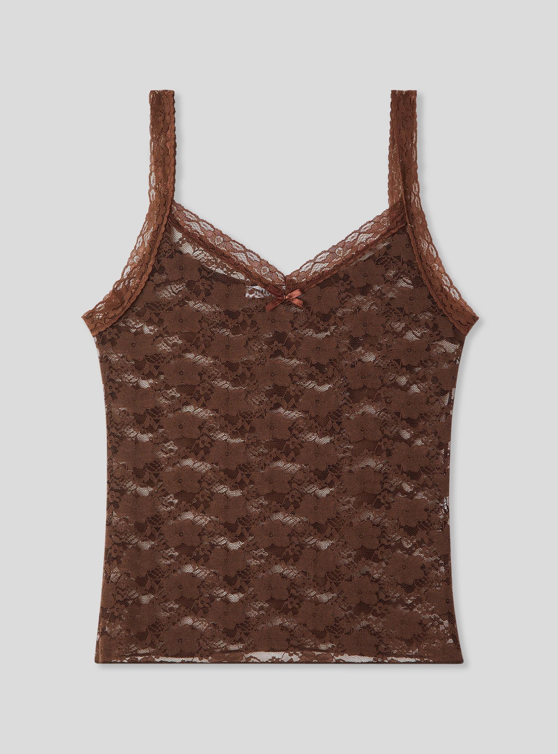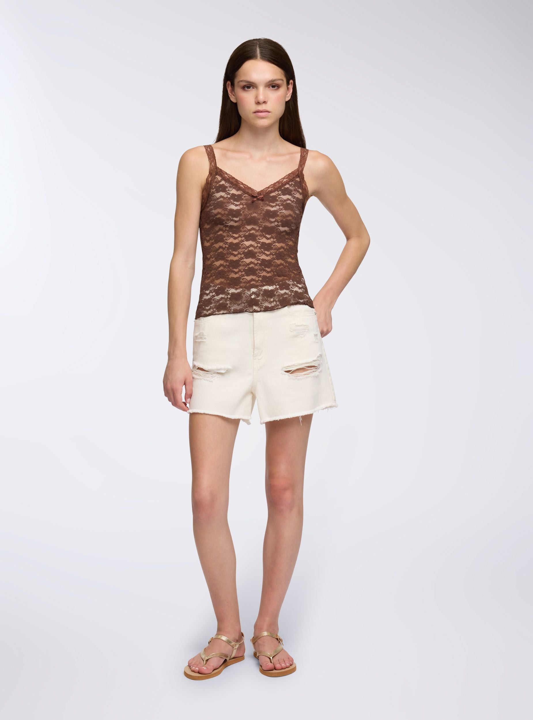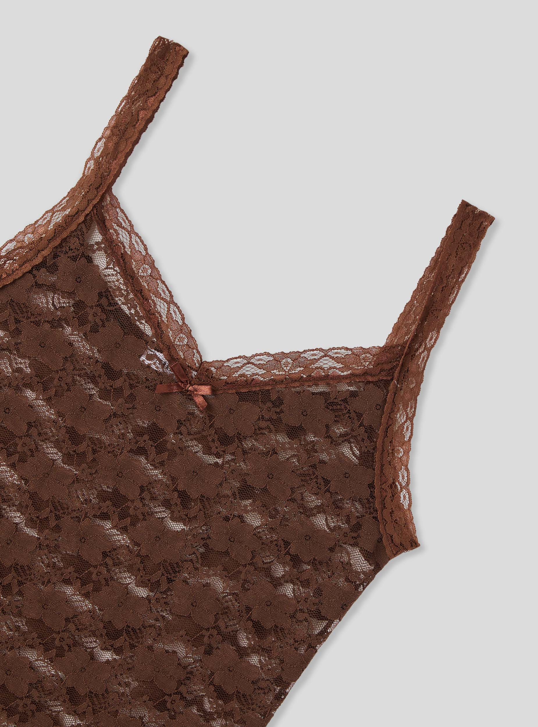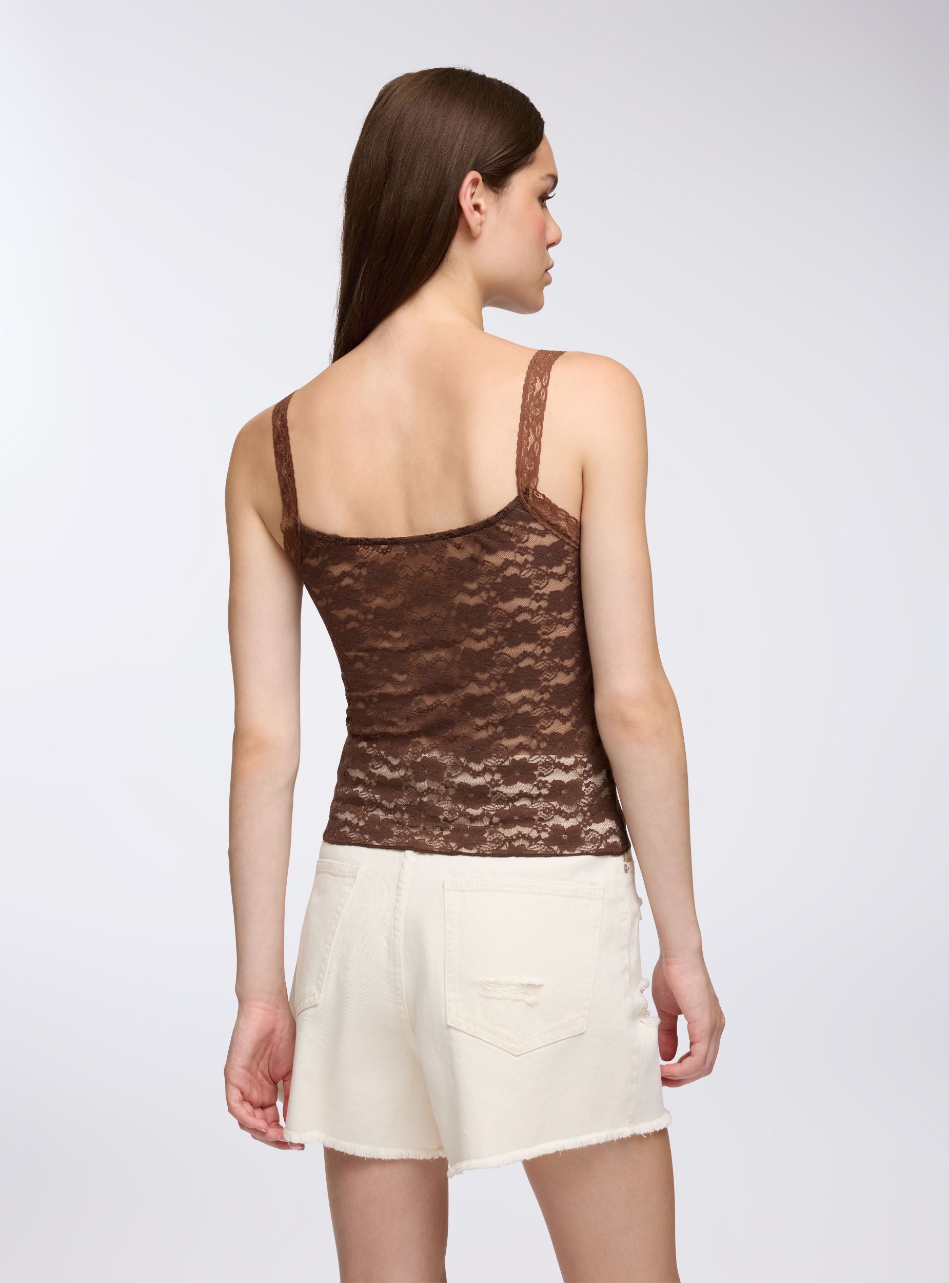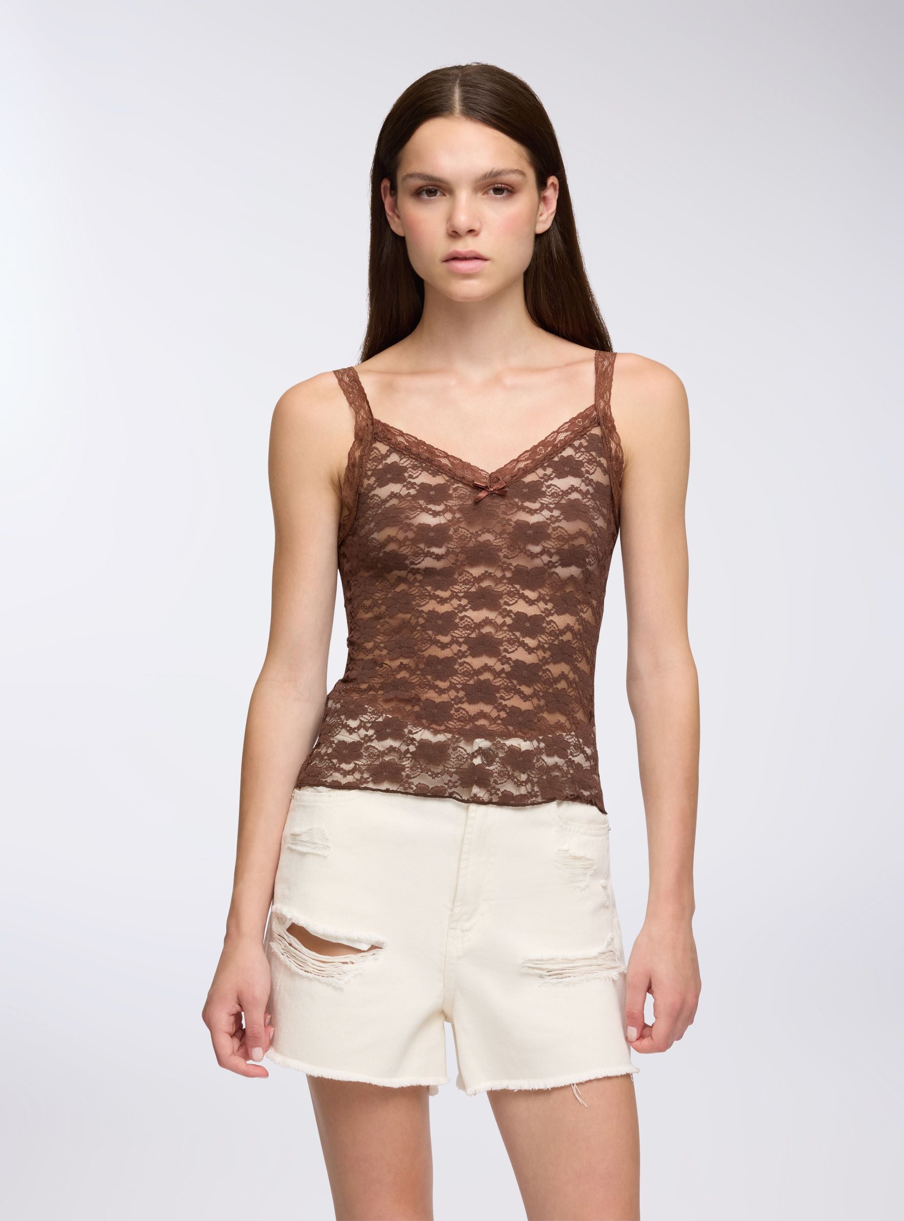 Top da donna con spalline sottili. Realizzato in pizzo con motivo floreale, offre un design raffinato e femminile. Perfetto da abbinare a gonne o pantaloni eleganti o da indossare sotto blazer, si distingue per la sua versatilità e stile. Il dettaglio del fiocco aggiunge un tocco di delicatezza al capo.Dettagli