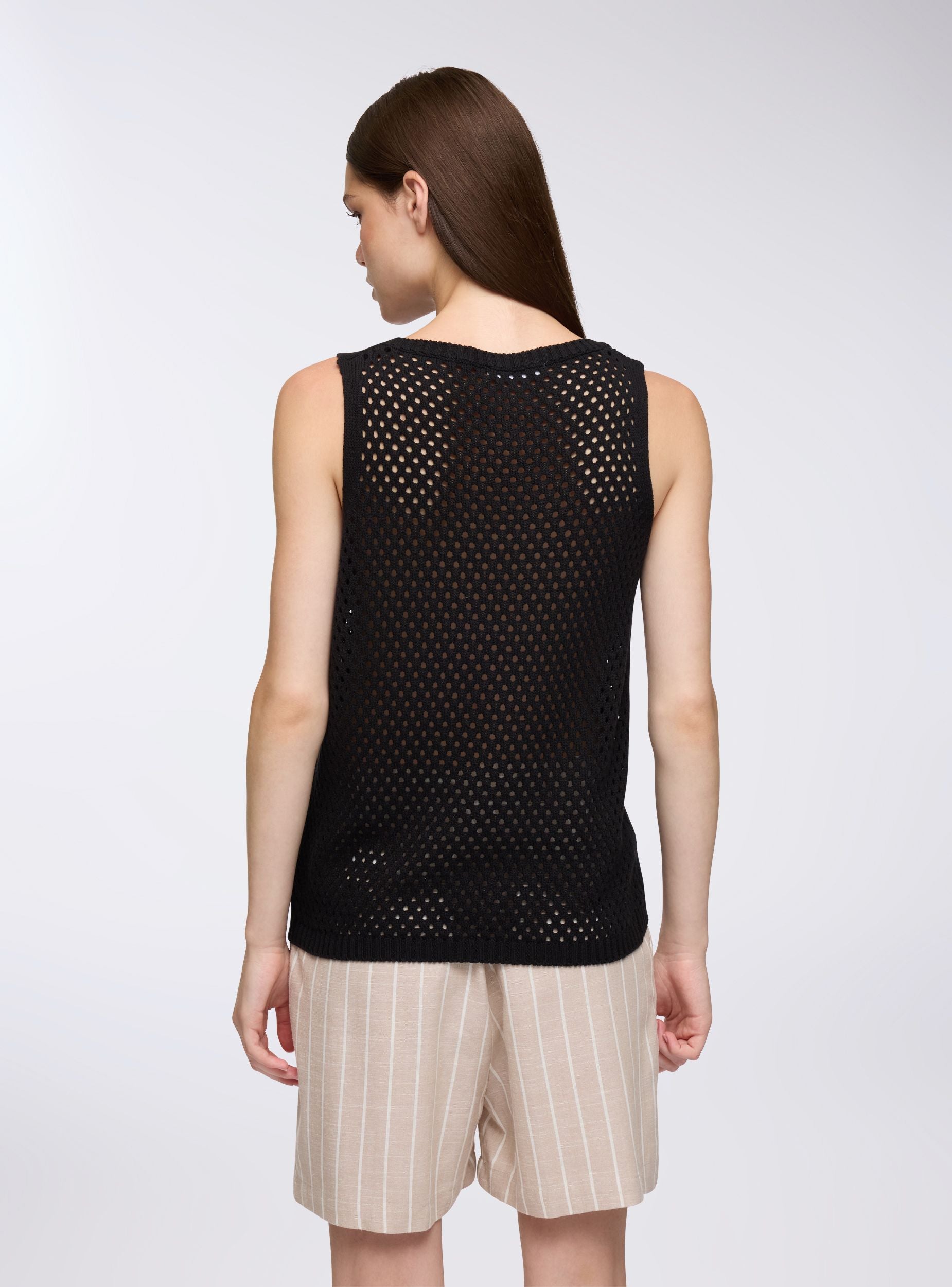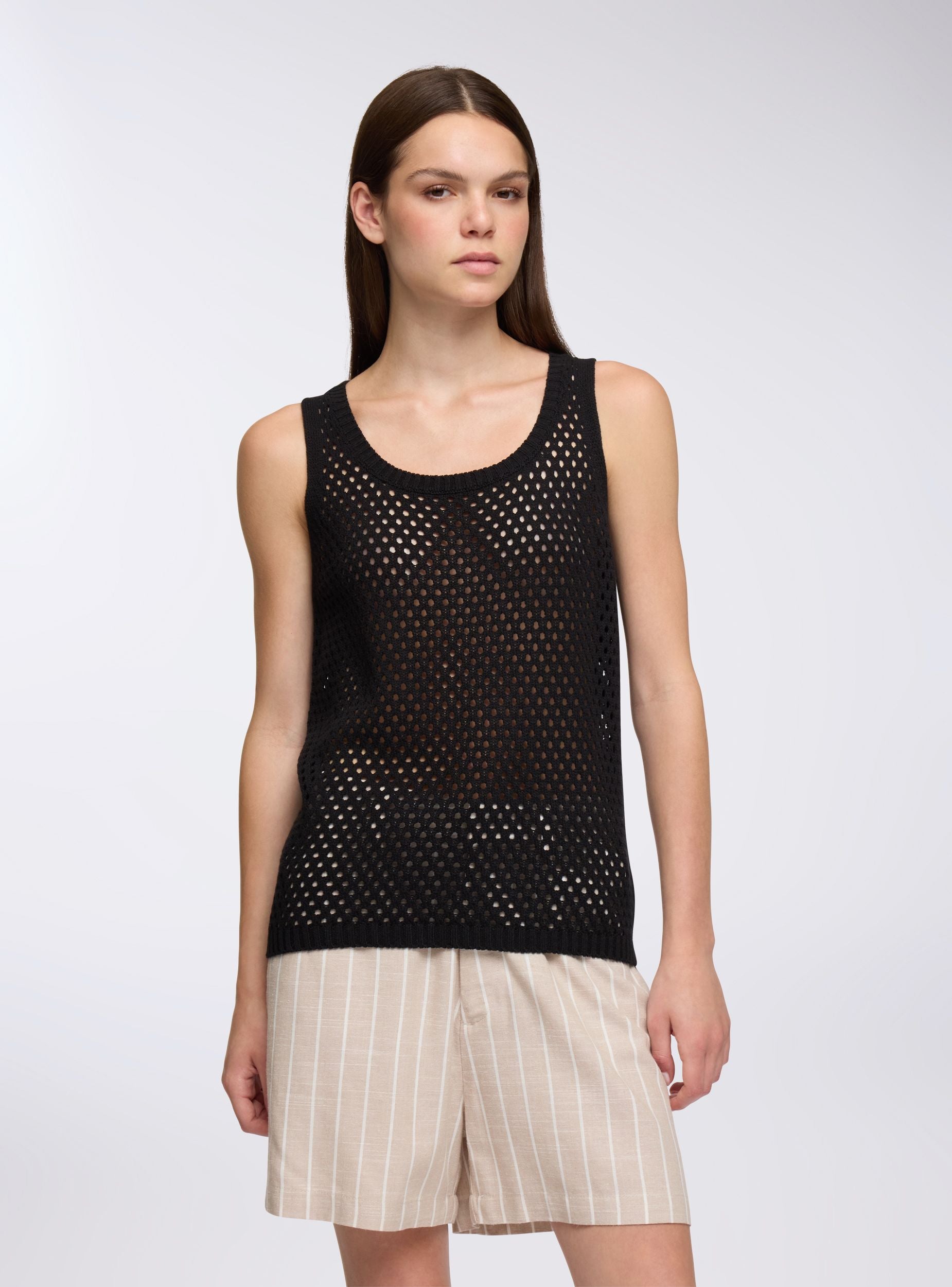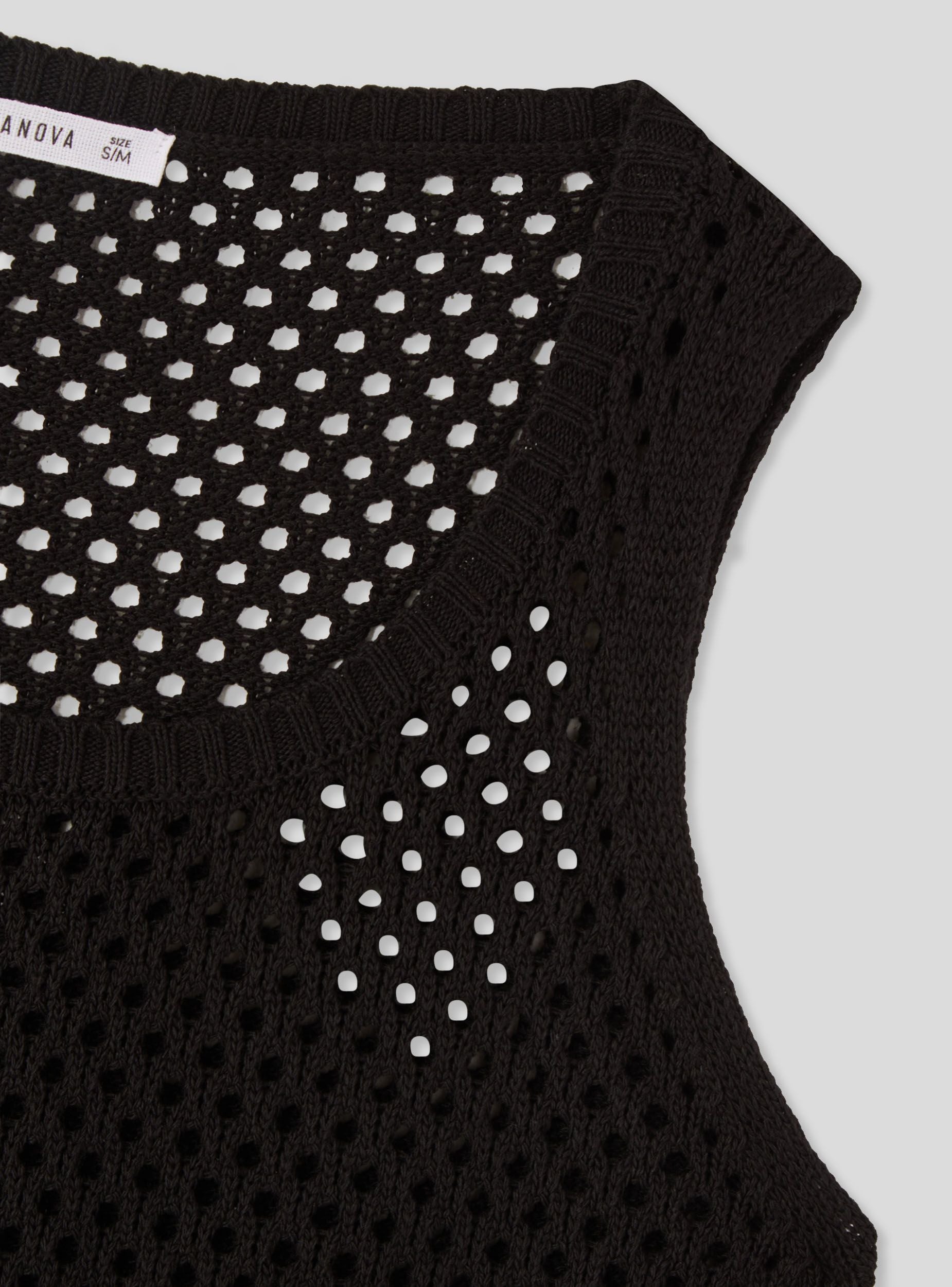 Top da donna in maglia a rete, ideale per look casual e versatili. Il design senza maniche e la lavorazione traforata lo rendono perfetto per essere indossato sopra canotte o bralette, aggiungendo un tocco moderno agli outfit estivi. Il girocollo ampio e il taglio dritto valorizzano la silhouette, mentre il design a tinta unita permette abbinamenti facili con jeans, pantaloni o gonne.Dettagli