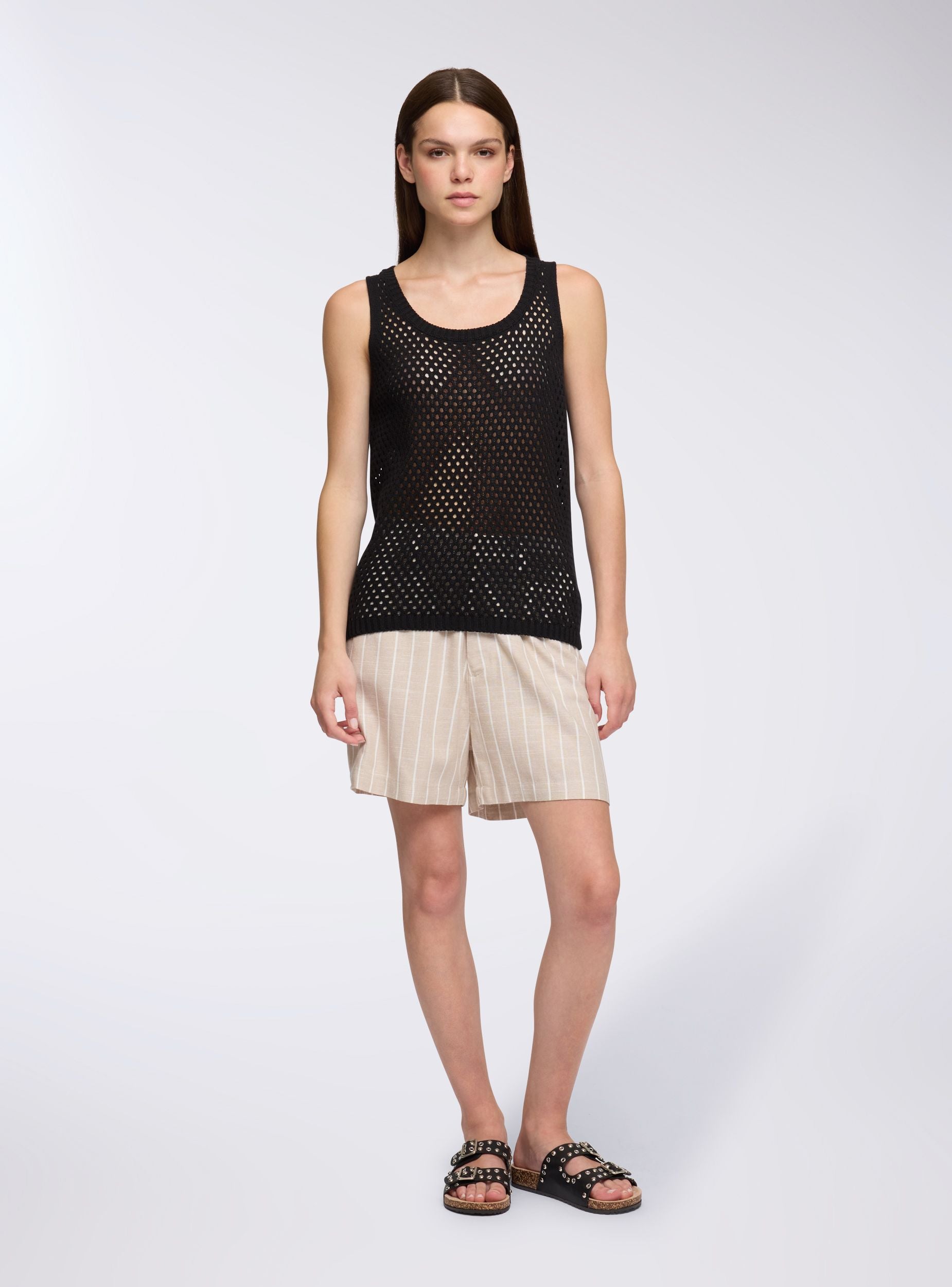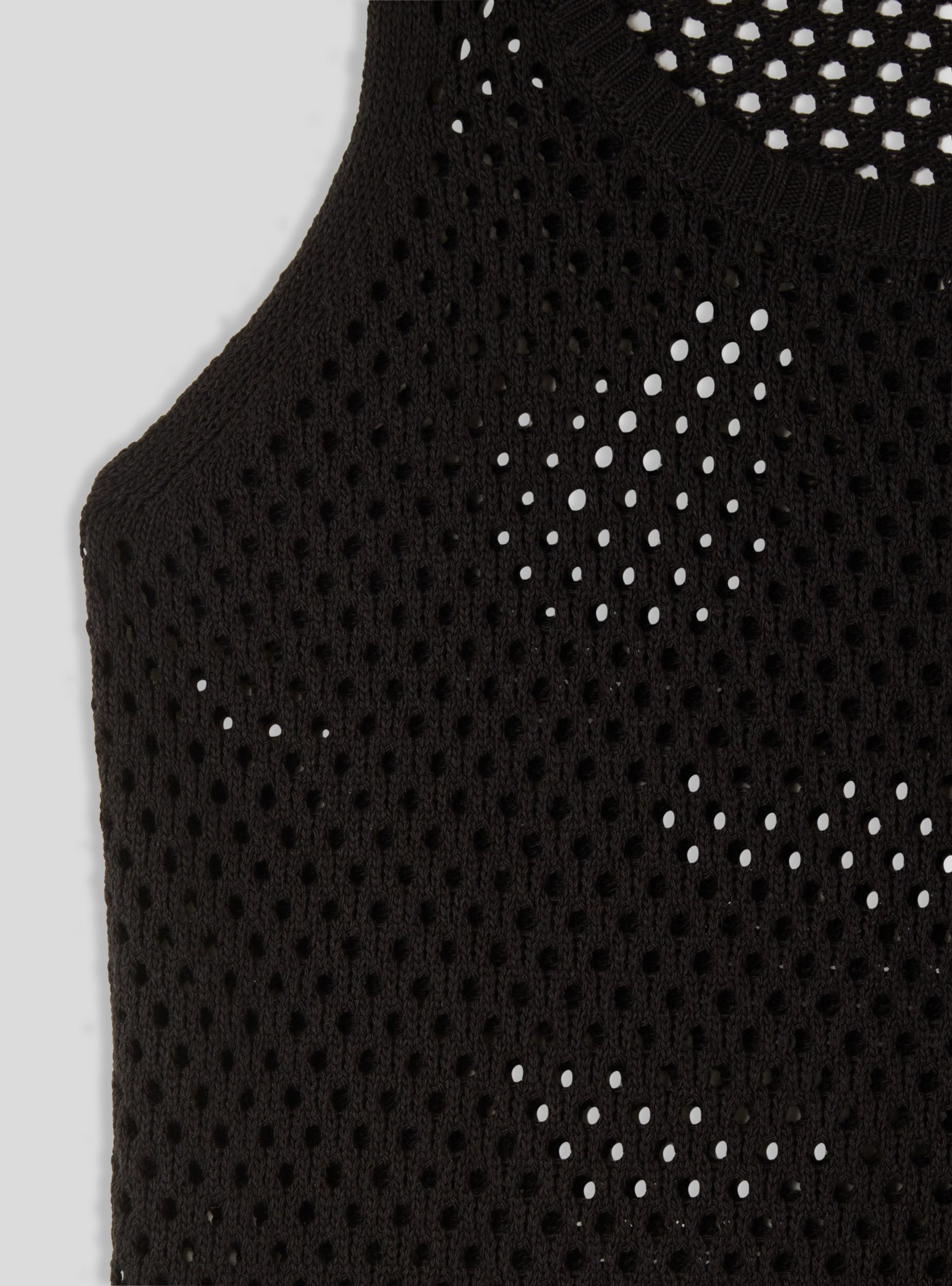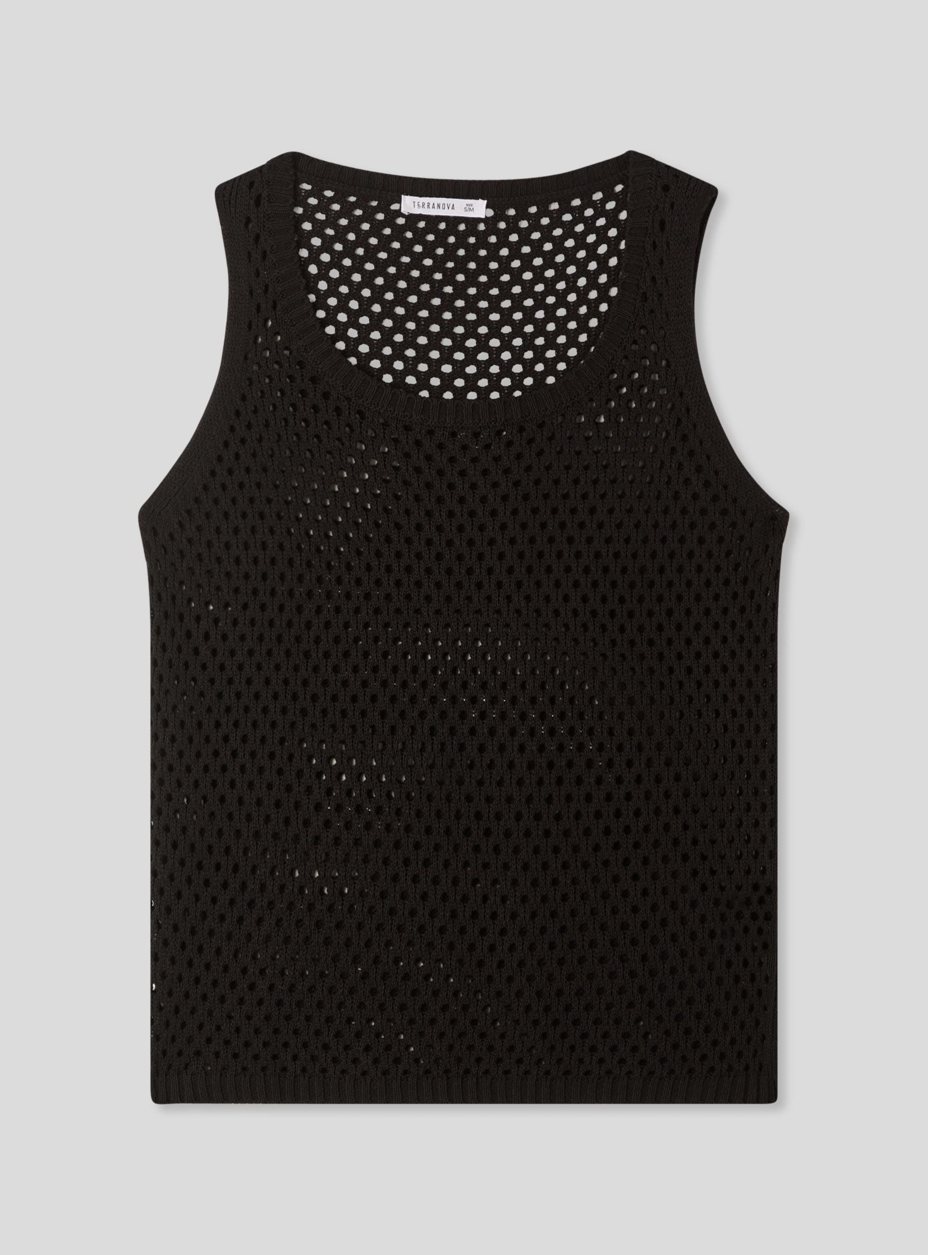 Top da donna in maglia a rete, ideale per look casual e versatili. Il design senza maniche e la lavorazione traforata lo rendono perfetto per essere indossato sopra canotte o bralette, aggiungendo un tocco moderno agli outfit estivi. Il girocollo ampio e il taglio dritto valorizzano la silhouette, mentre il design a tinta unita permette abbinamenti facili con jeans, pantaloni o gonne.Dettagli
