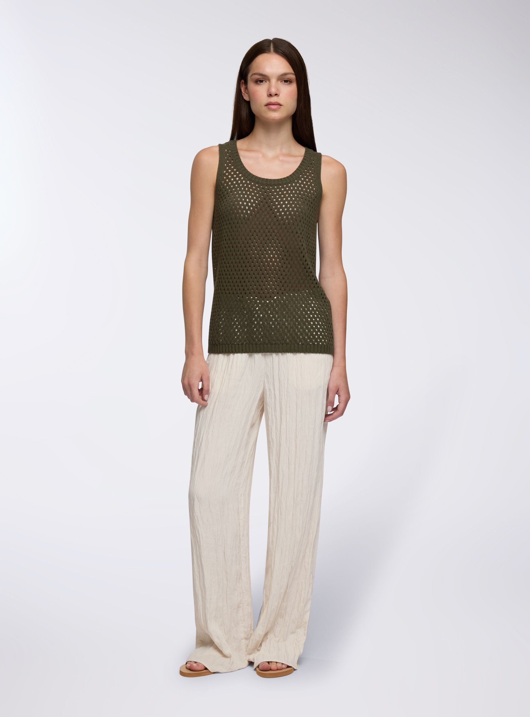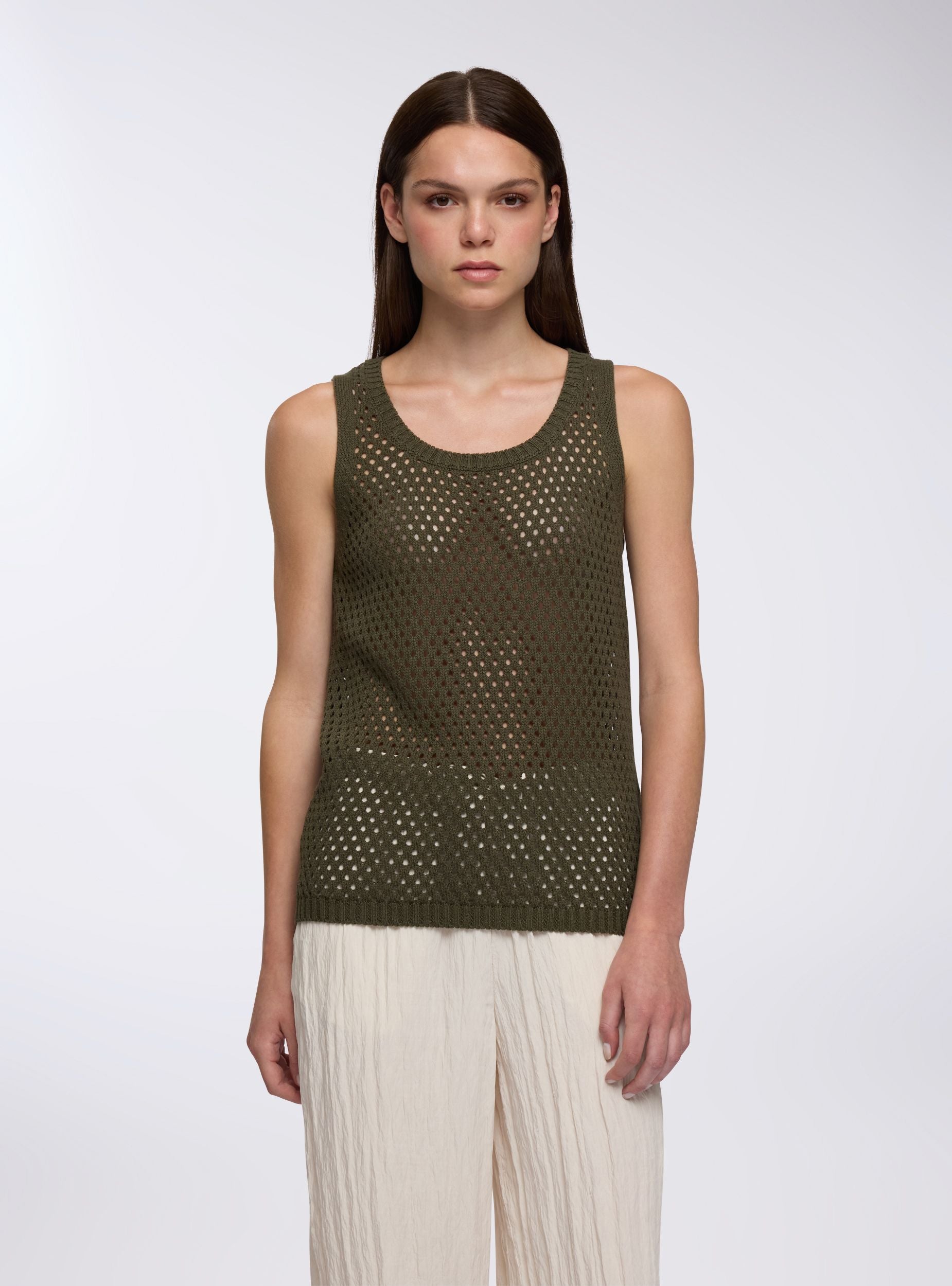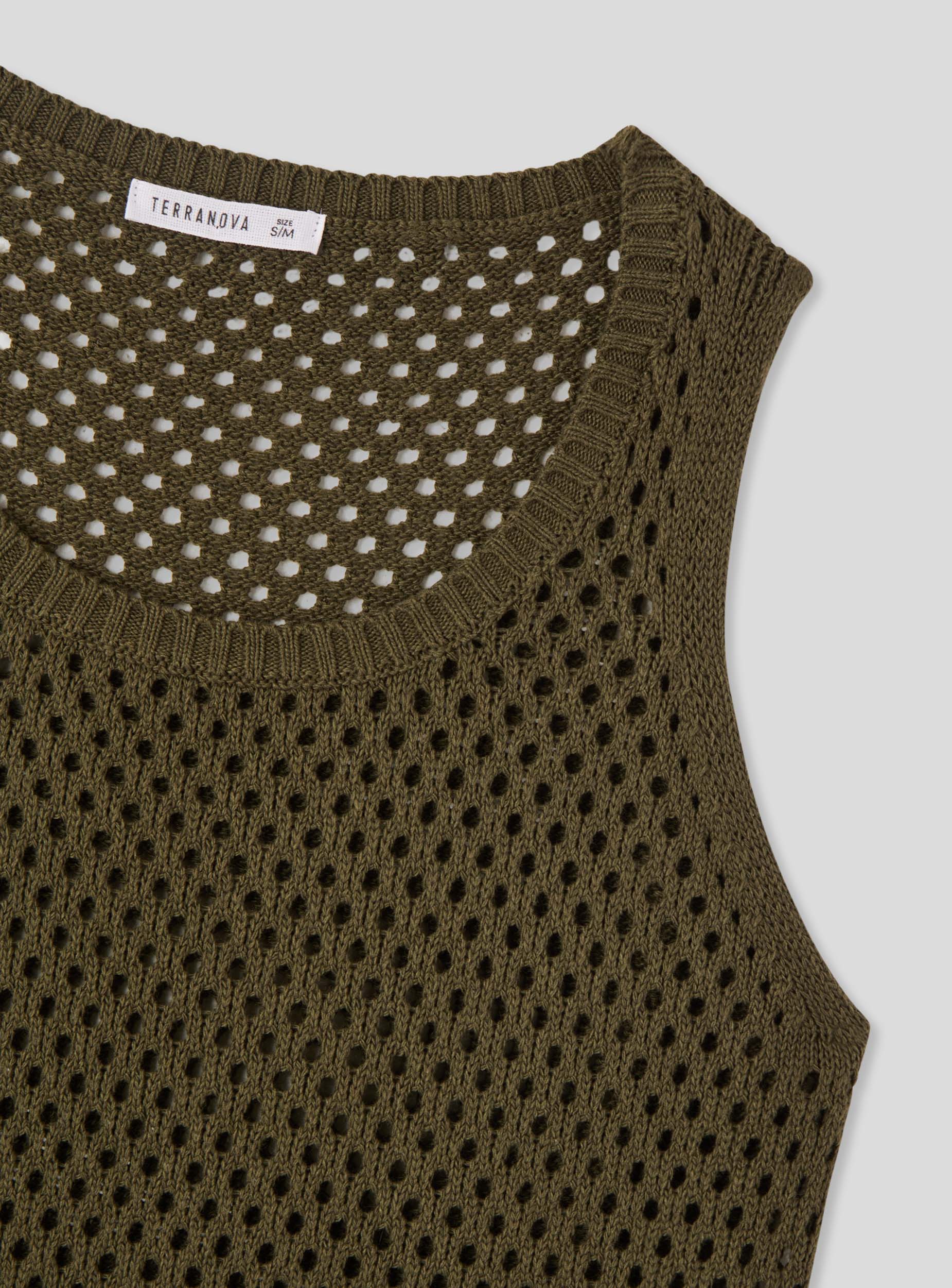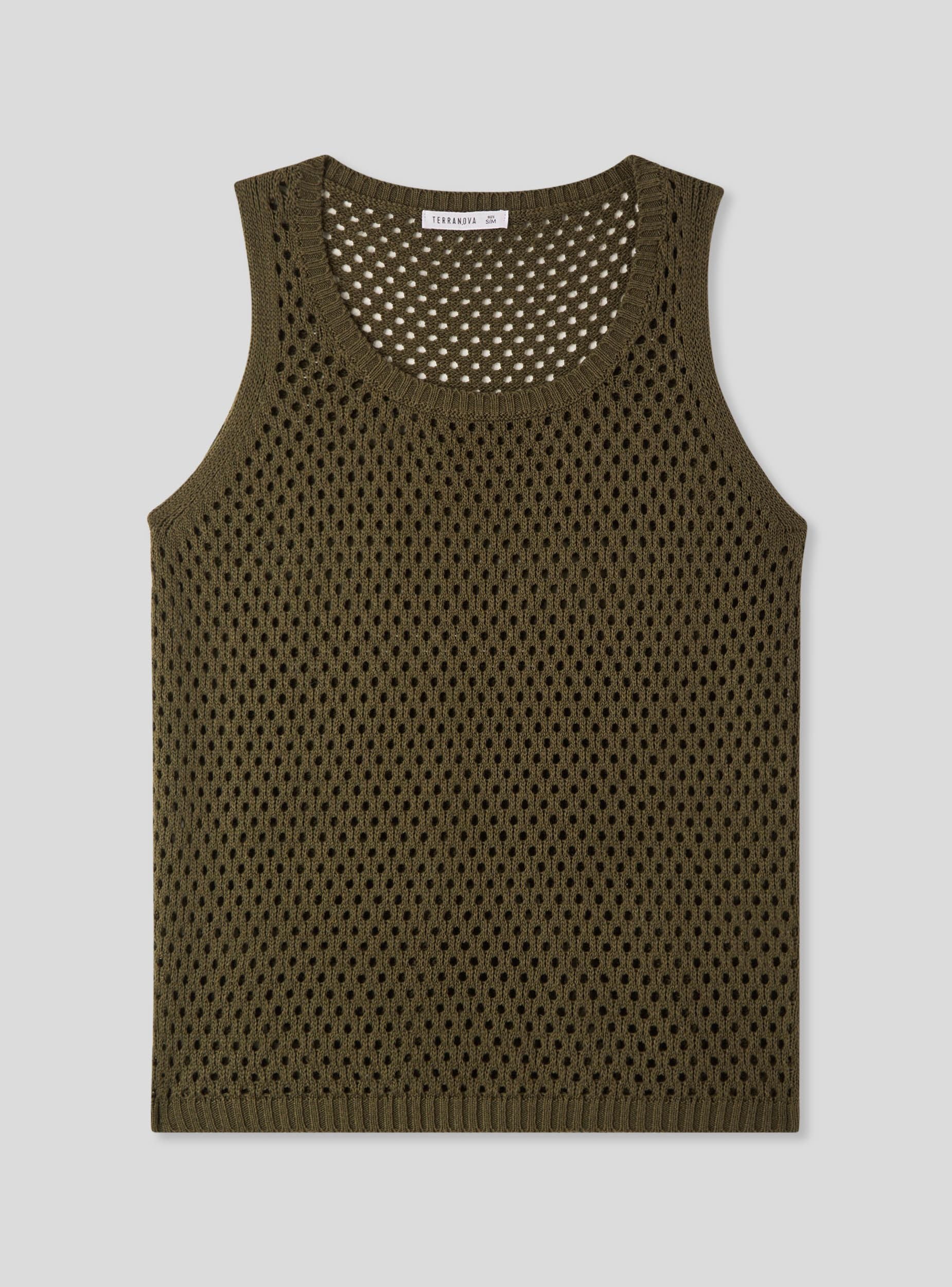 Top da donna in maglia a rete, ideale per look casual e versatili. Il design senza maniche e la lavorazione traforata lo rendono perfetto per essere indossato sopra canotte o bralette, aggiungendo un tocco moderno agli outfit estivi. Il girocollo ampio e il taglio dritto valorizzano la silhouette, mentre il design a tinta unita permette abbinamenti facili con jeans, pantaloni o gonne.Dettagli
